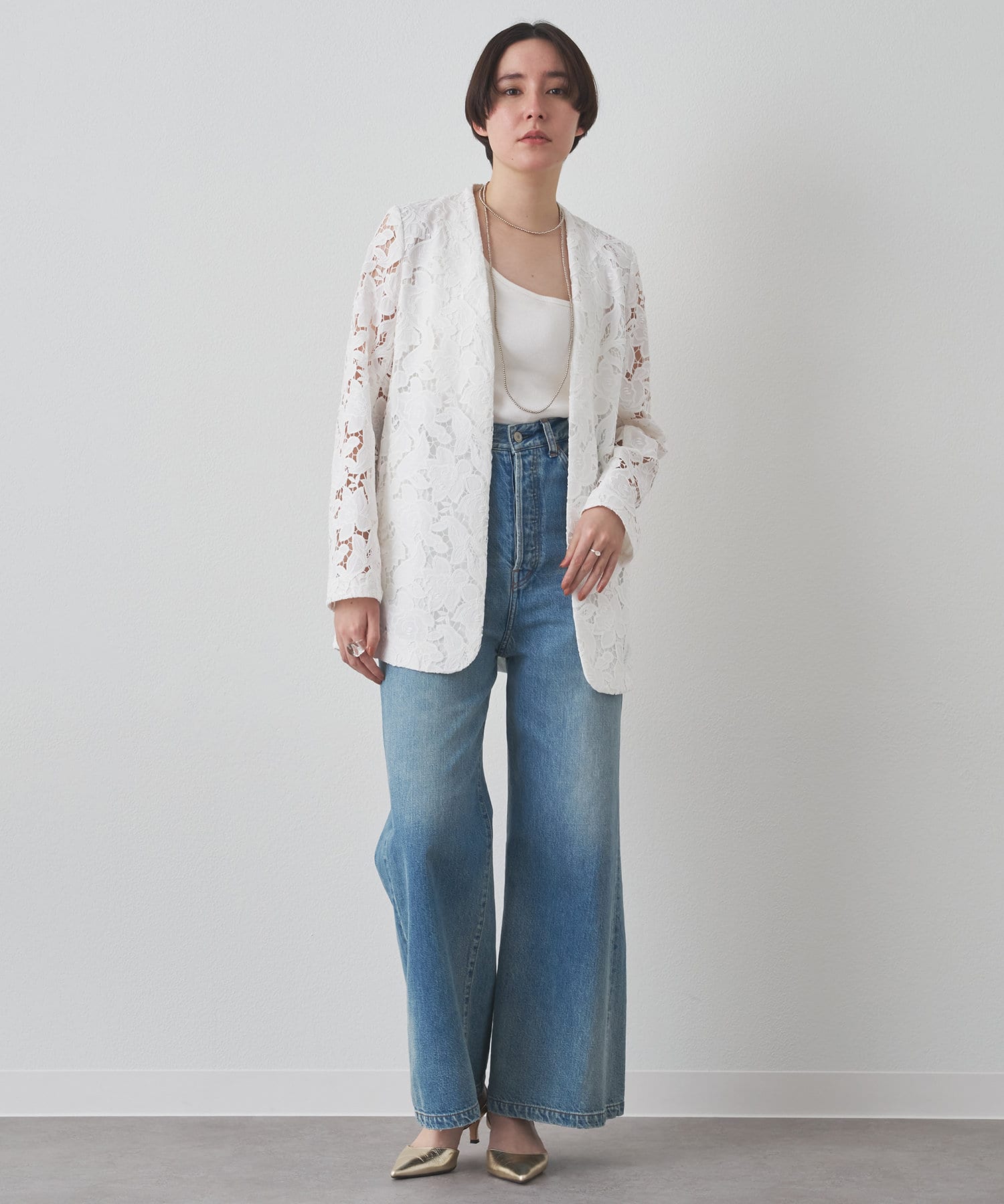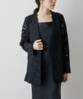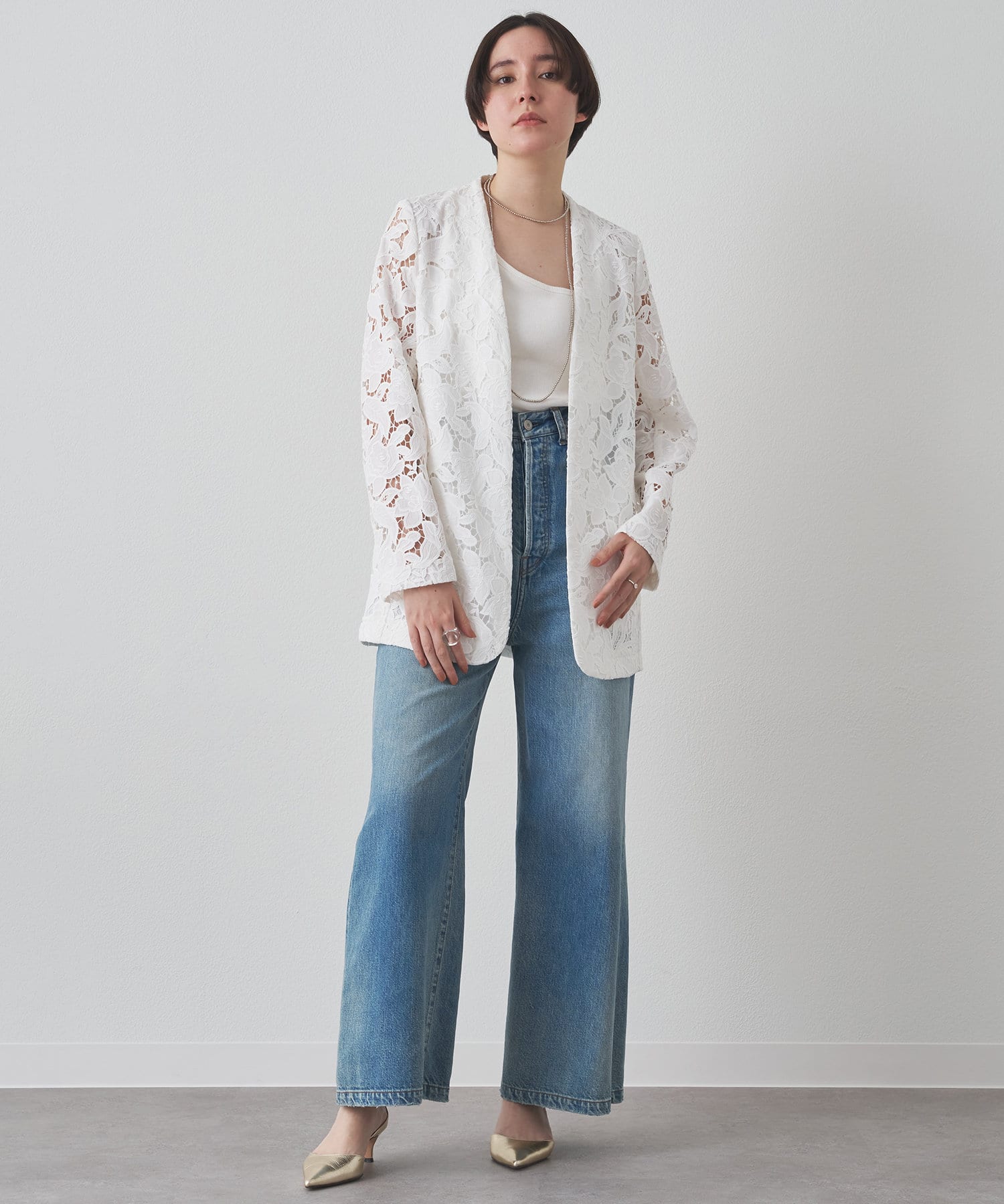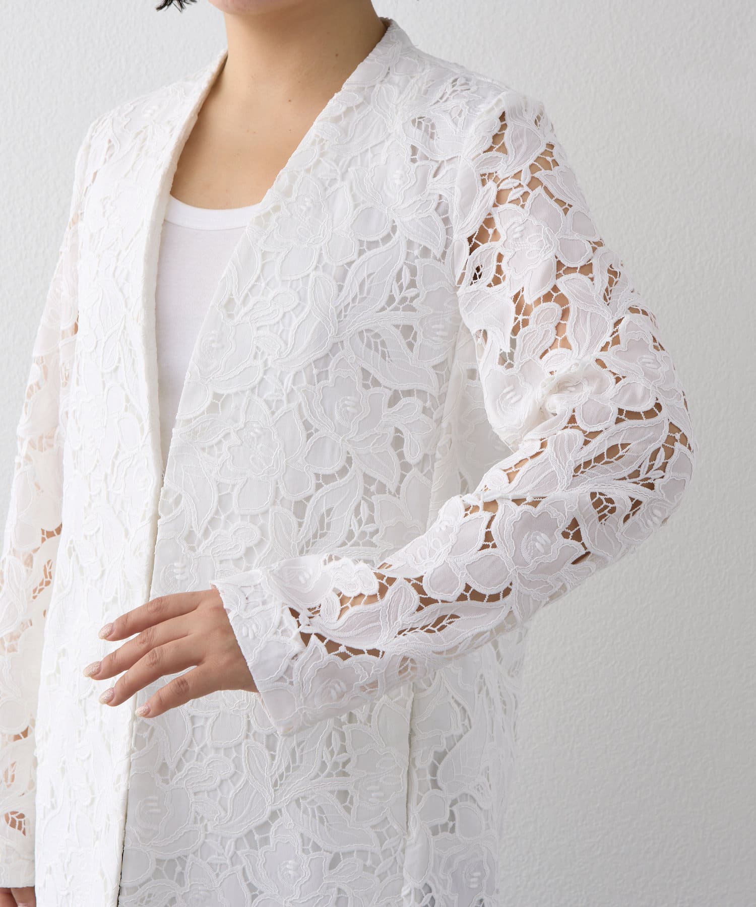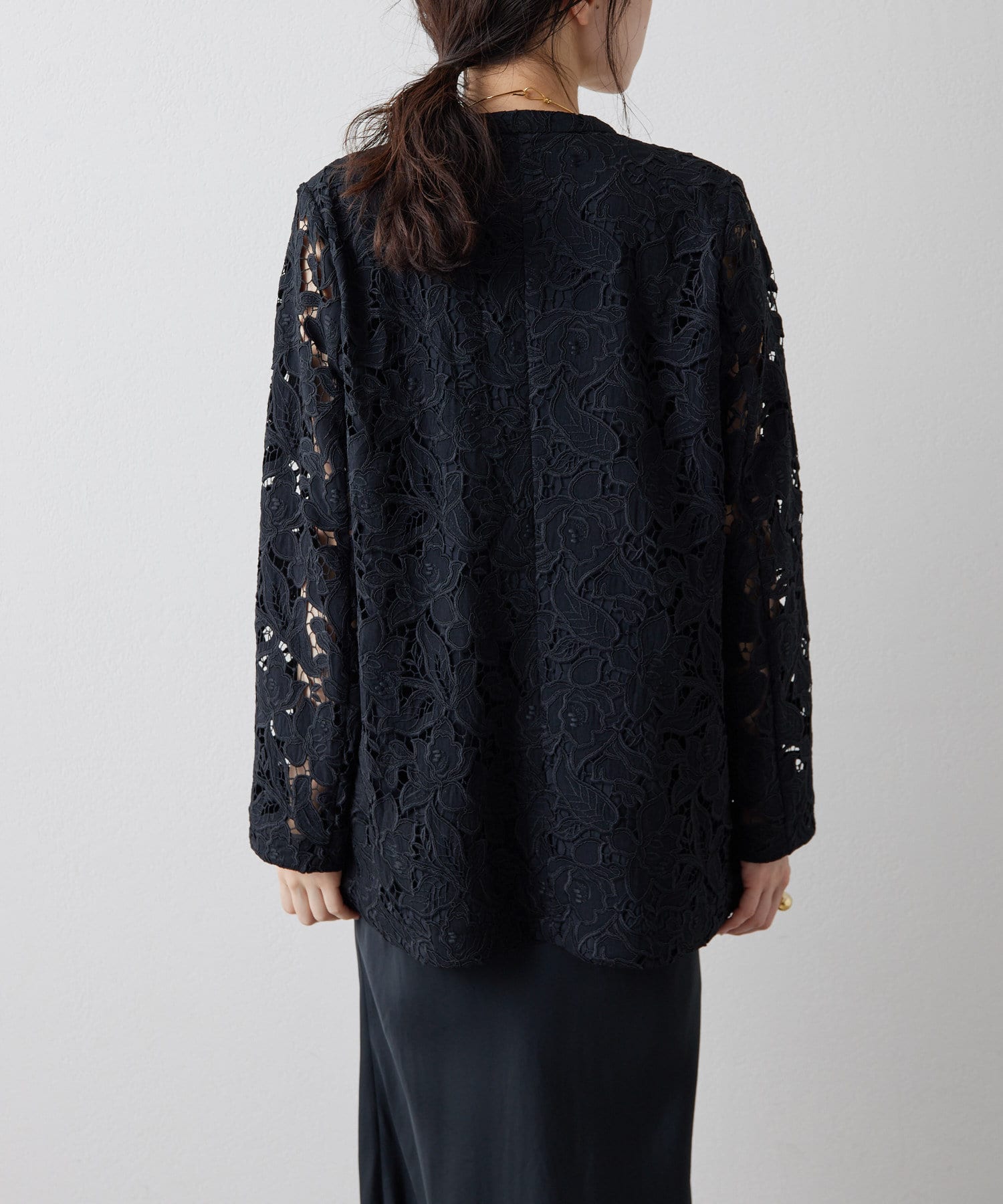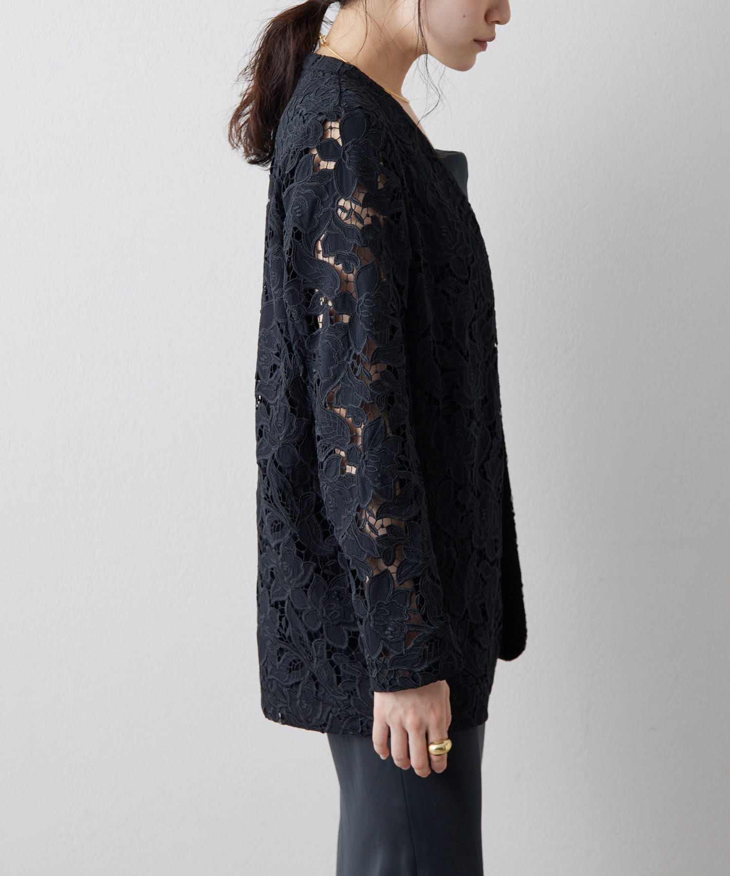 ■大柄のレース生地が目を惹くノーカラージャケット。