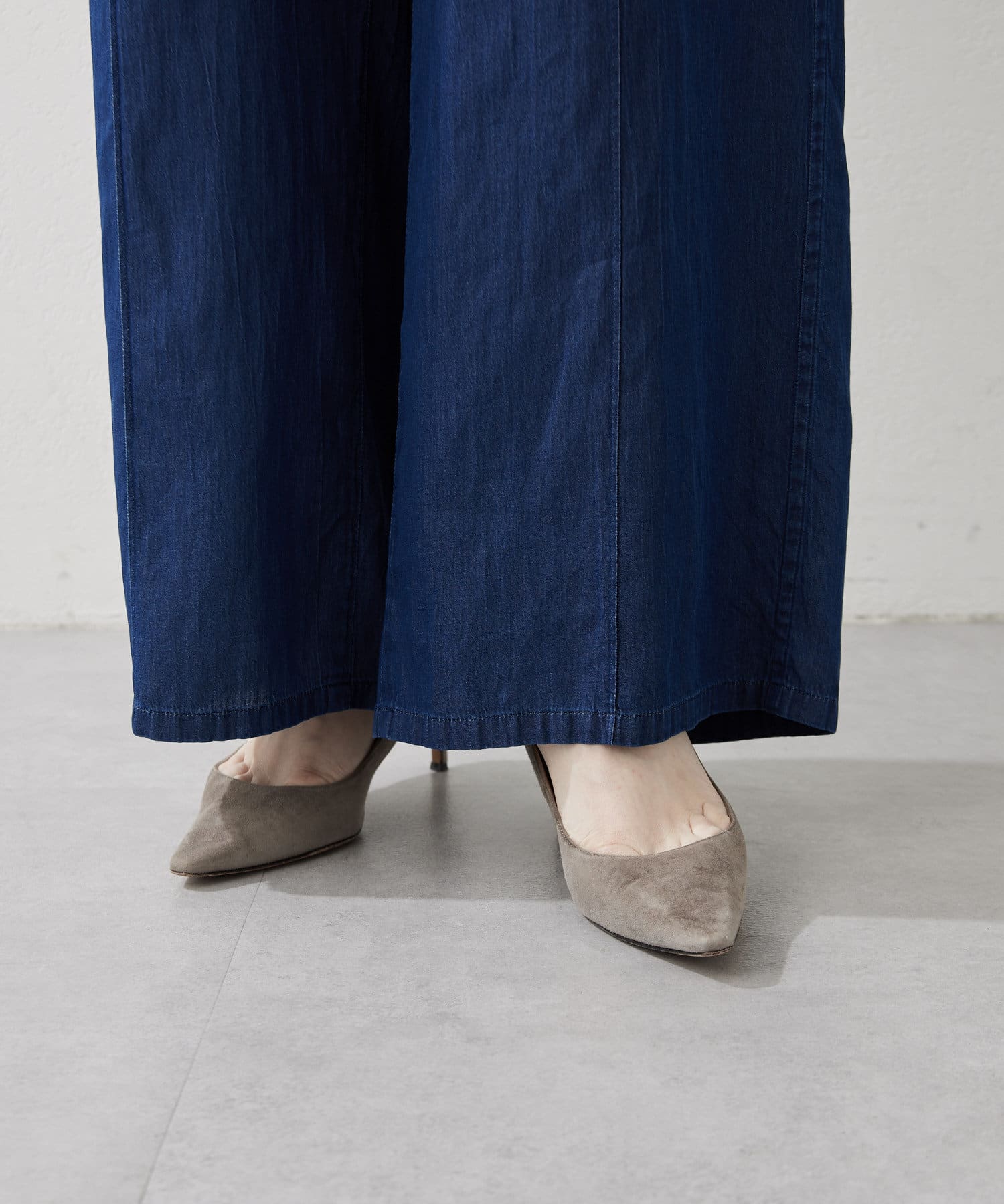 ■ライトオンスのデニム生地で仕立てたワイドデニムパンツ。