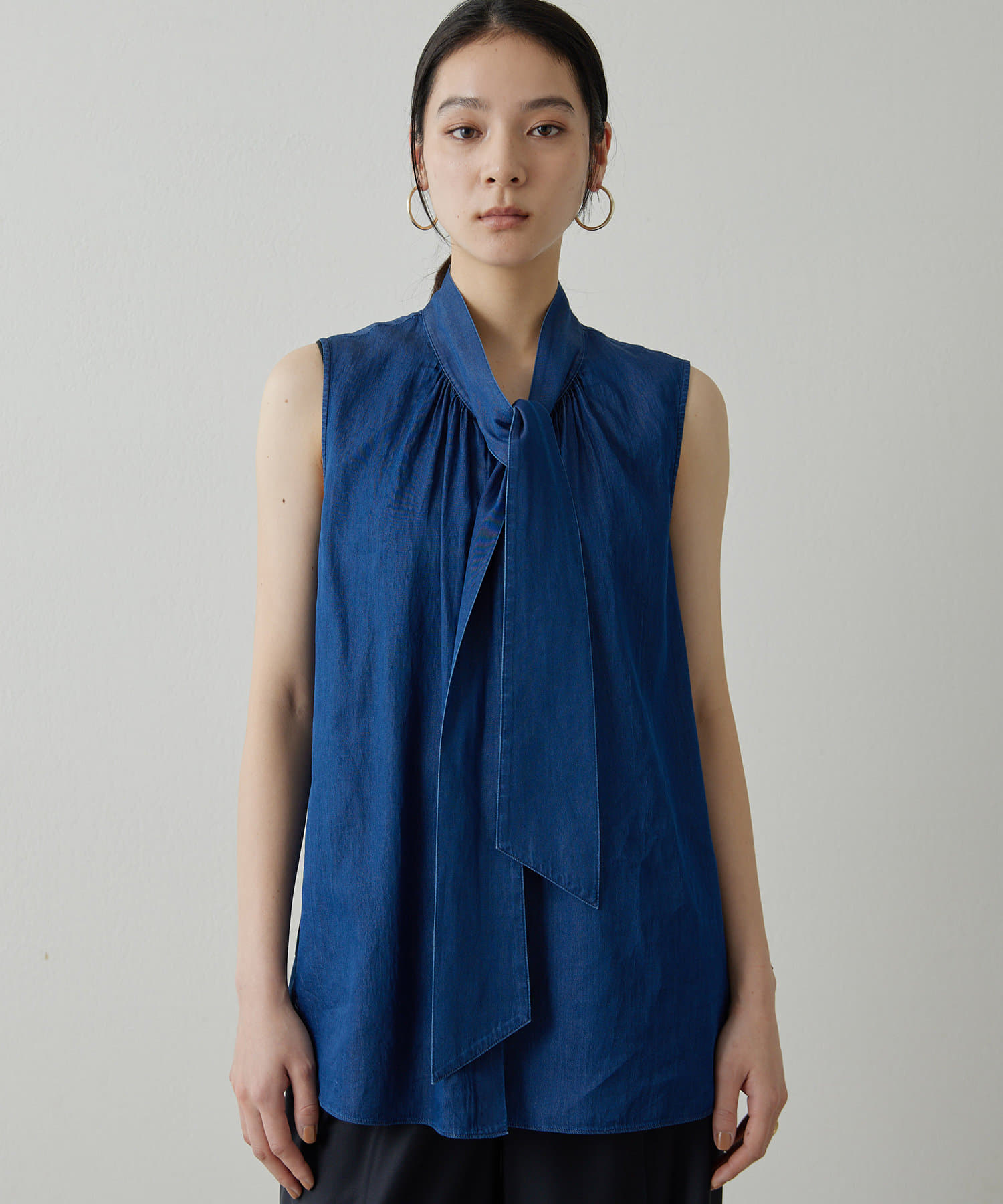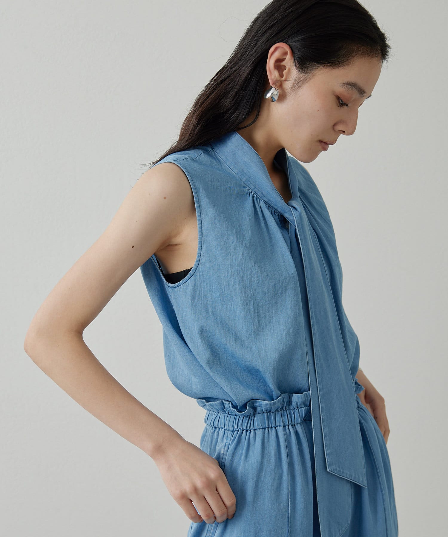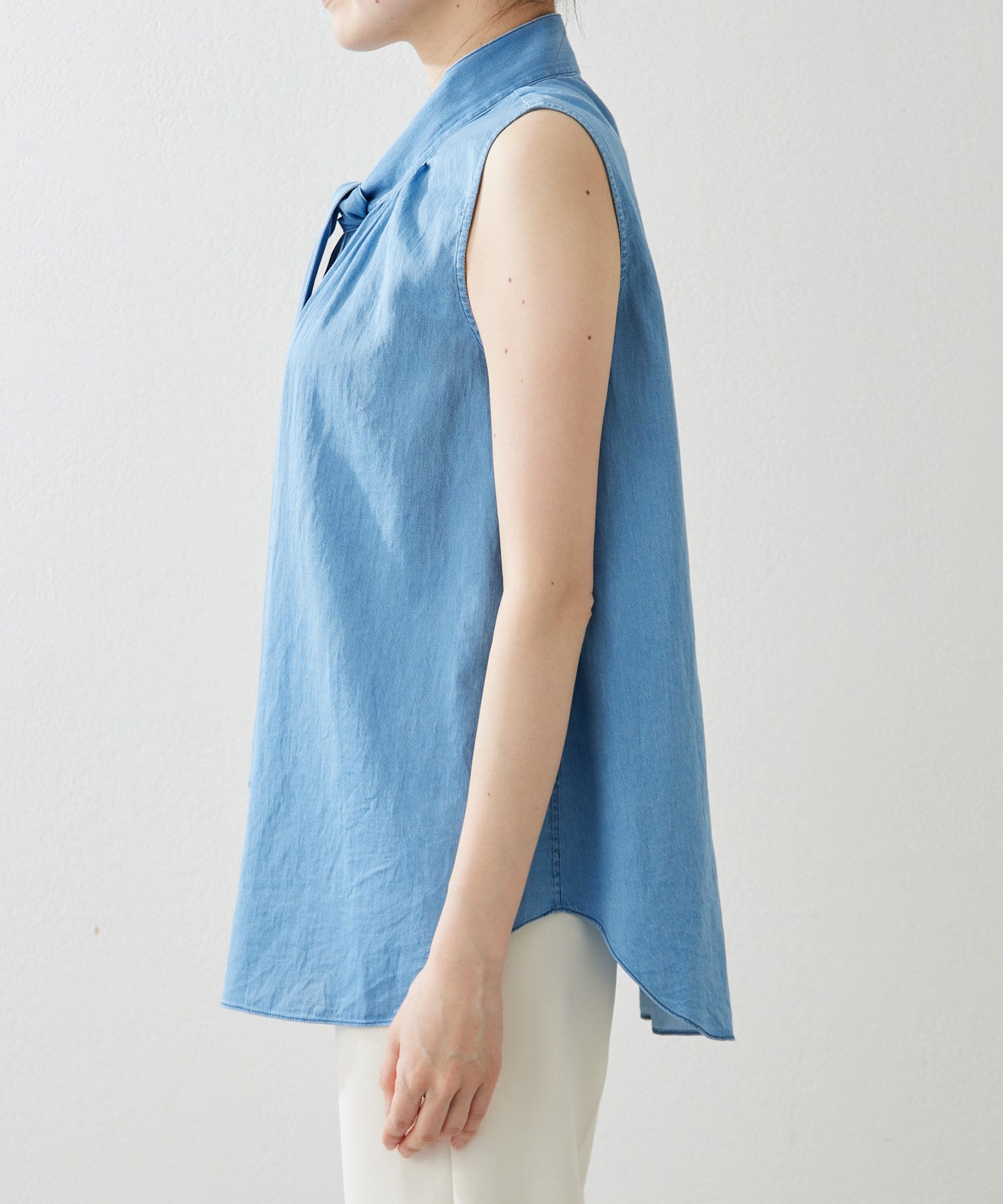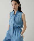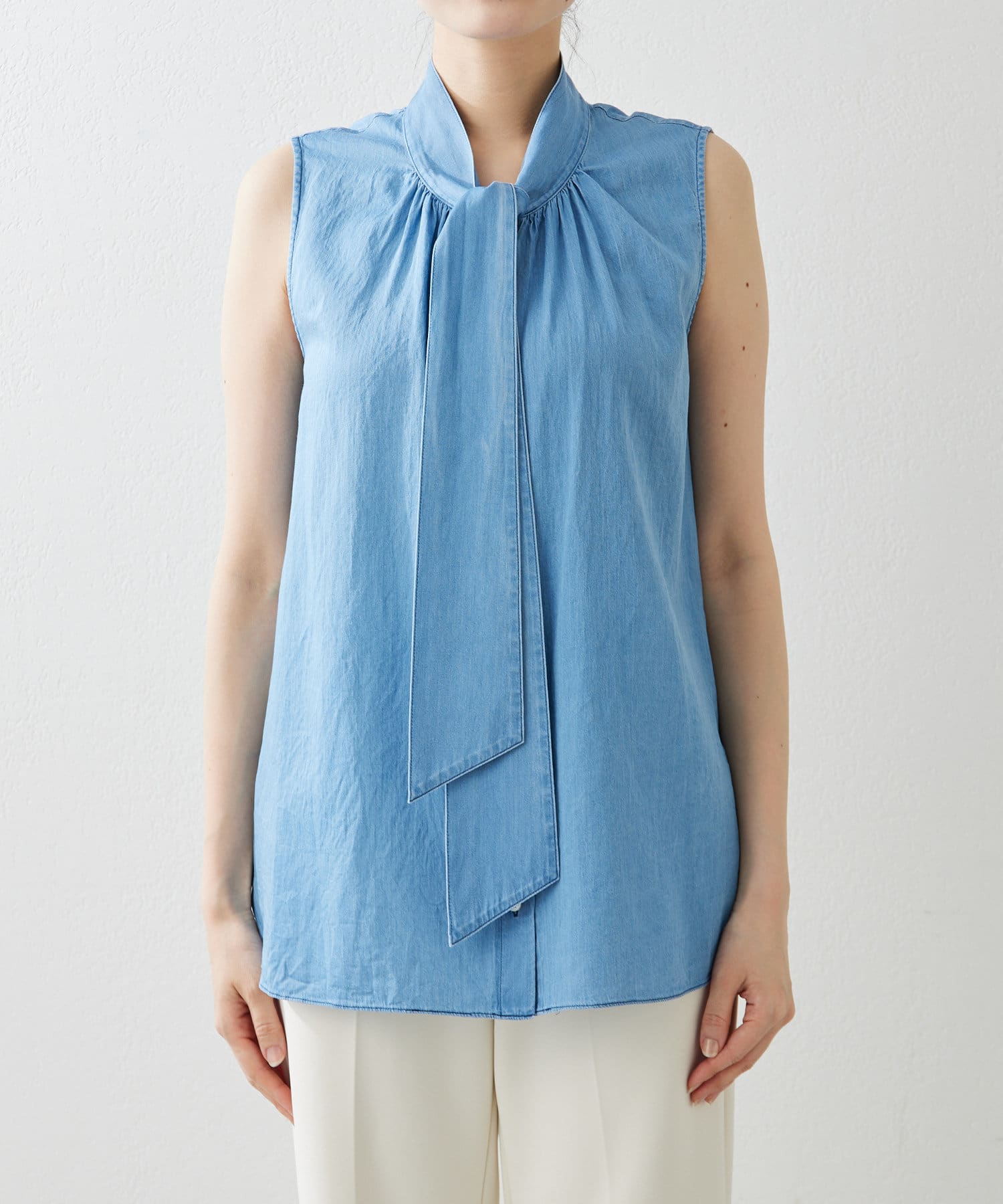 ■ライトオンスのデニム生地で仕立てたノースリーブのボウタイブラウス。