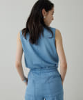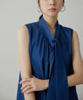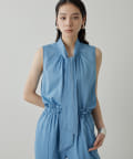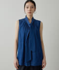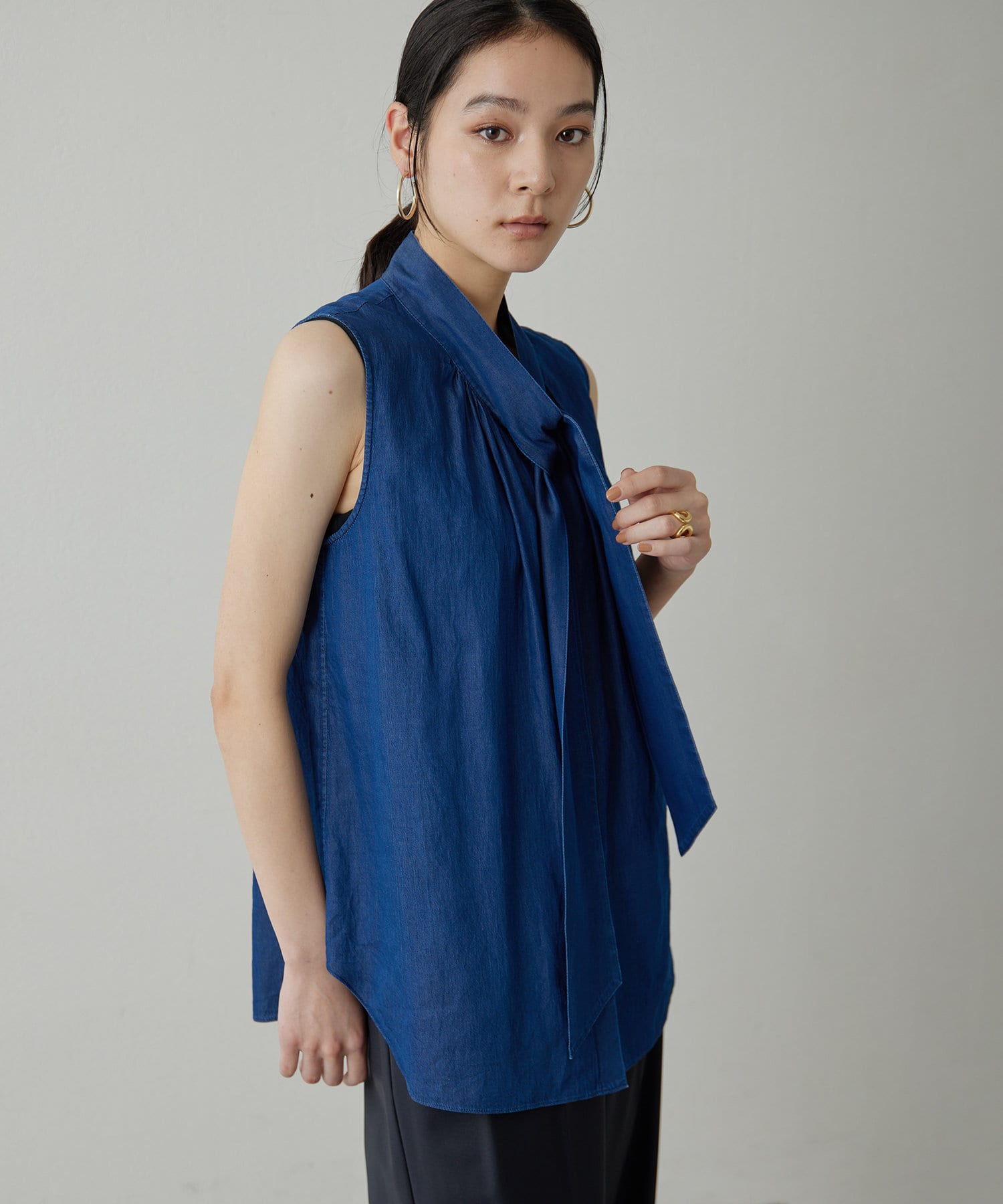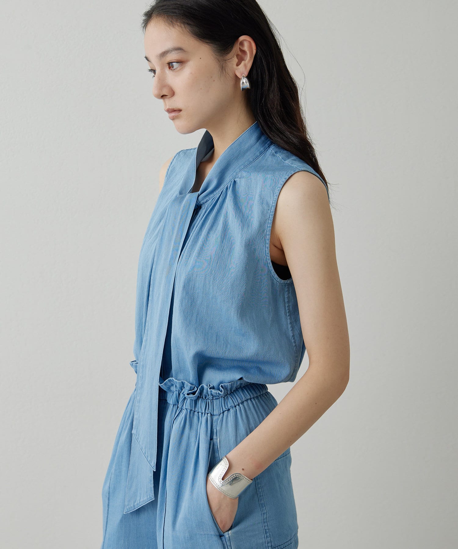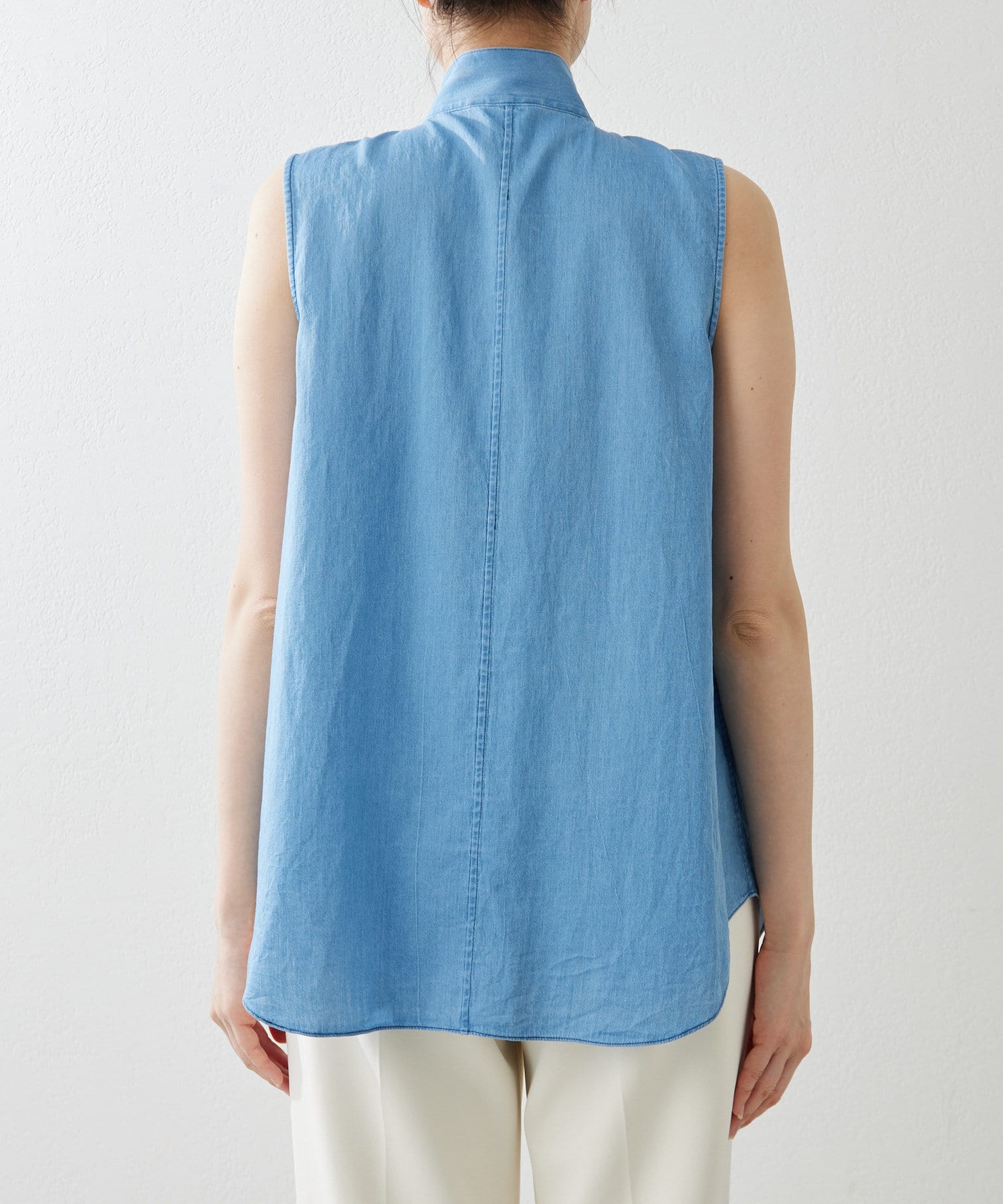 ■ライトオンスのデニム生地で仕立てたノースリーブのボウタイブラウス。