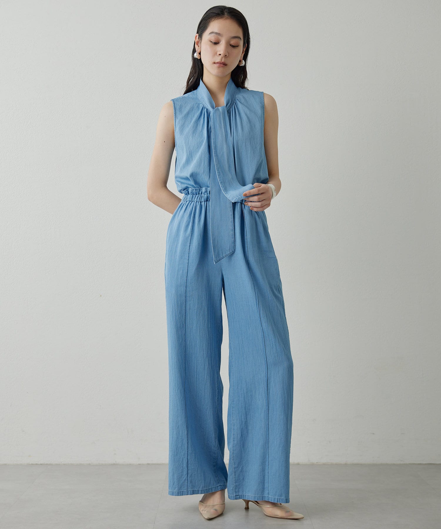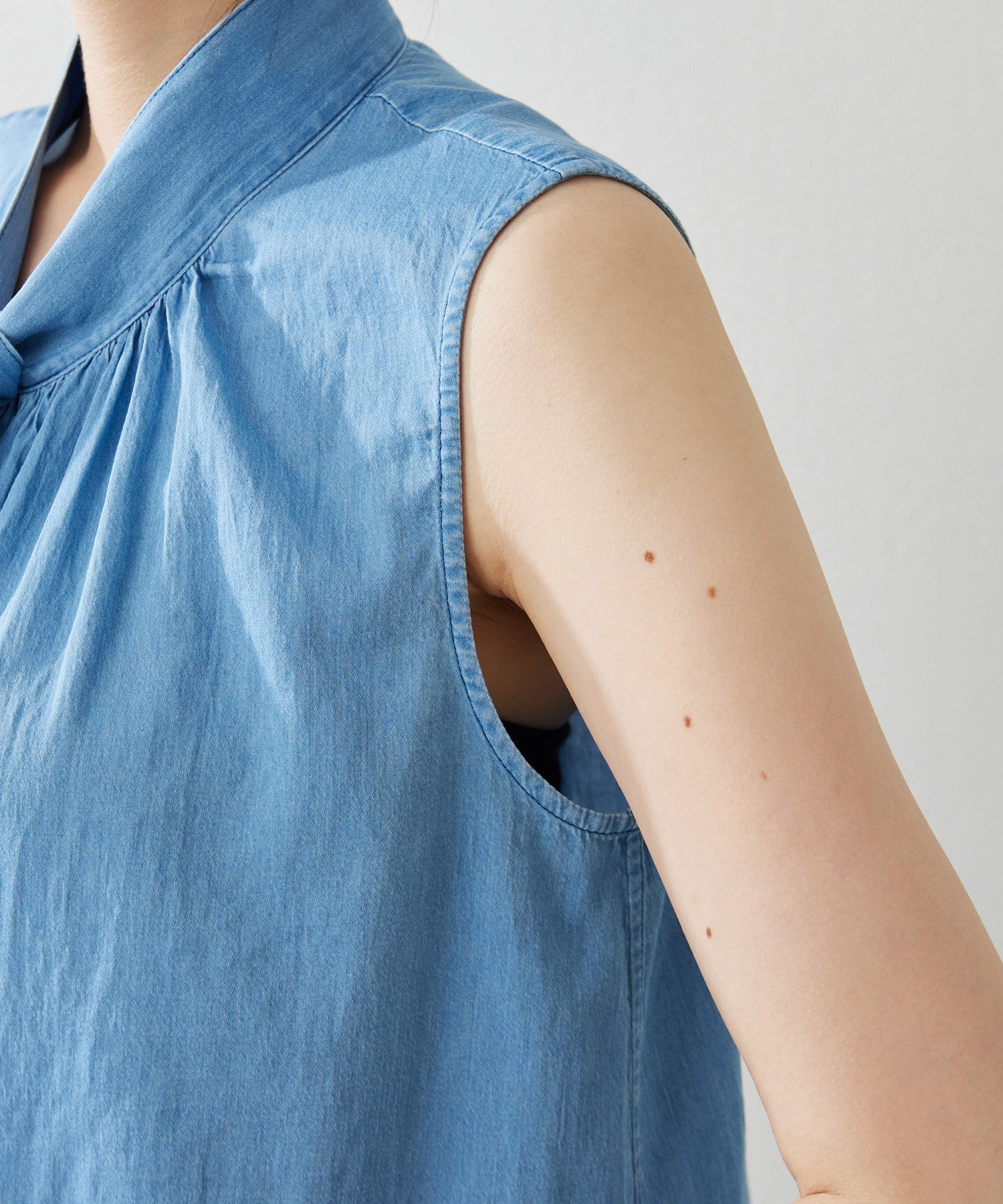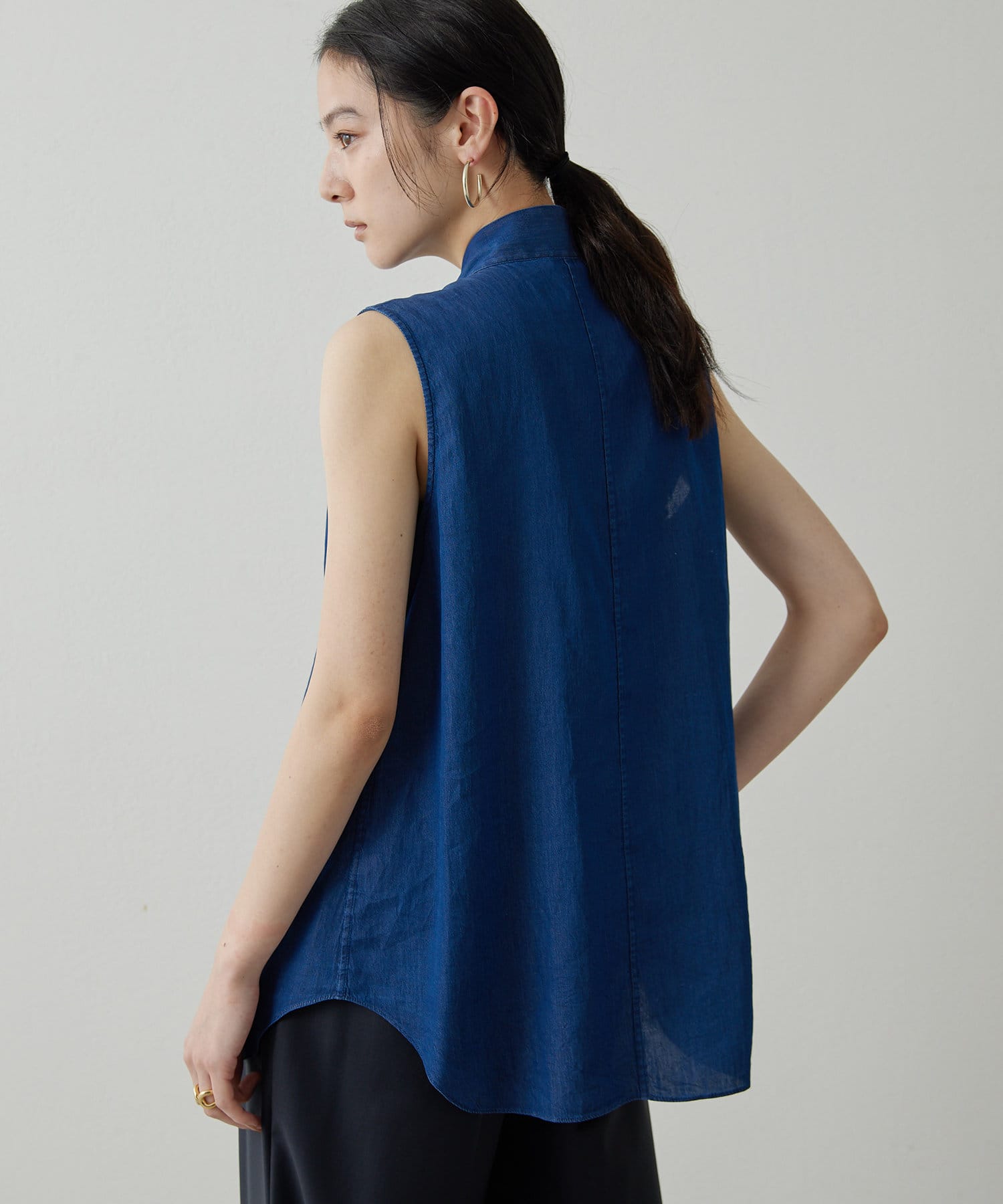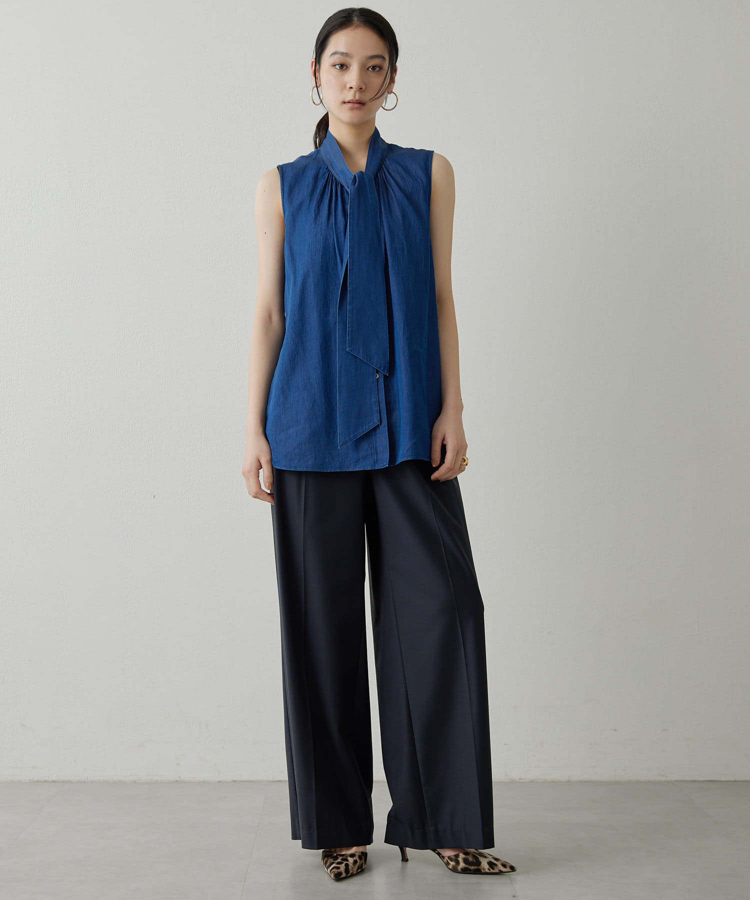 ■ライトオンスのデニム生地で仕立てたノースリーブのボウタイブラウス。