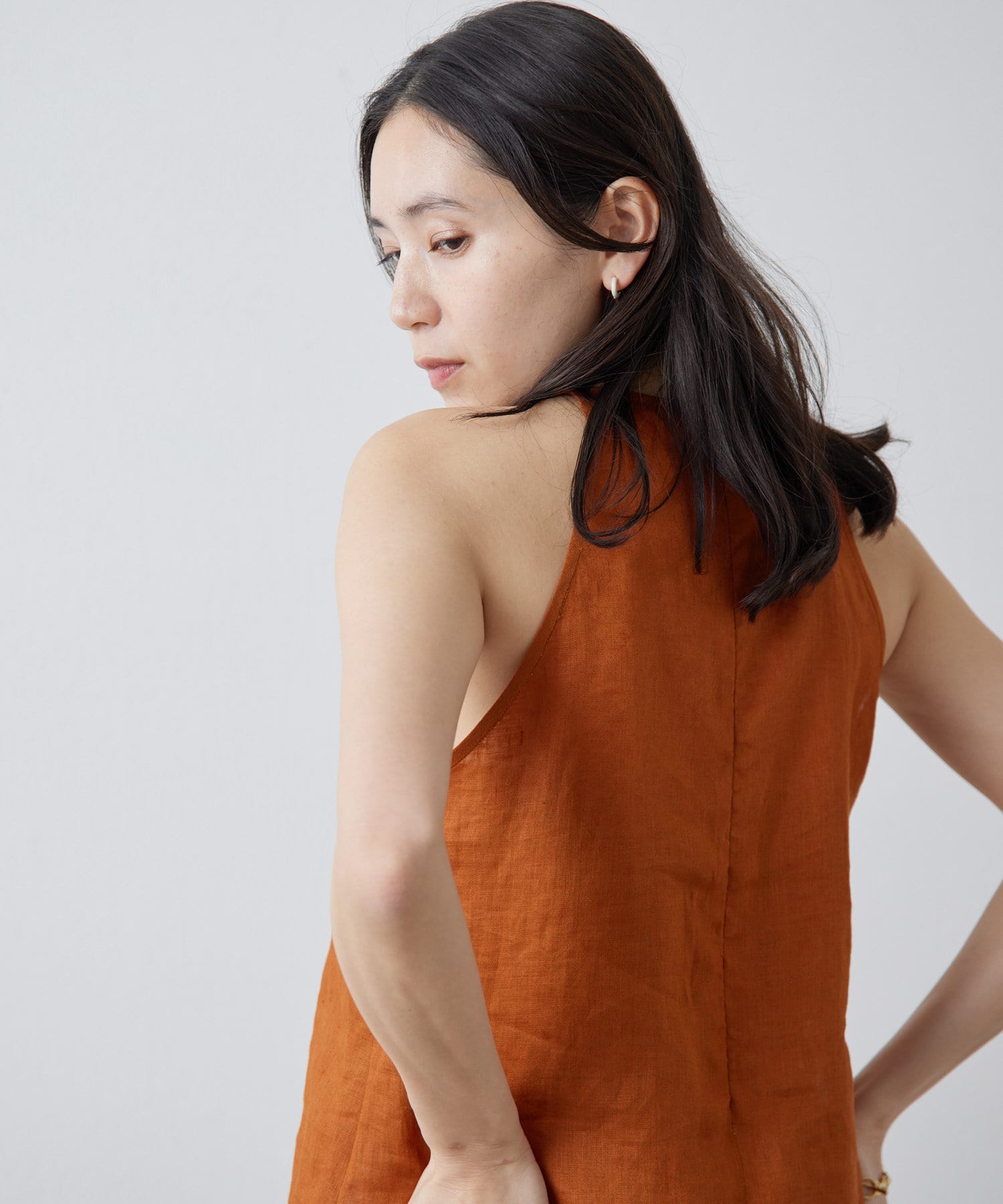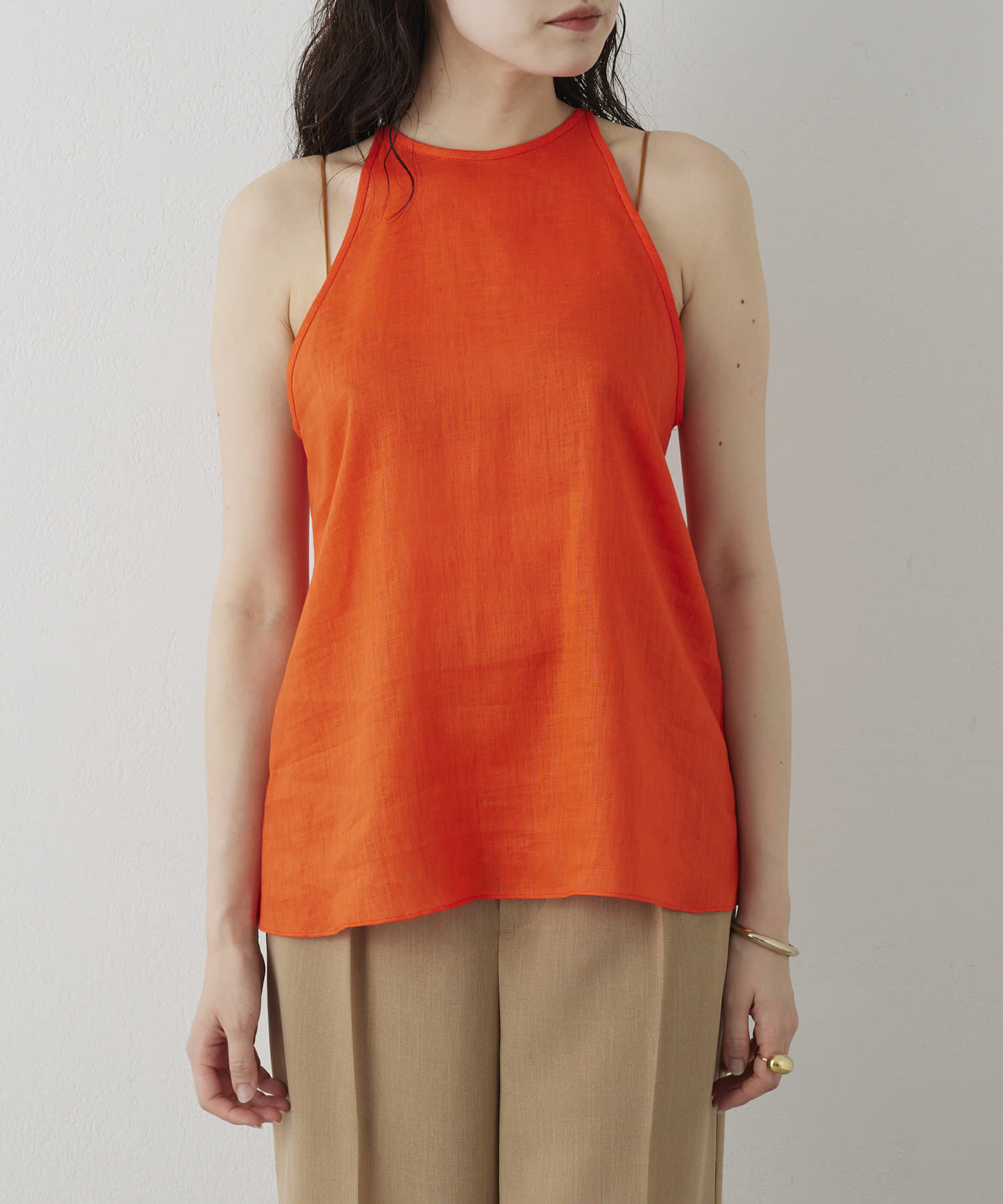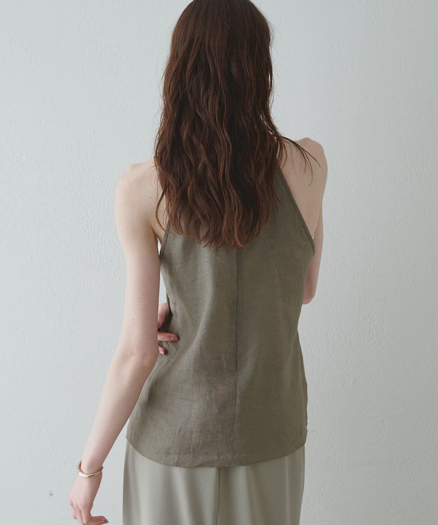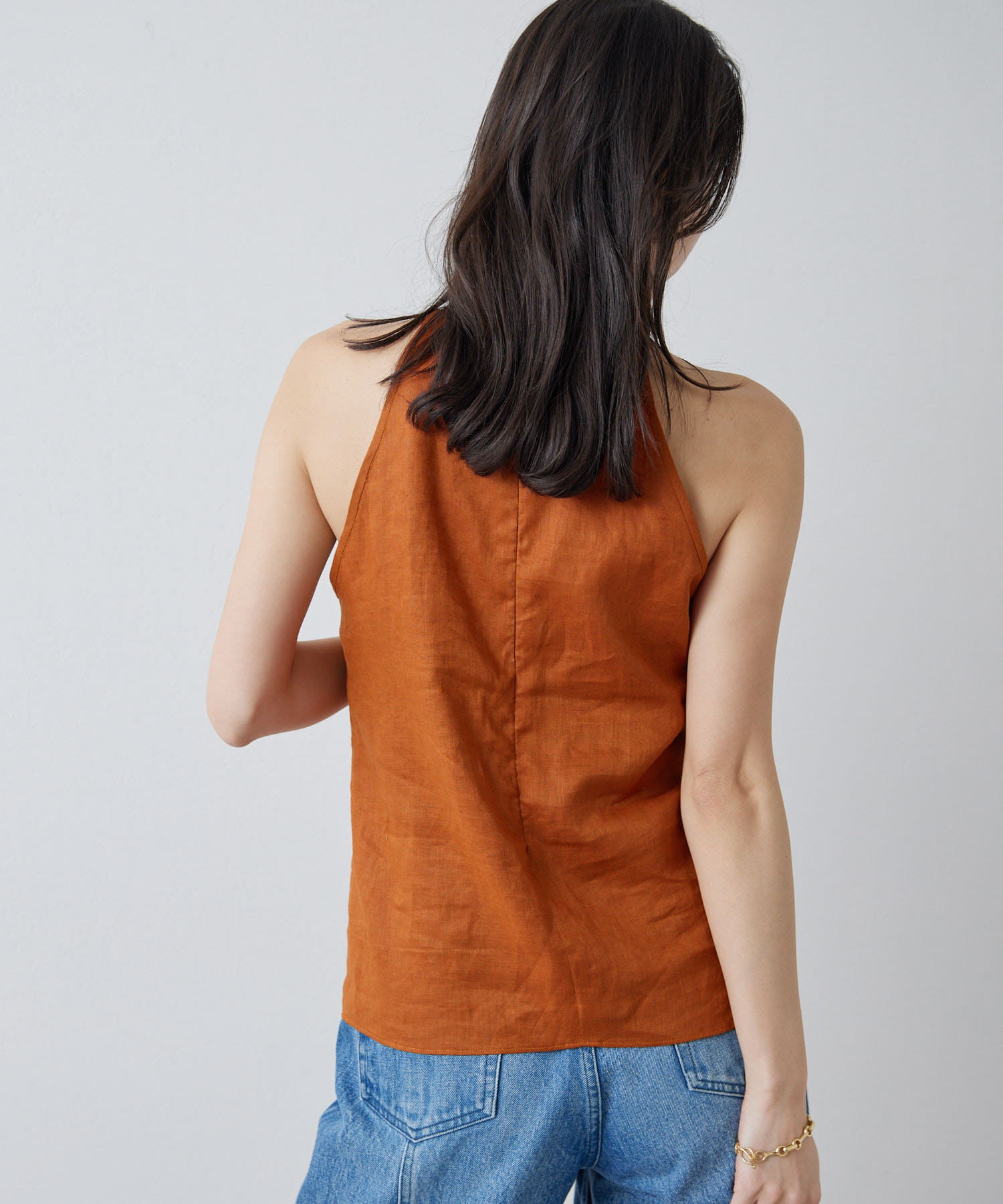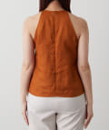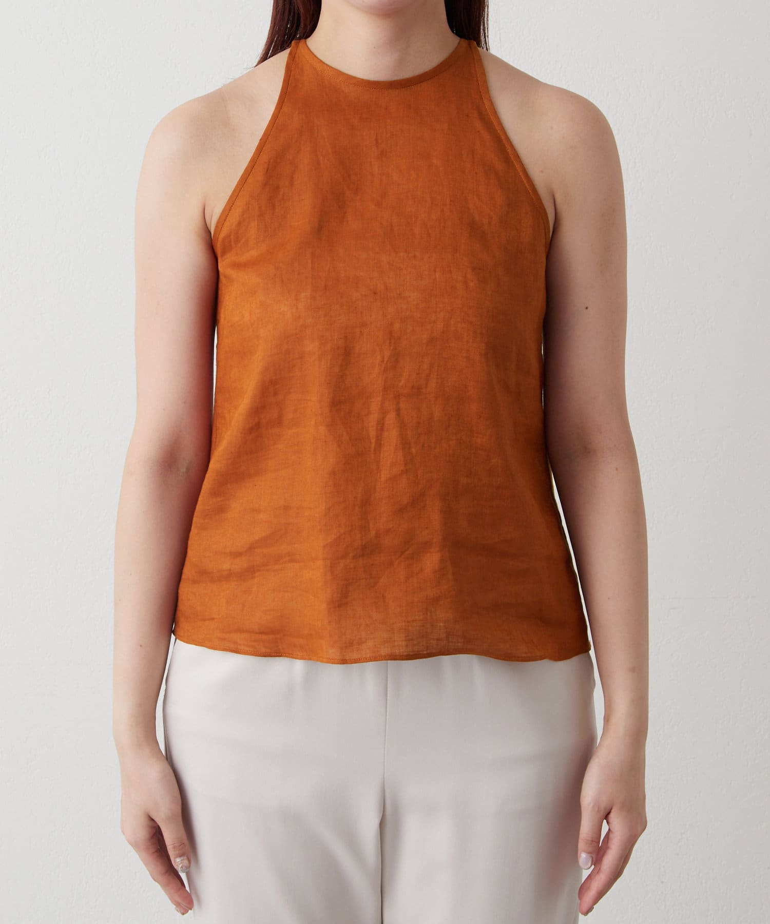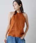 定番の平織りリネンで1枚でも活躍するホルターブラウス