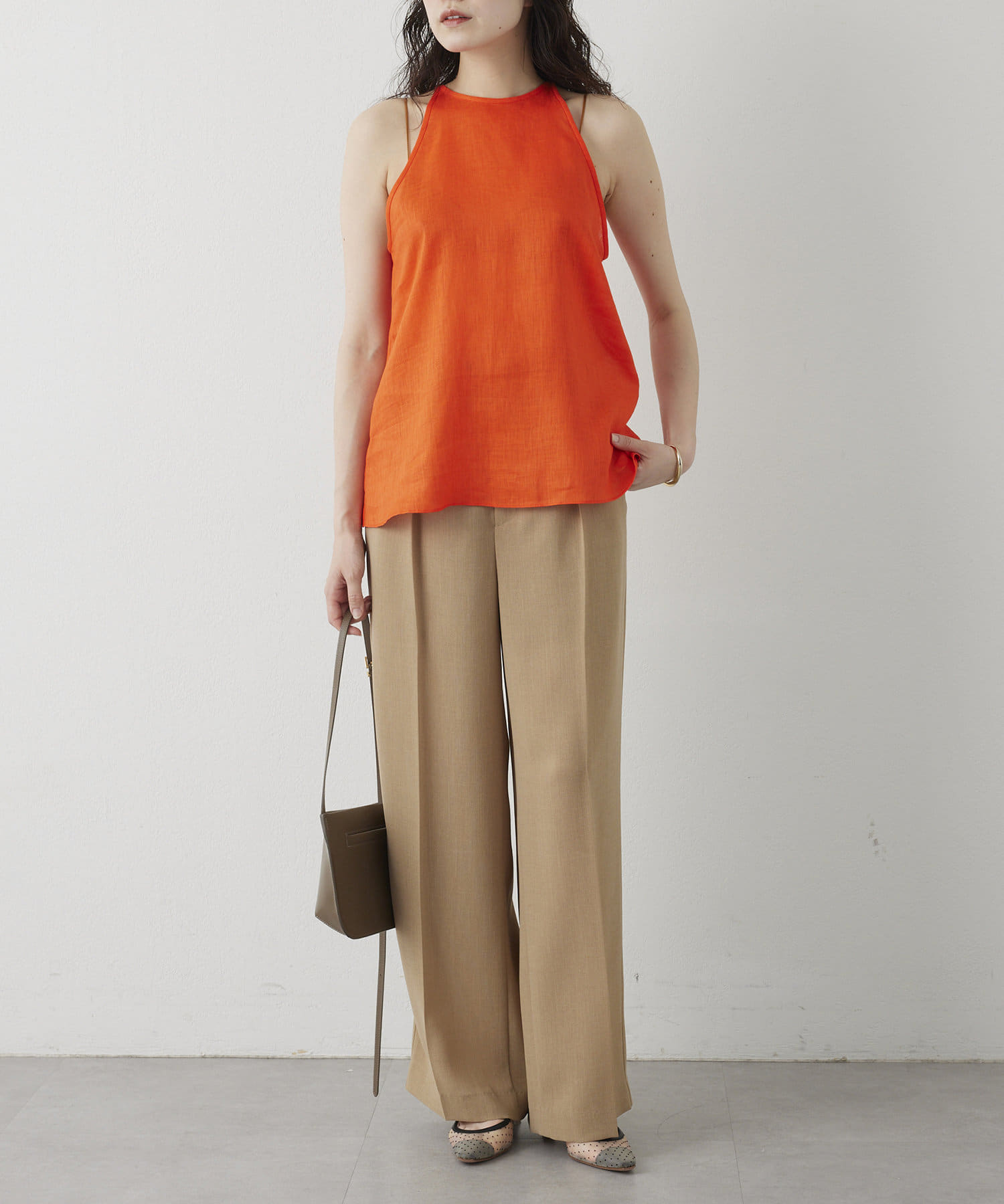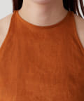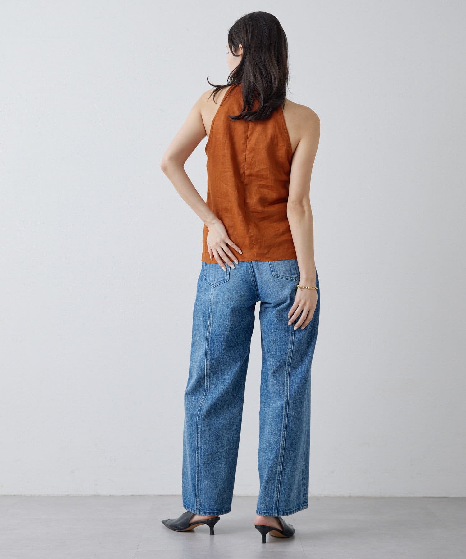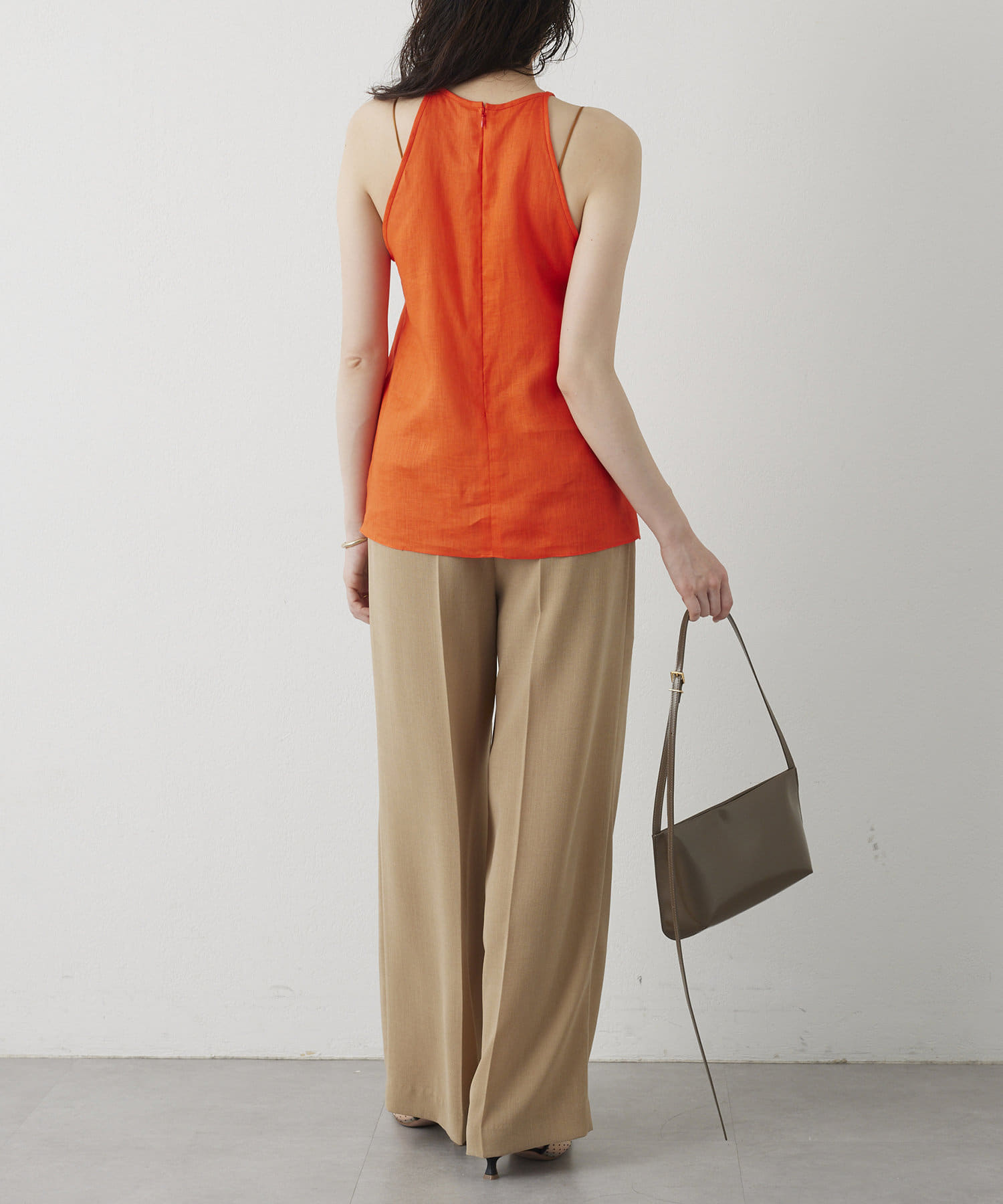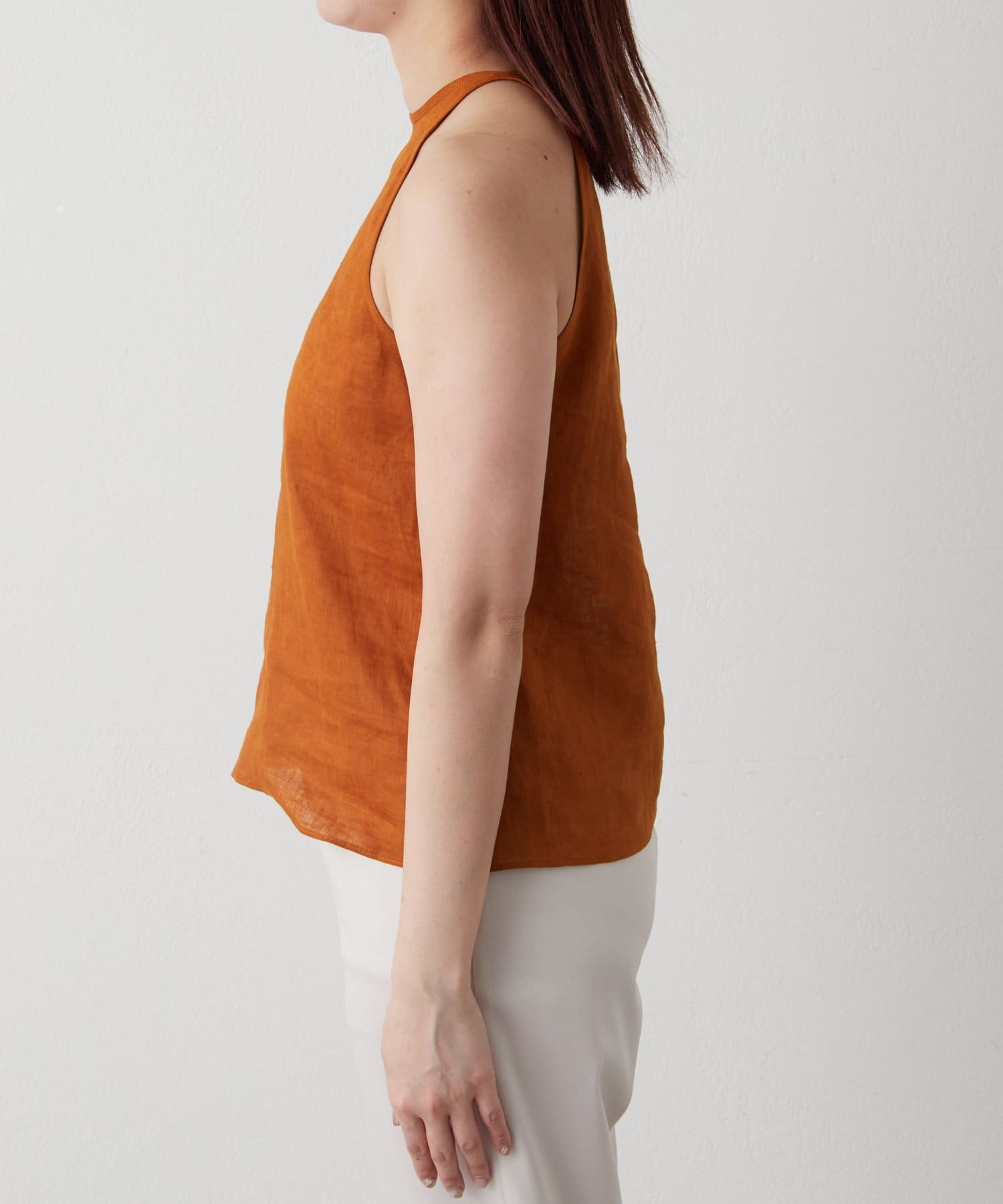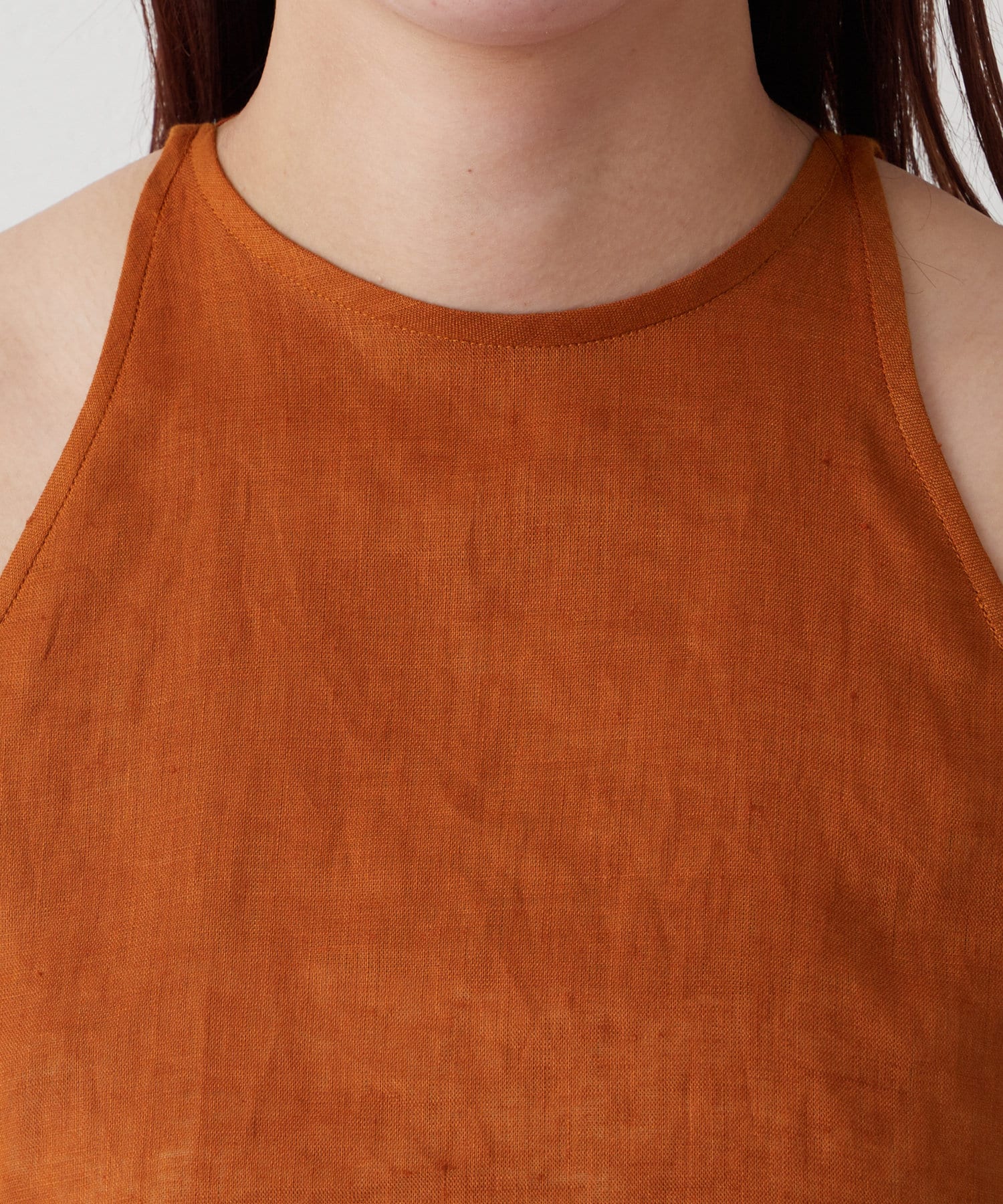 定番の平織りリネンで1枚でも活躍するホルターブラウス