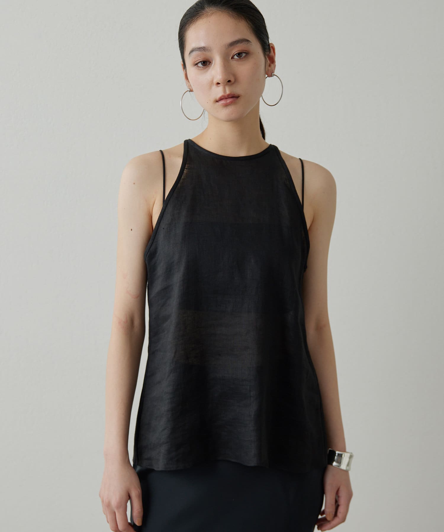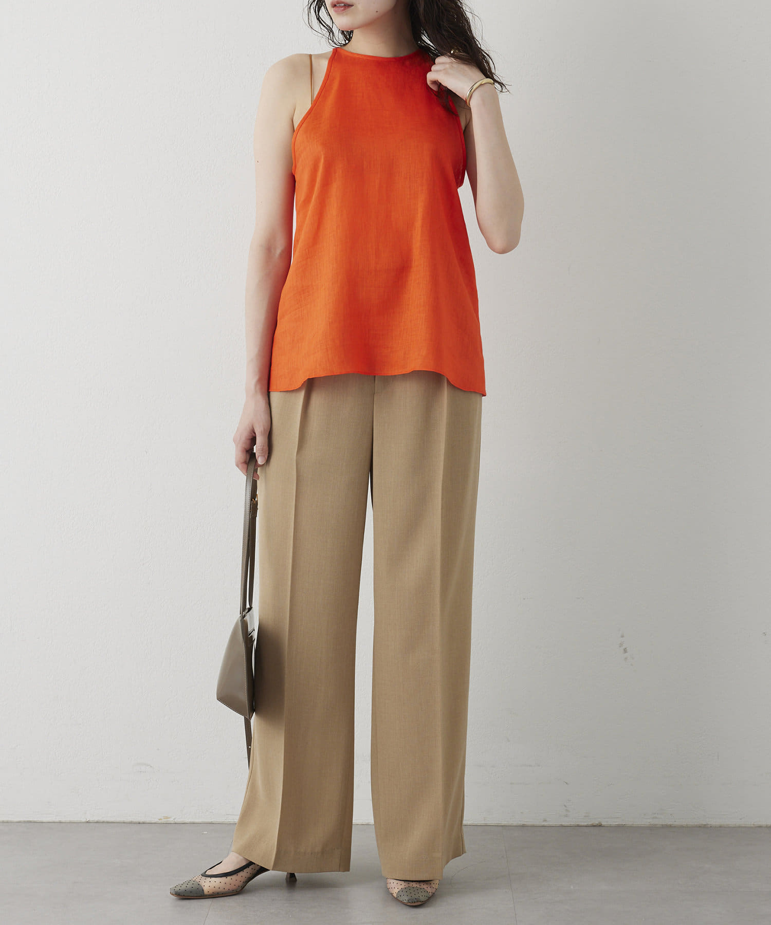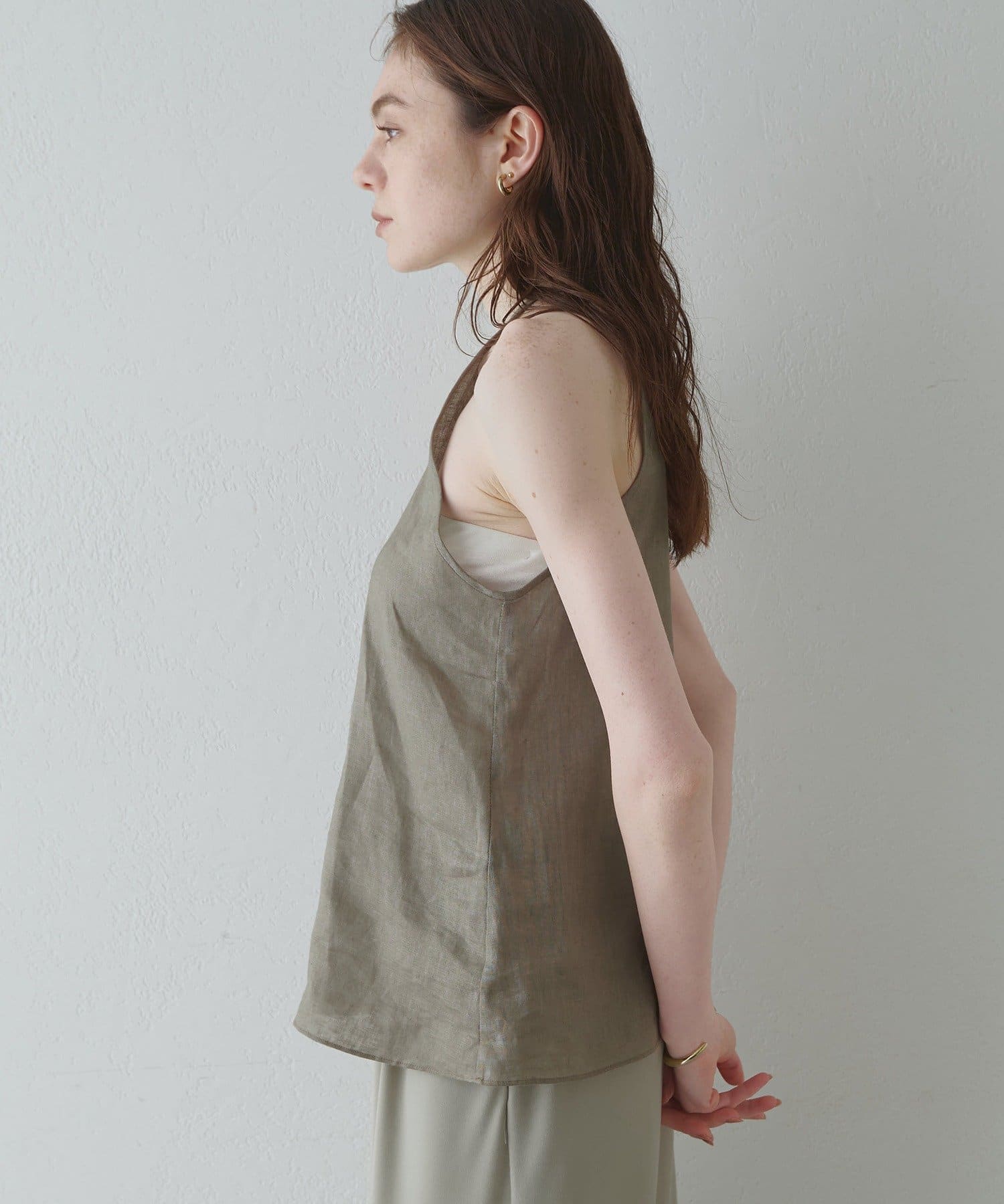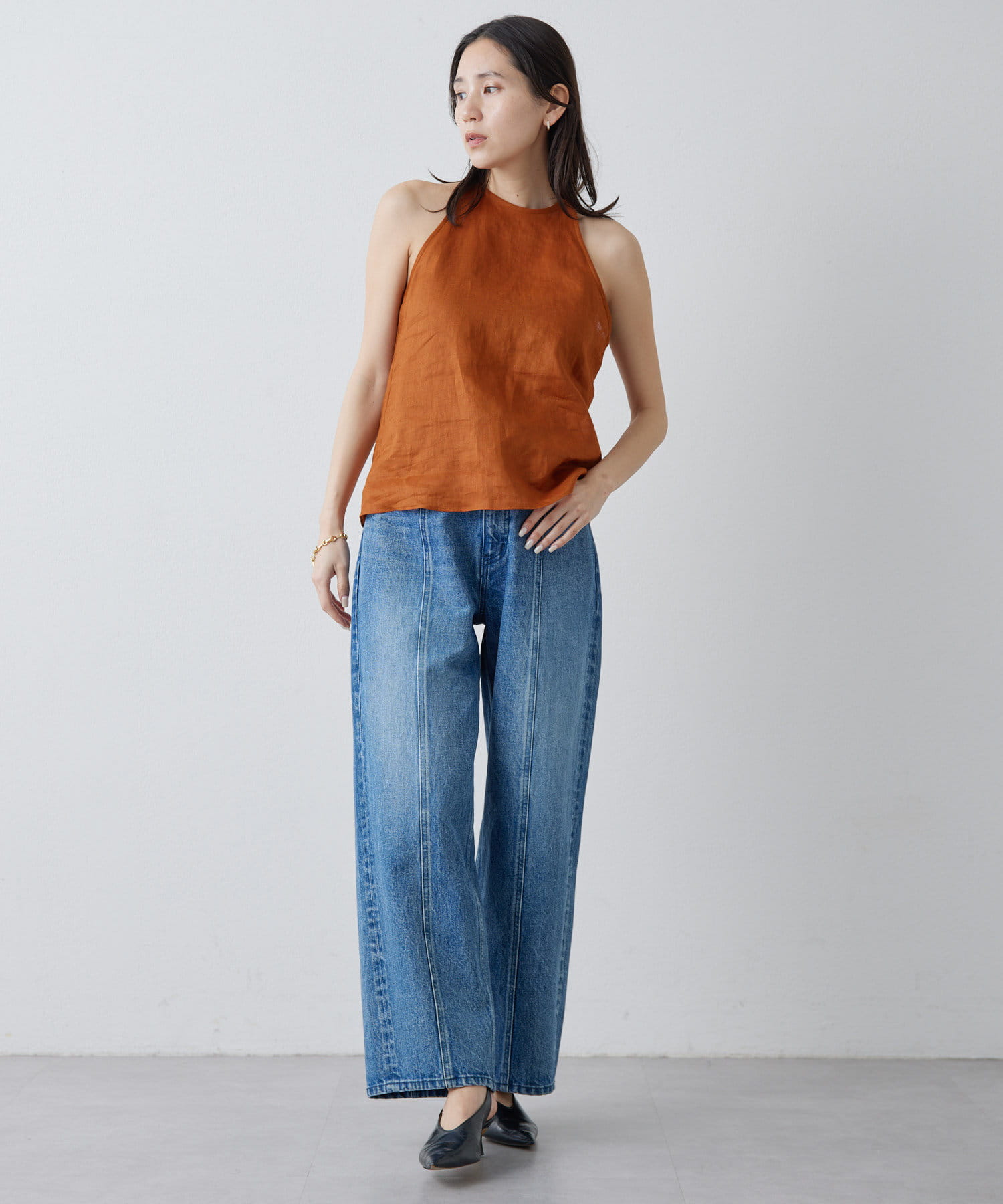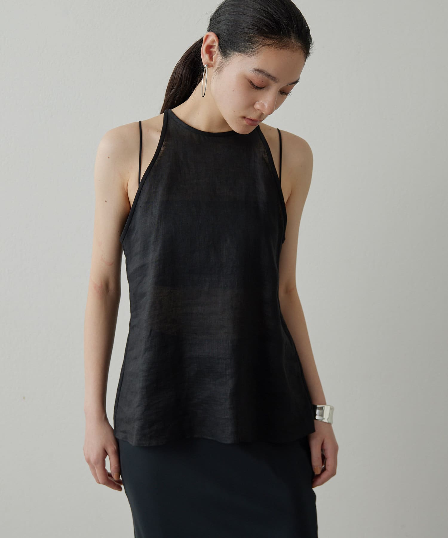 定番の平織りリネンで1枚でも活躍するホルターブラウス
