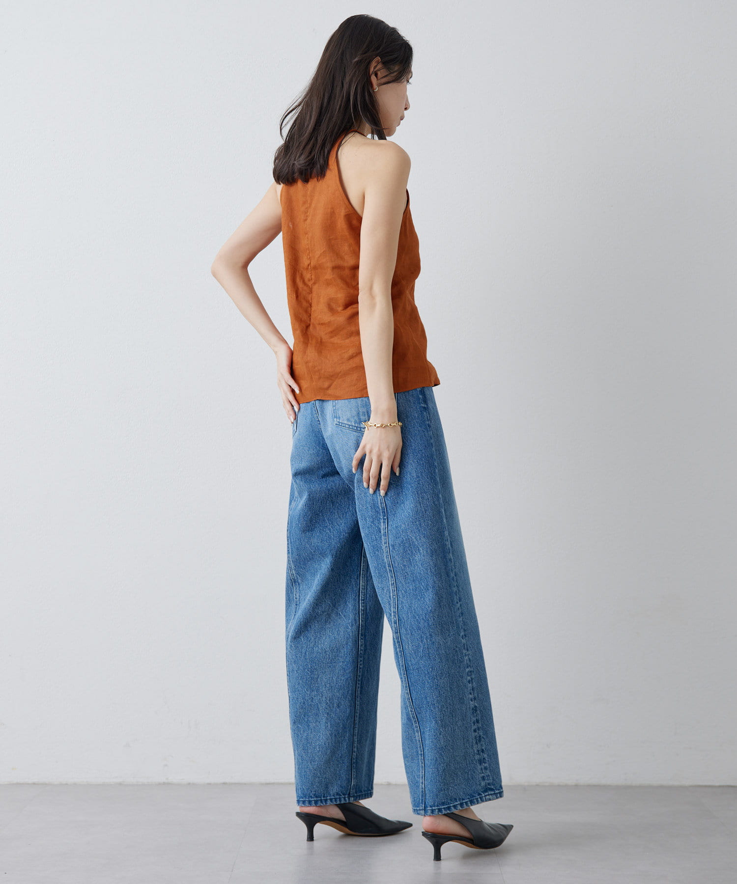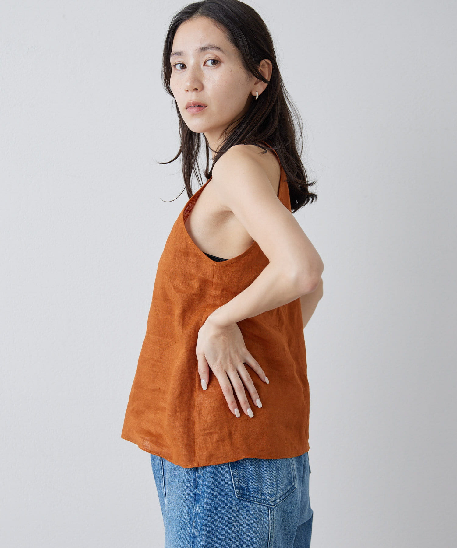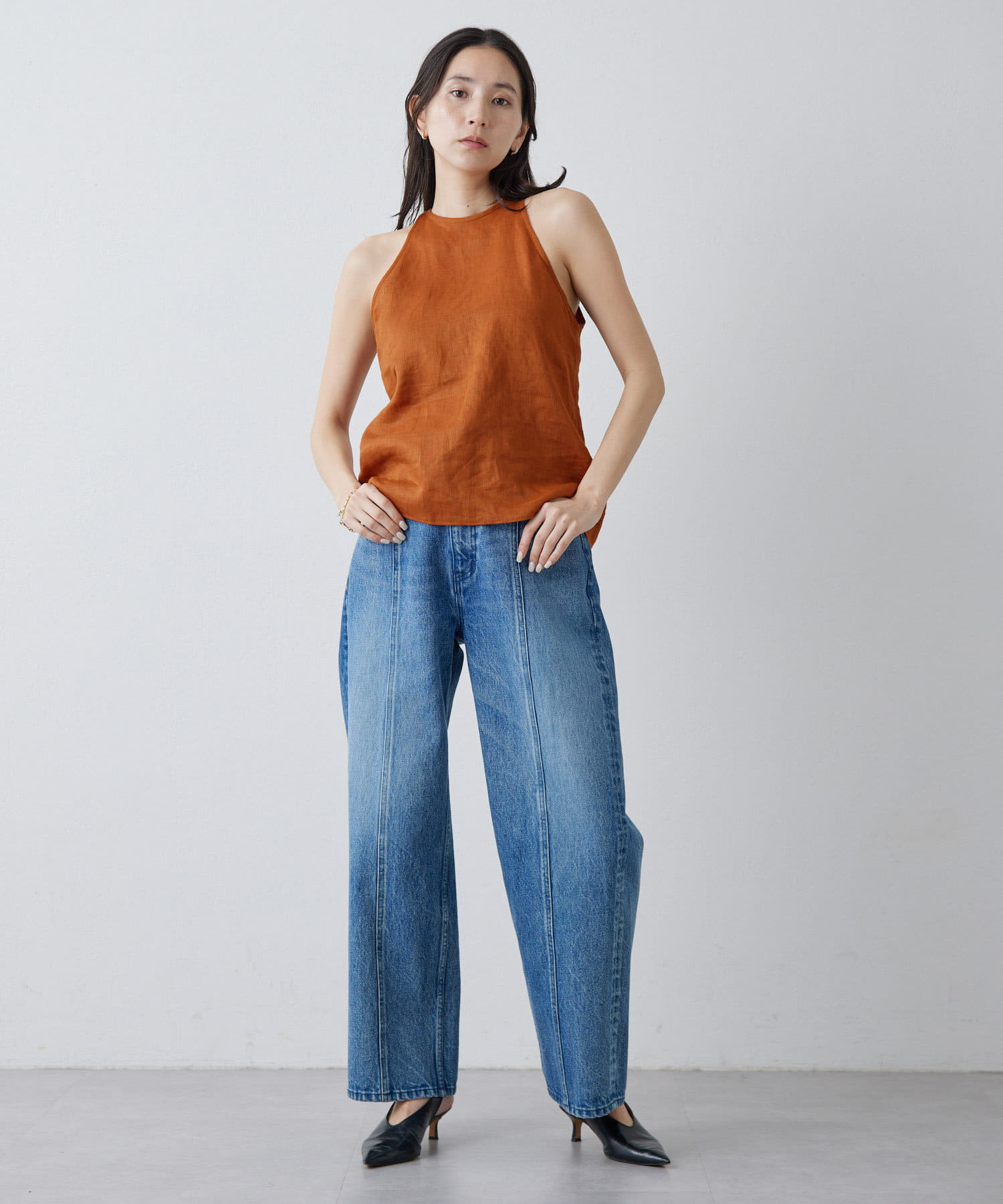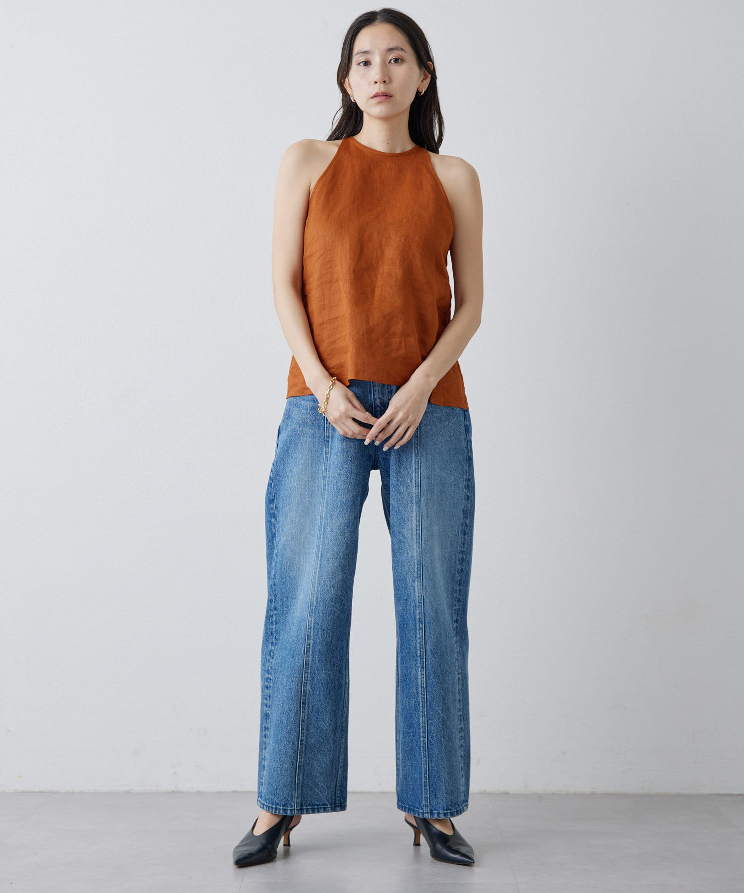 定番の平織りリネンで1枚でも活躍するホルターブラウス