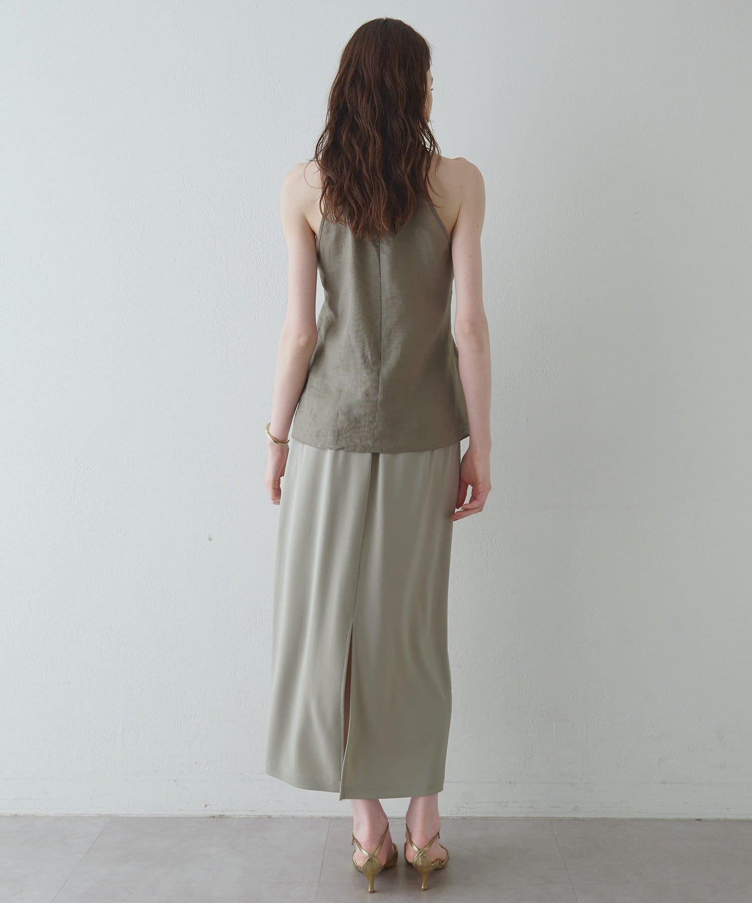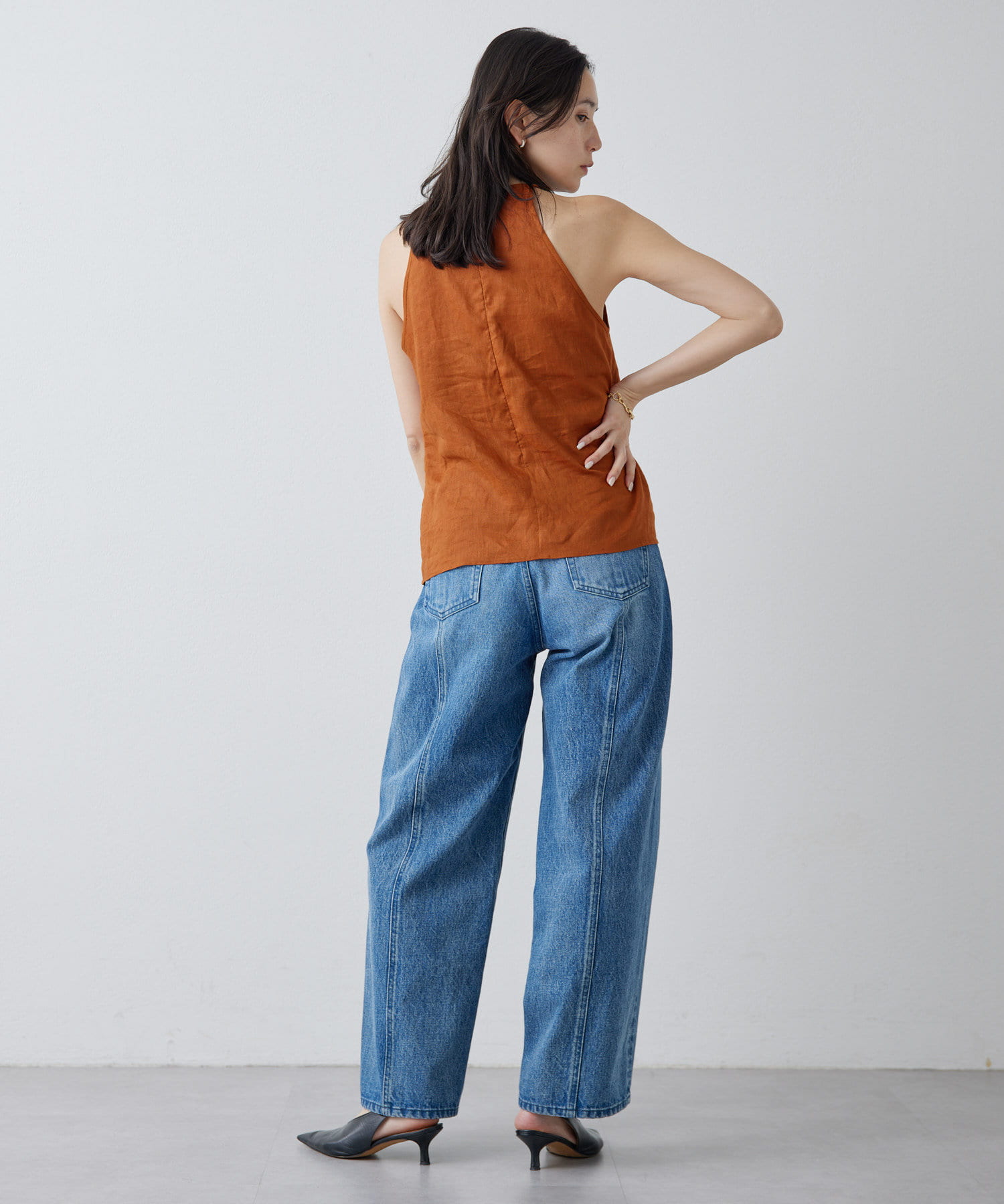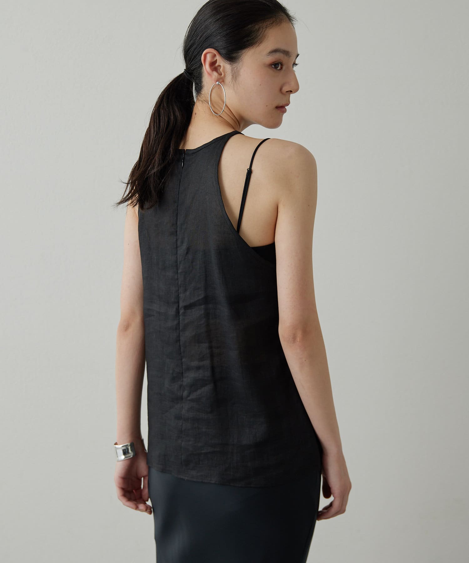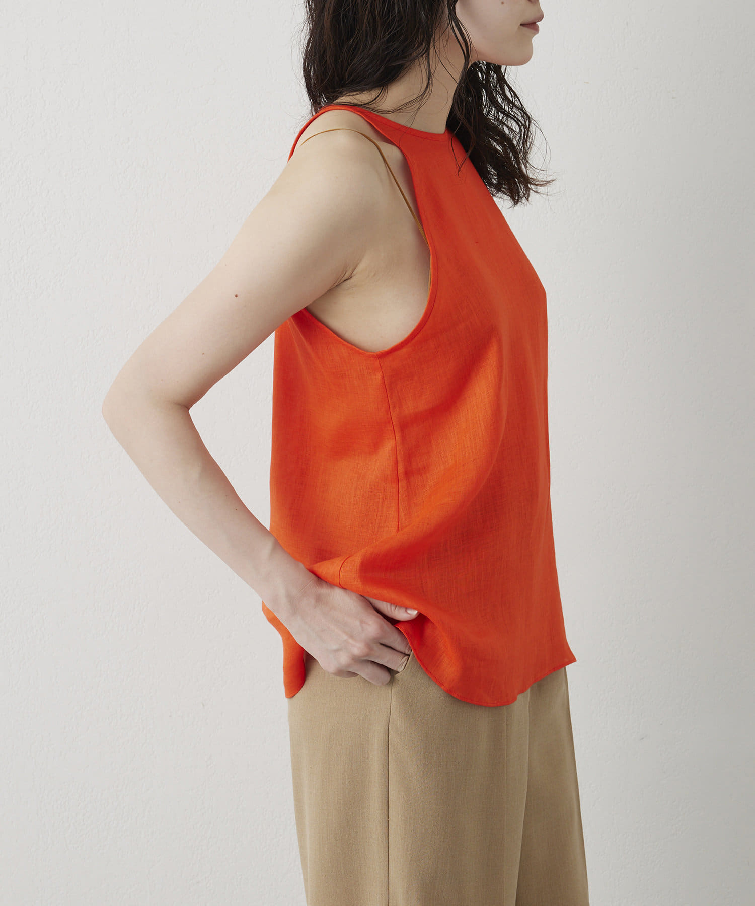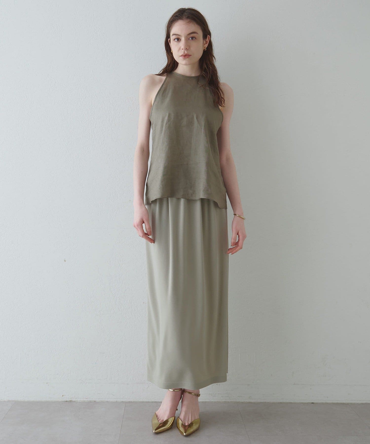 定番の平織りリネンで1枚でも活躍するホルターブラウス