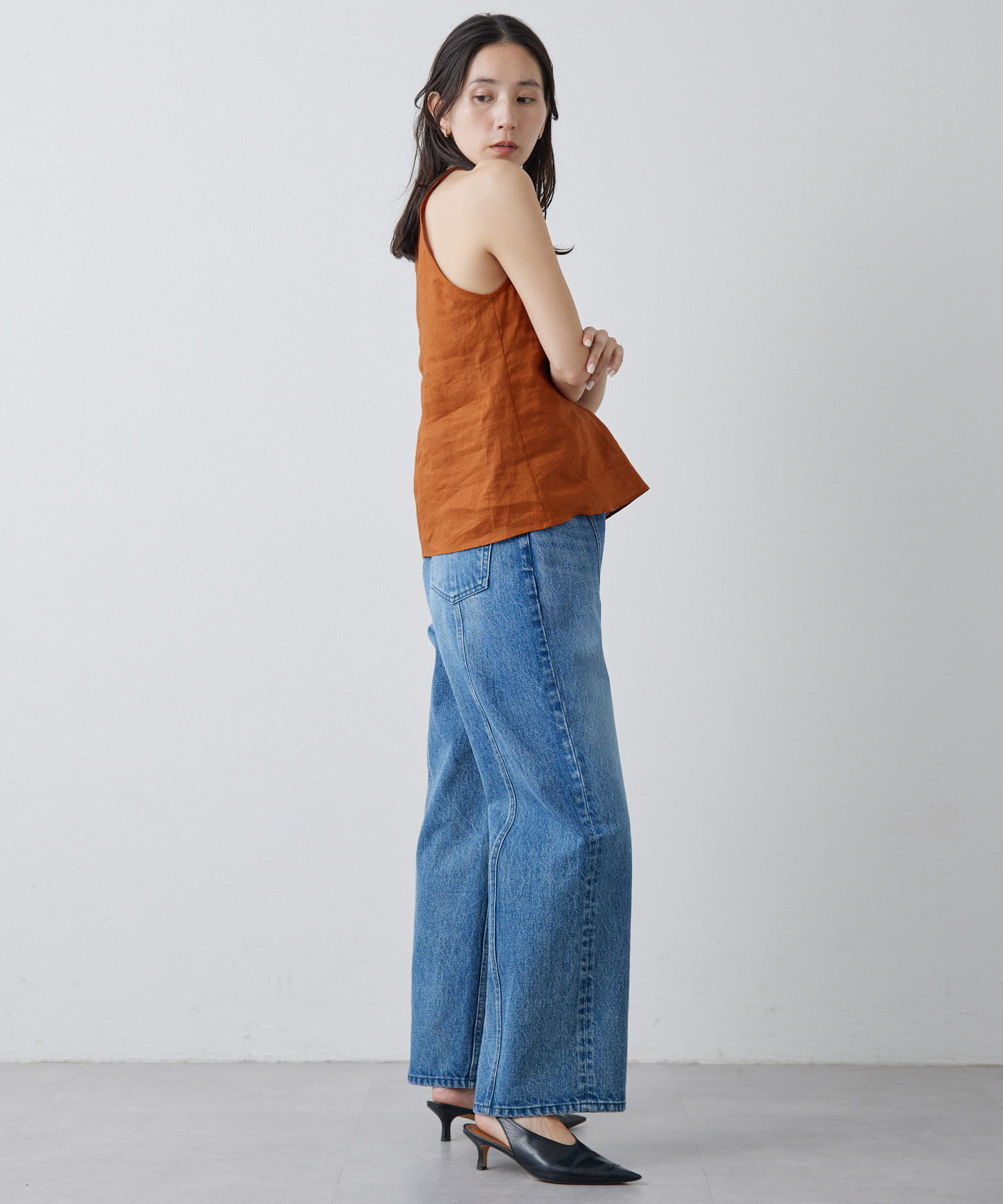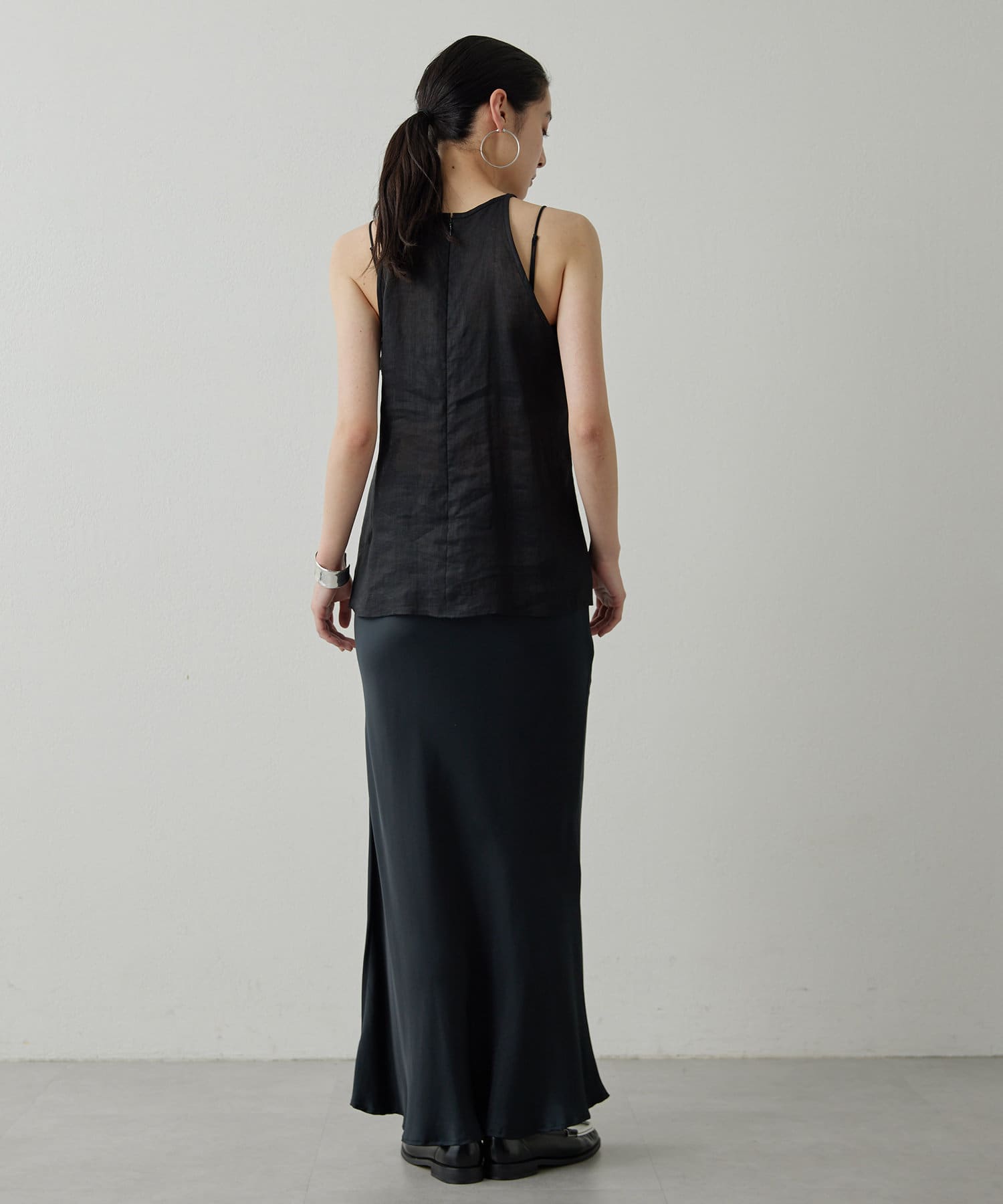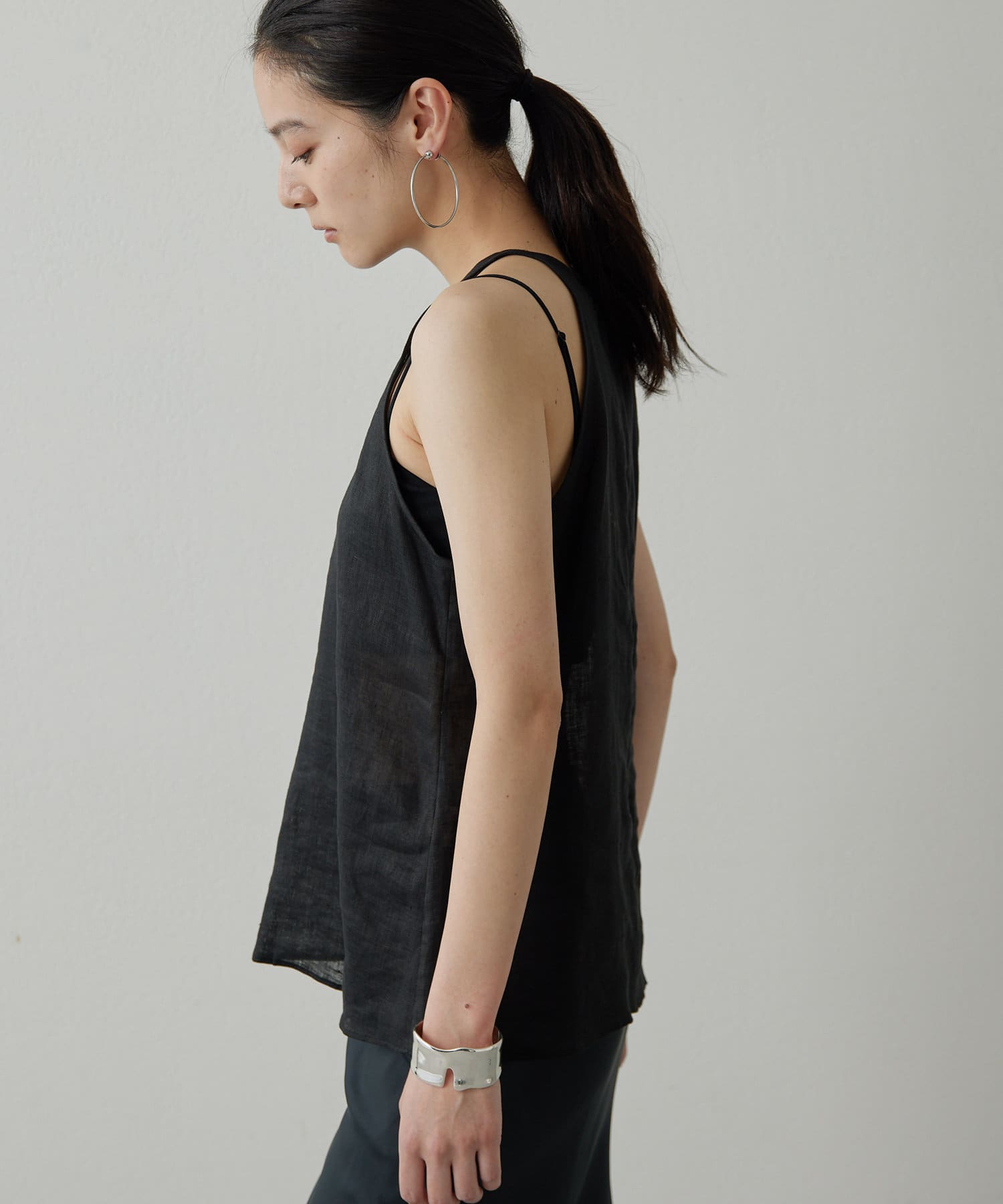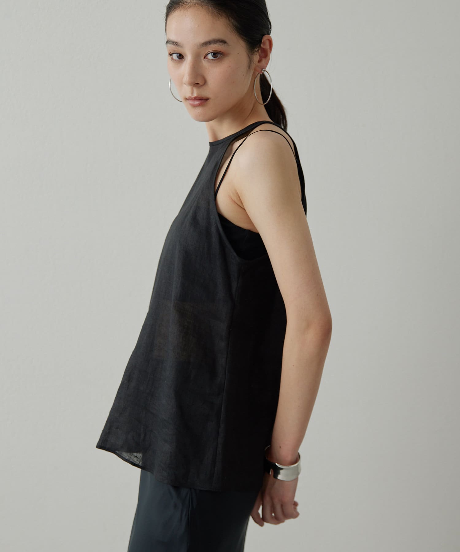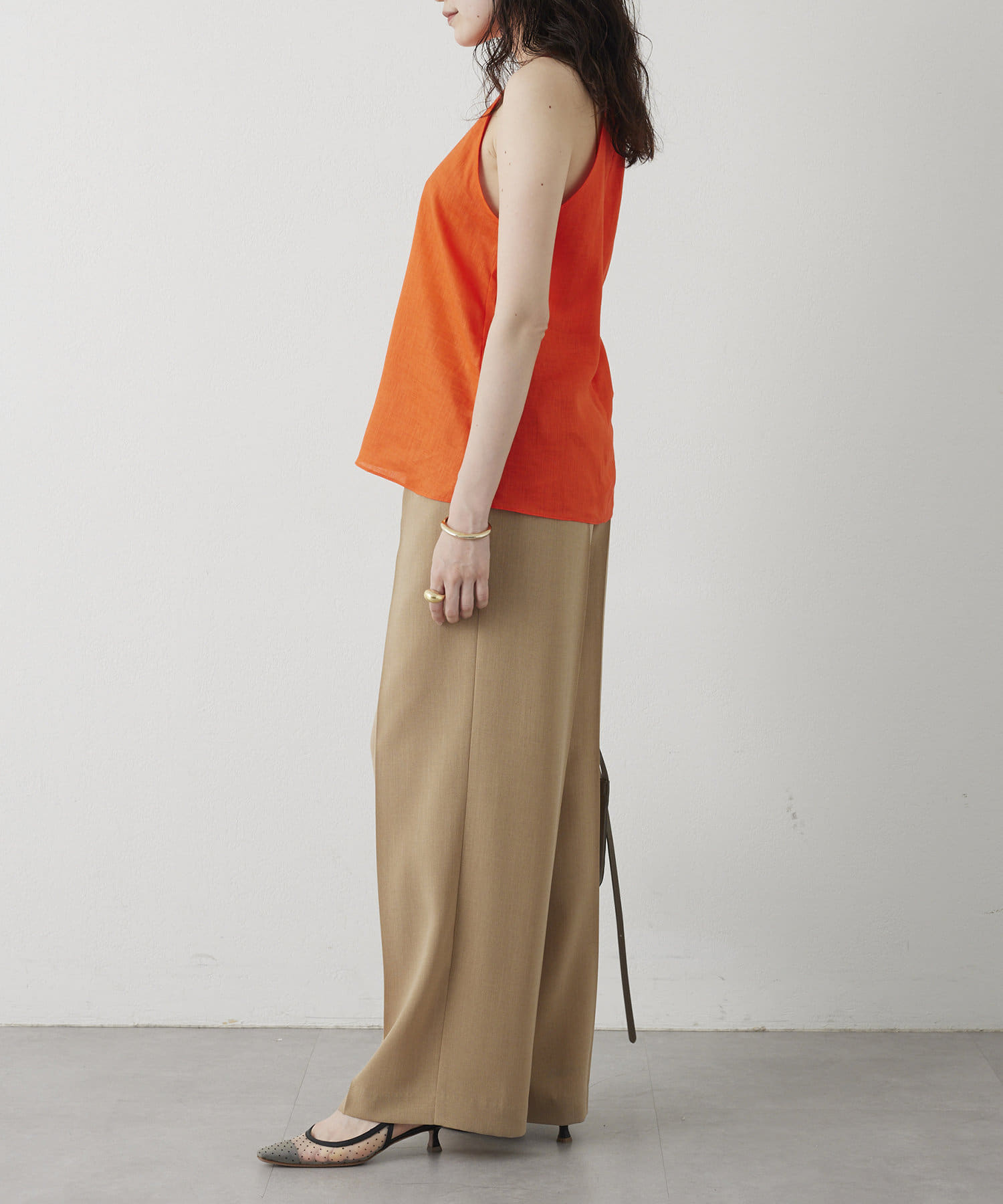 定番の平織りリネンで1枚でも活躍するホルターブラウス
