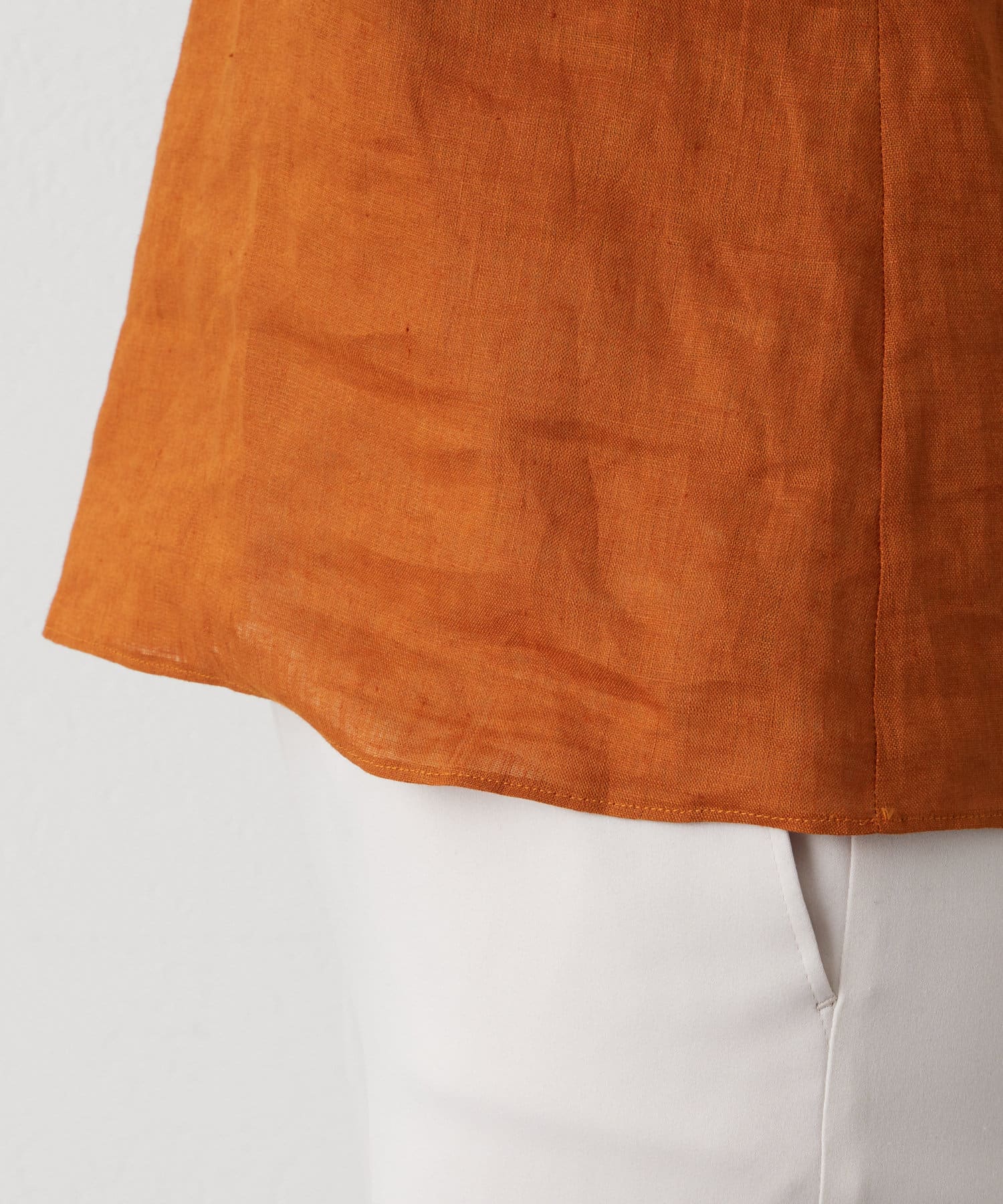 リネンの爽やかなトップス。程よい抜け感で上半身がスッキリとした印象に。大人の女性ならではの、脇のハミ肉が目立ちにくい綺麗なデザインだと思いました。カジュアルですが綺麗見えも叶うブラウスです。ご自宅でのお手入れも可能。活躍間違いなしです。