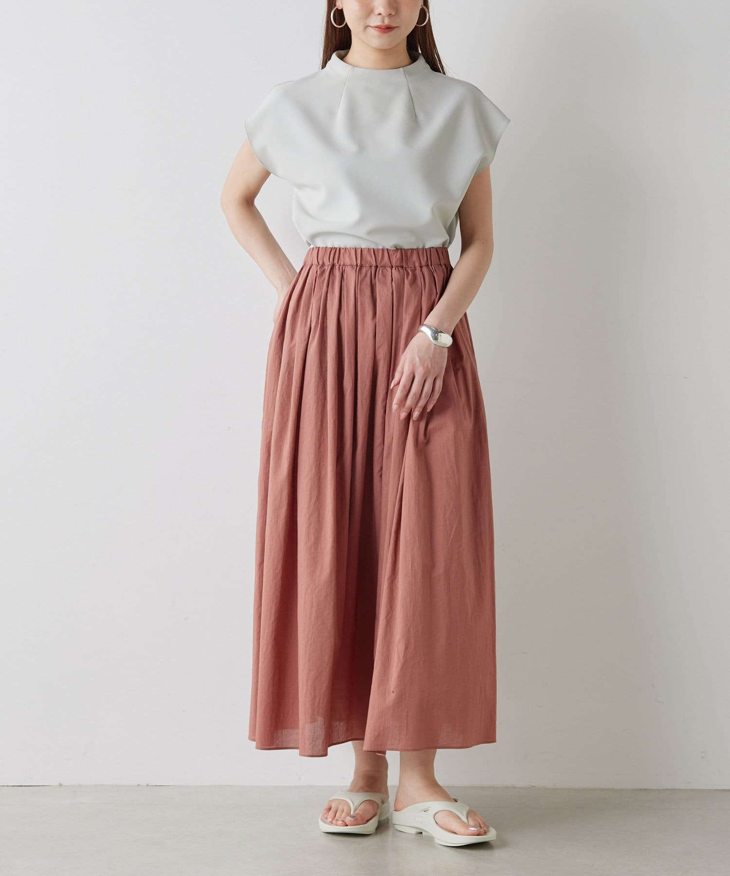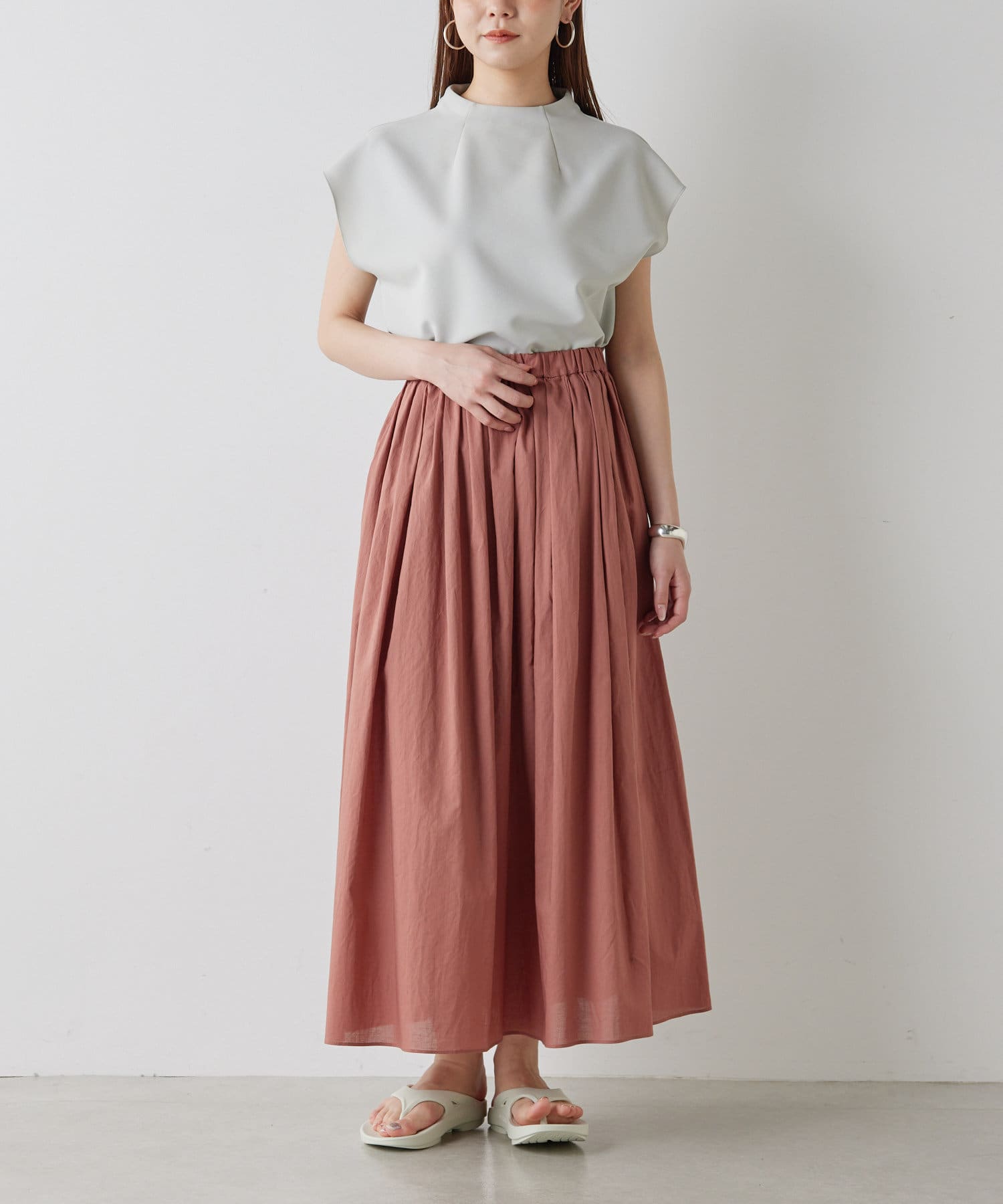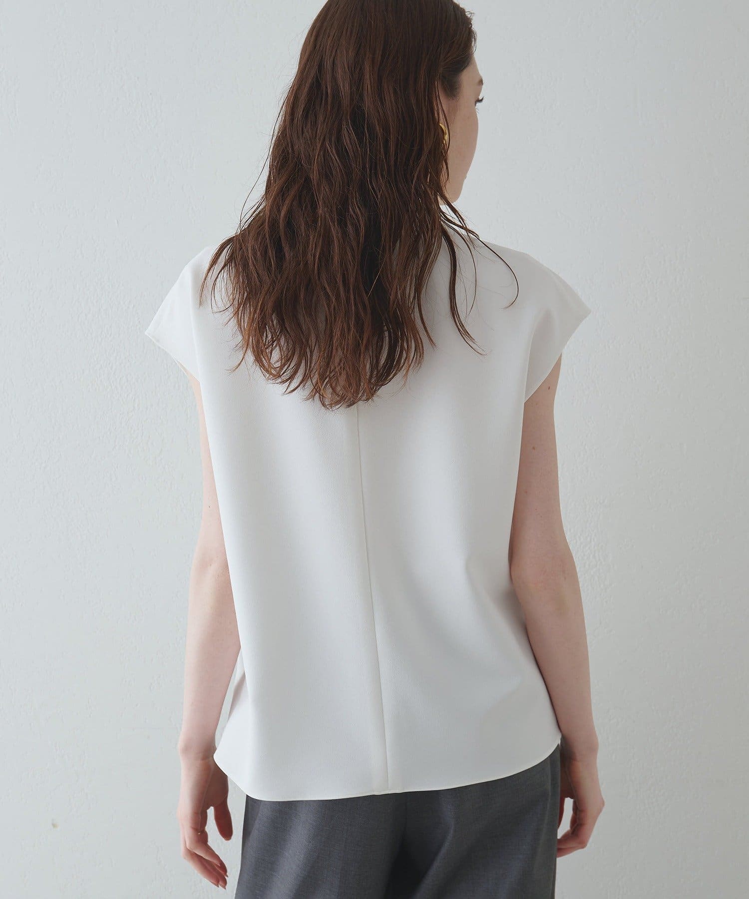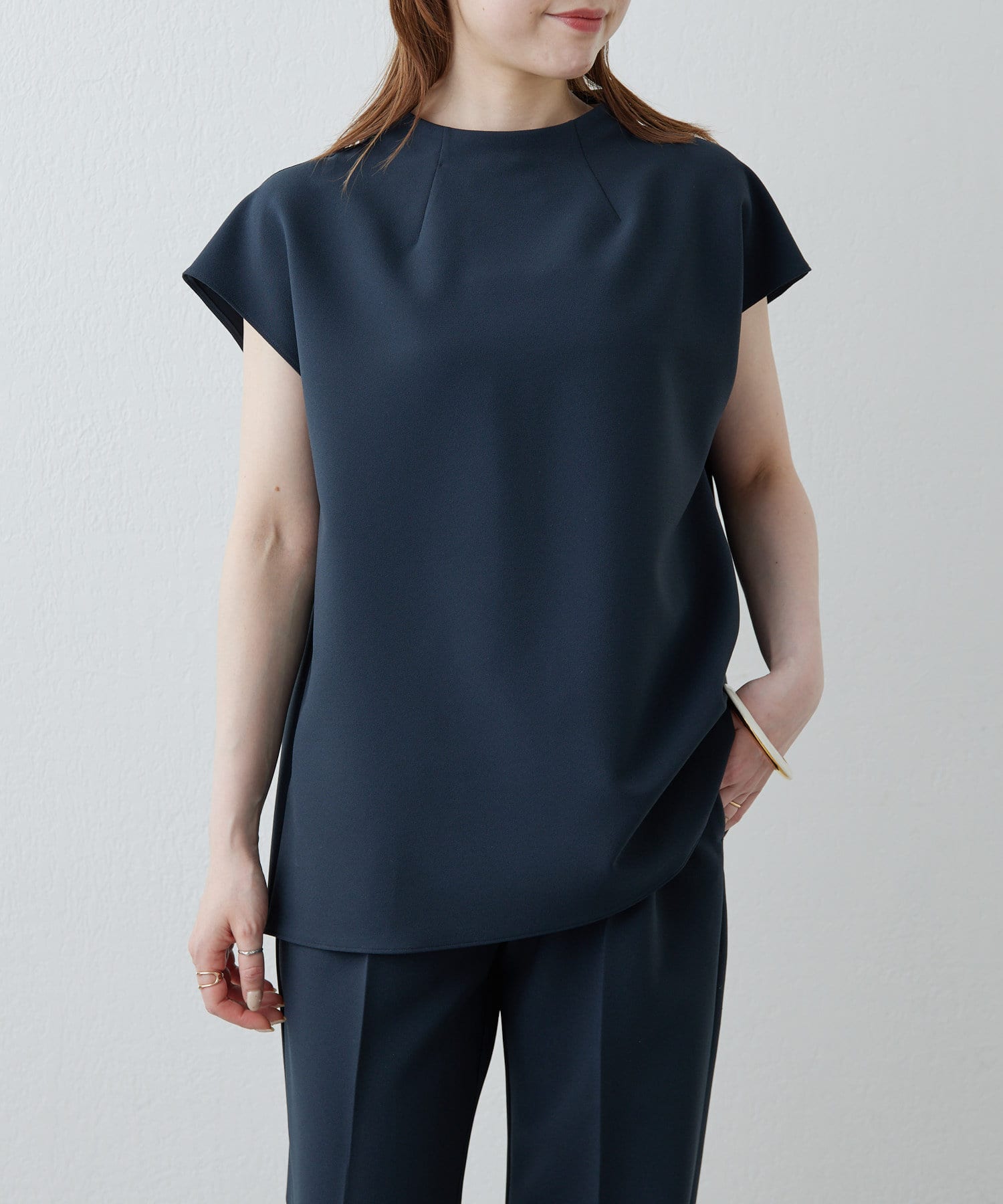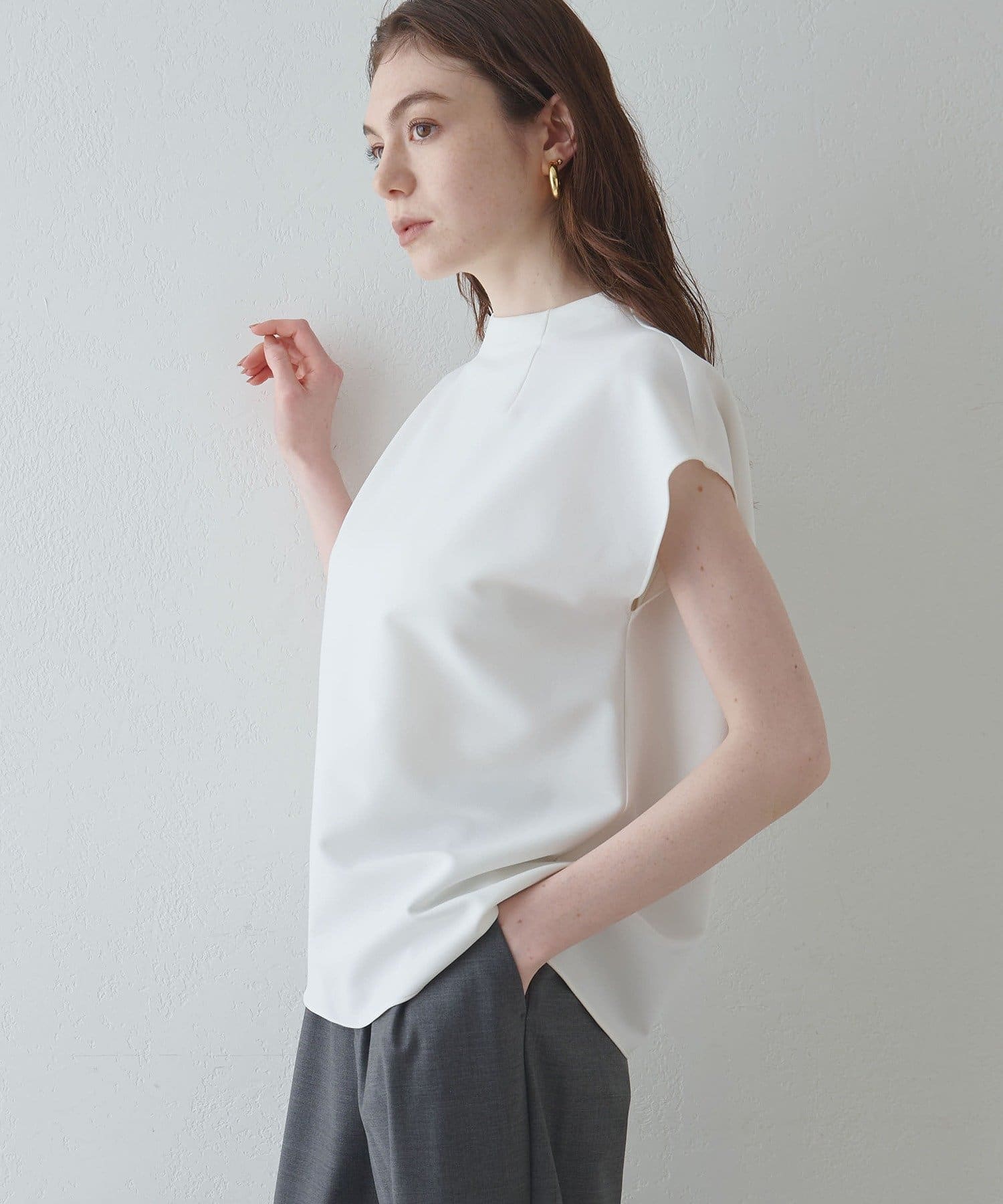 ■程よいハリ感のある生地がボディラインを拾わず、スタイルアップを叶えてくれる一枚。