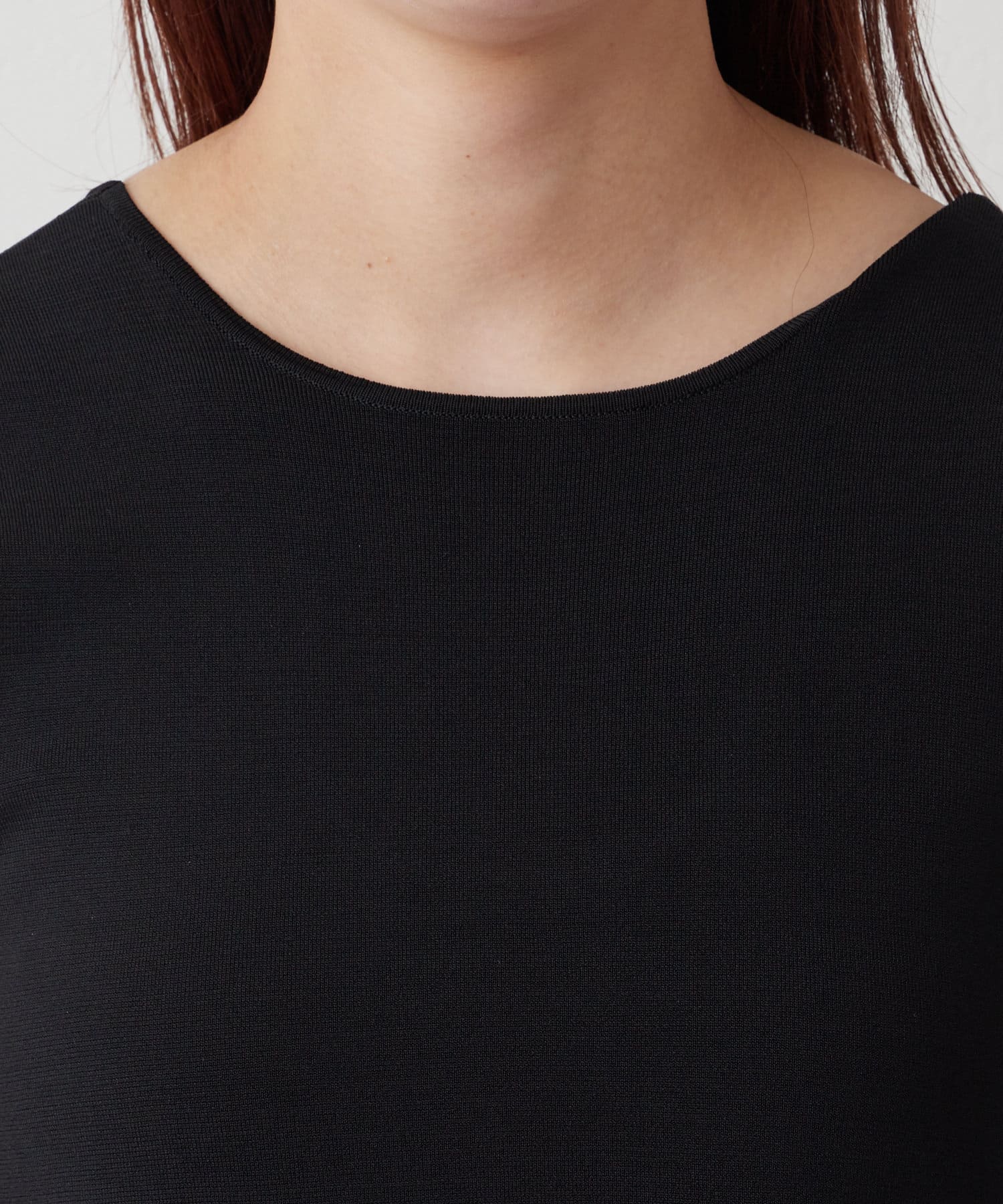 ■首に緩やかに添うクルーネックに、背中の開いたデザインがポイント。