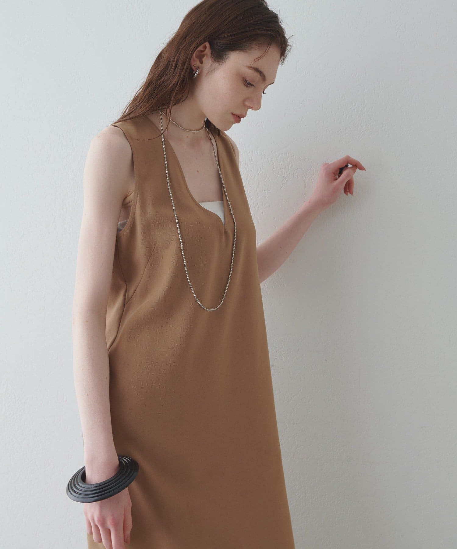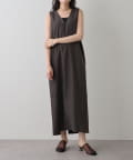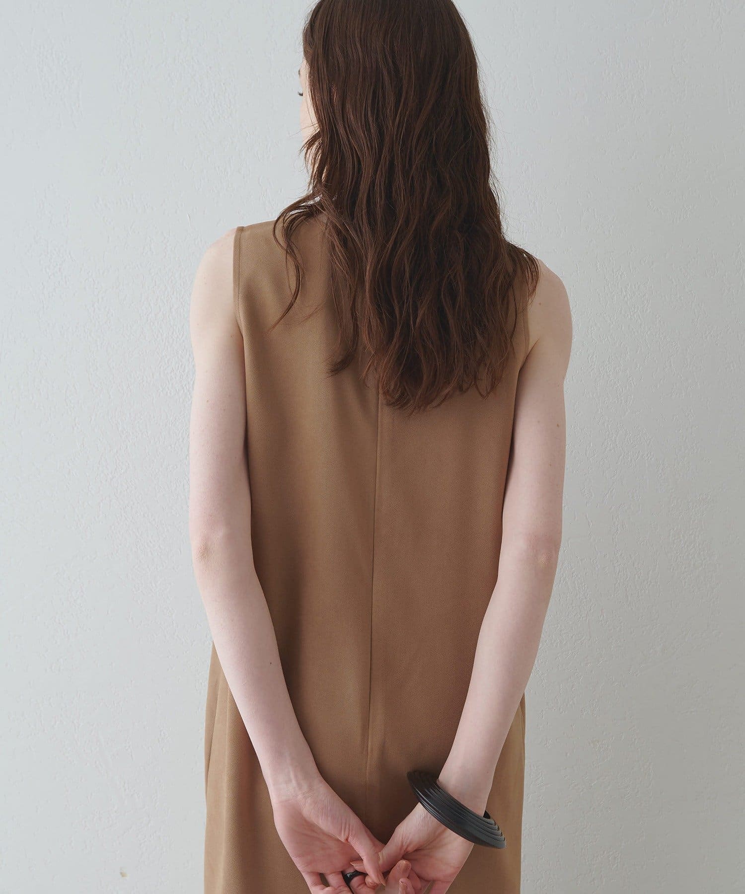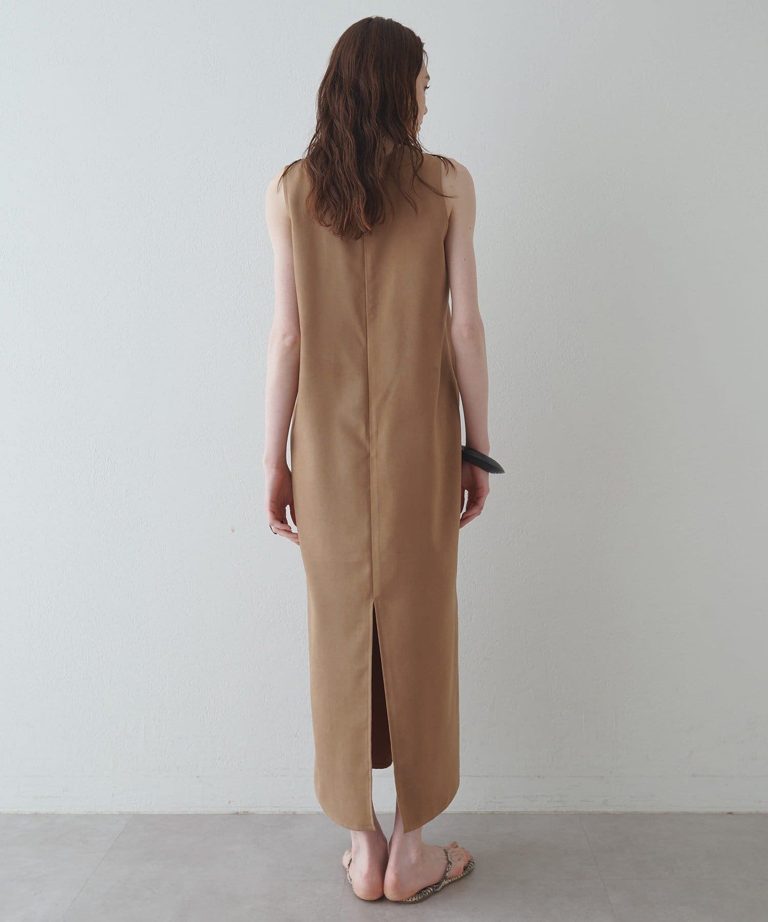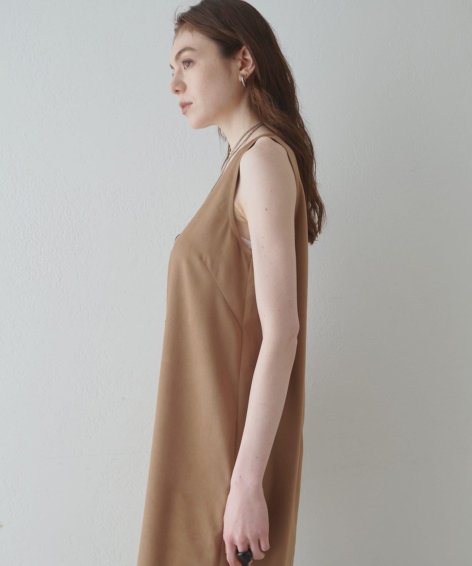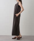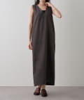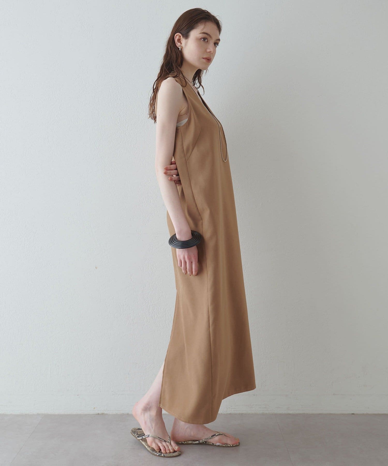 ■深めのVネック開きが特徴的なノースリーブワンピース。