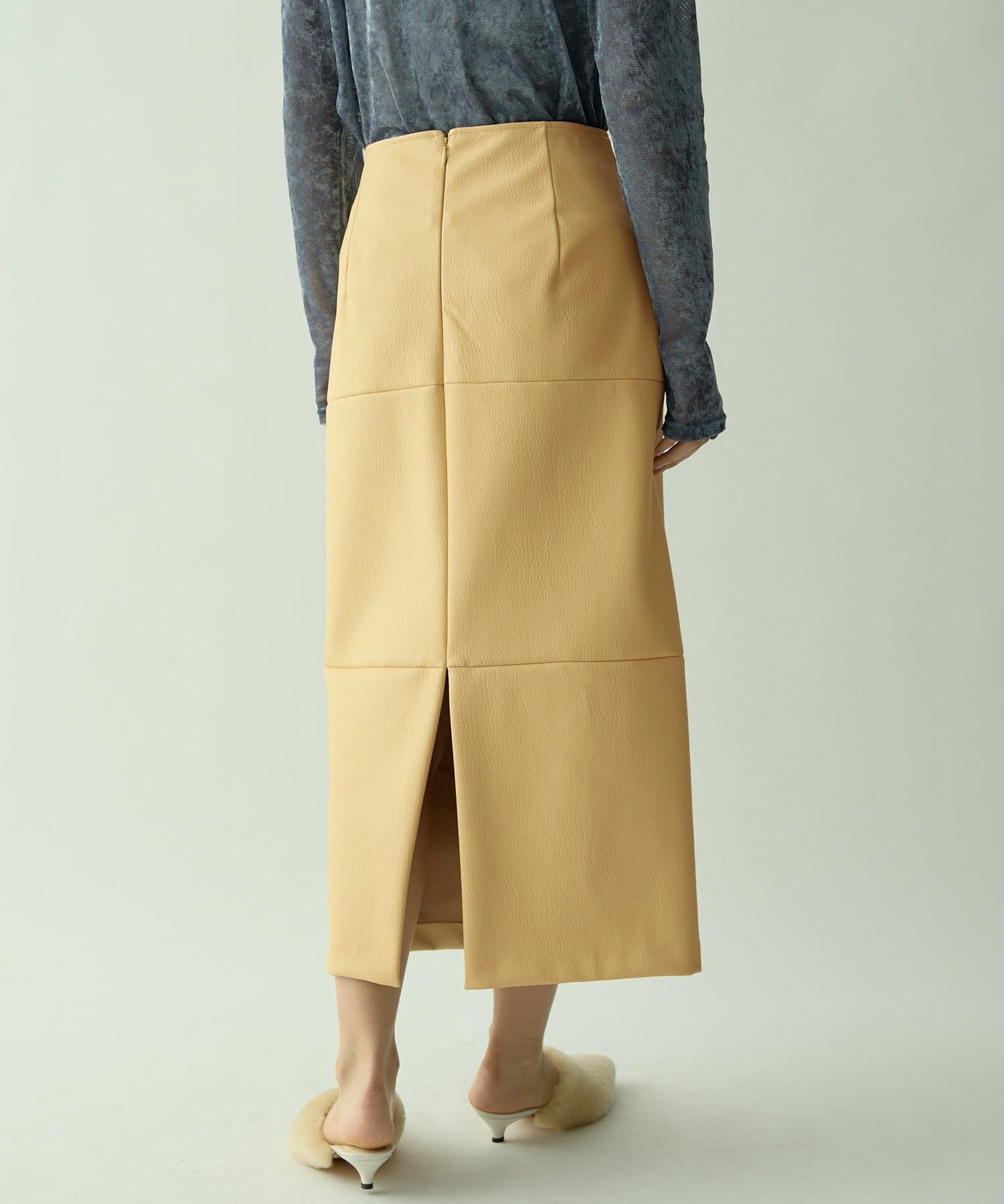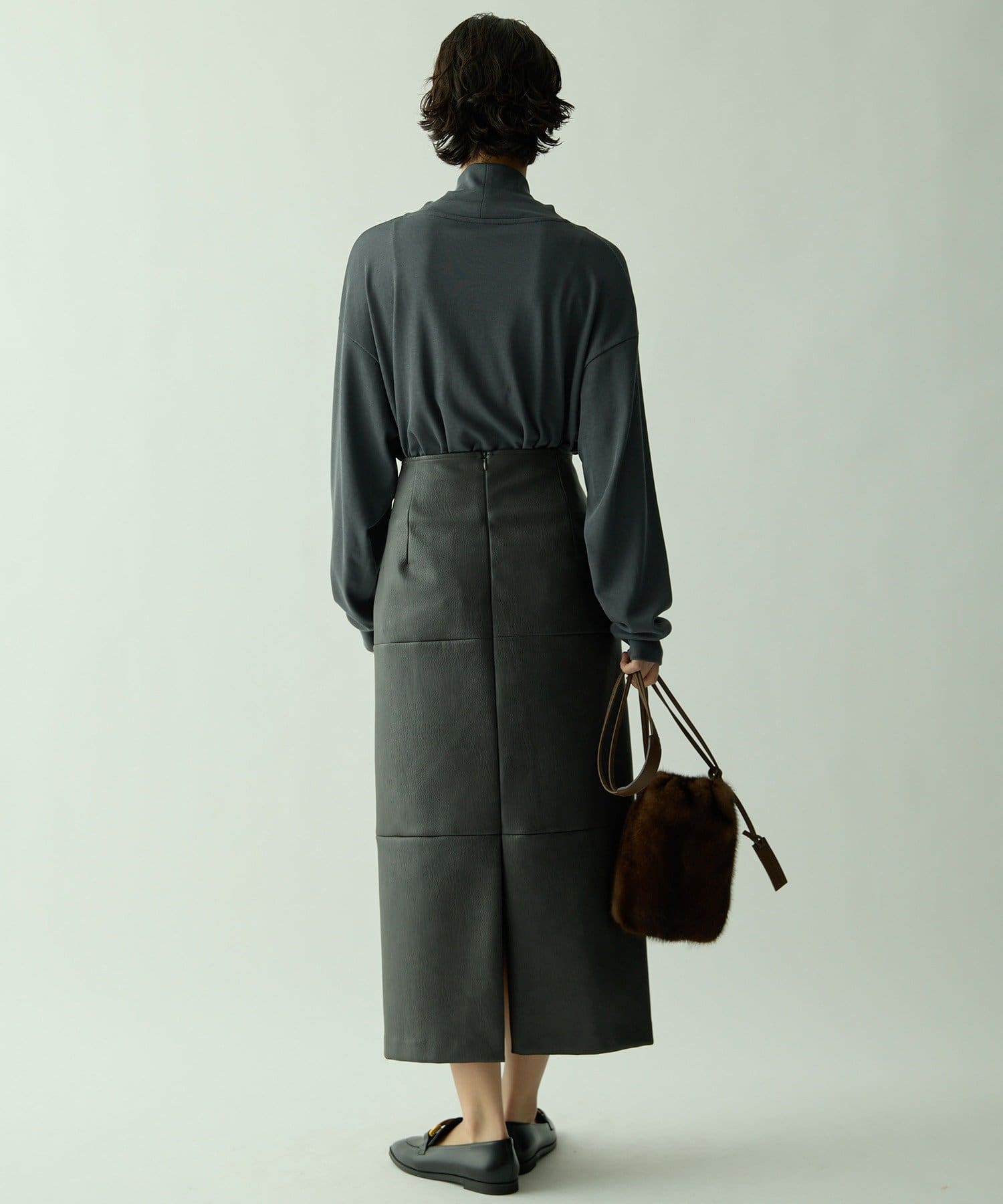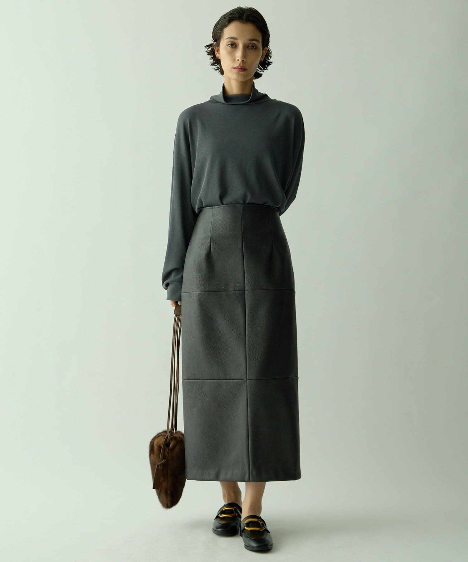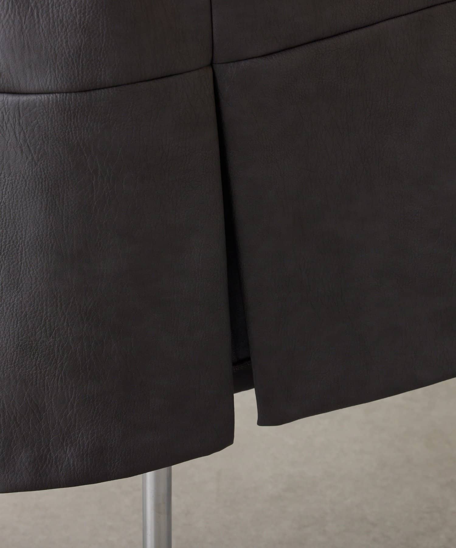 ■肉厚な表情あるエコレザーで作られたミディ丈のスカート。