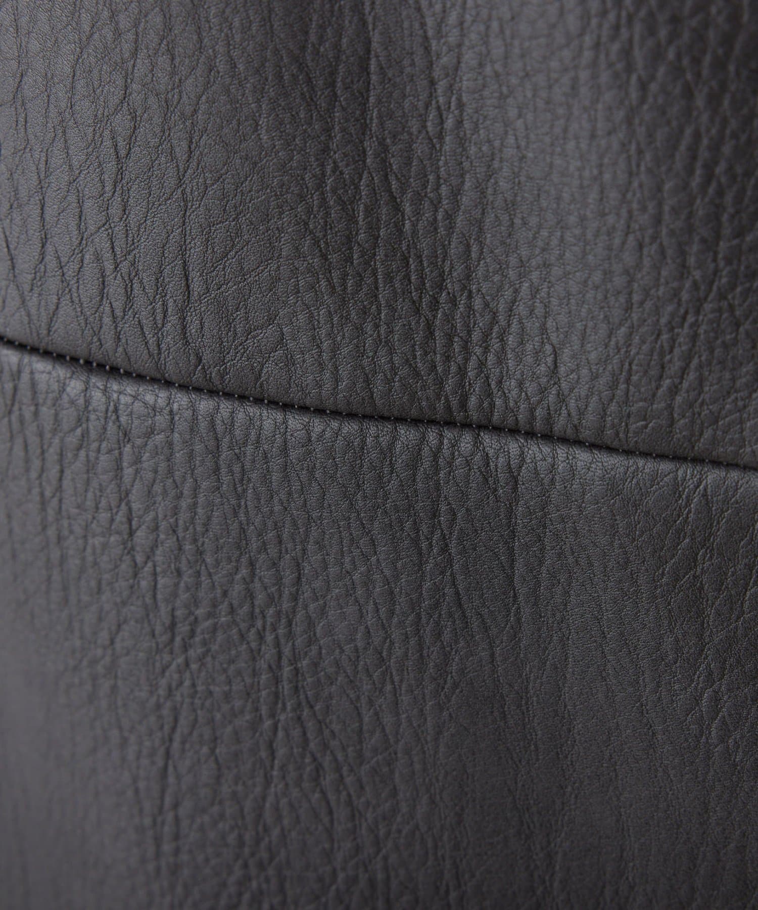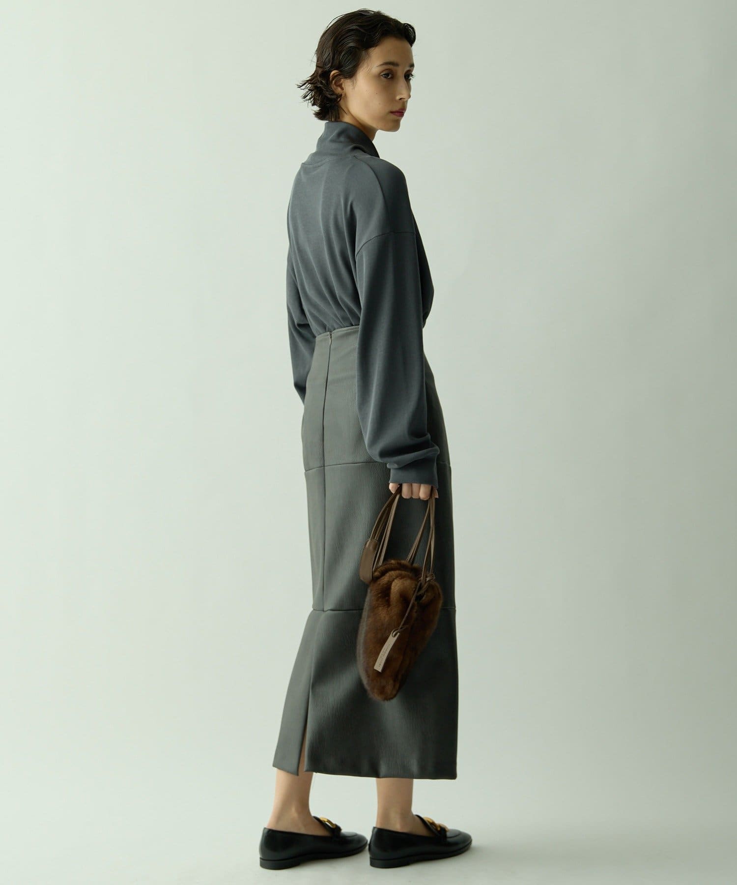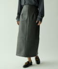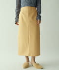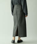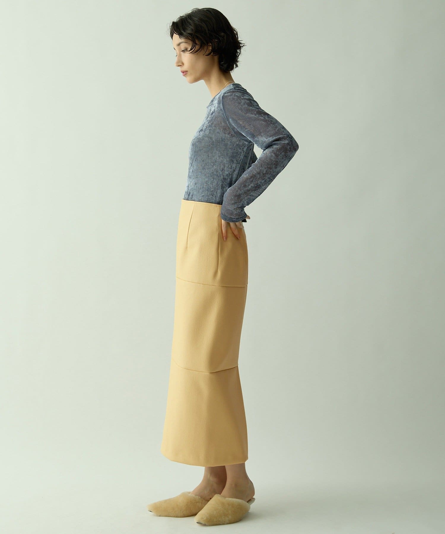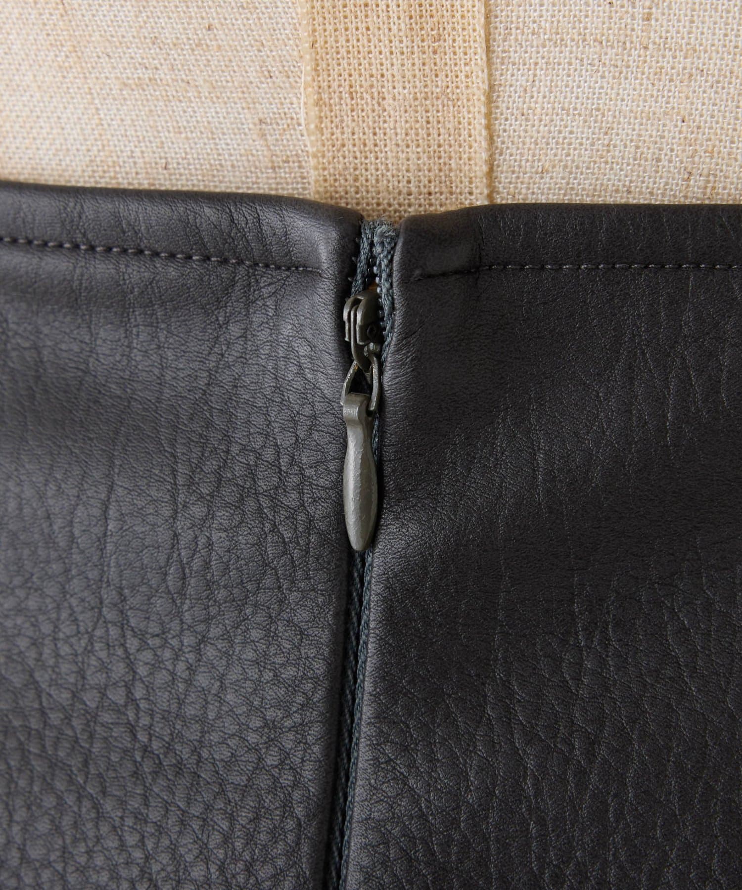 ■肉厚な表情あるエコレザーで作られたミディ丈のスカート。
