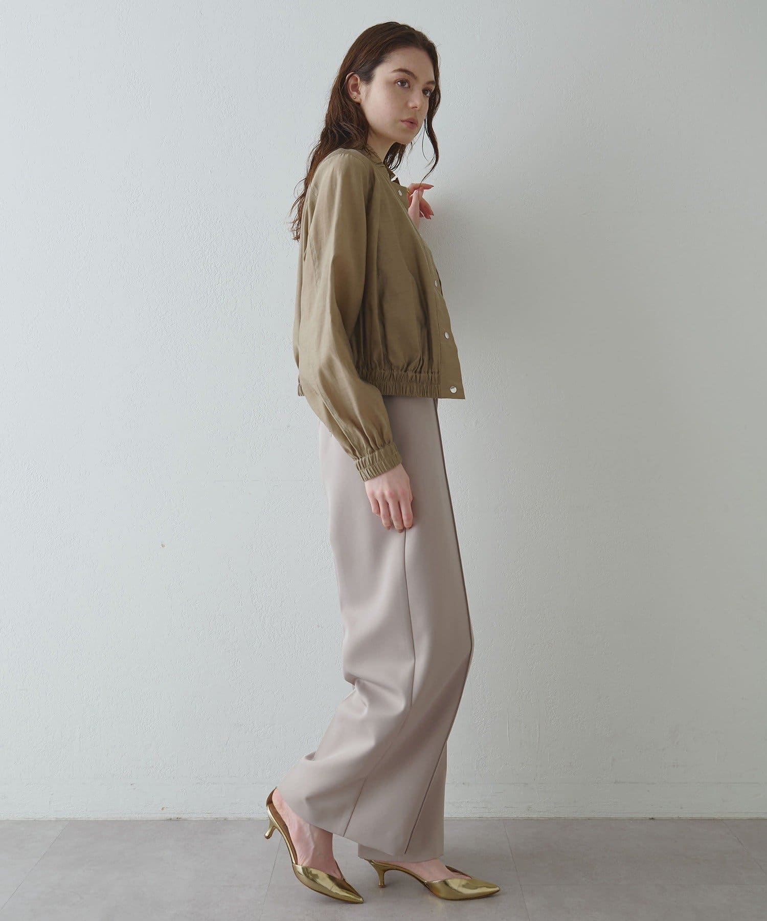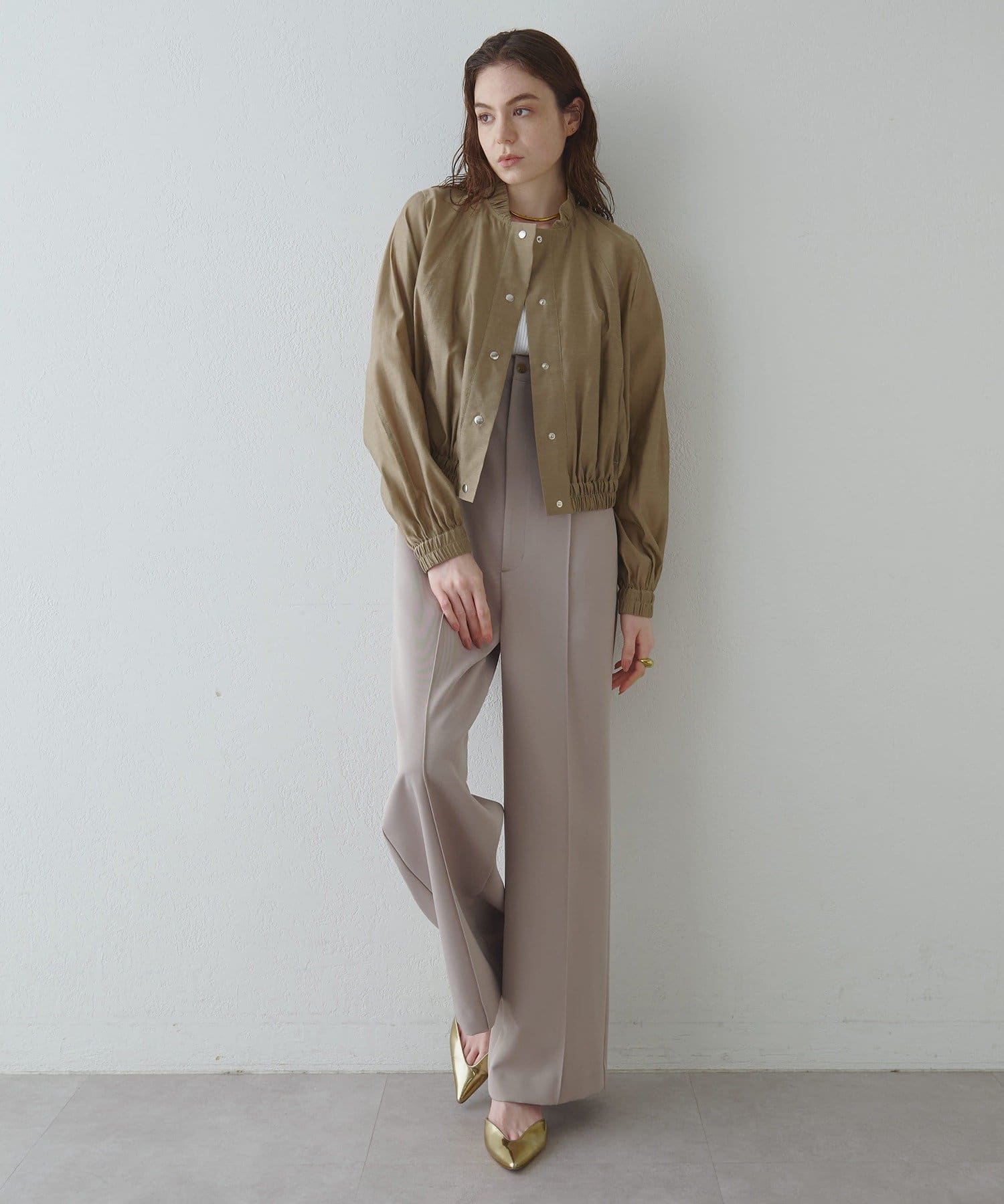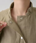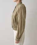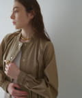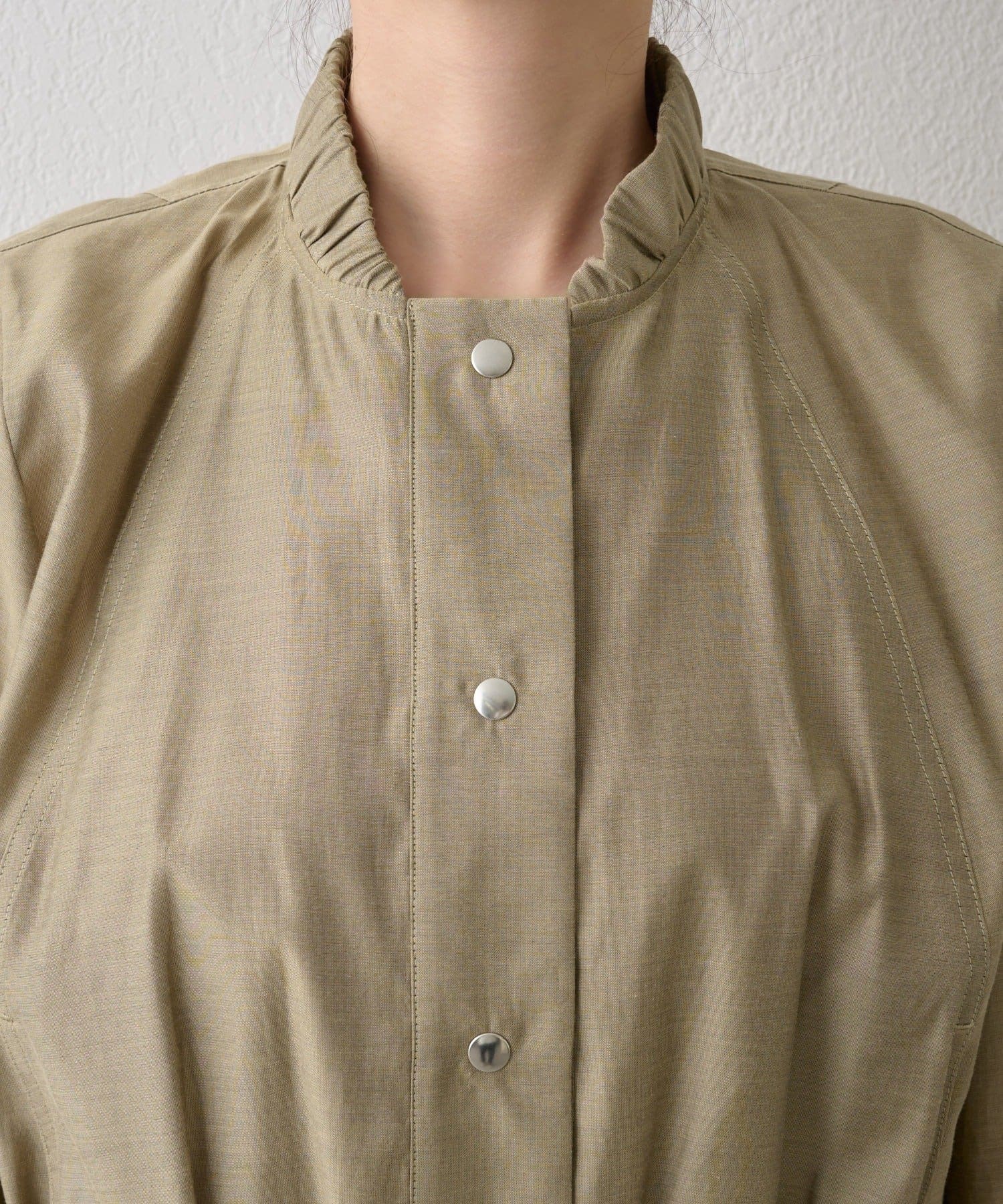 ■ギャザーディテールのスタンドカラーやドット釦も着こなしのアクセントに。