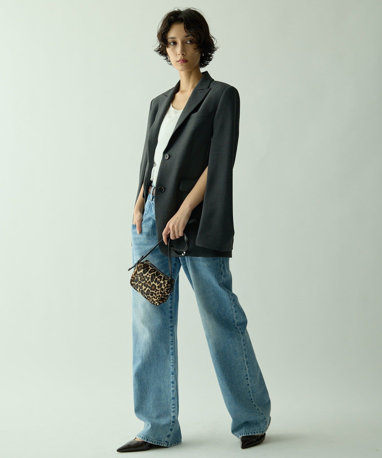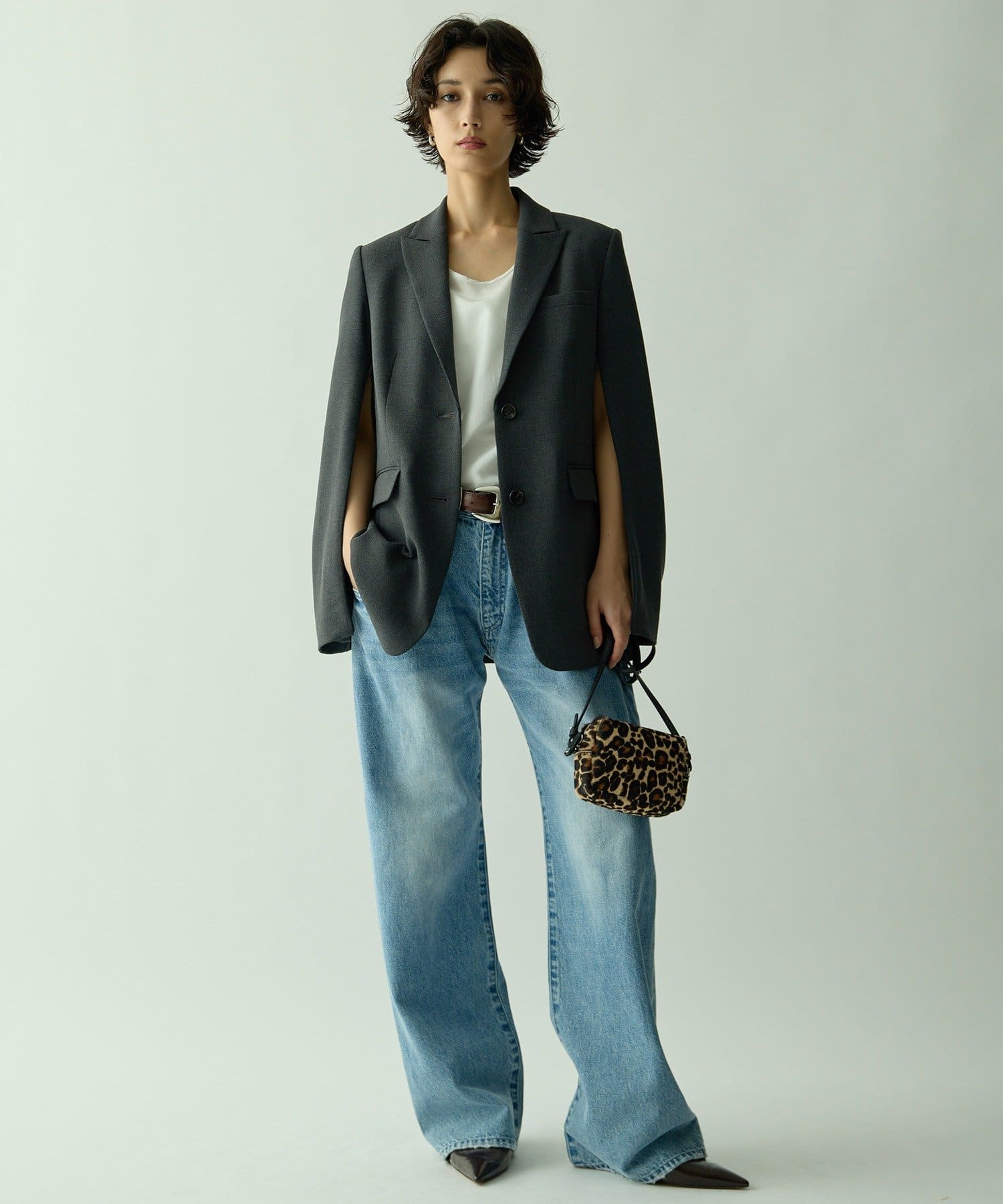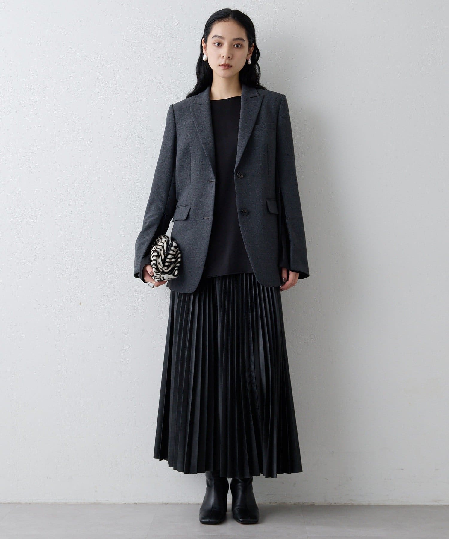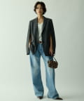 ■シングルの前開き+ピークドラペルカラーの組み合わせが新鮮なデザイン。