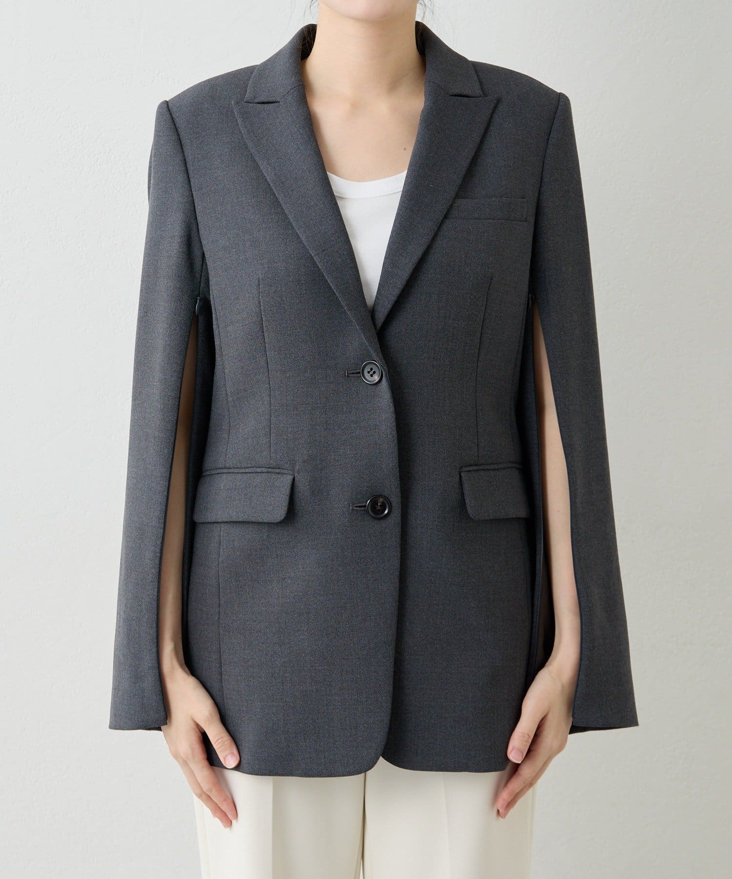■袖の内側にあしらったコンシールファスナーでスリット開きを作ればポンチョのよう楽しめ、腕の細見え効果もあり。