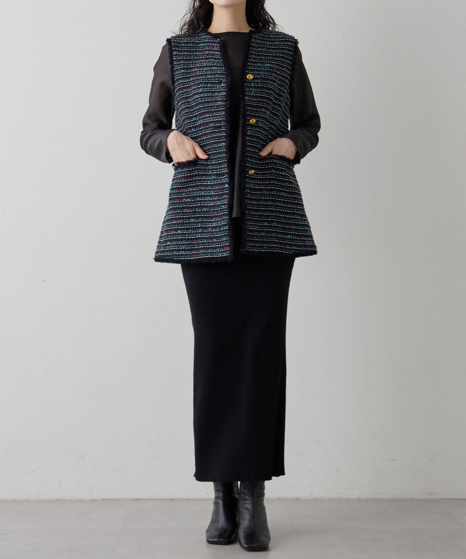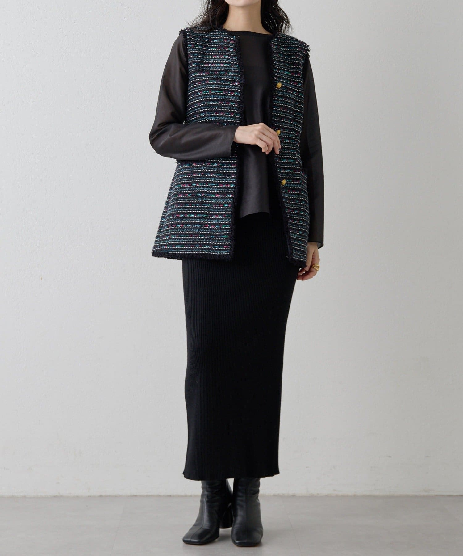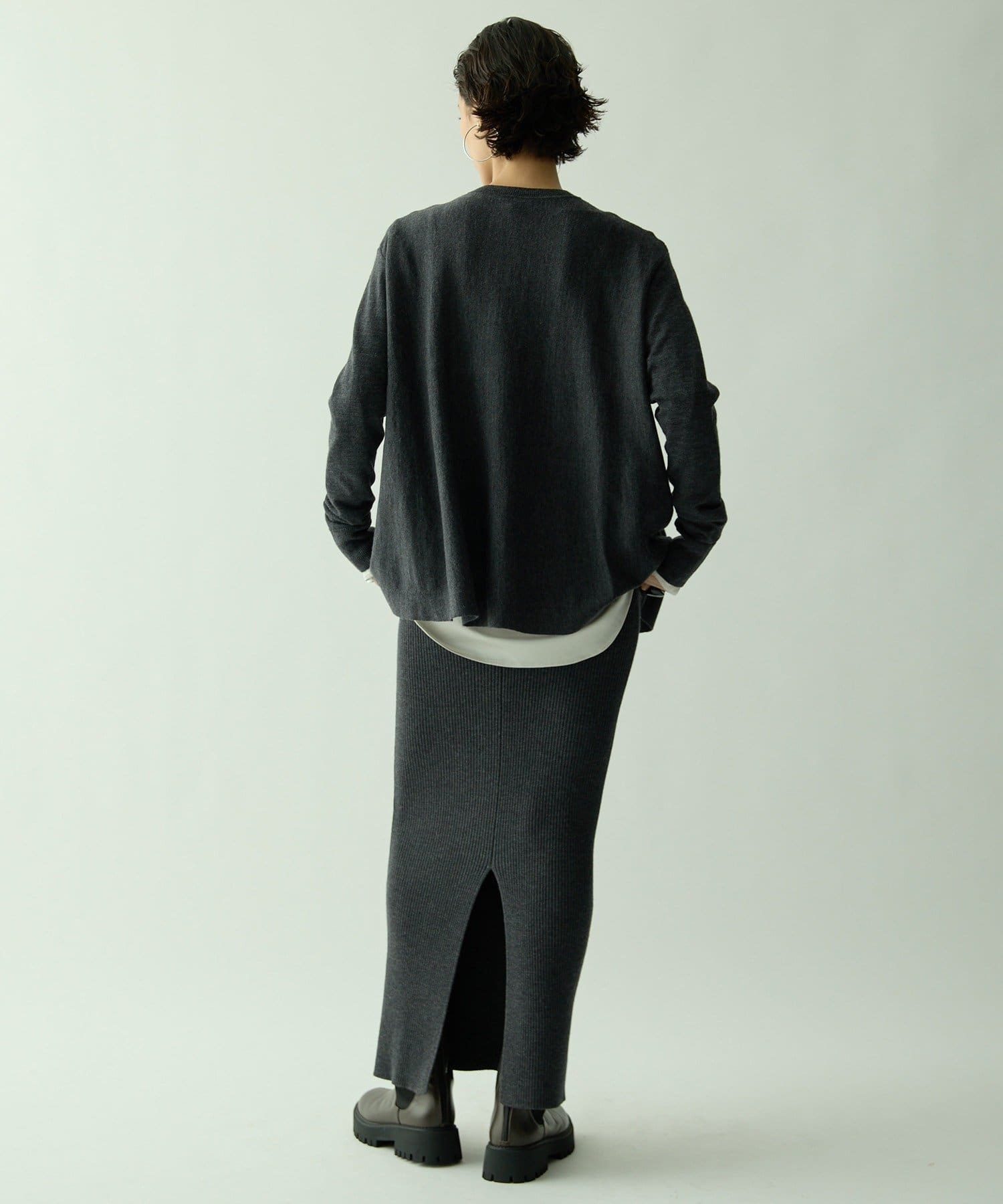 ■細やかなリブ編みの表情が縦のラインを強調し、よりすっきりとした印象に。
