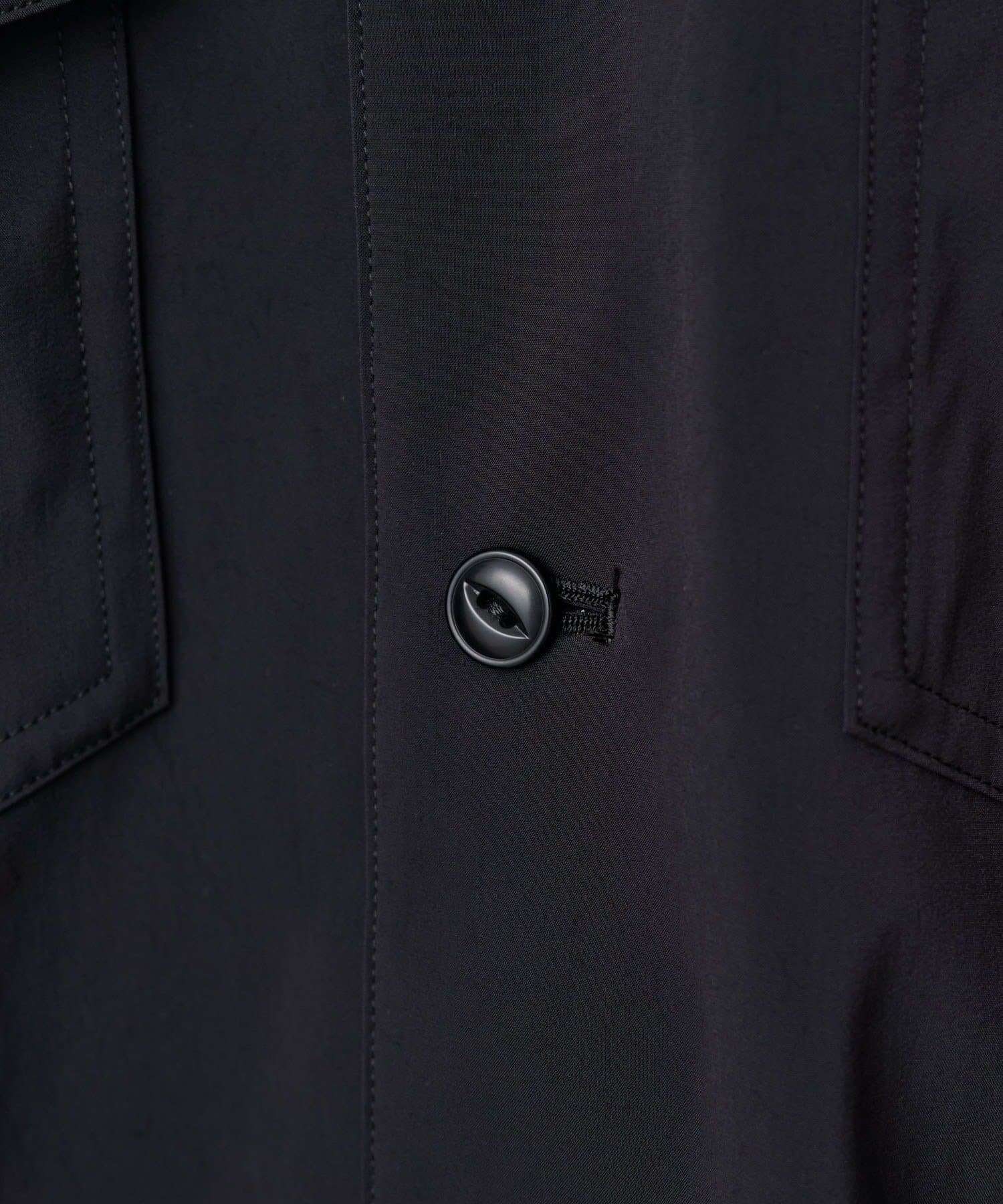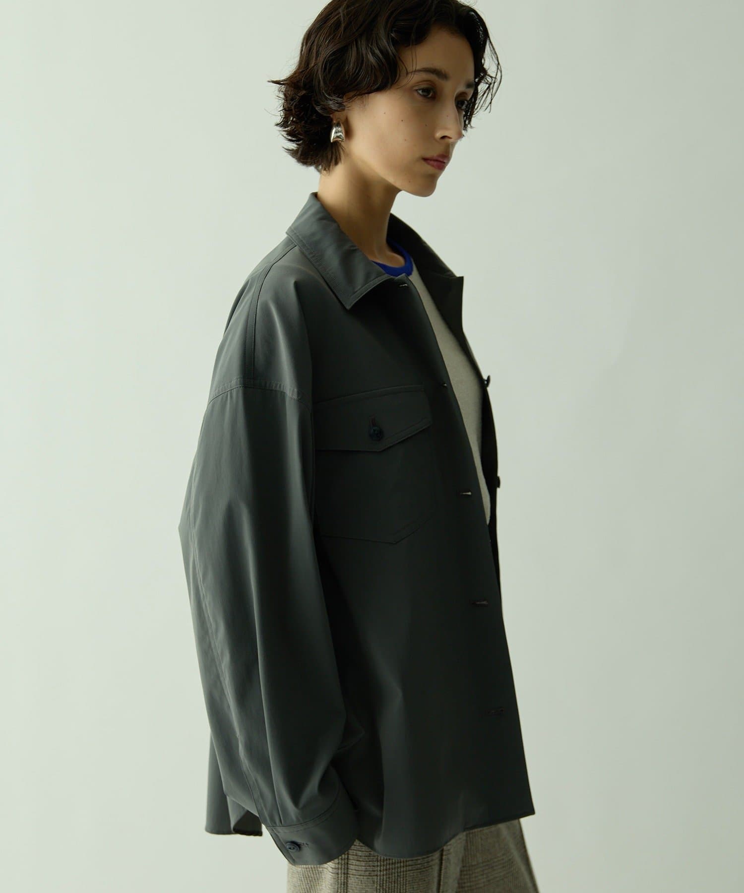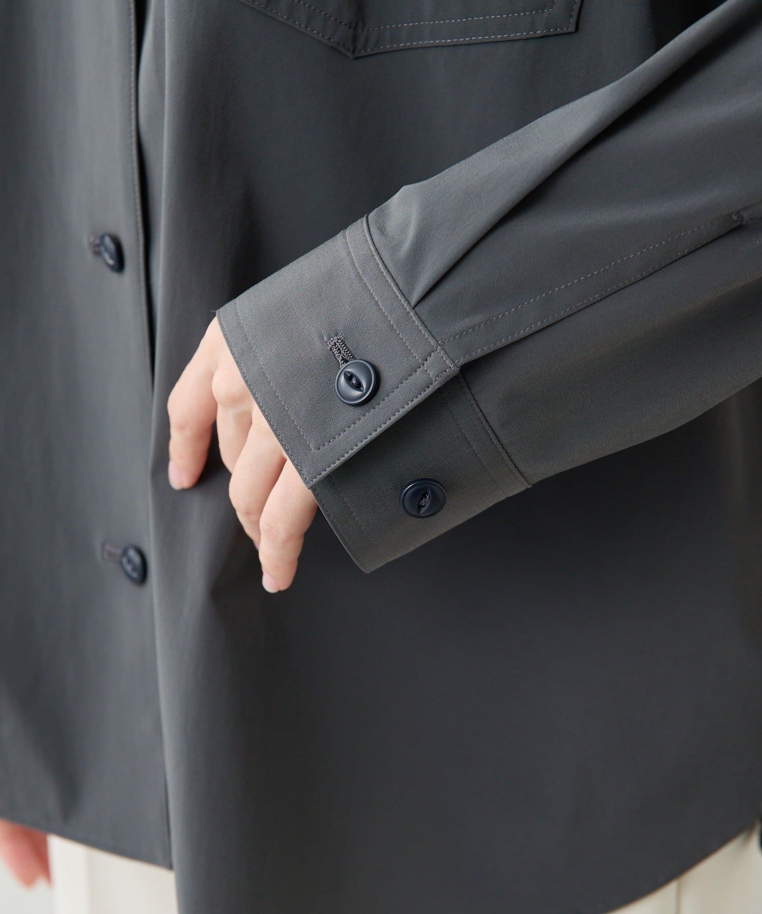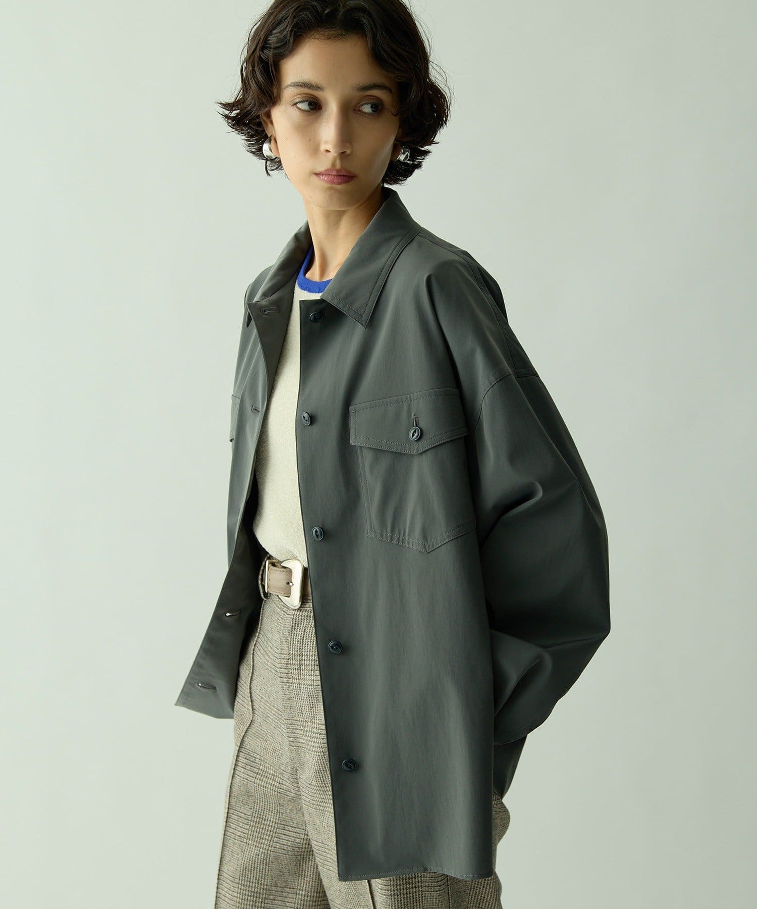 ■撥水加工が施されたナイロン混生地を使用したオーバーシャツ。