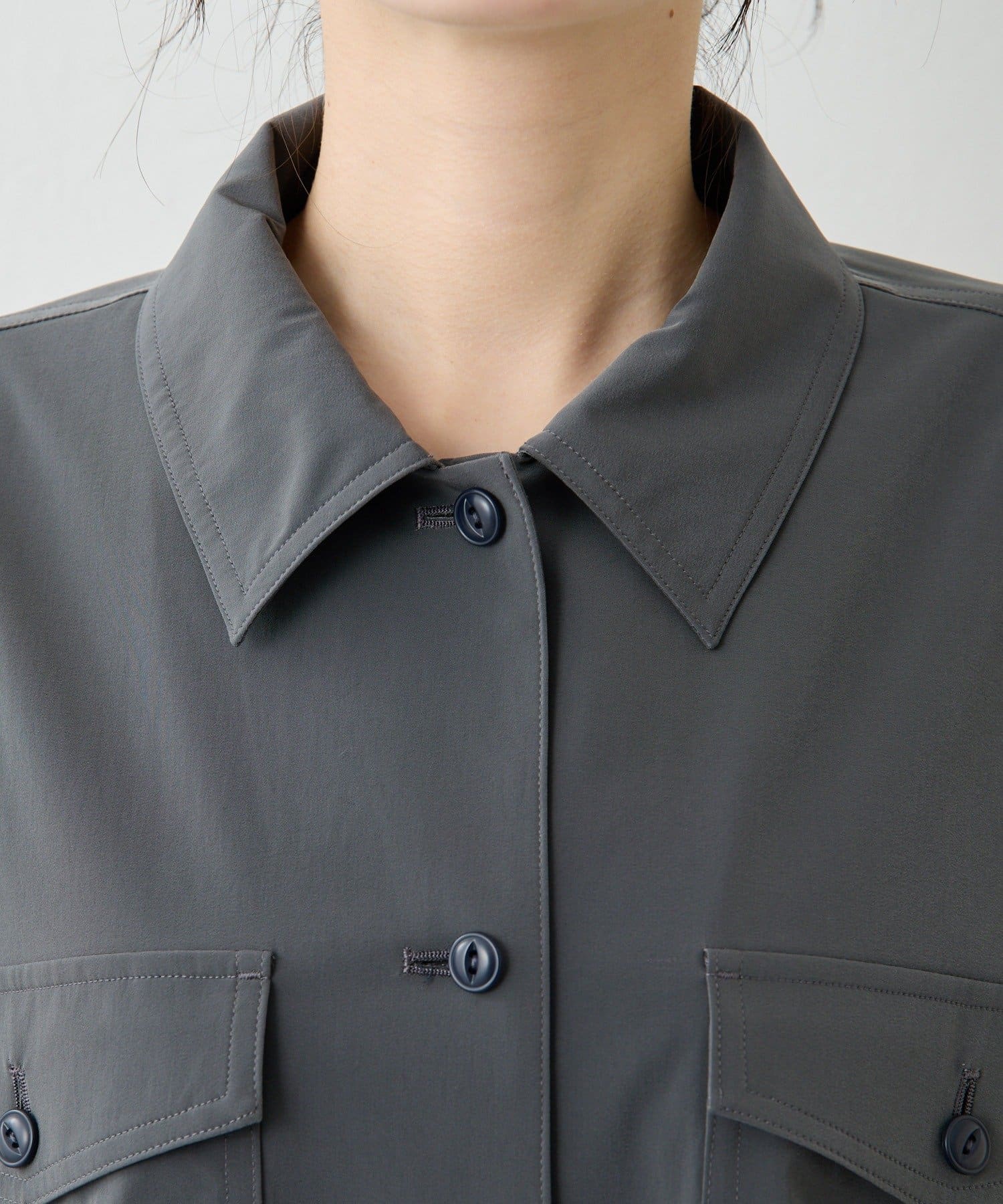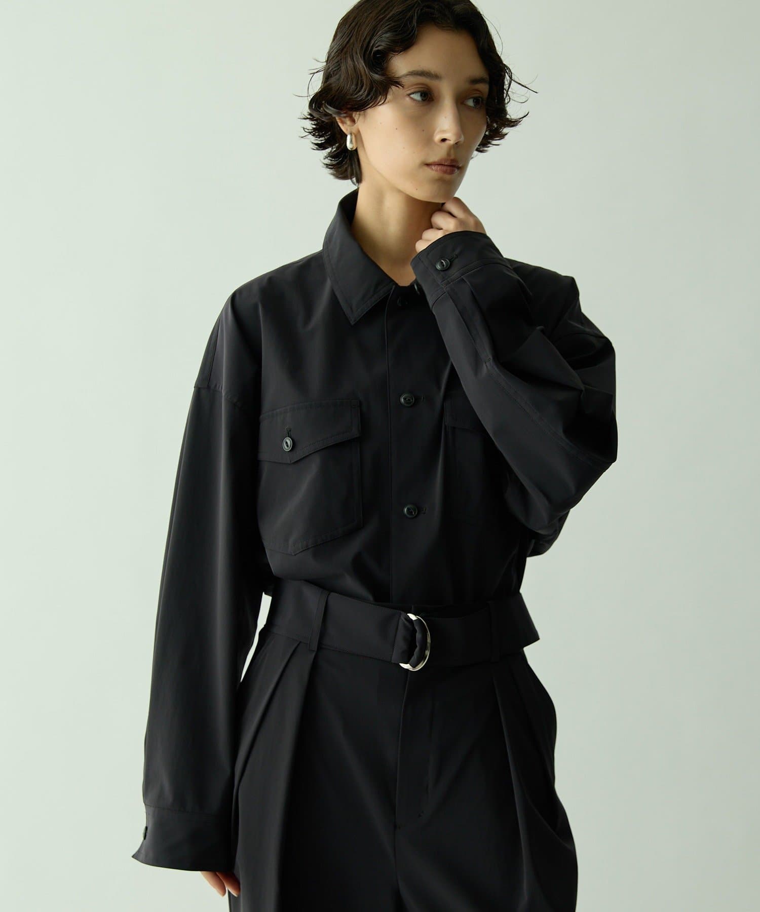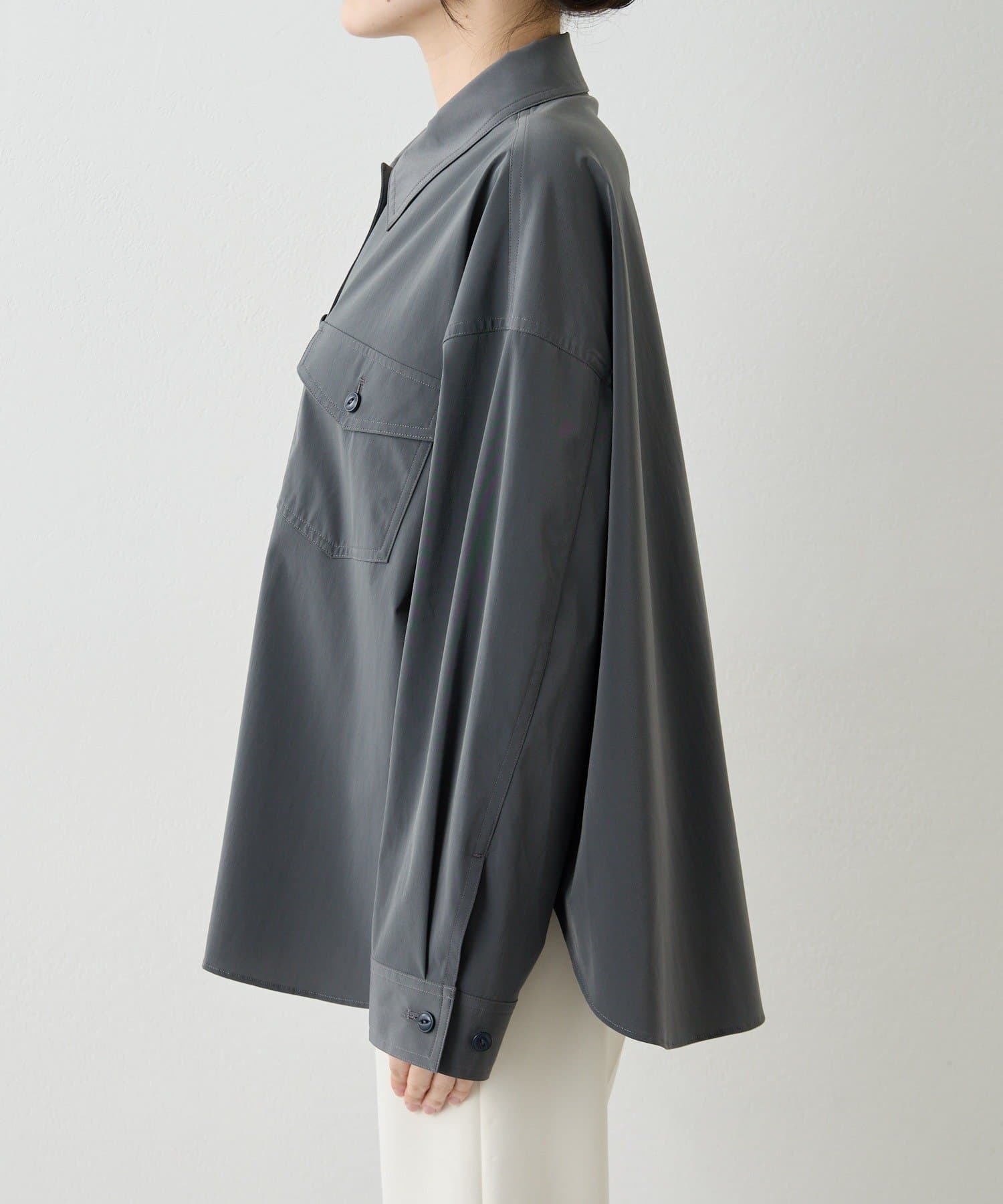 ■撥水加工が施されたナイロン混生地を使用したオーバーシャツ。