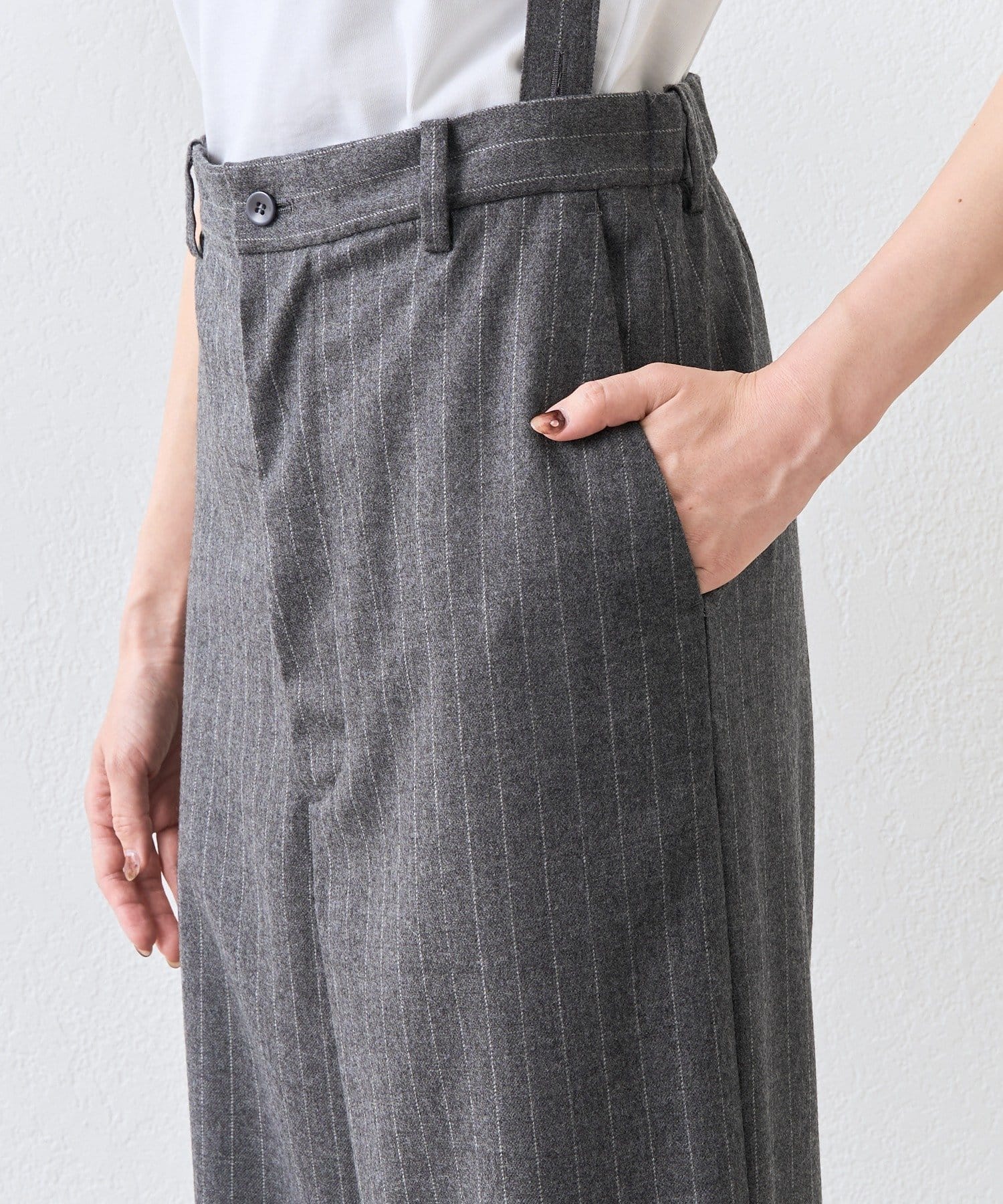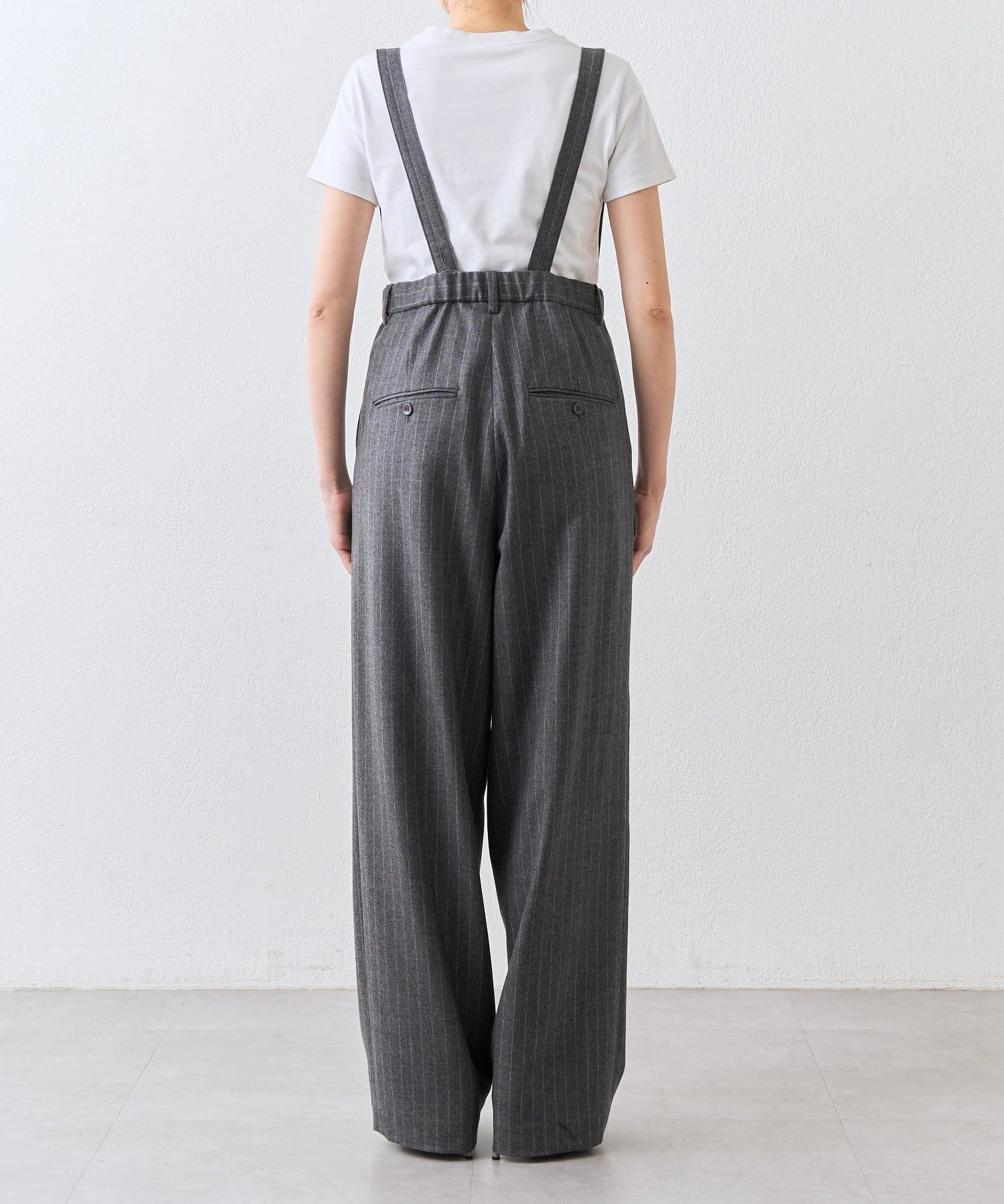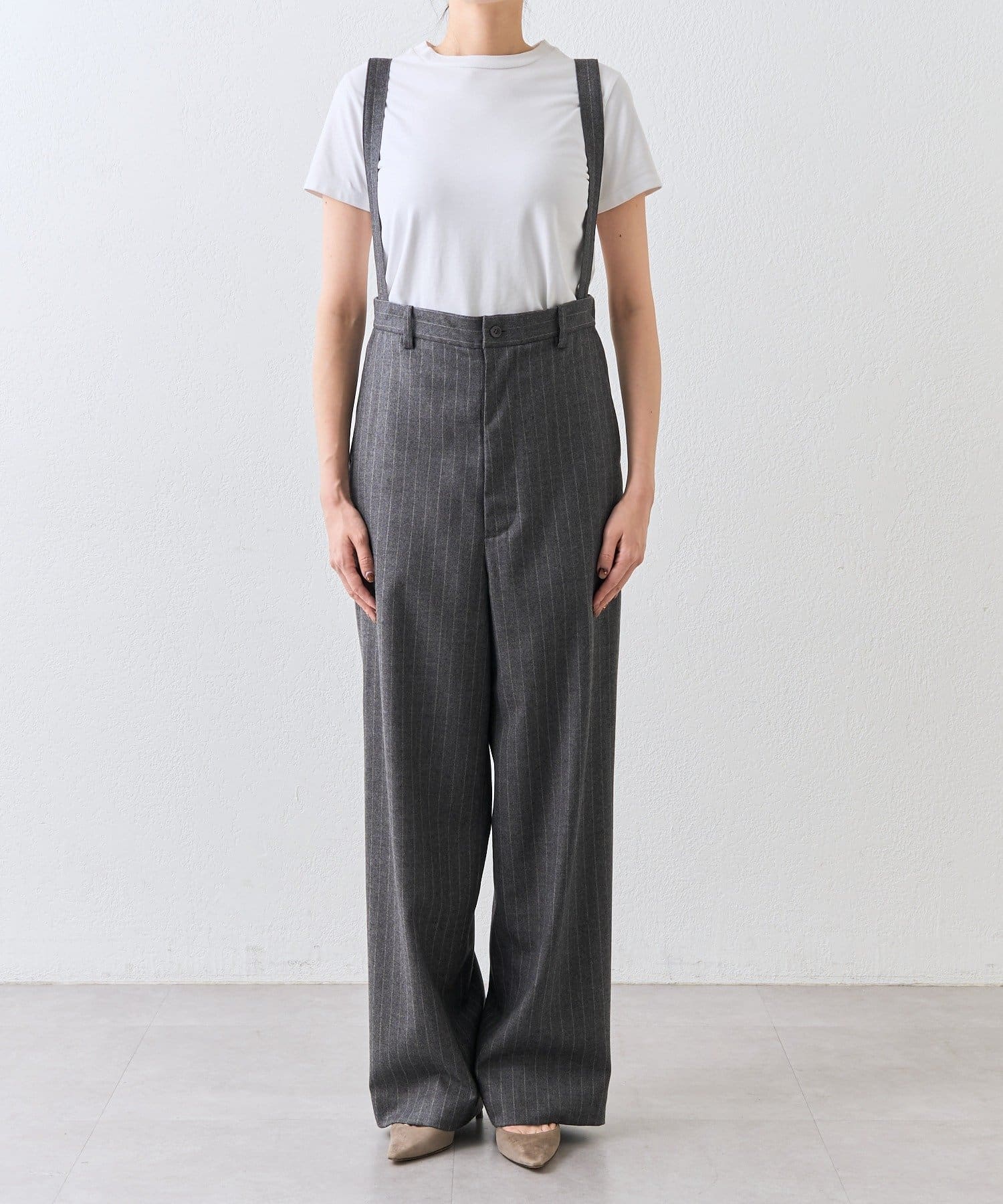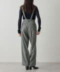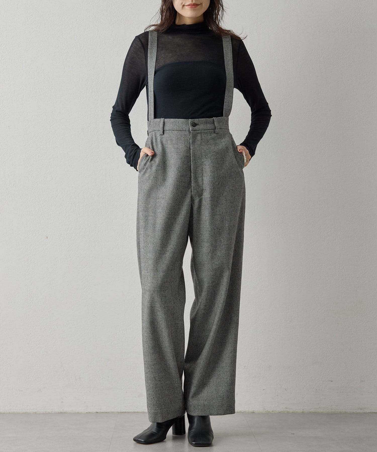 ■樹脂加工を施したウール素材を使用したサスペンダーパンツ。
