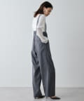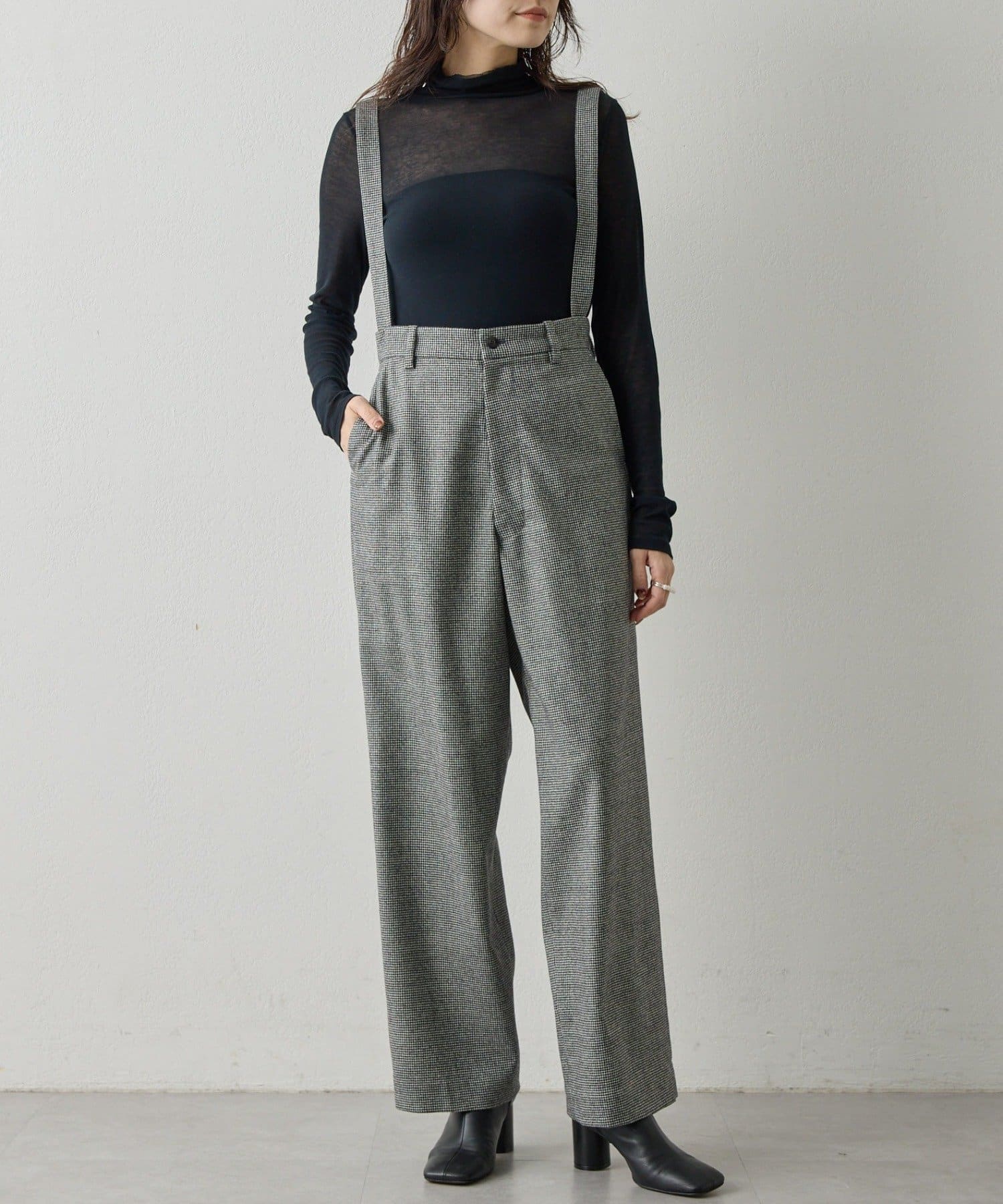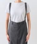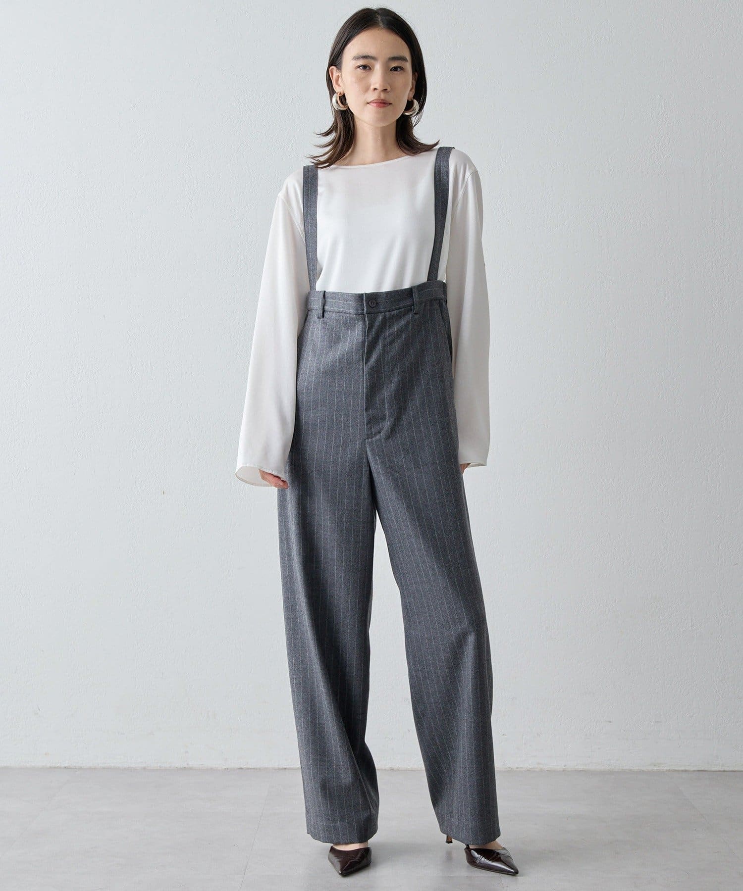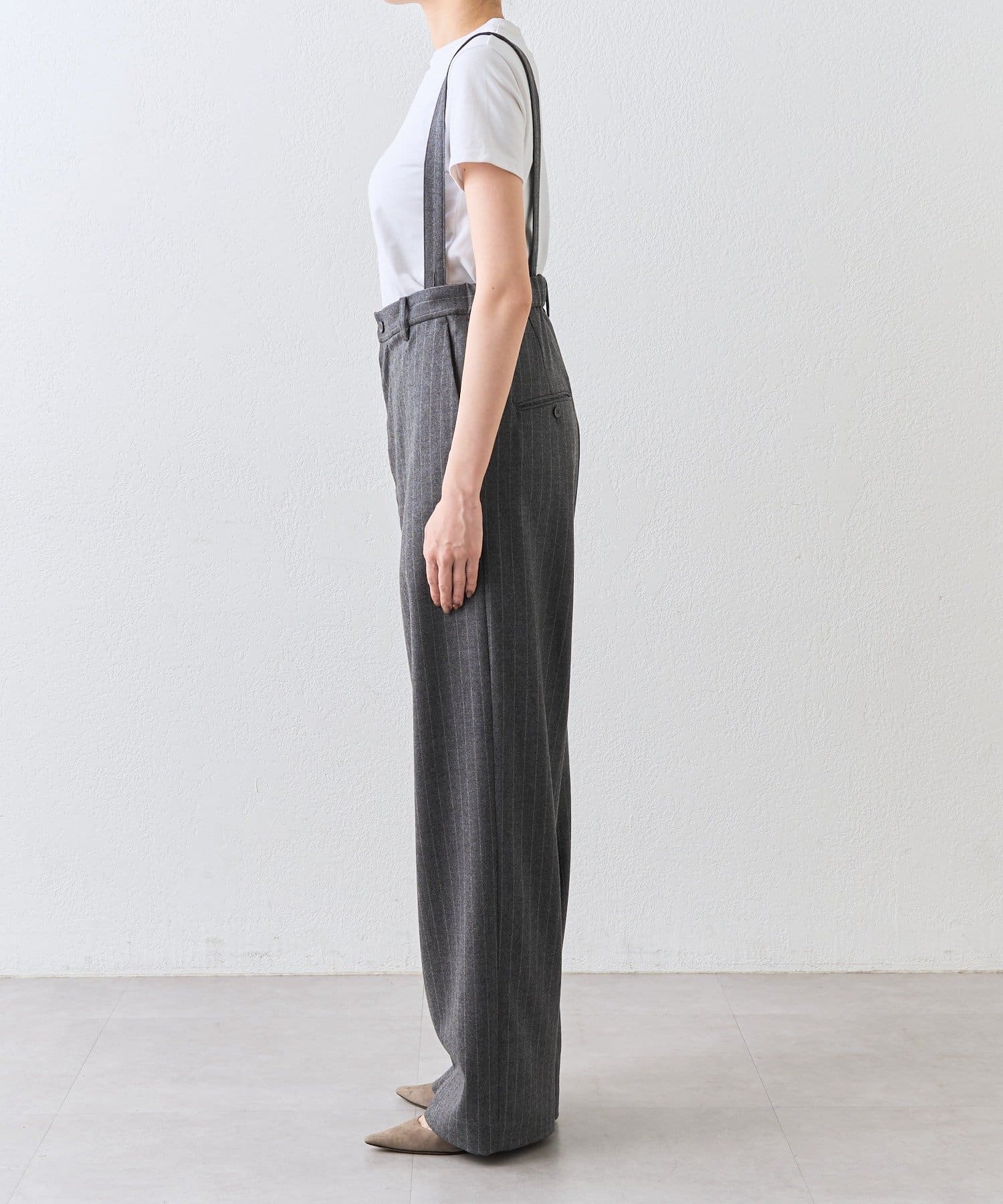 ■樹脂加工を施したウール素材を使用したサスペンダーパンツ。