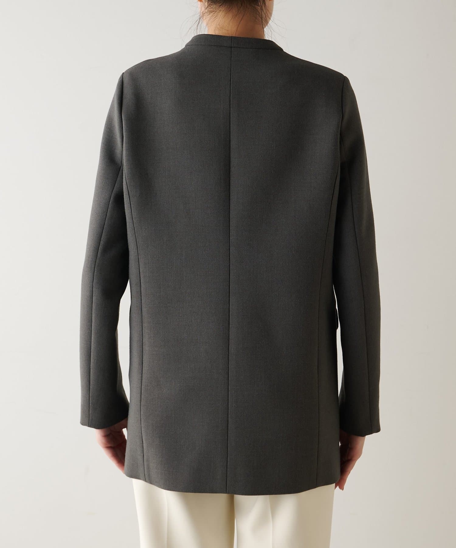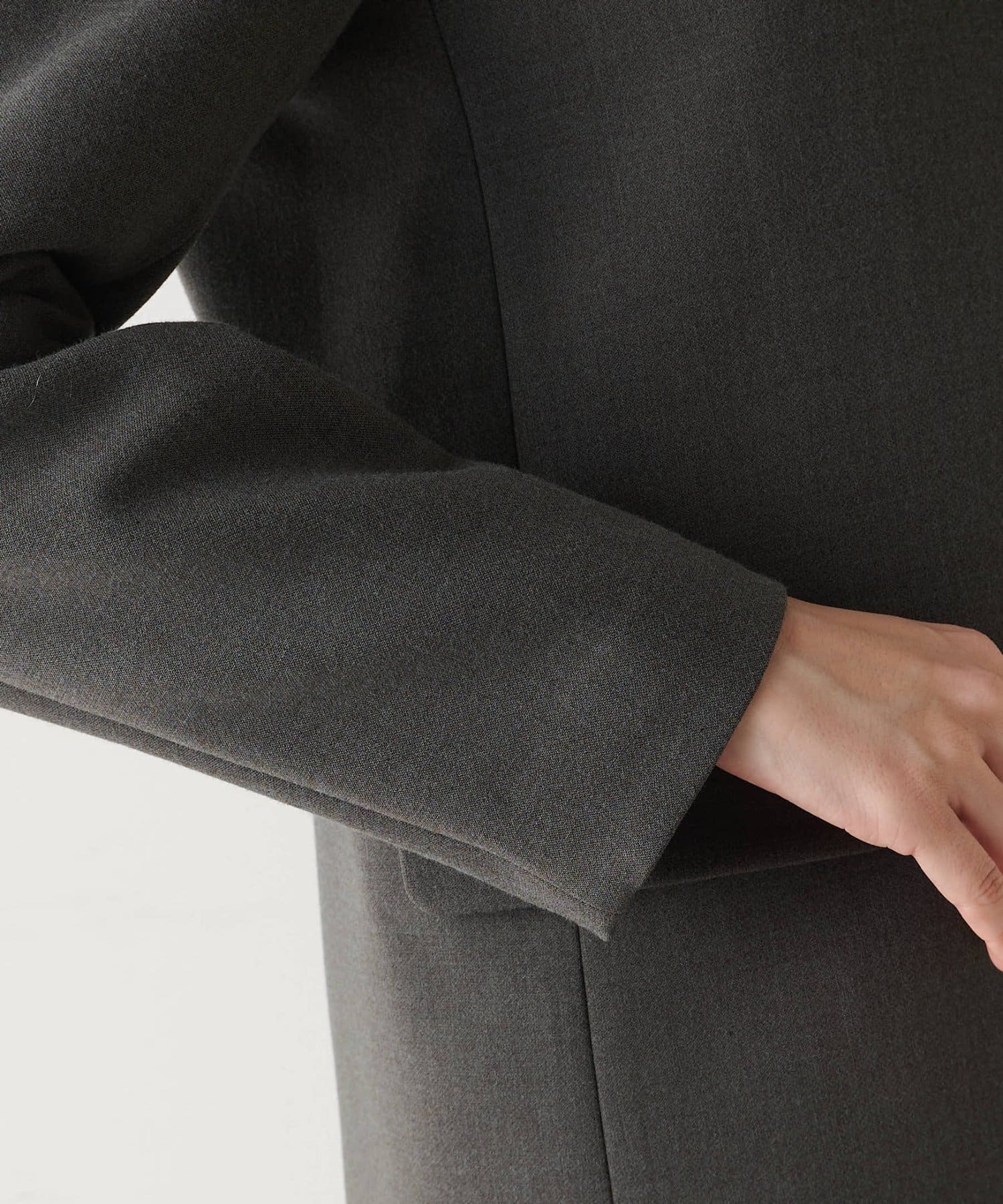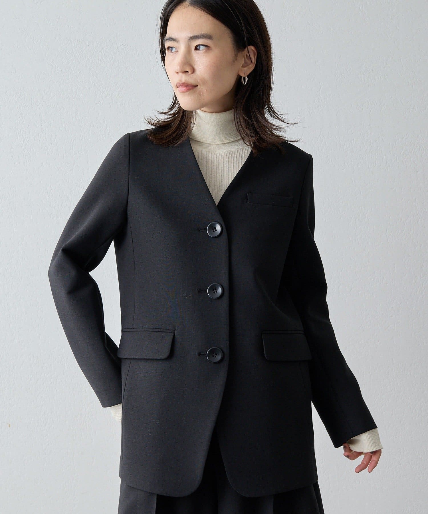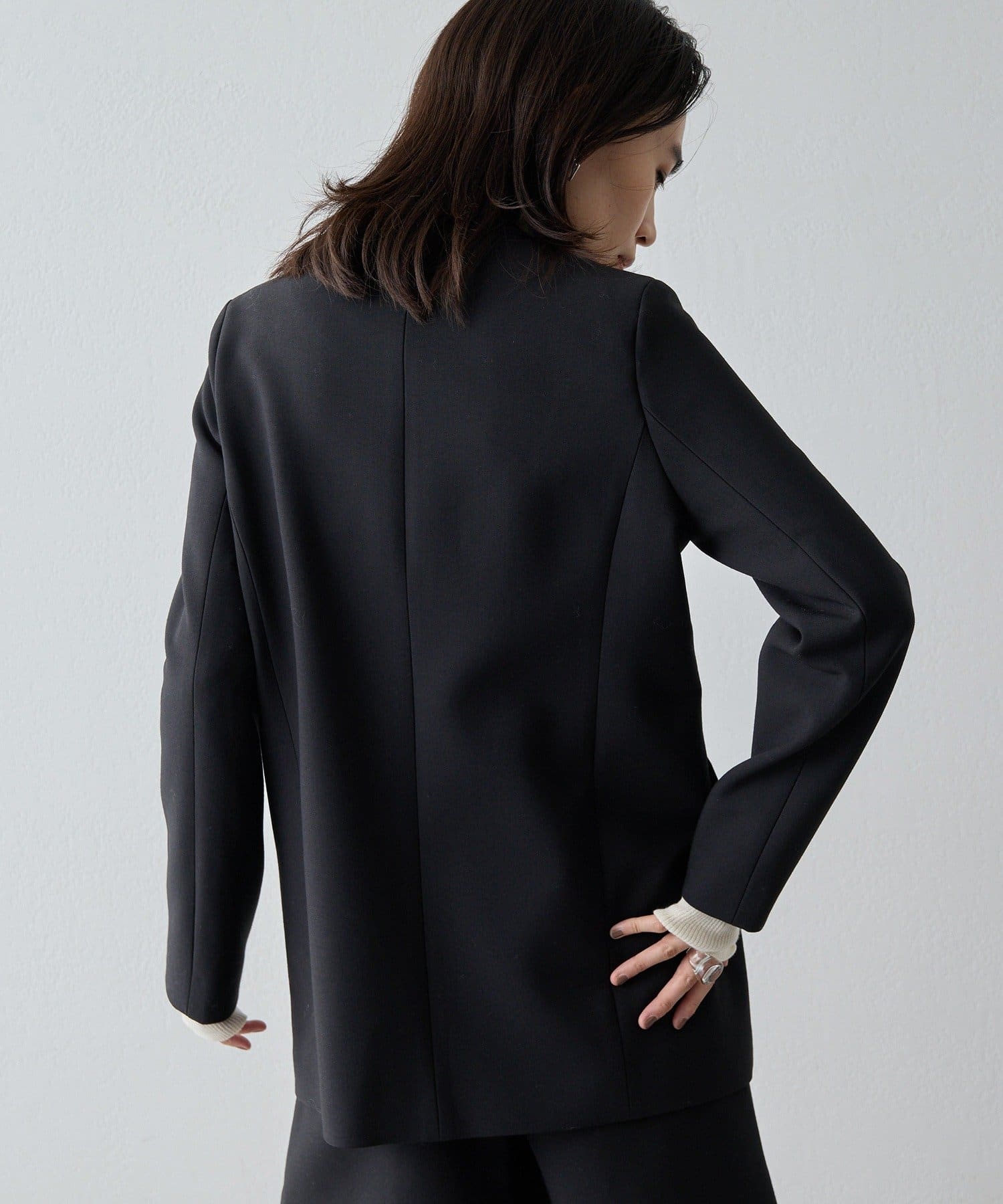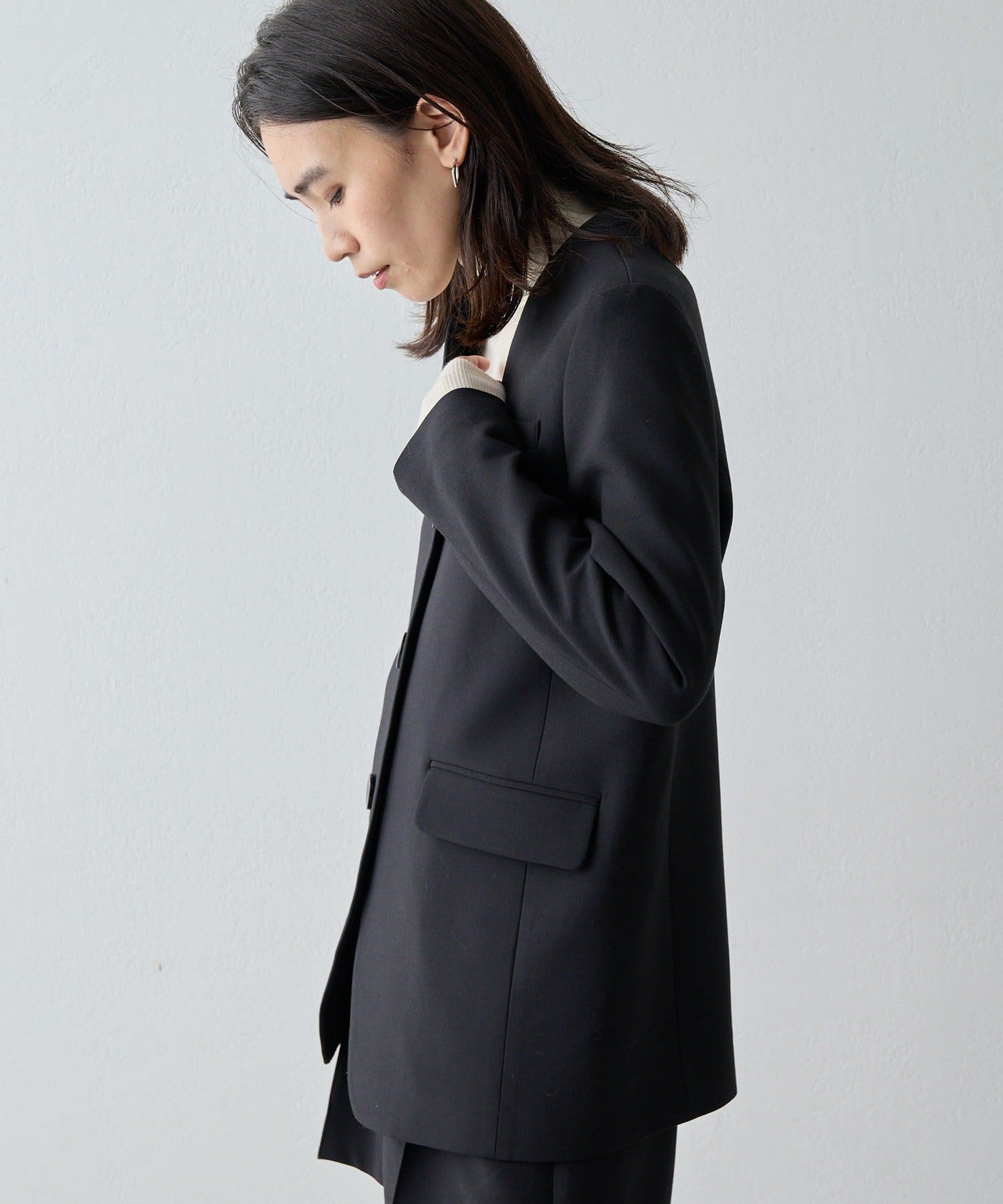 ■上質感のあるウールライクなダブルクロスを使用したノーカラージャケット。