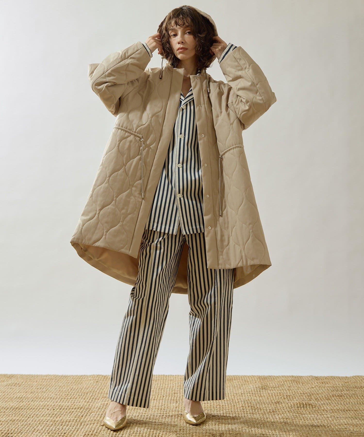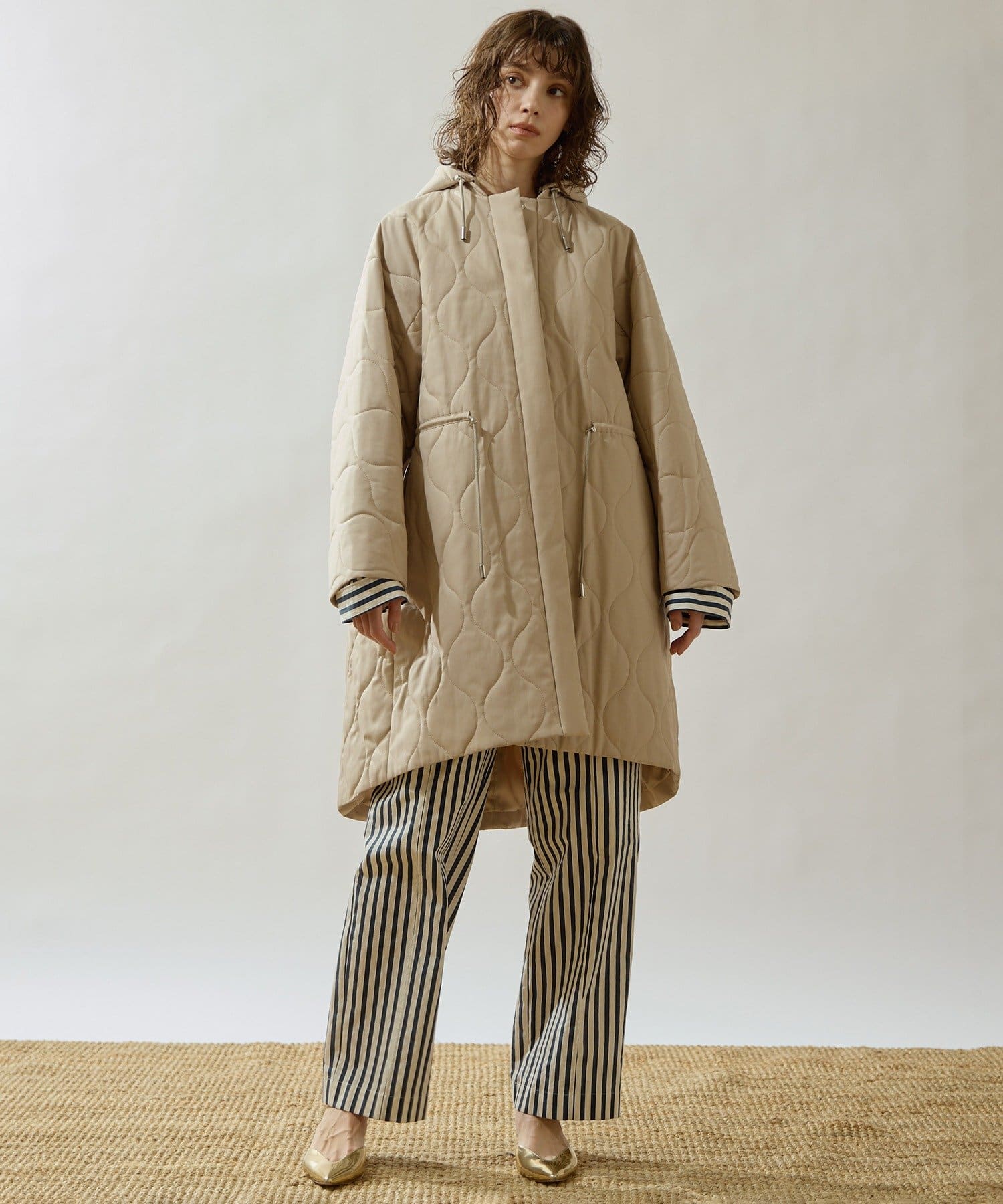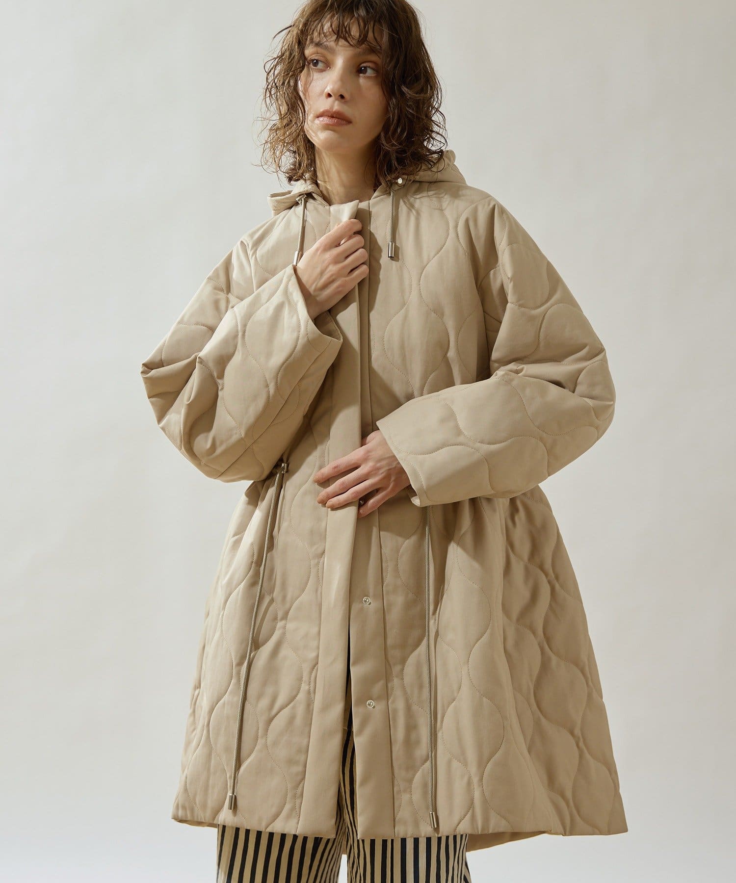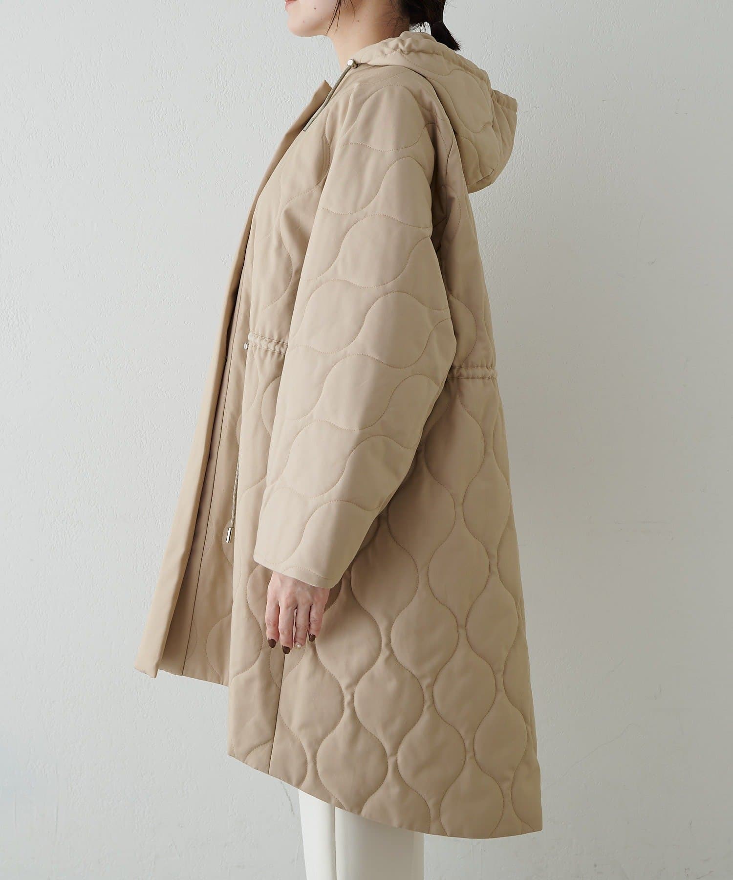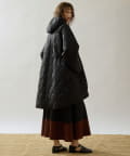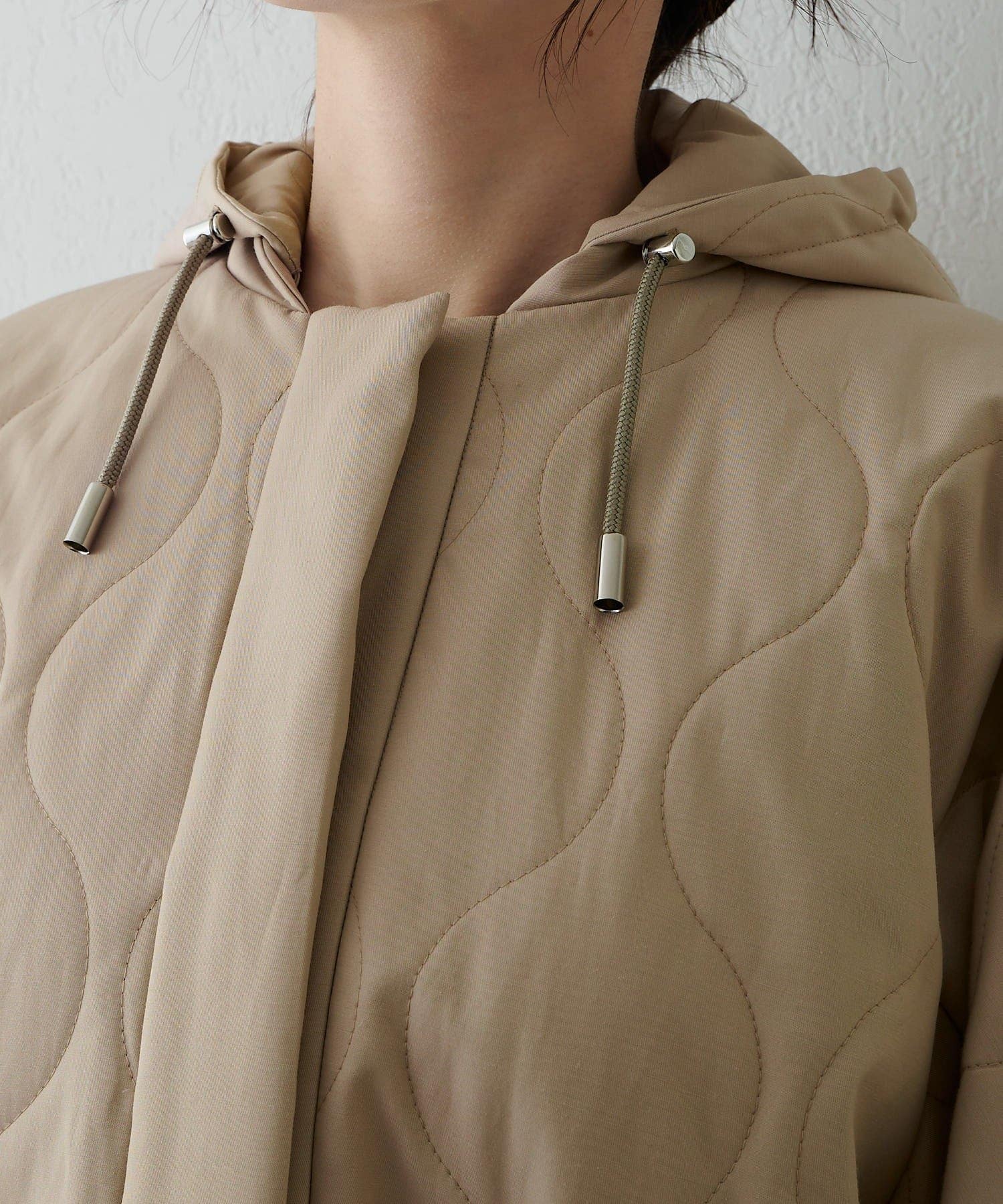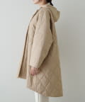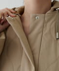■軽やかなキルト生地で仕立てたフード付きコート。