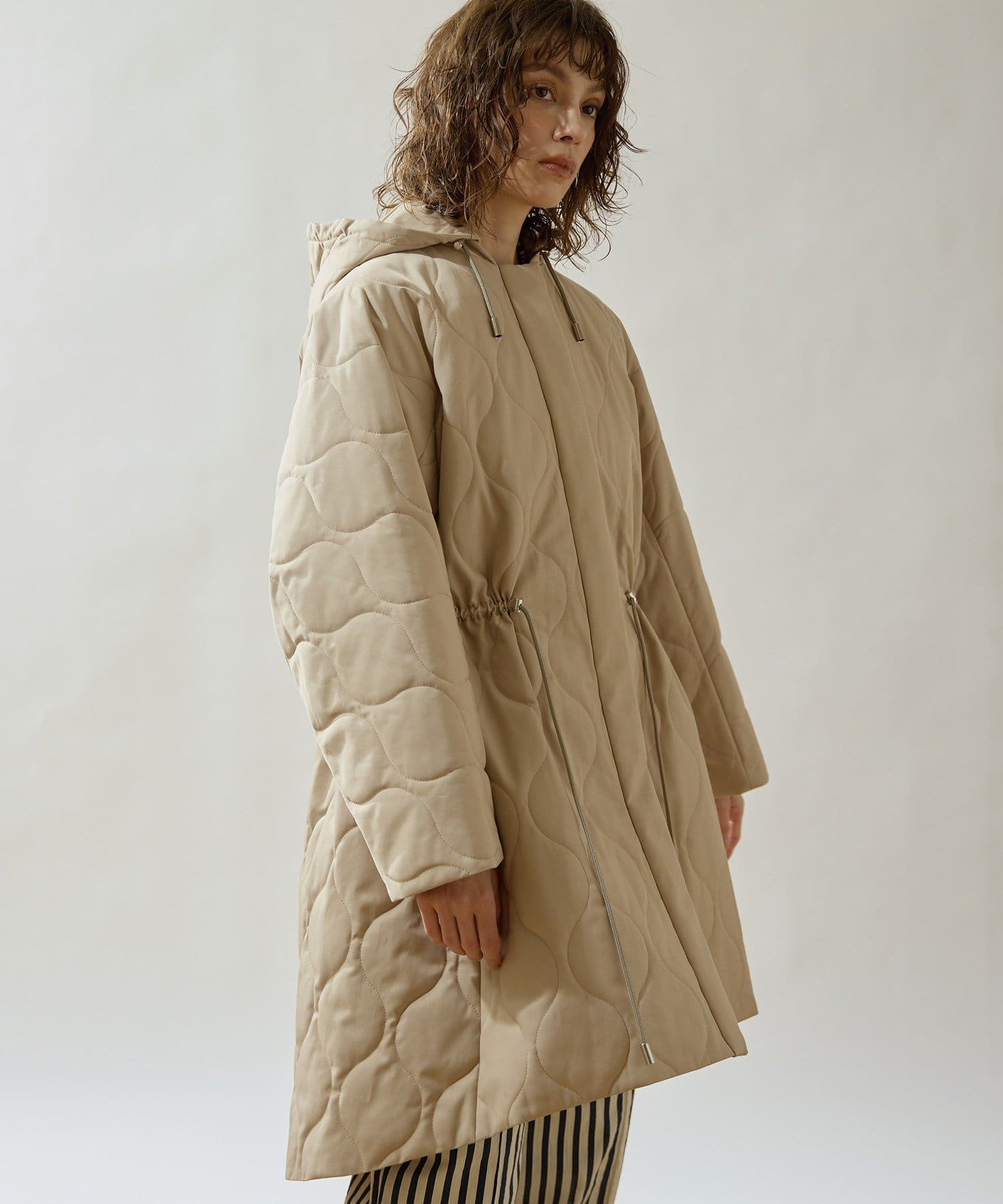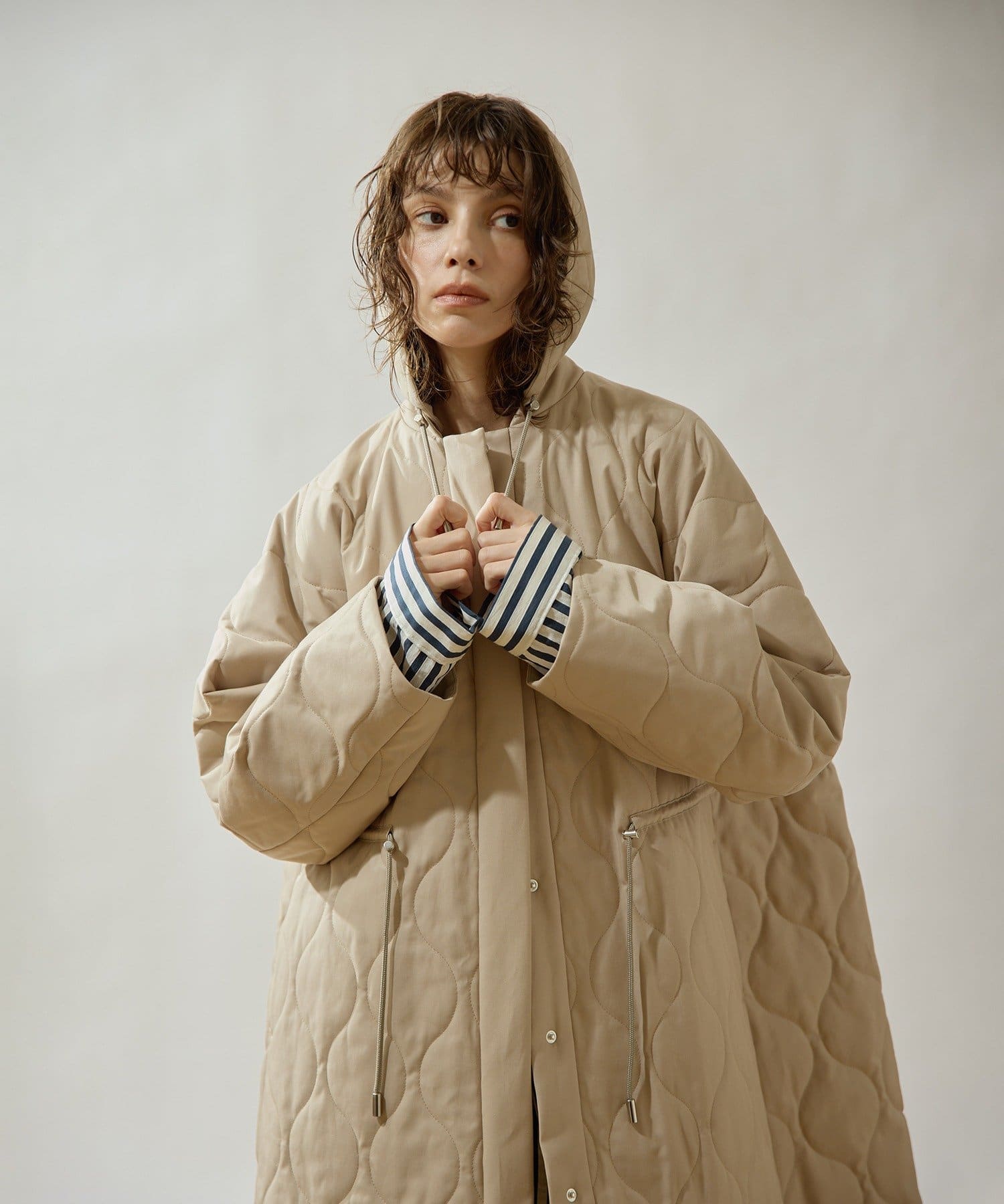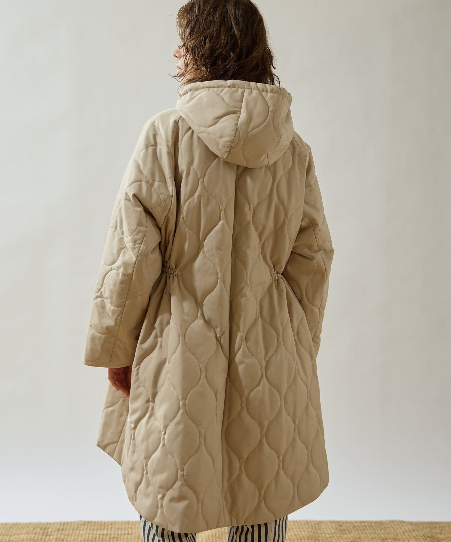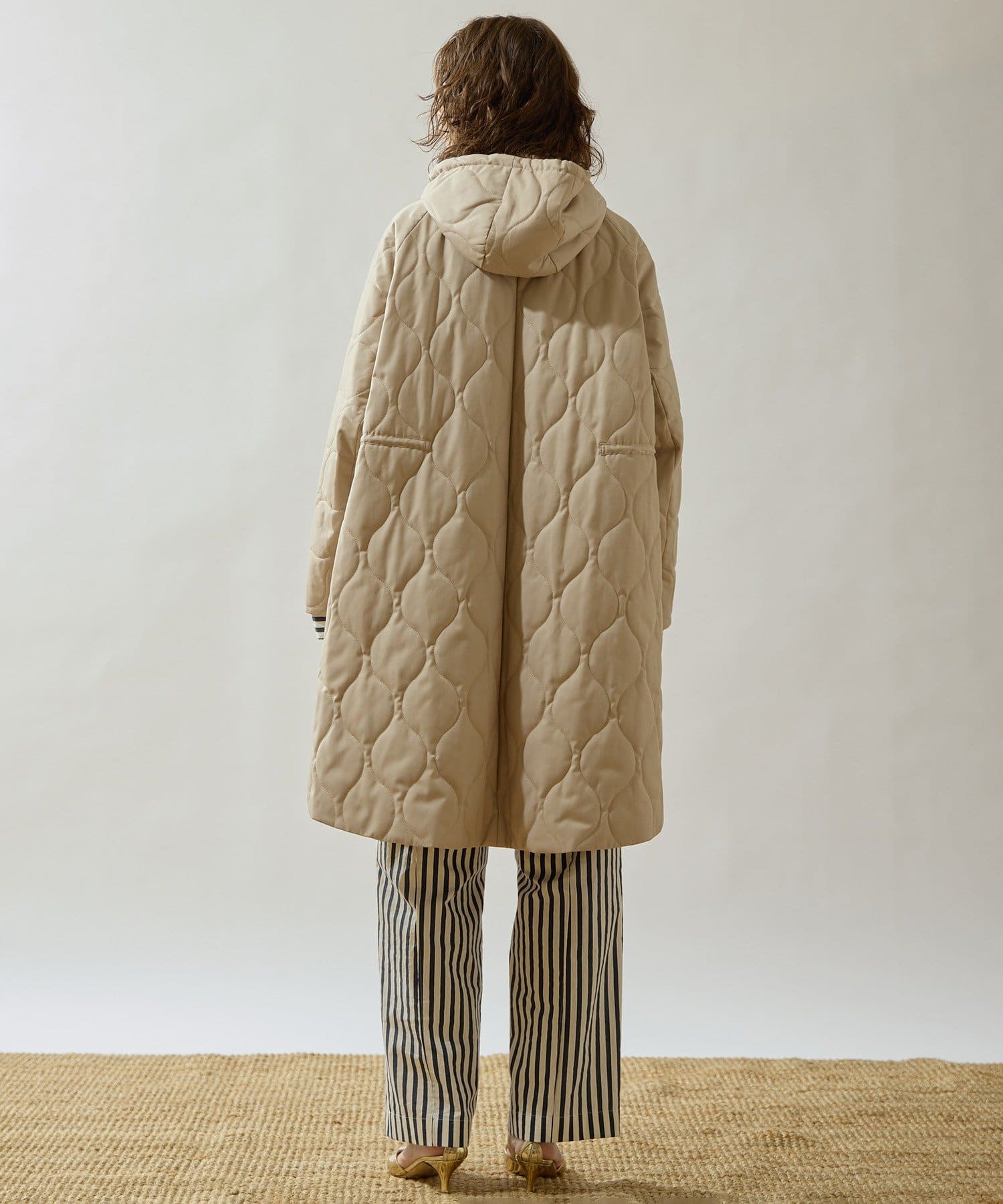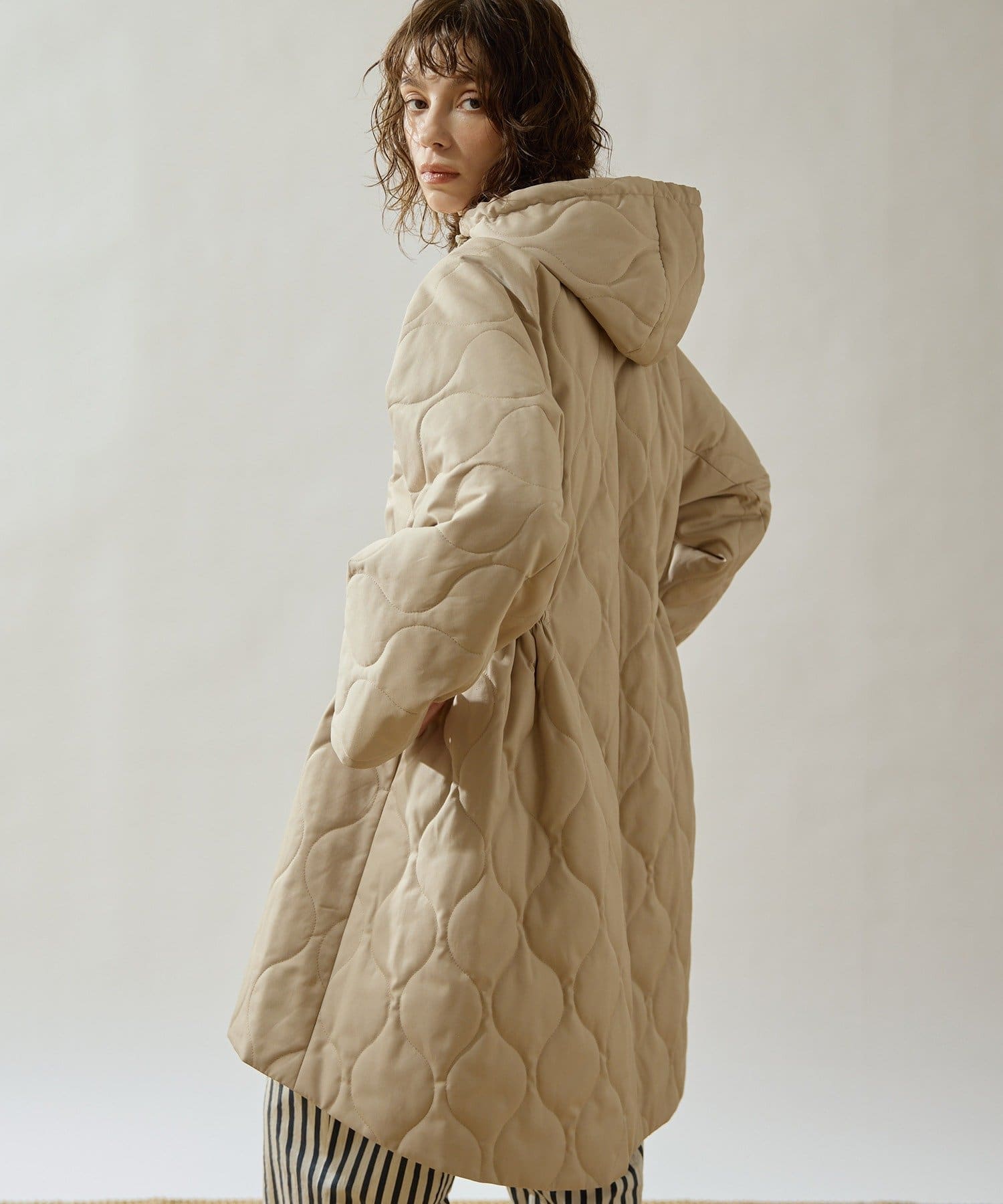 ■軽やかなキルト生地で仕立てたフード付きコート。
