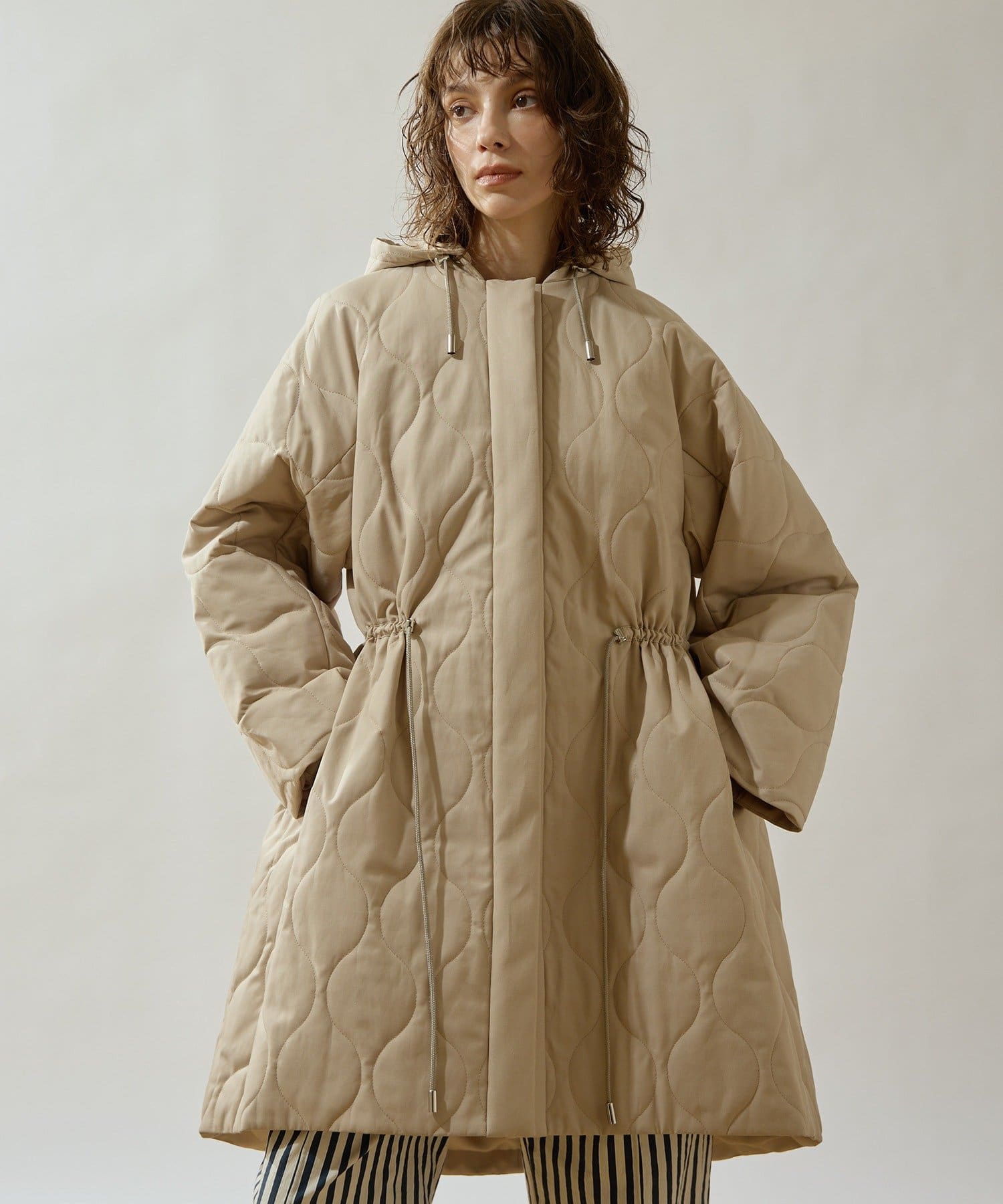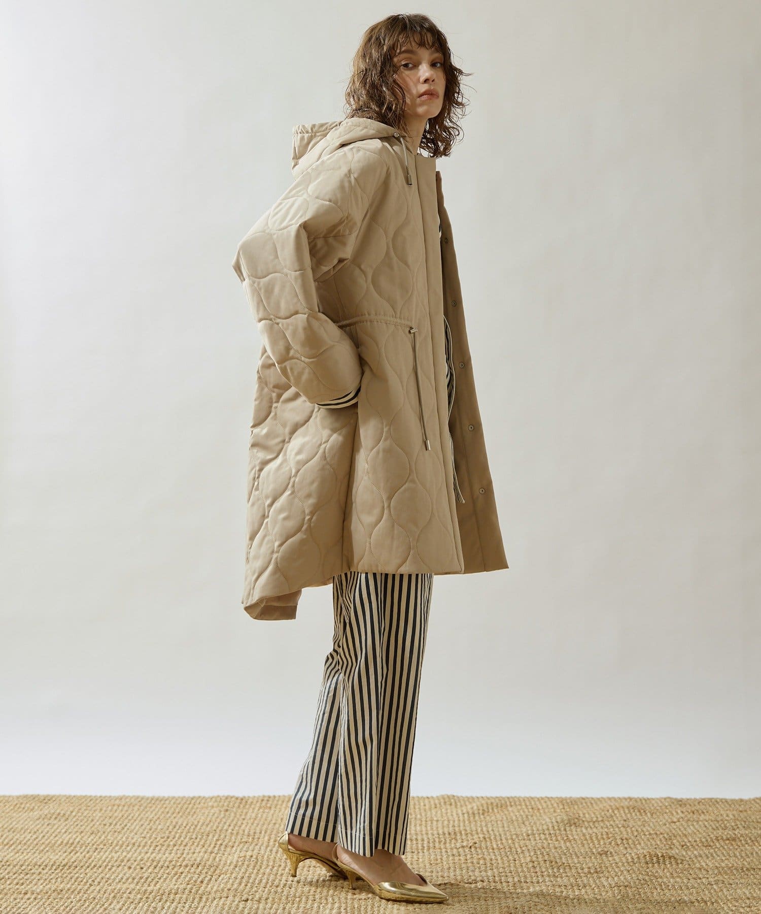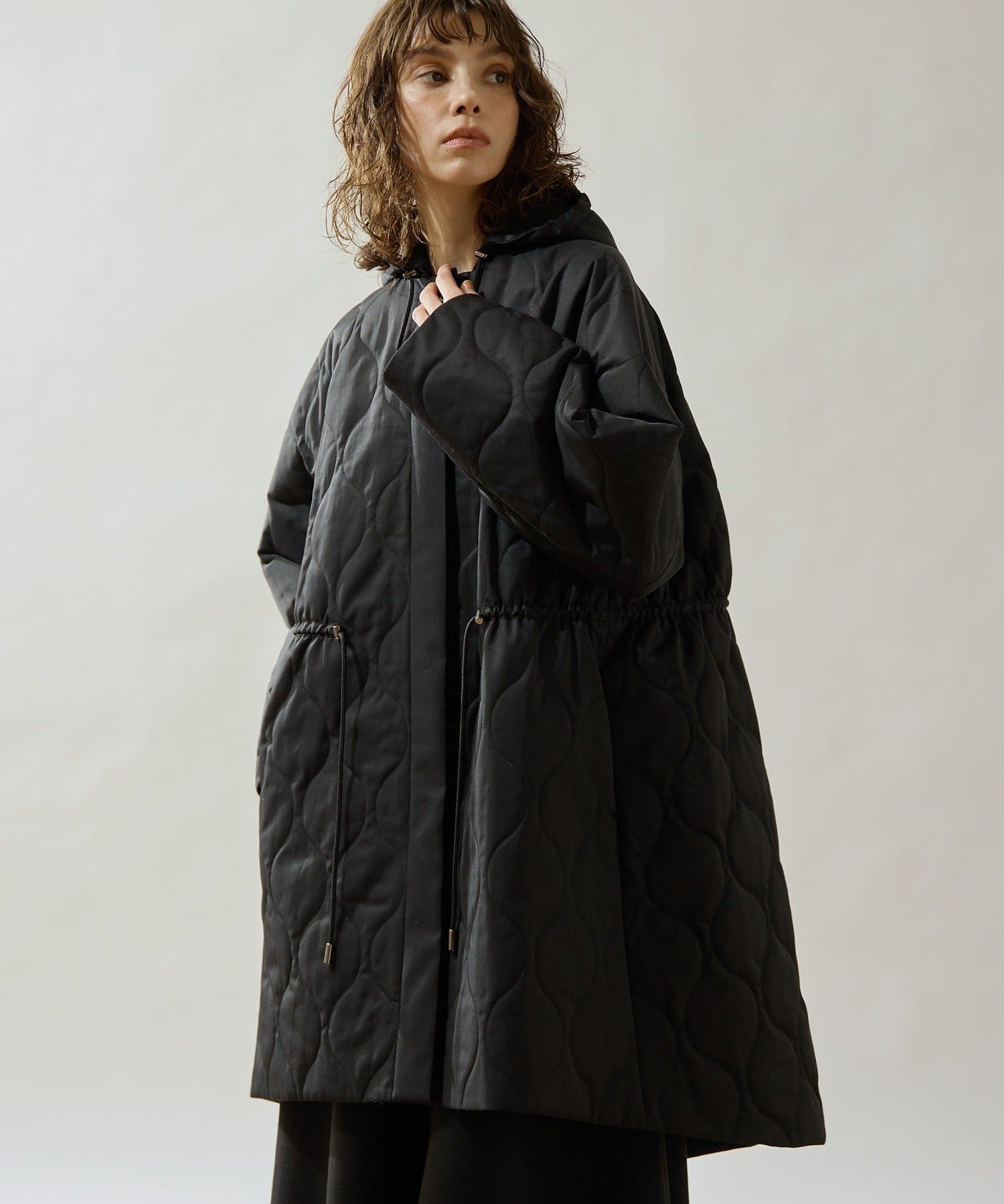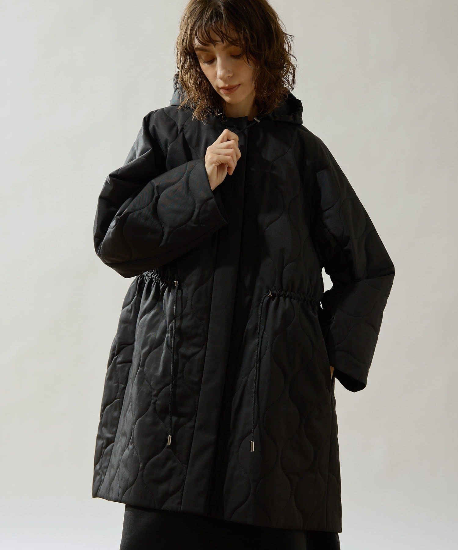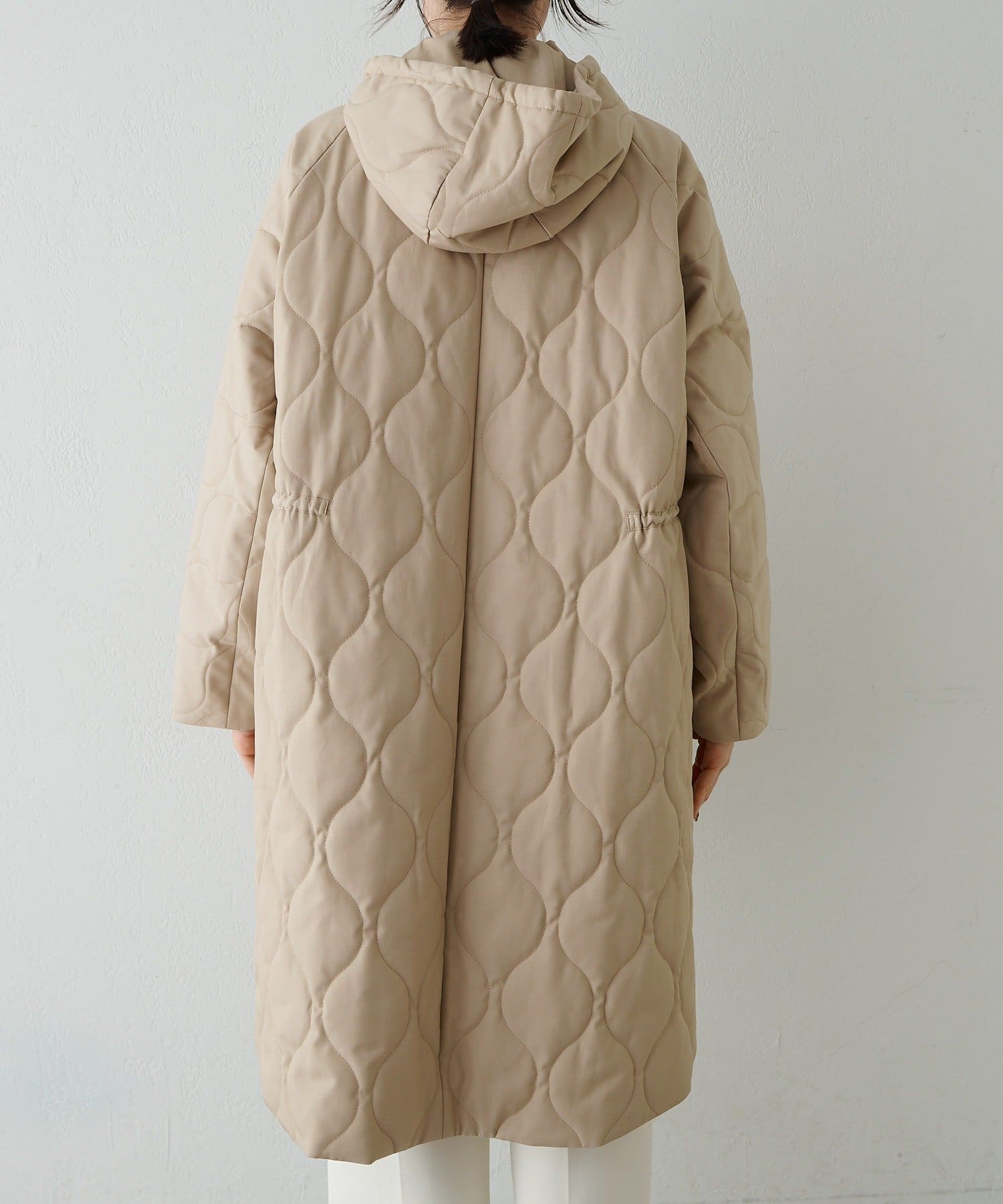 ■軽やかなキルト生地で仕立てたフード付きコート。