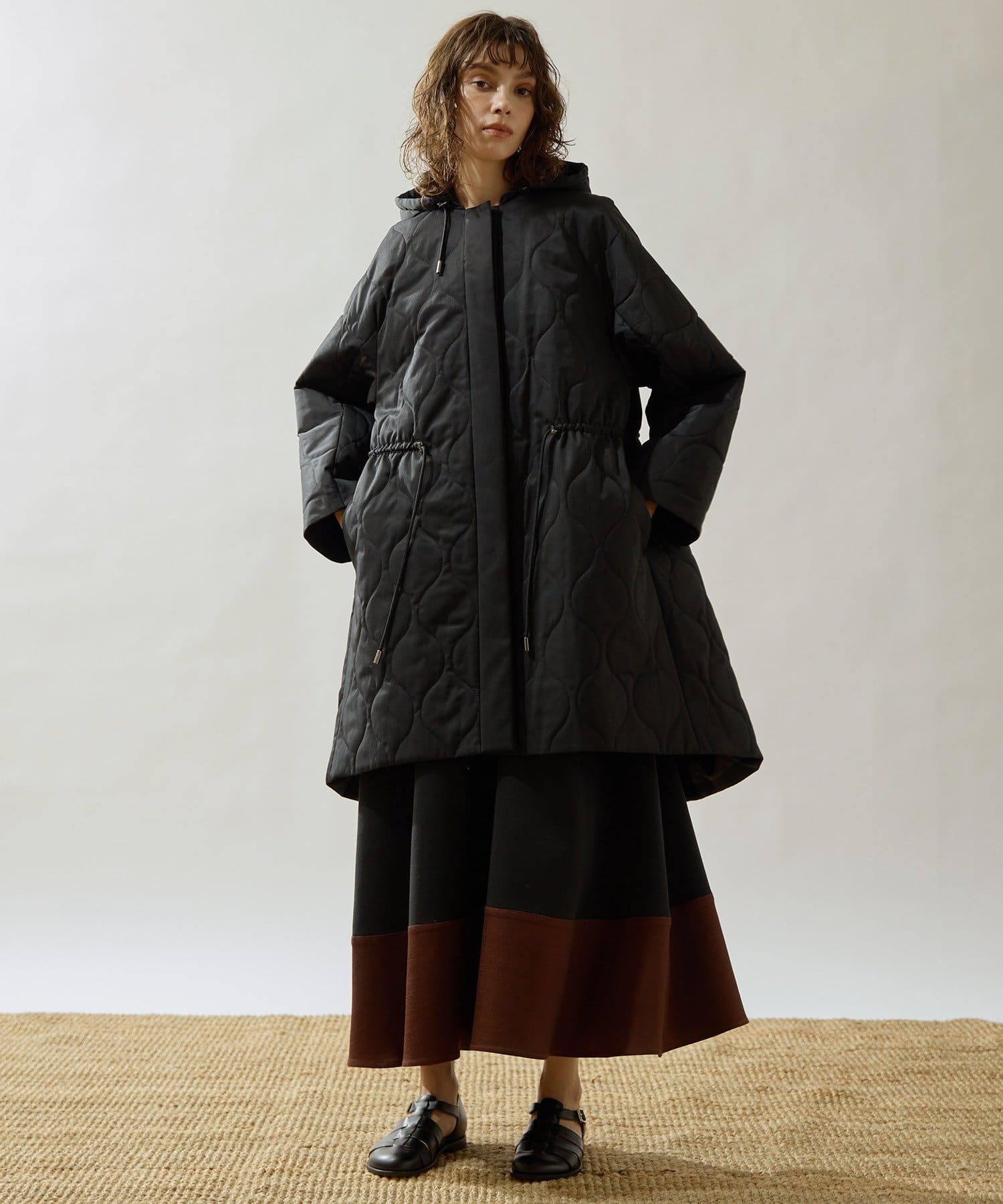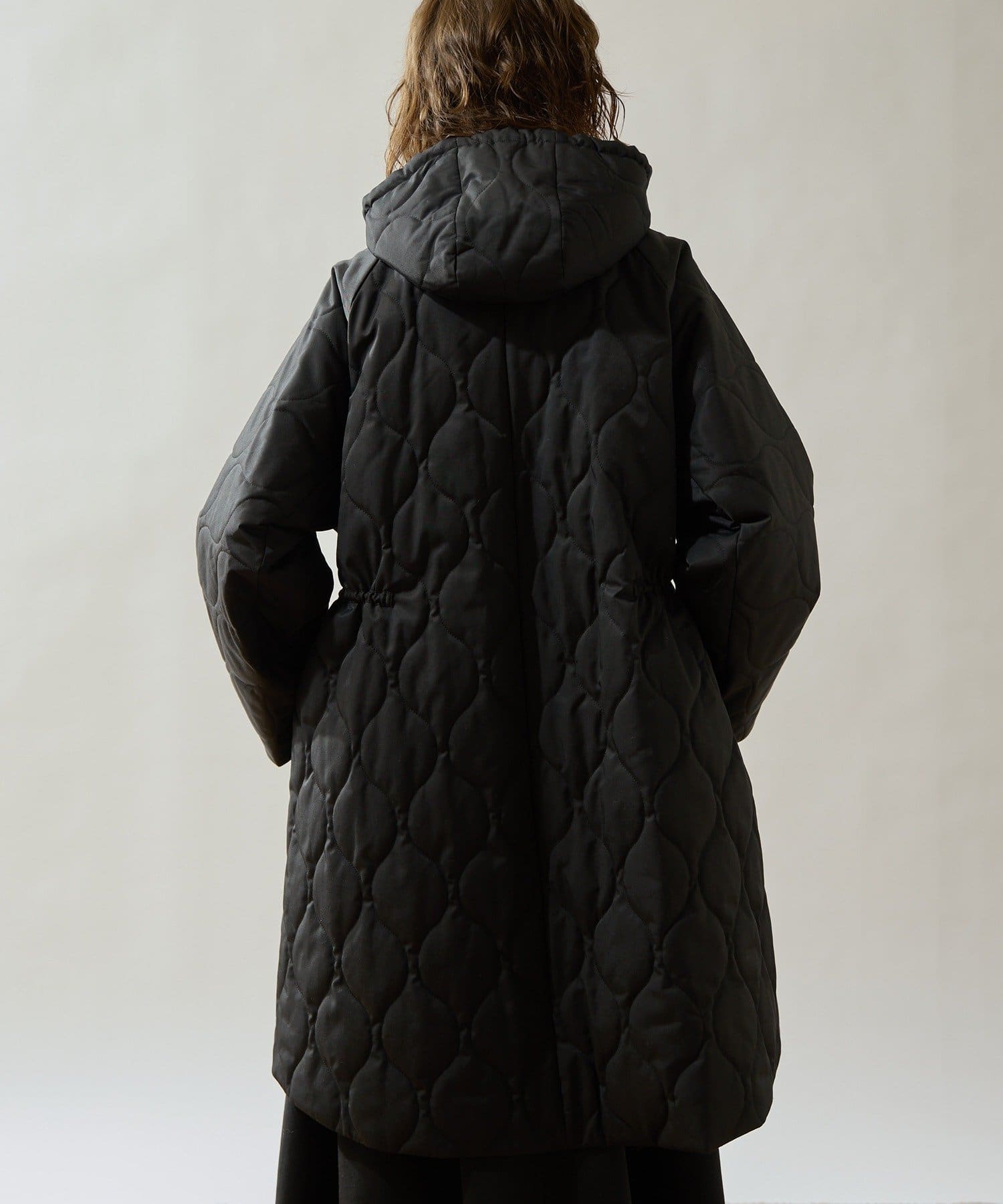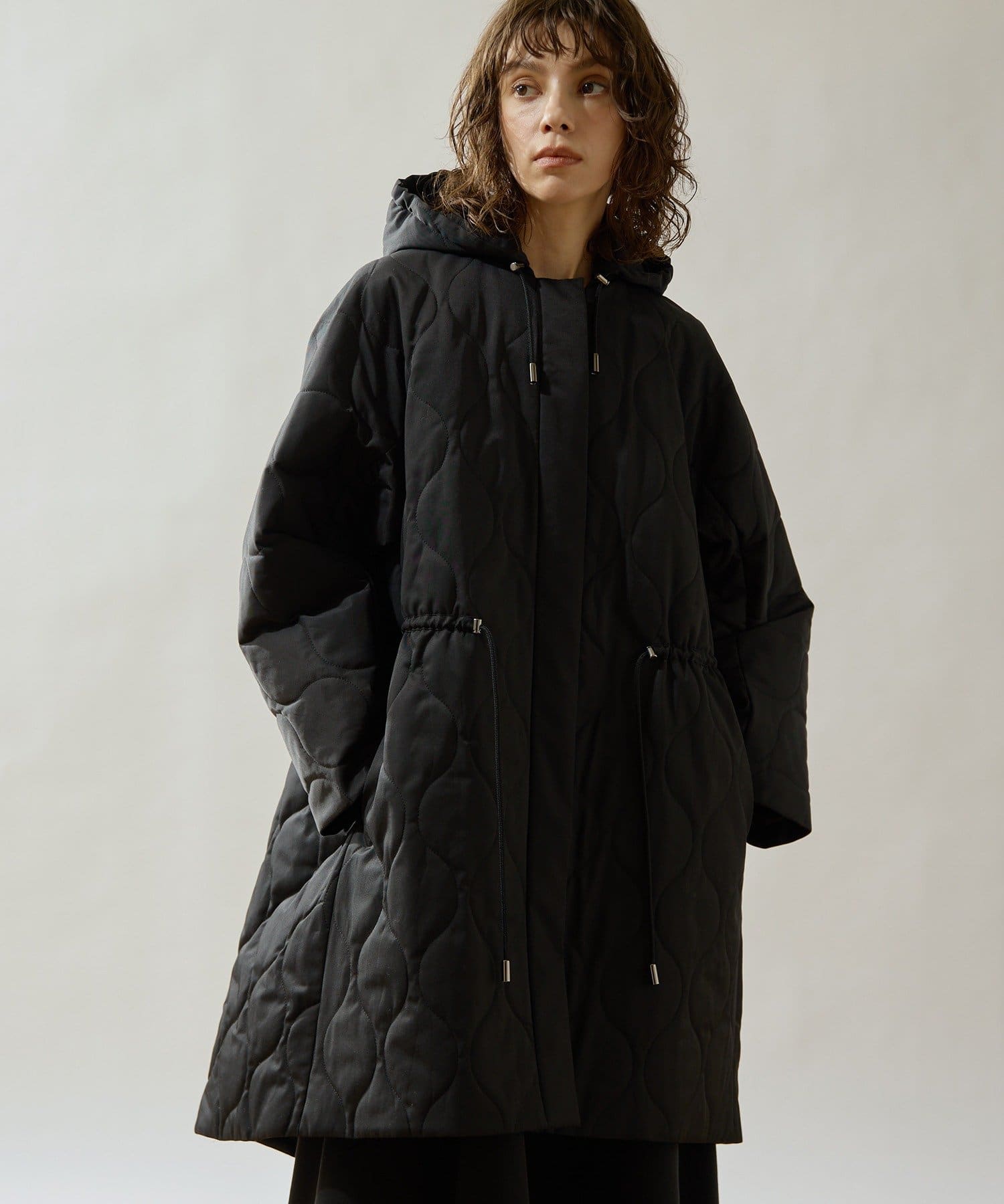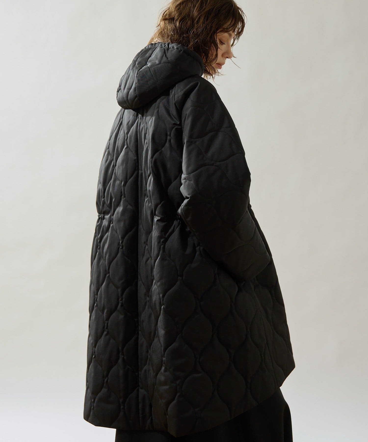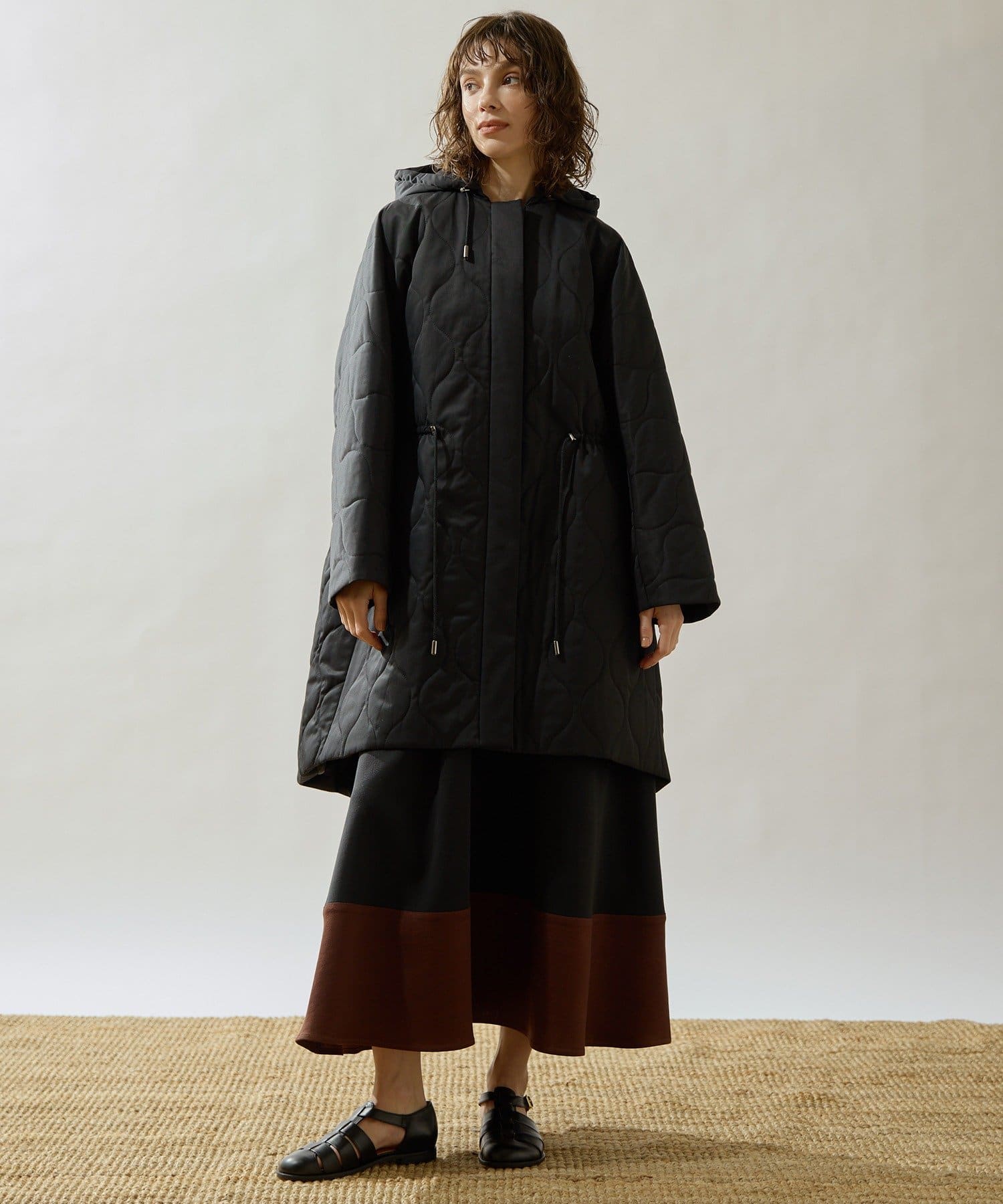 ■軽やかなキルト生地で仕立てたフード付きコート。