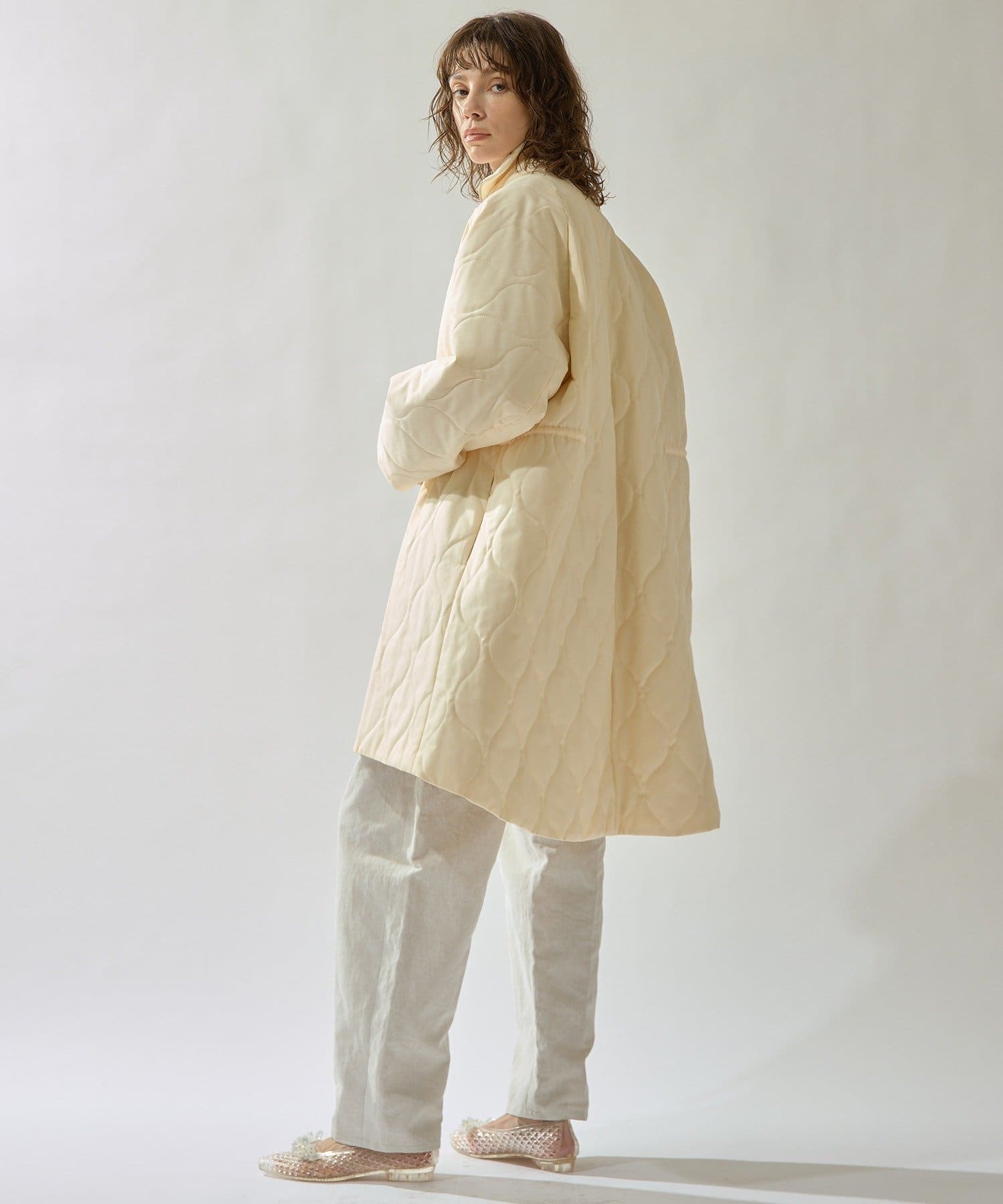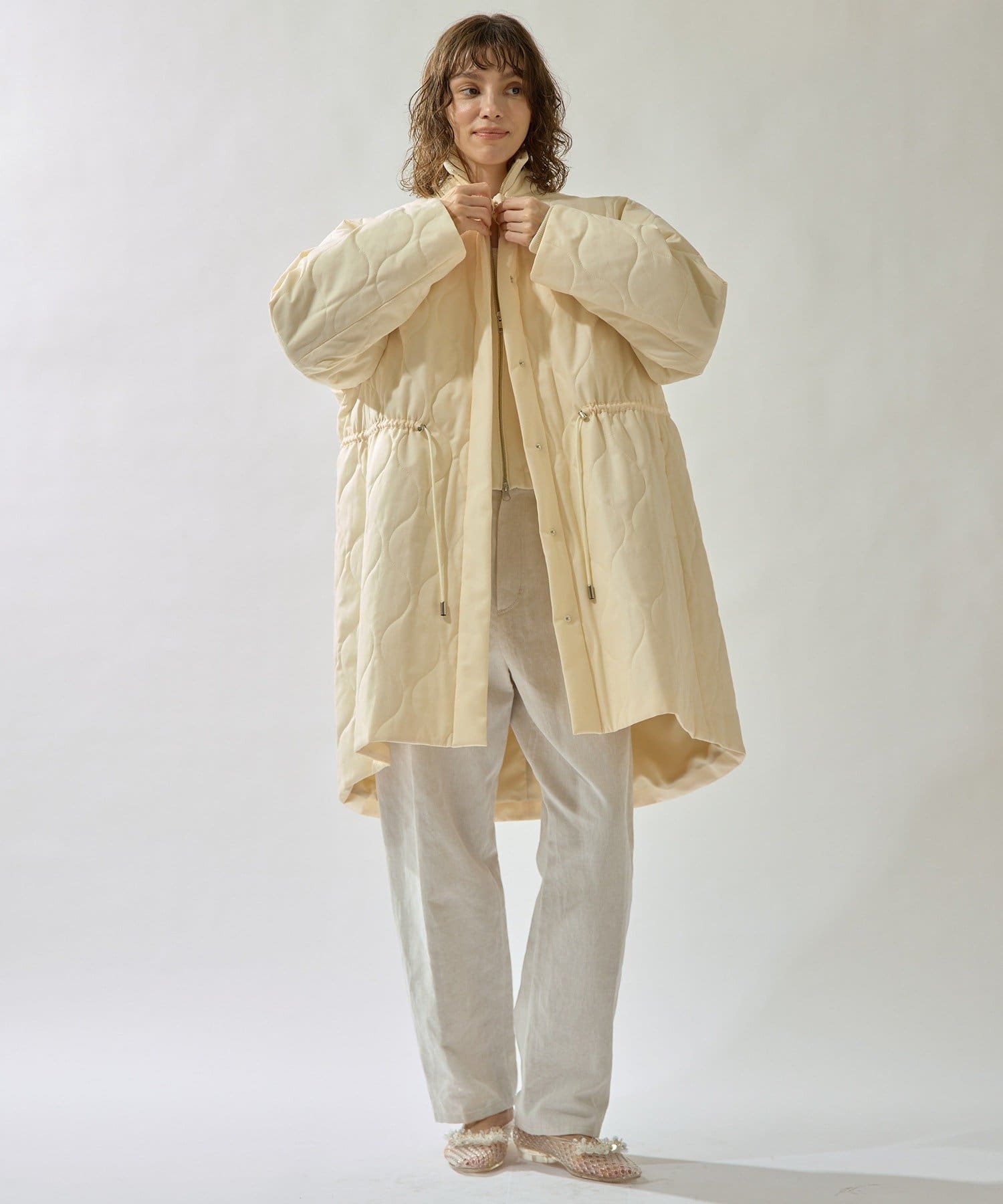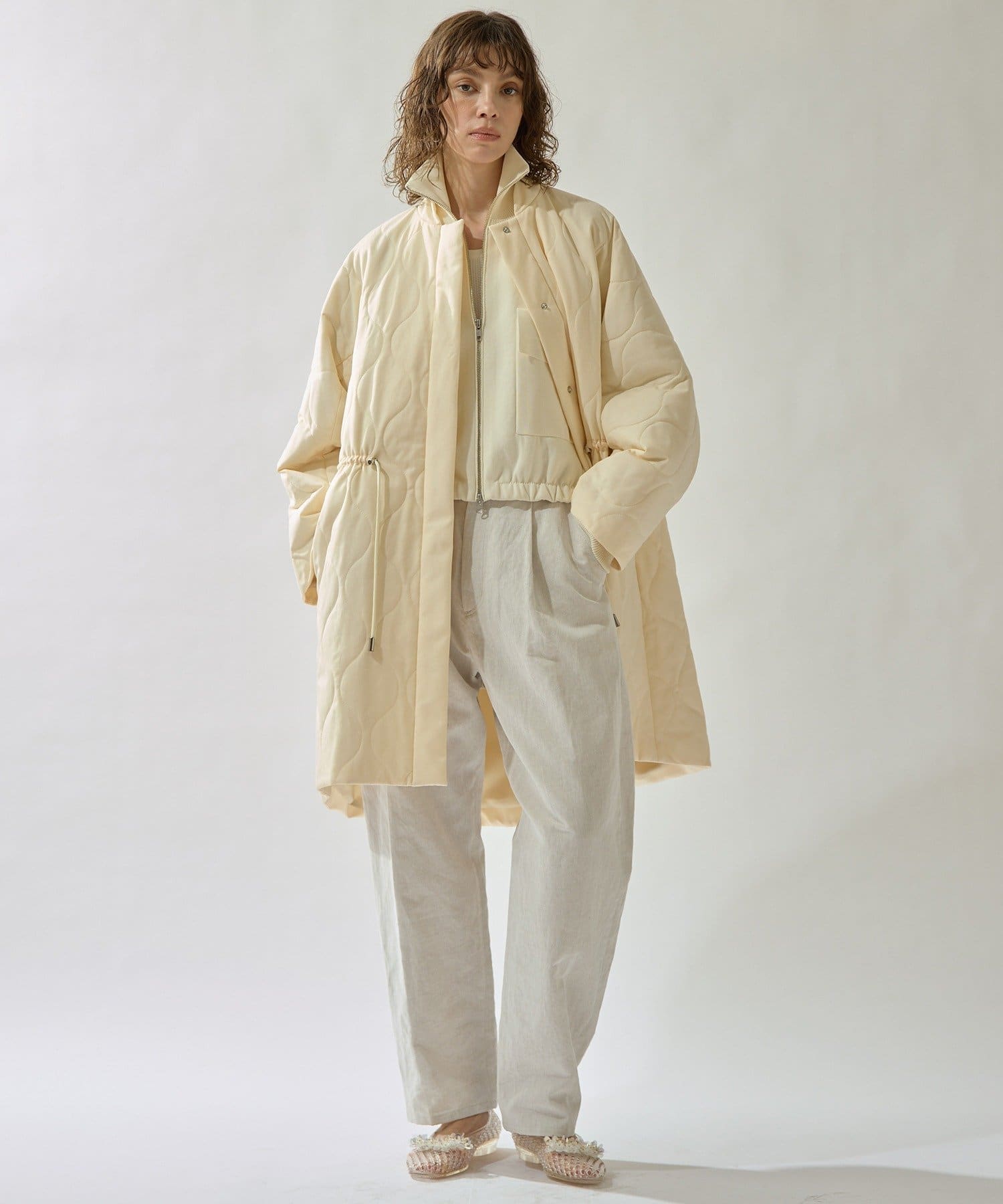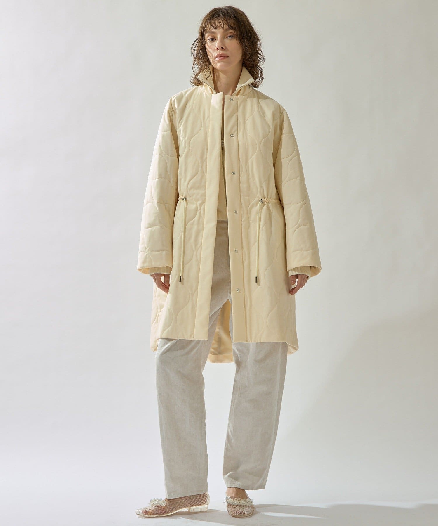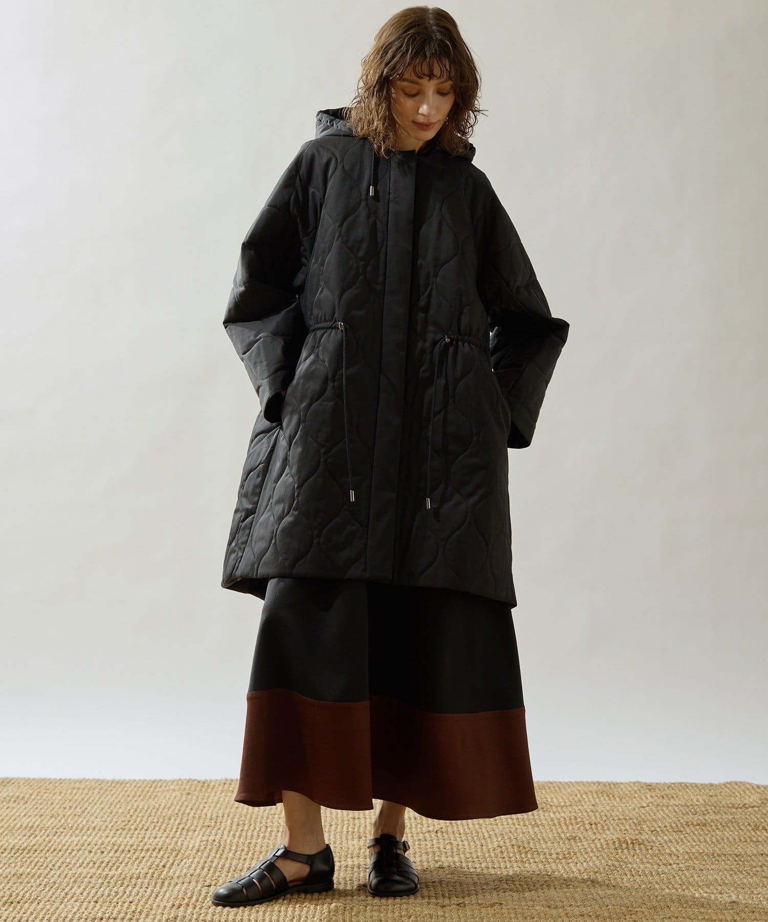 ■軽やかなキルト生地で仕立てたフード付きコート。