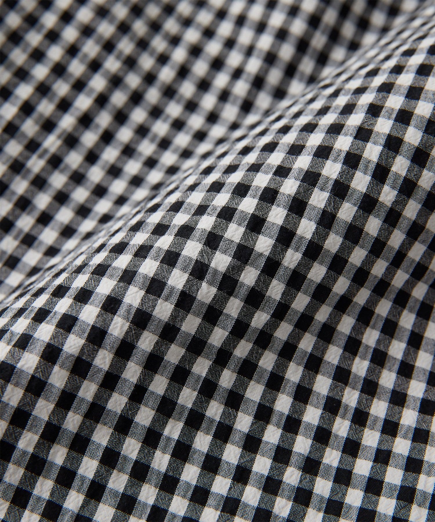 オーガニックコットンを使用し、強撚糸を使用して少量づつ丁寧に揉み洗いすることによって、ナチュラルなシワ感とドライタッチで清涼感のある風合いを表現した素材。