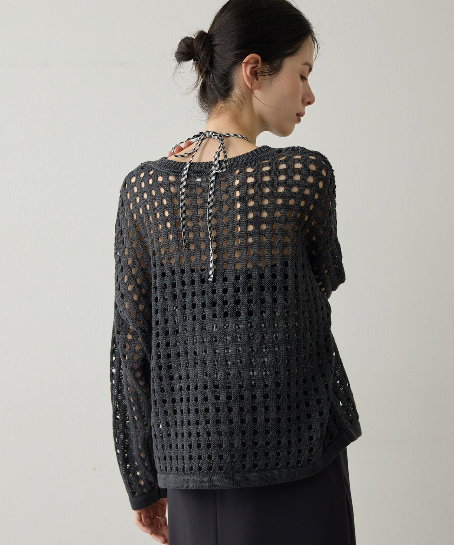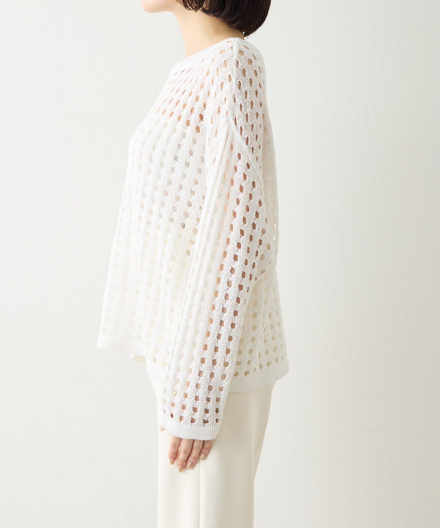 ミドルゲージのリネンでドライな質感に仕上げたアイレット編みニット。