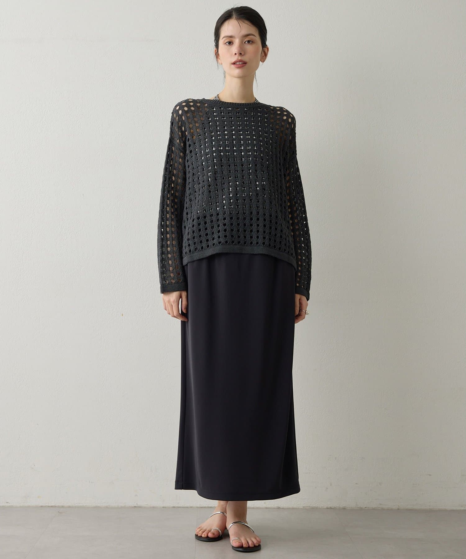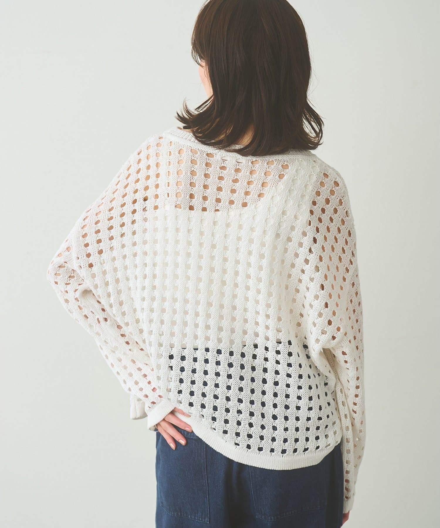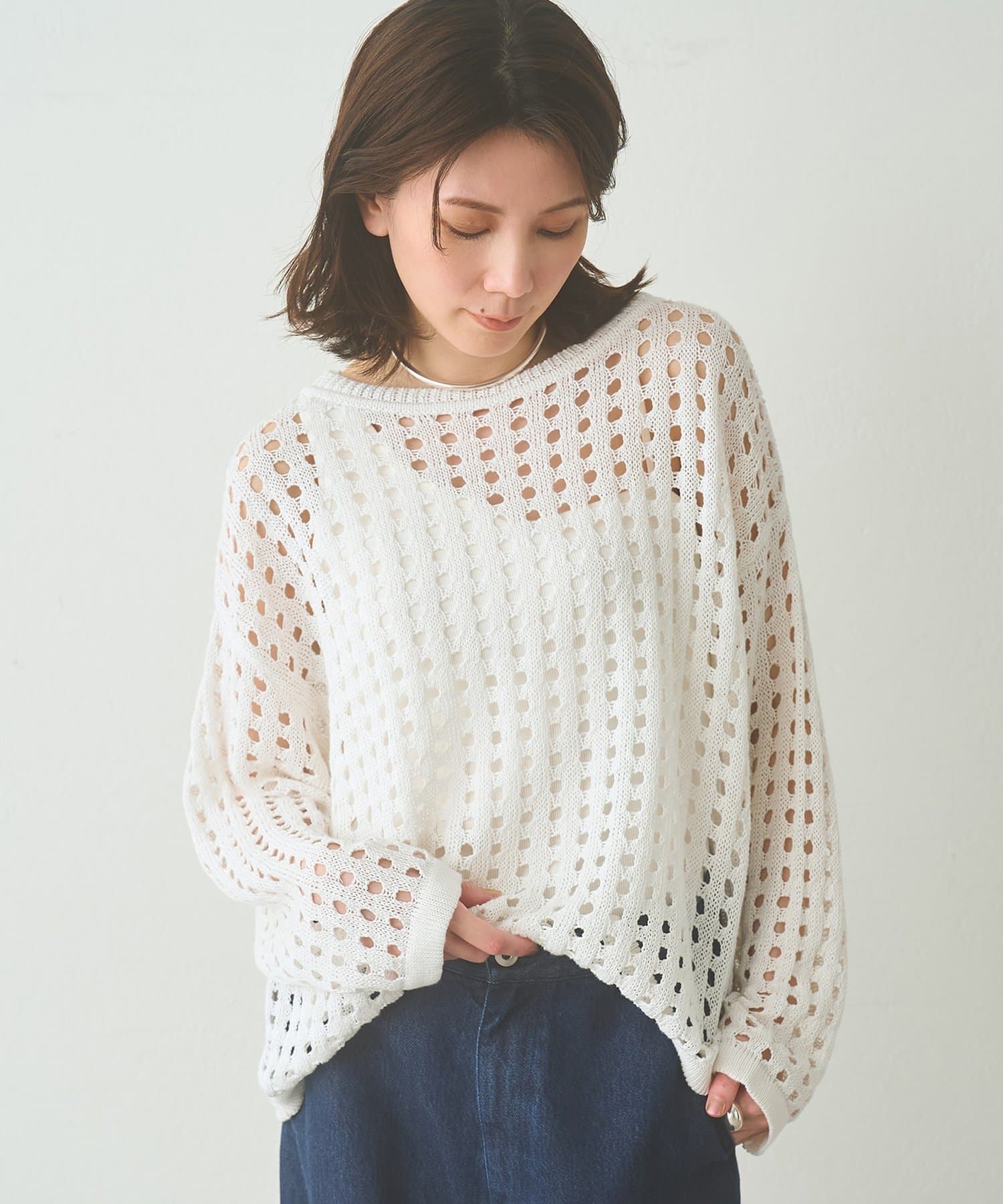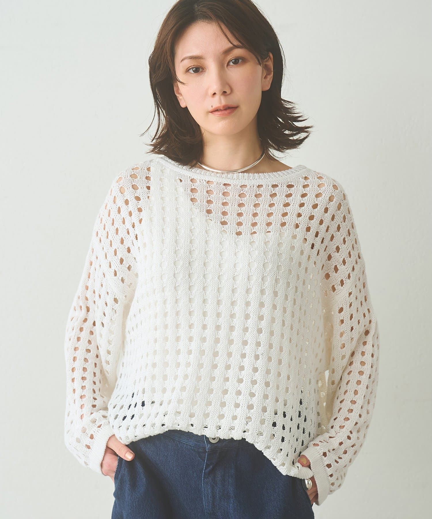 ■シンプルながらもアイレット編みの表情が一枚でサマになるデザイン。