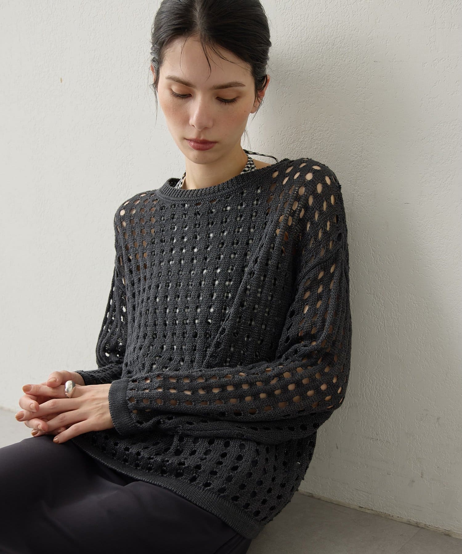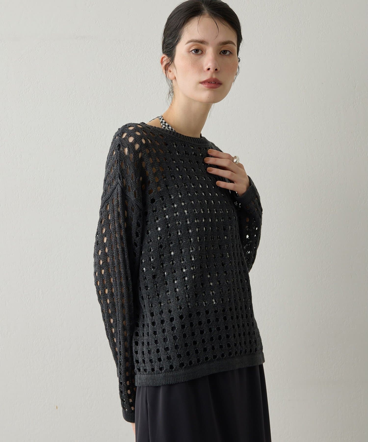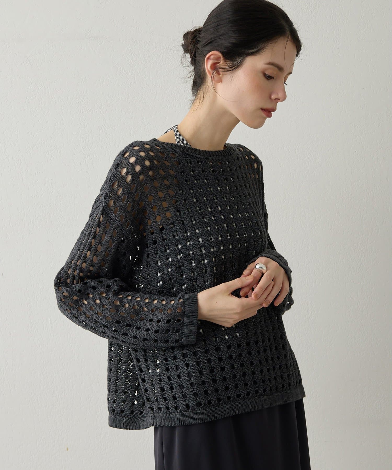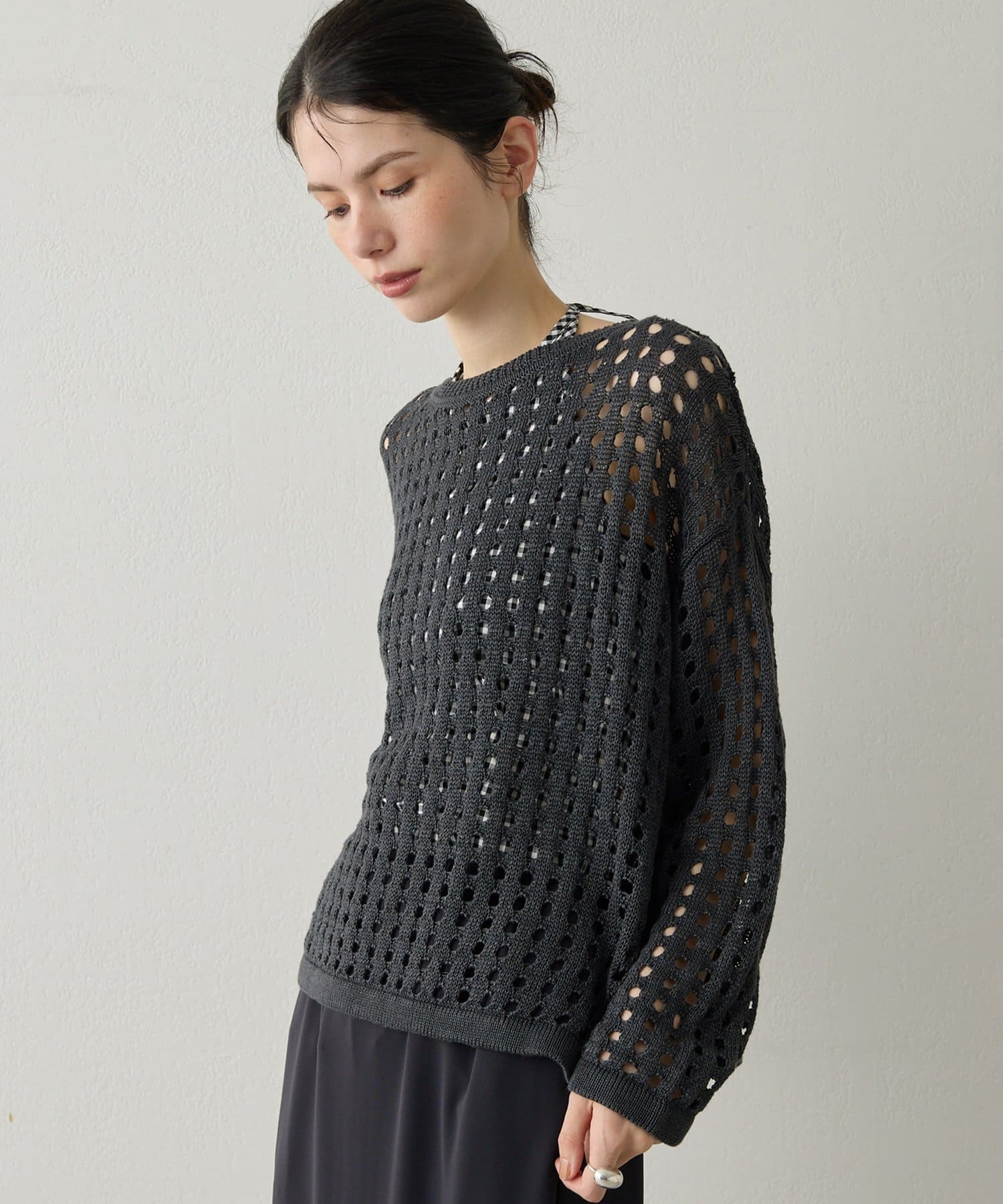■透け感のある編地が特徴的なメッシュニットプルオーバー。