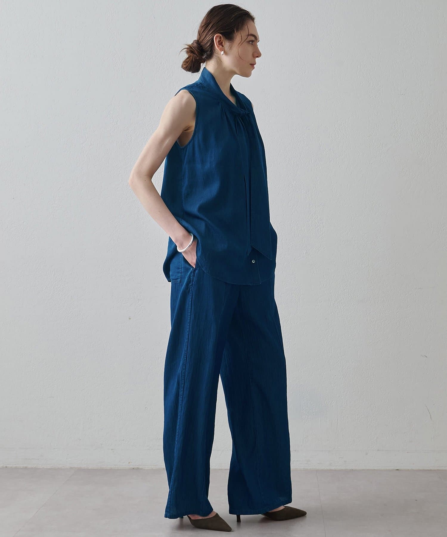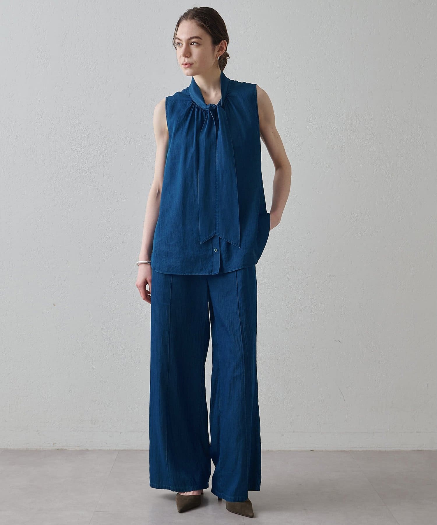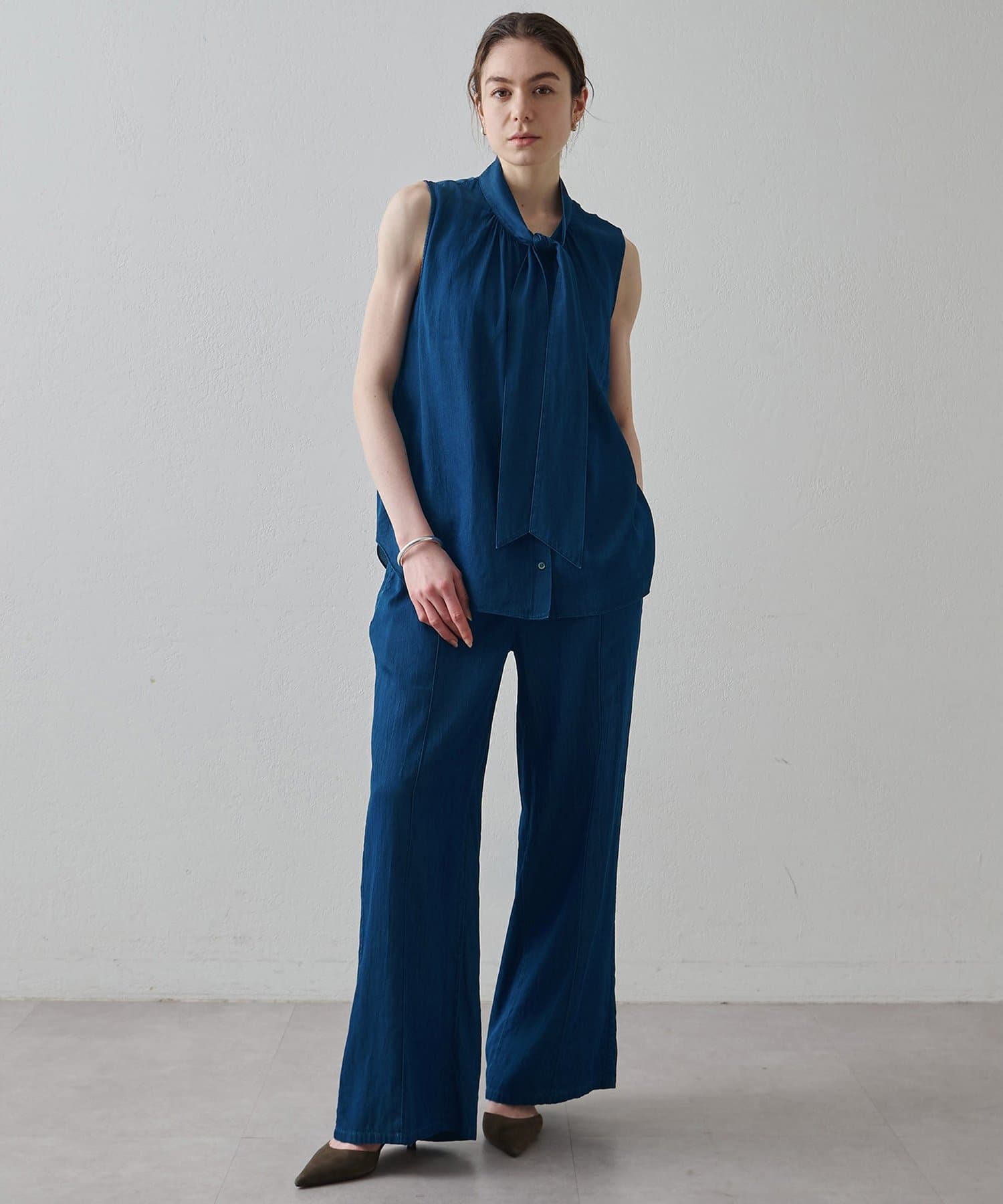 ■同素材のソフトデニムボウタイブラウス(ブランド品番:DNZ1061404A0003)とのセットアップもおすすめ。