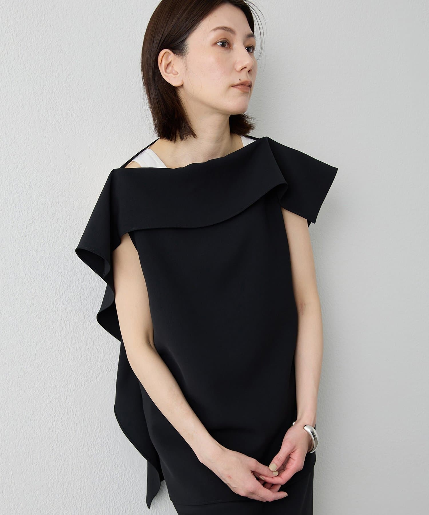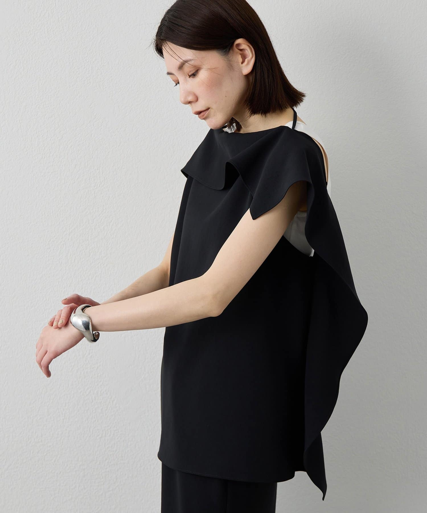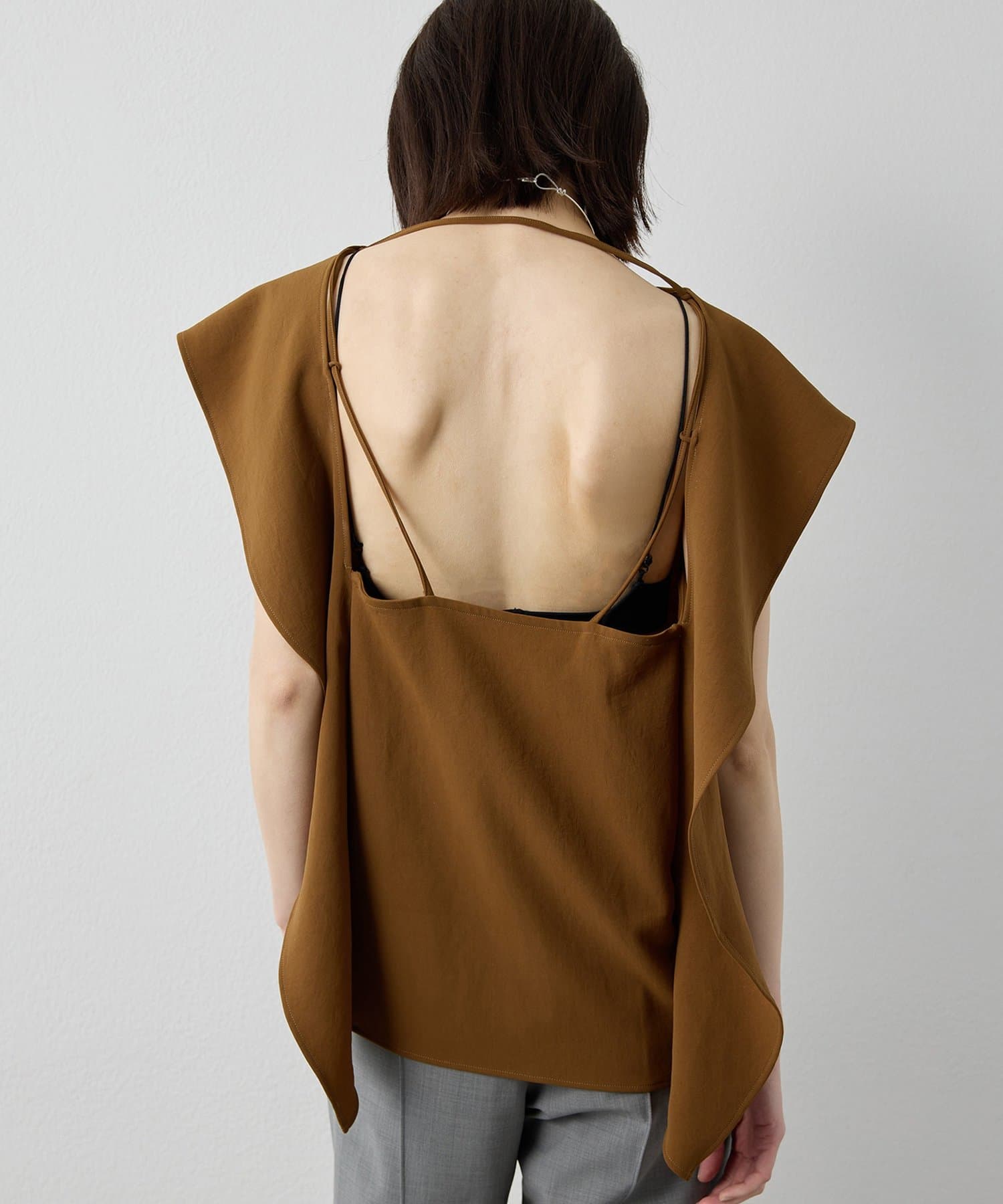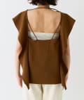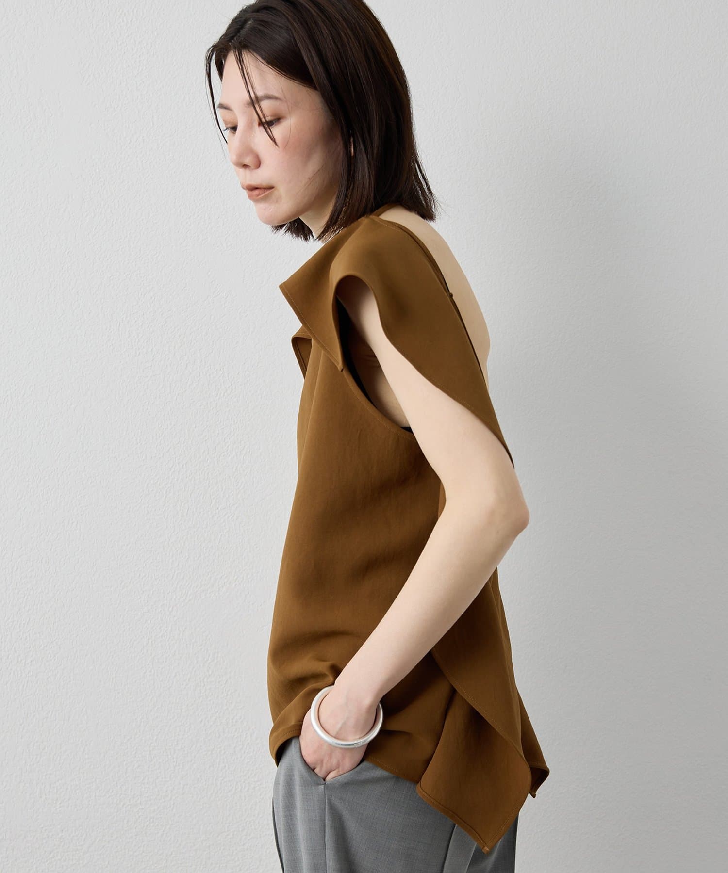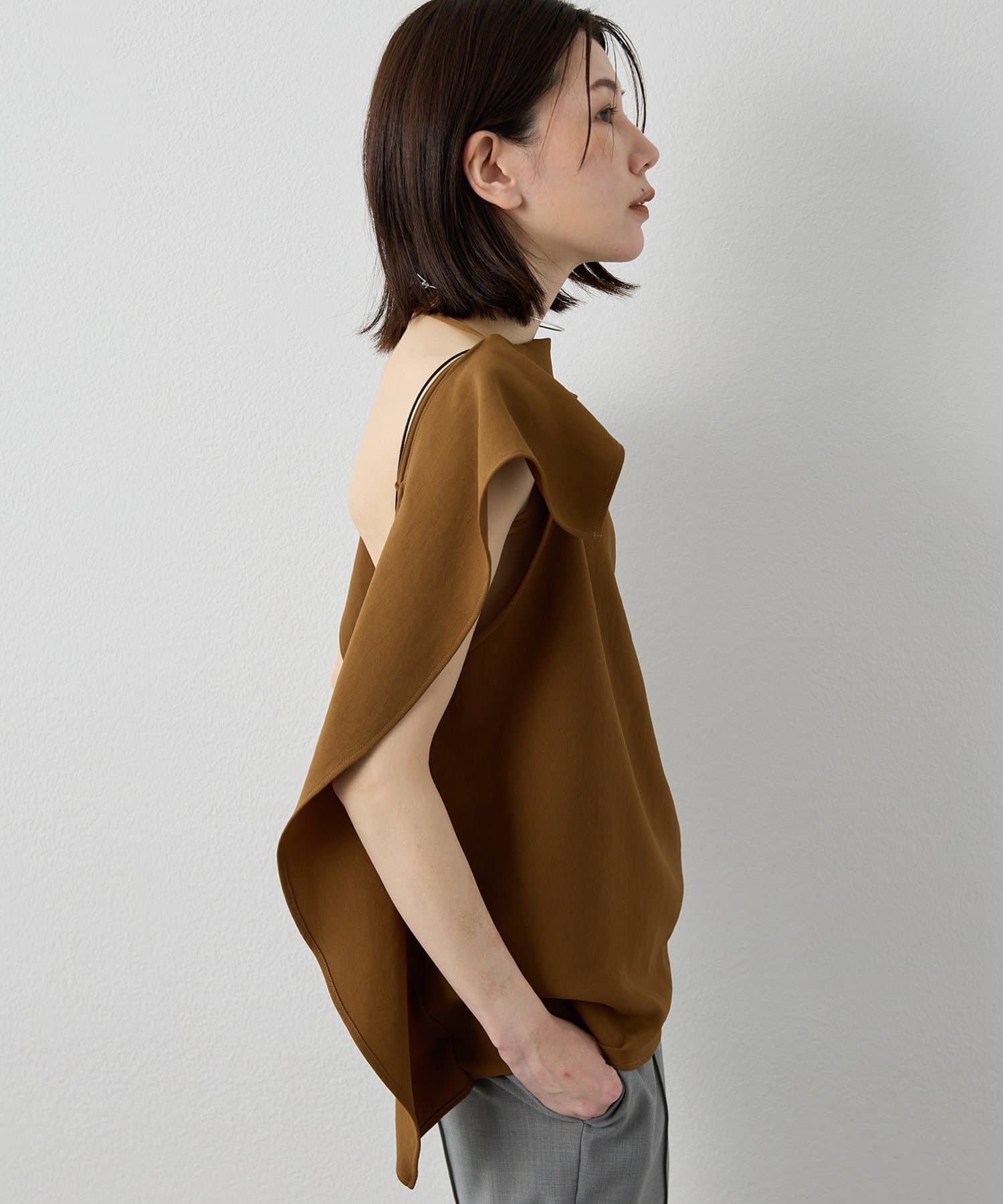 ■構築的なデザインと大きな背中の開きが印象的なブラウス。
