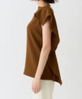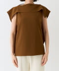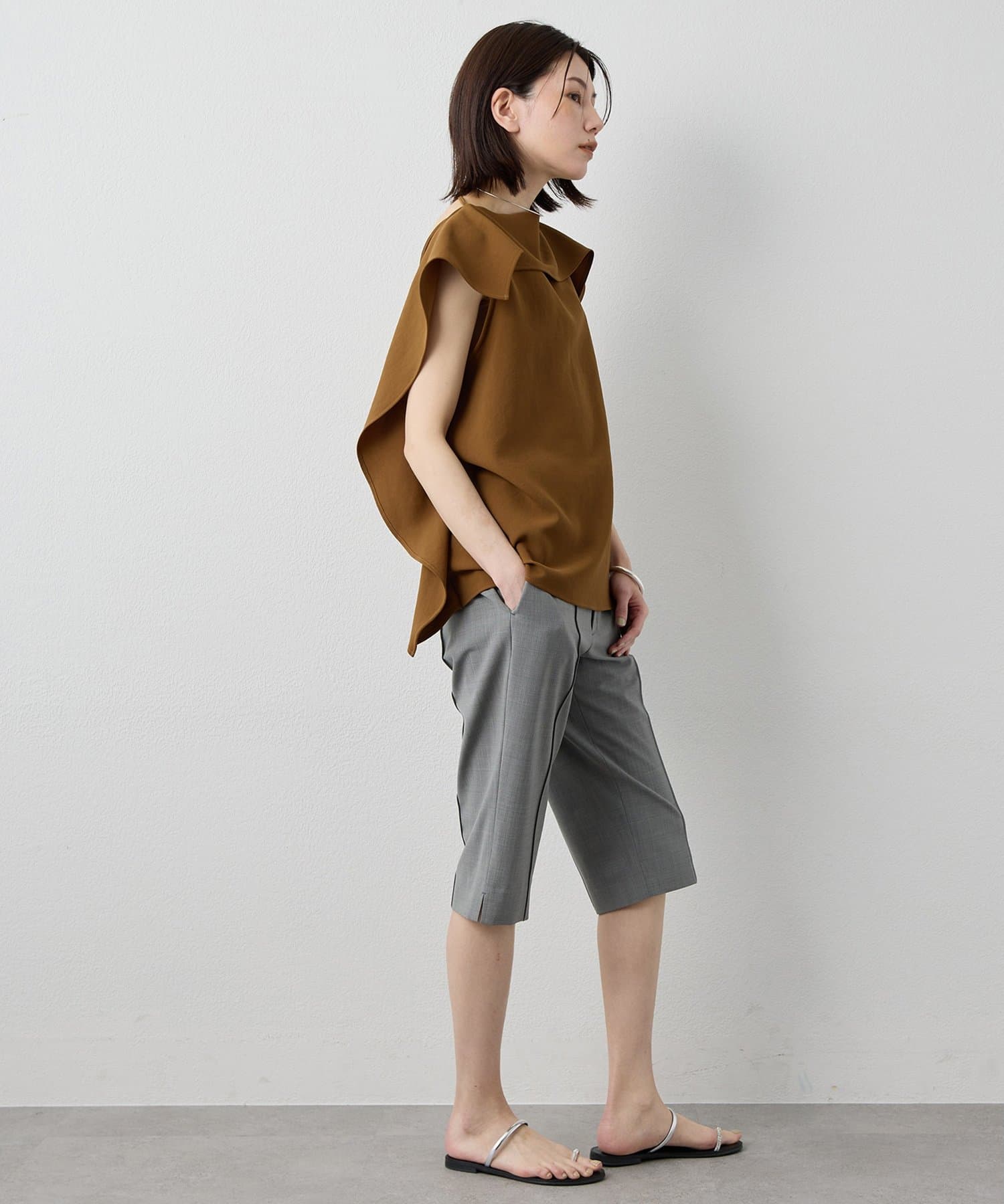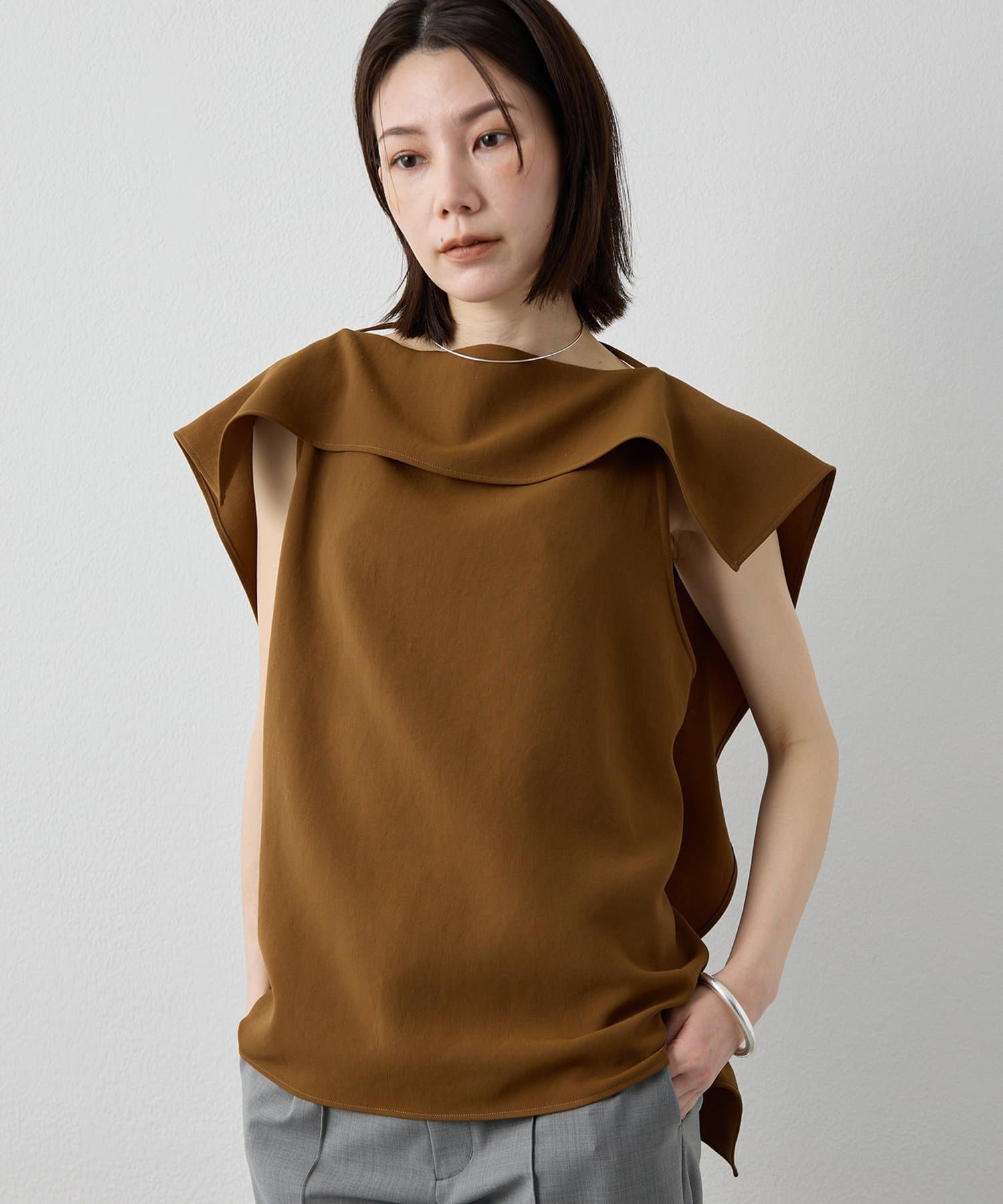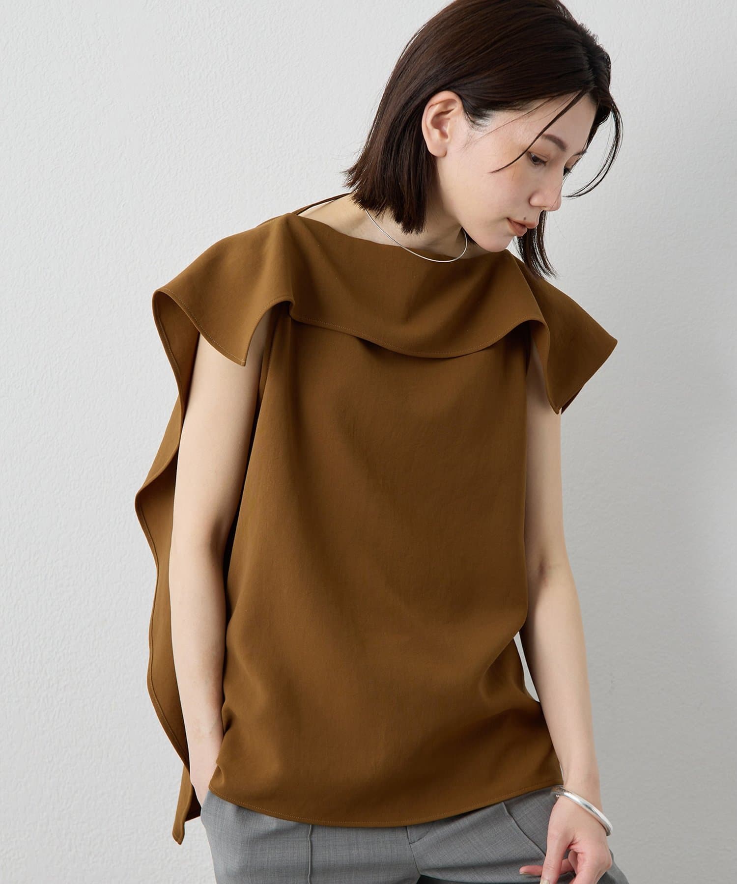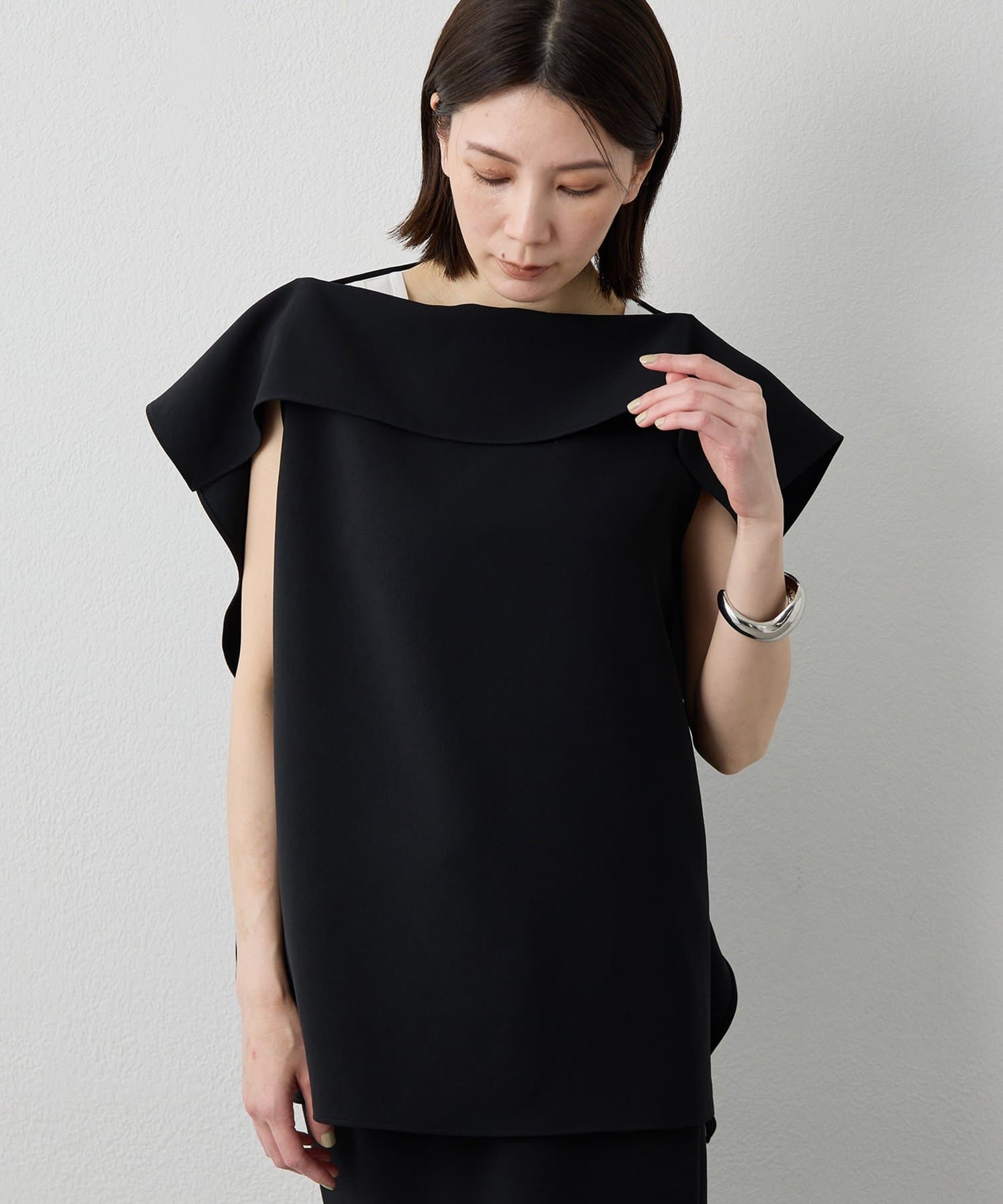 ■構築的なデザインと大きな背中の開きが印象的なブラウス。