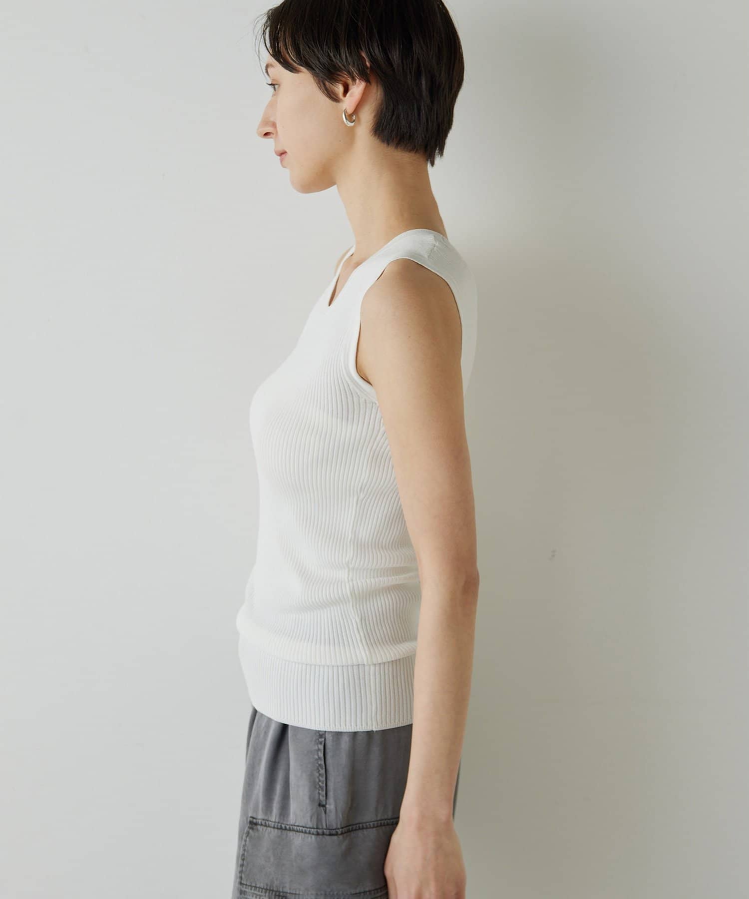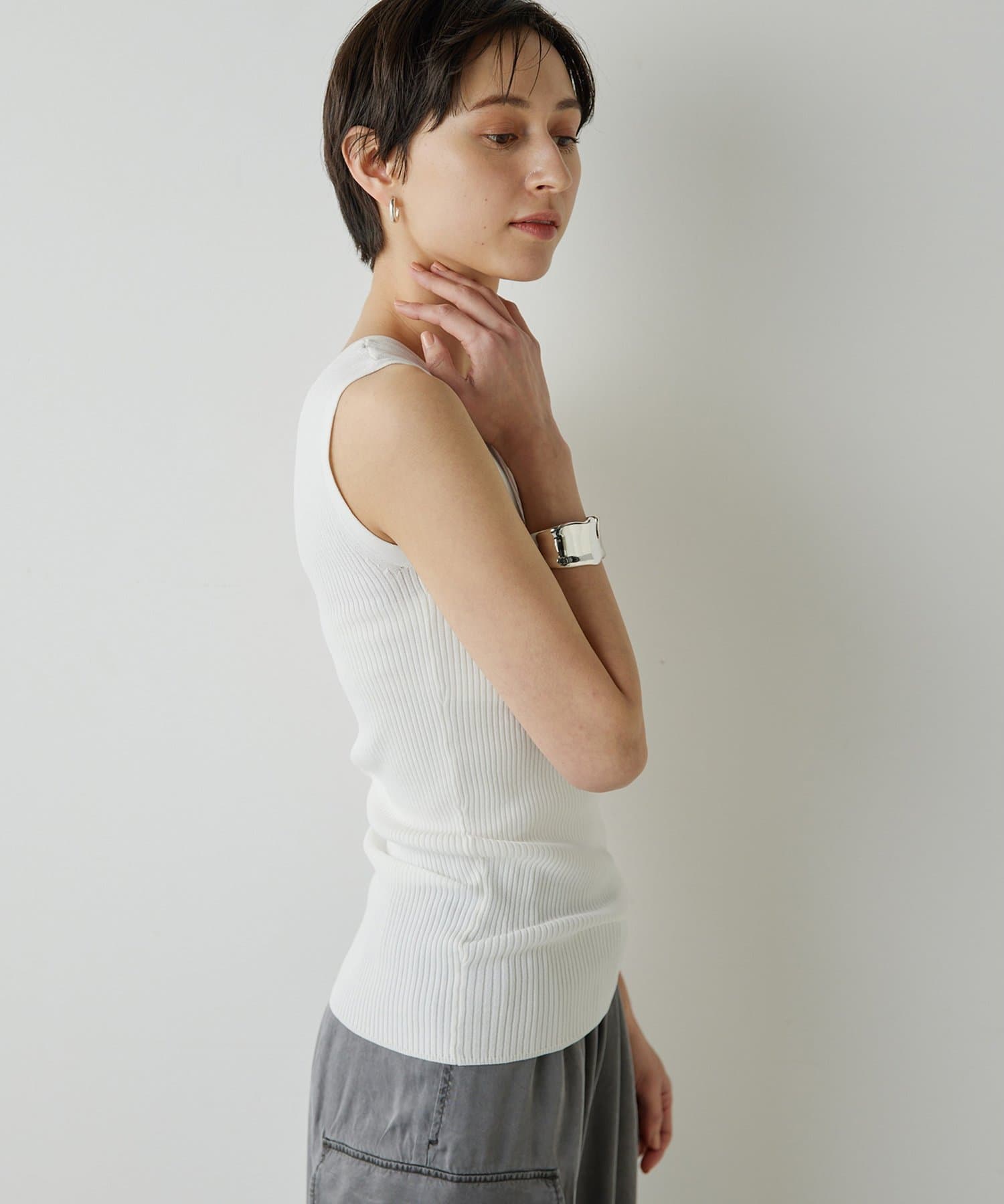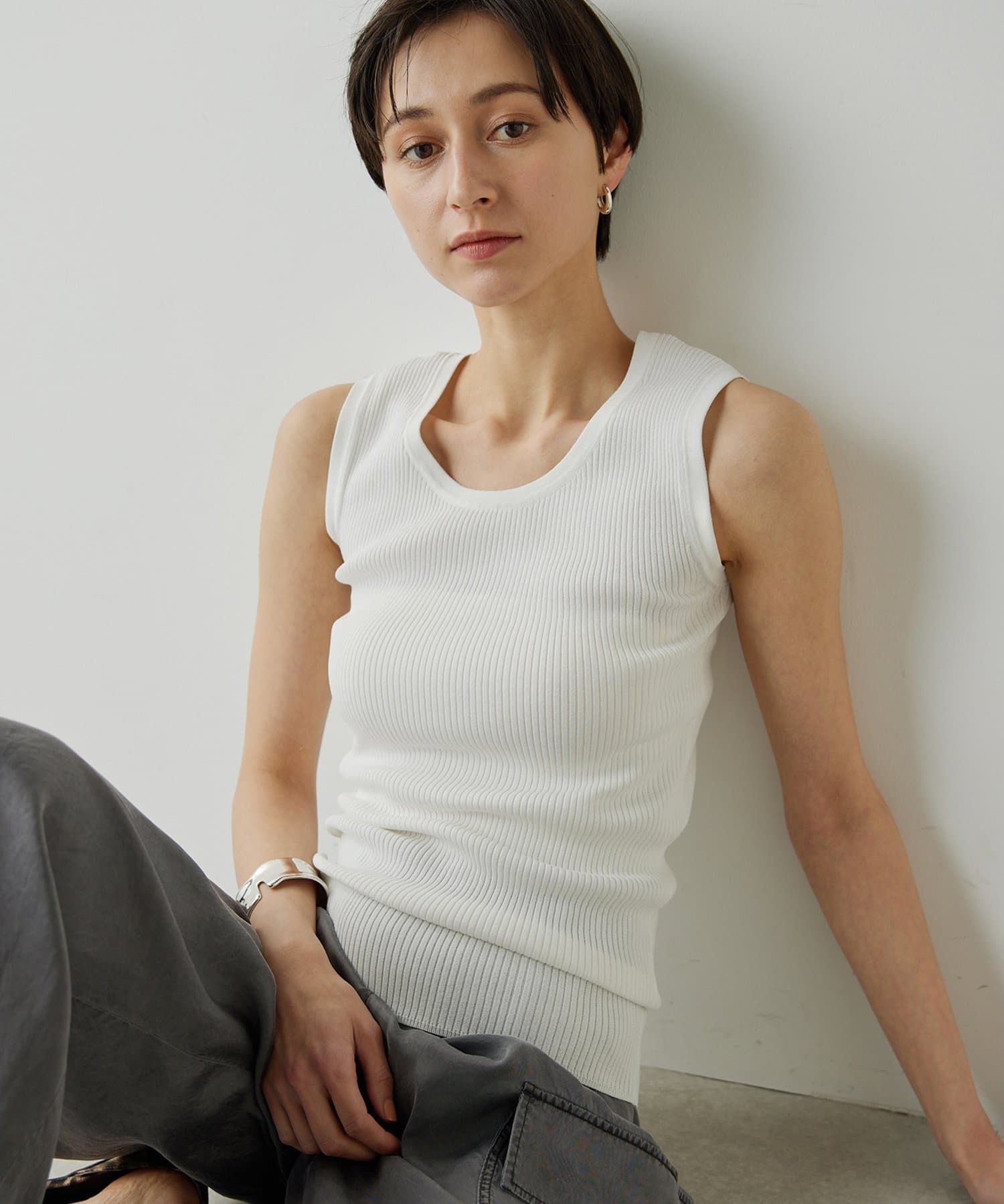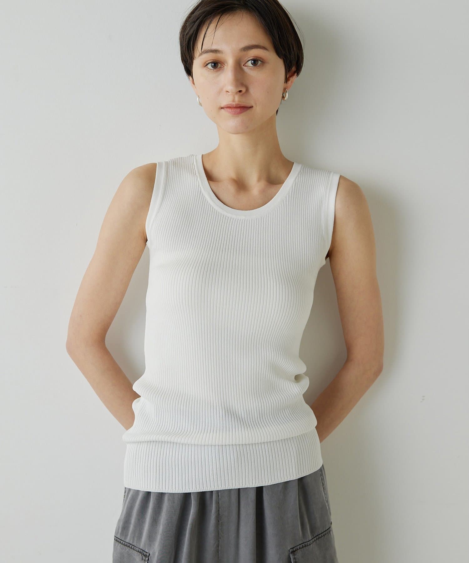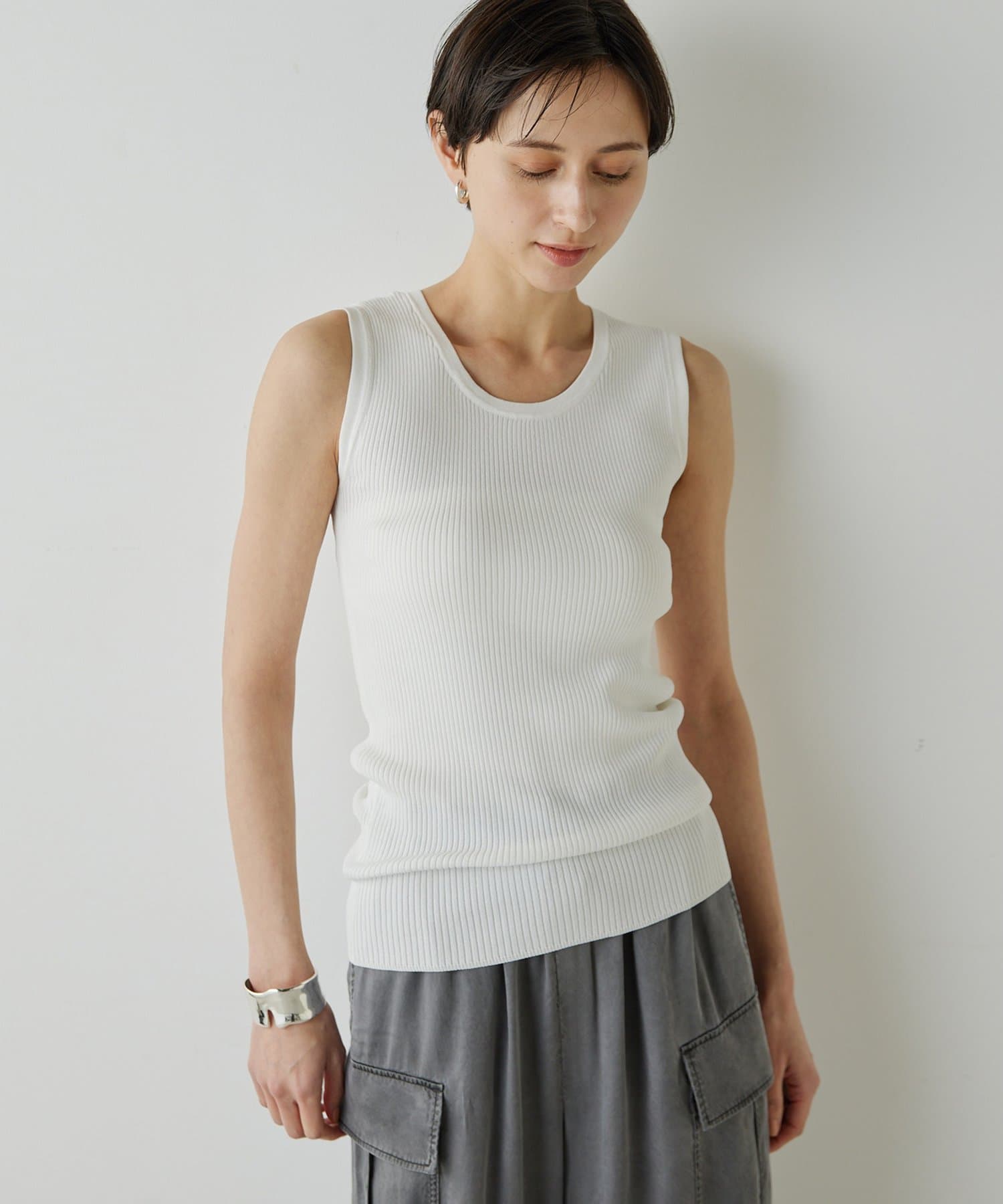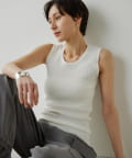 ■ミニマルなデザインのリブニットタンクトップ。