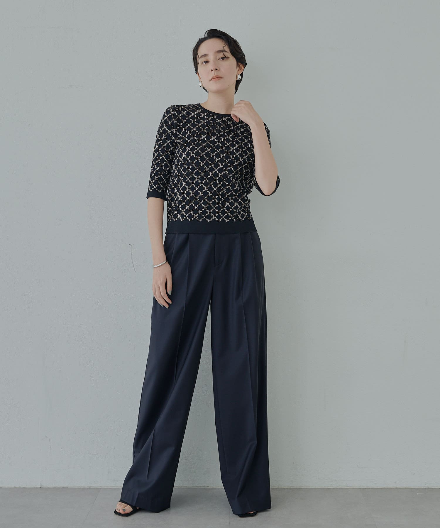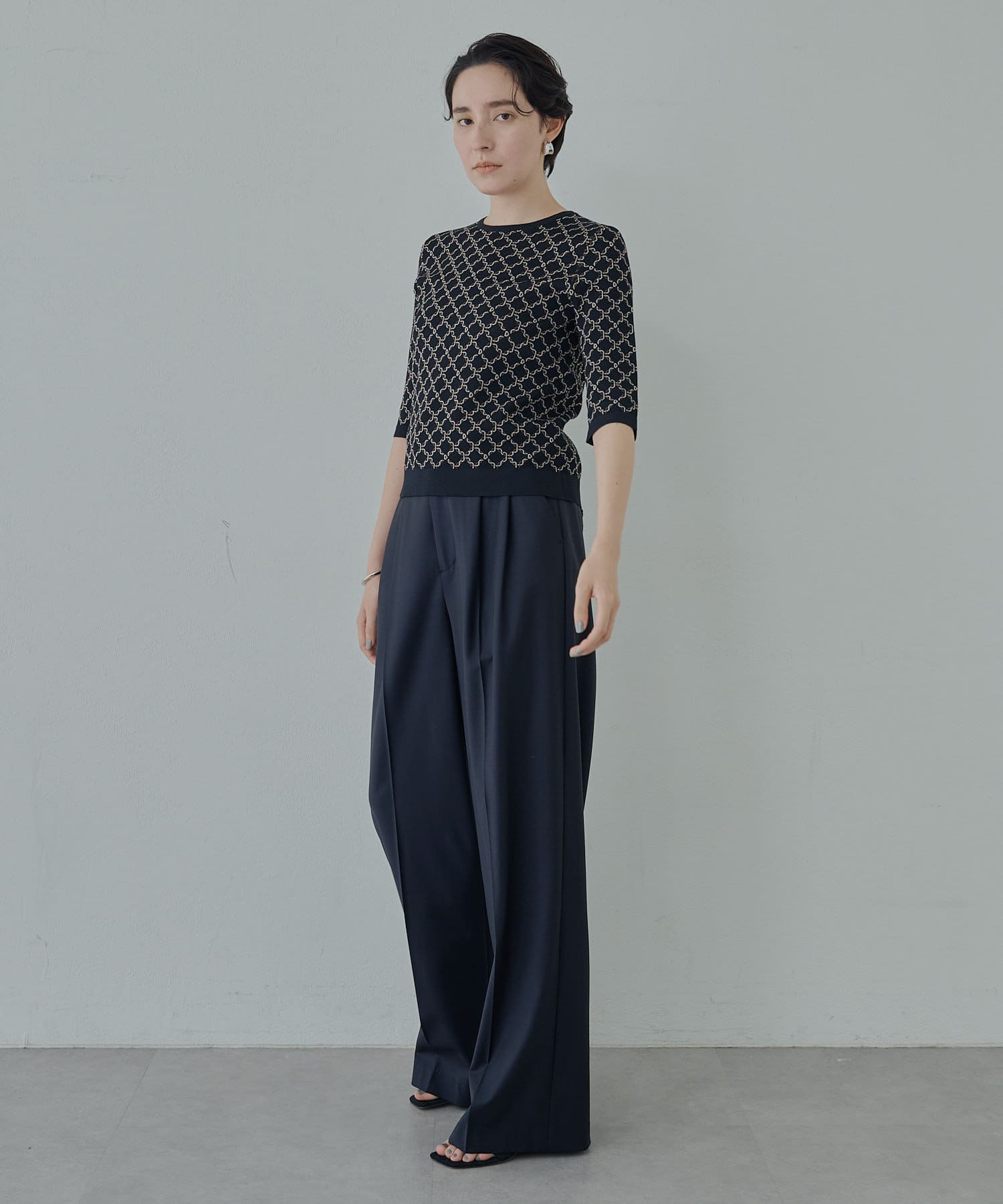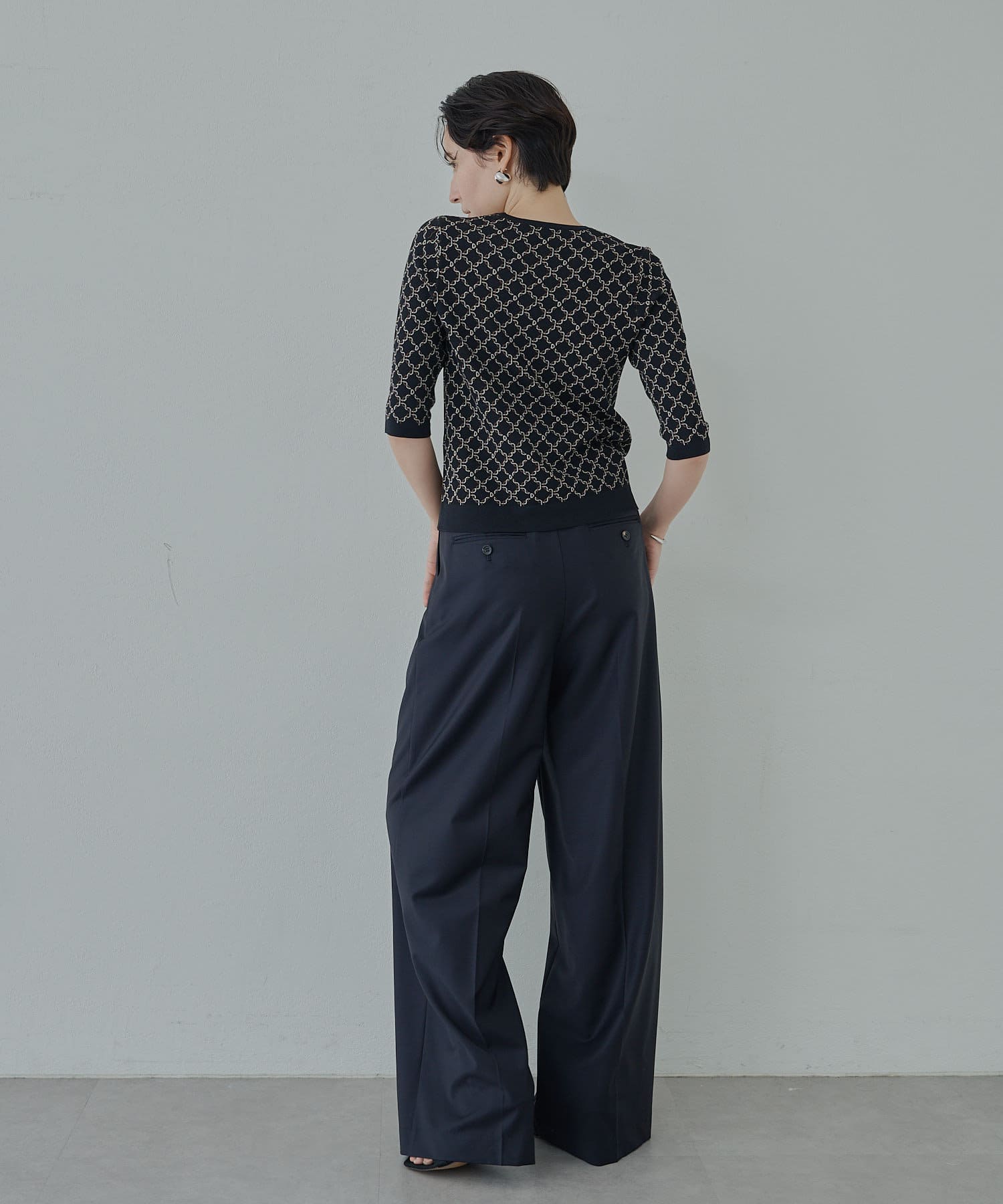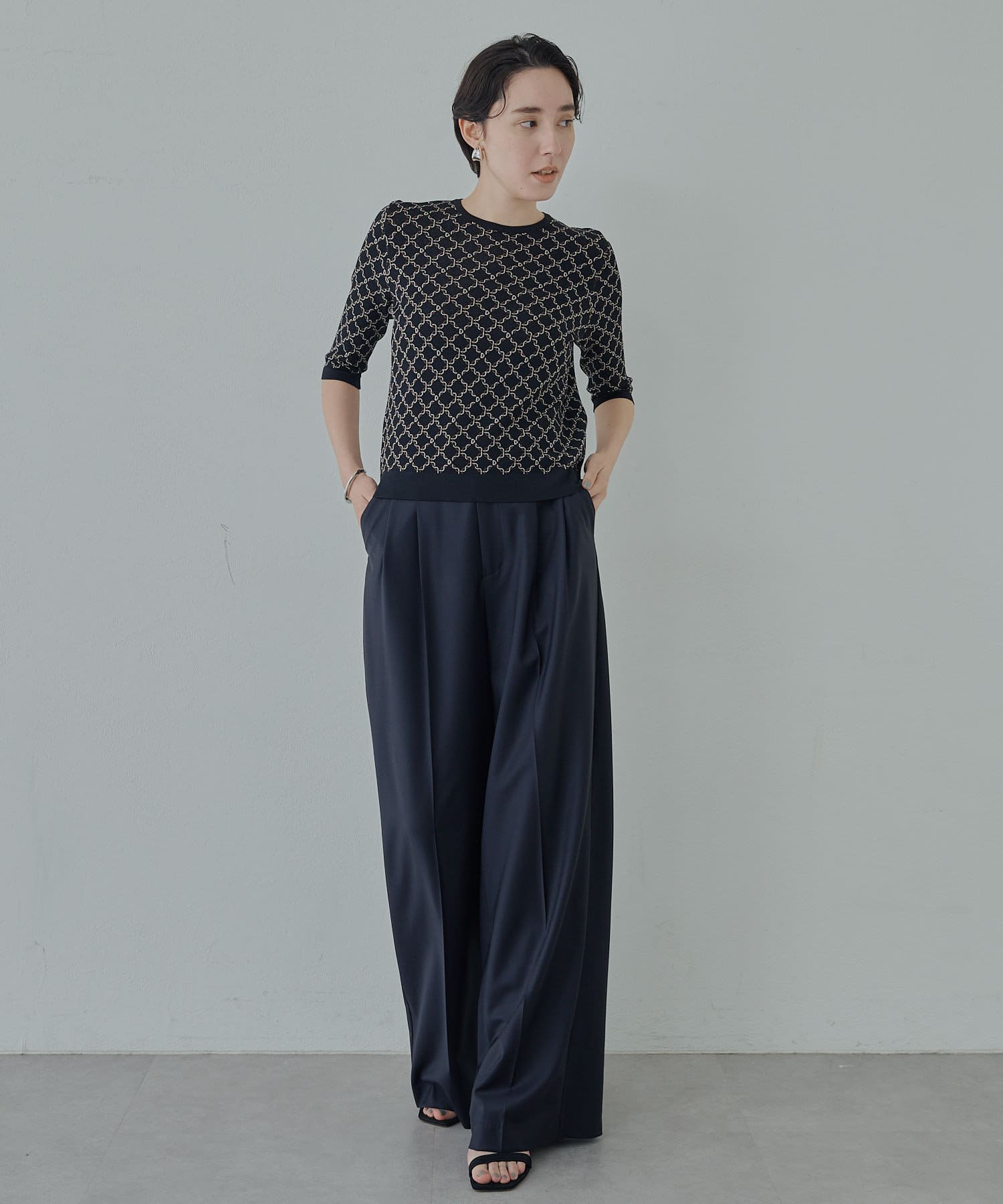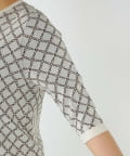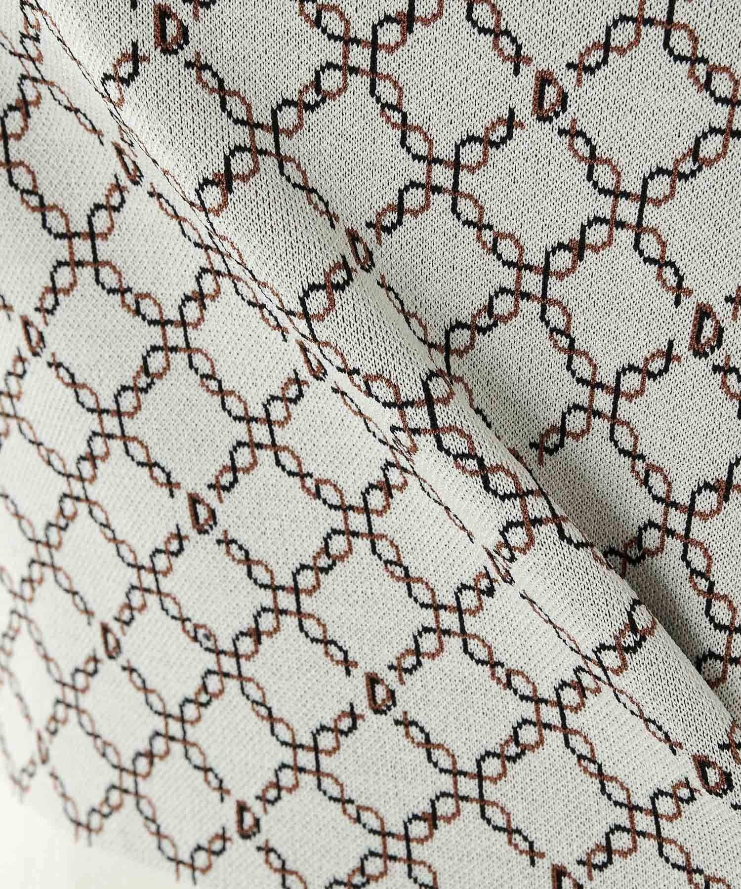 レーヨンのドレープ性とナイロンのストレッチ性を兼ね備えた、オリジナルジャガード柄ニット。