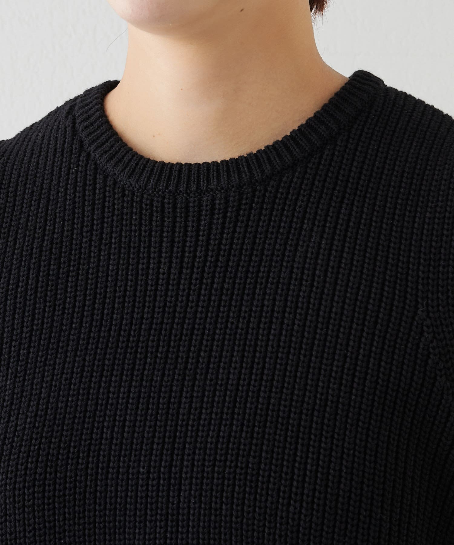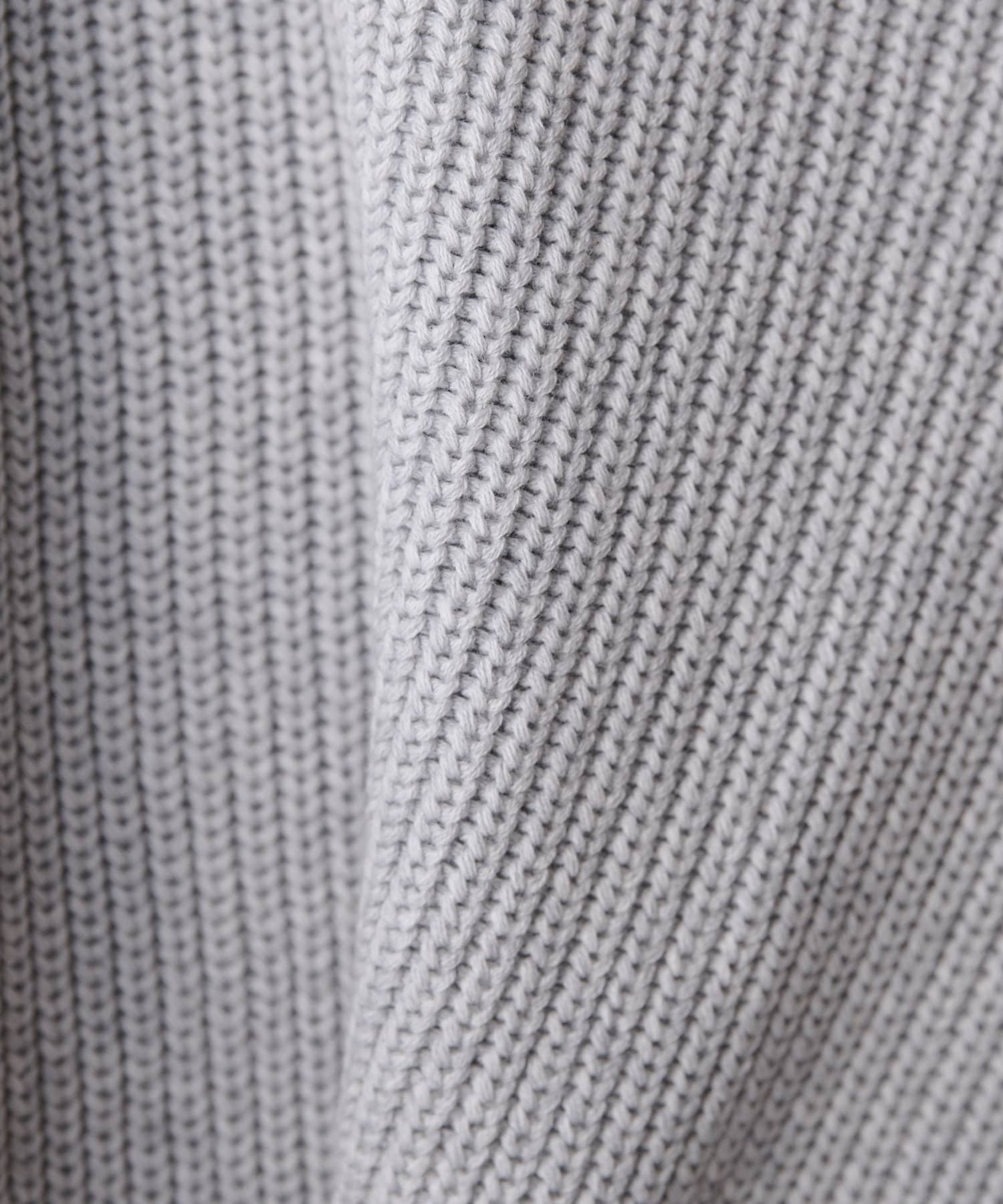 片畦組織(通常のリブの編地に比べ厚みが出て伸縮性をやや抑える事ができて質感を感じるストライプが特徴の編地)の綿ニット。
