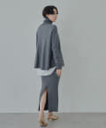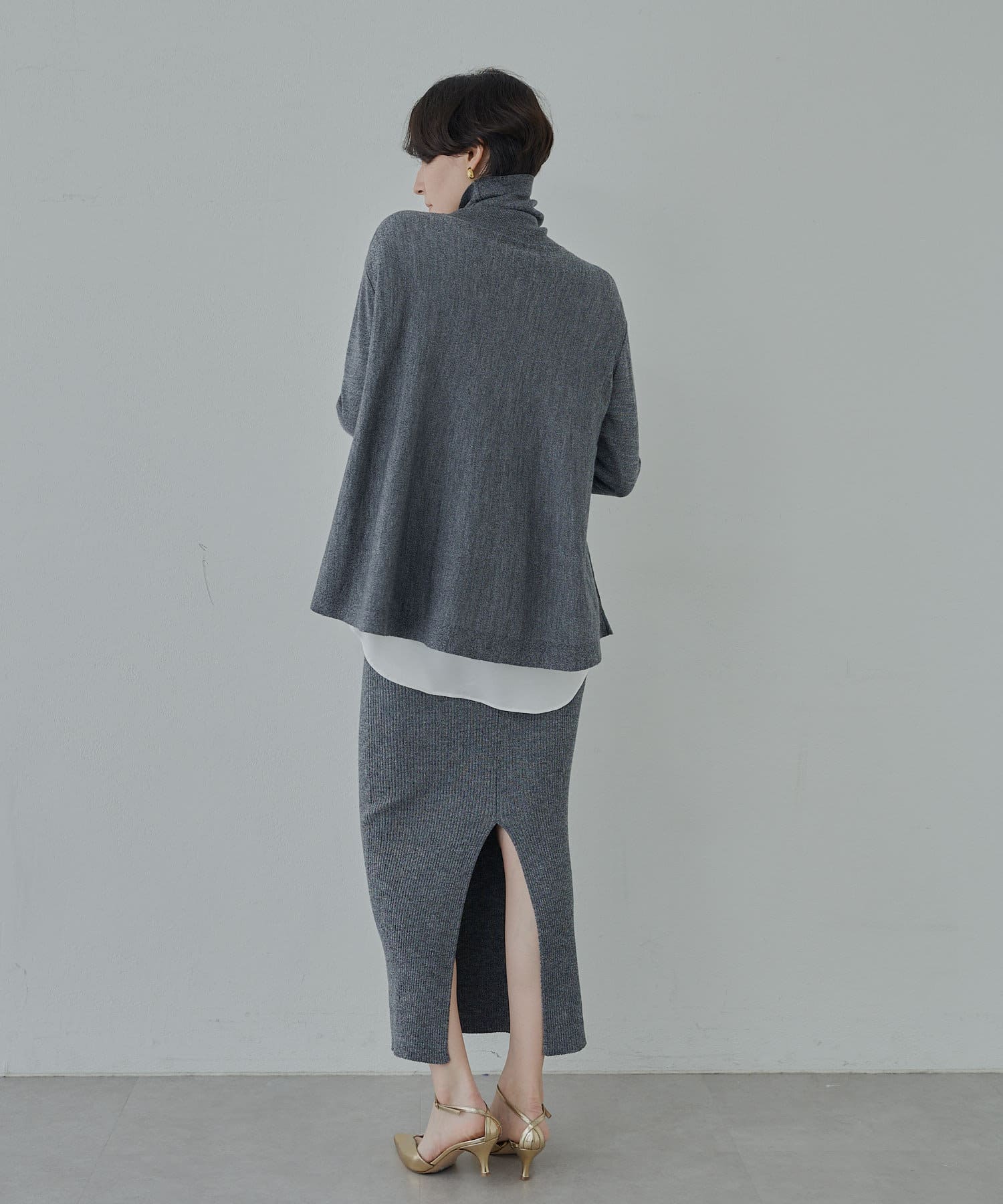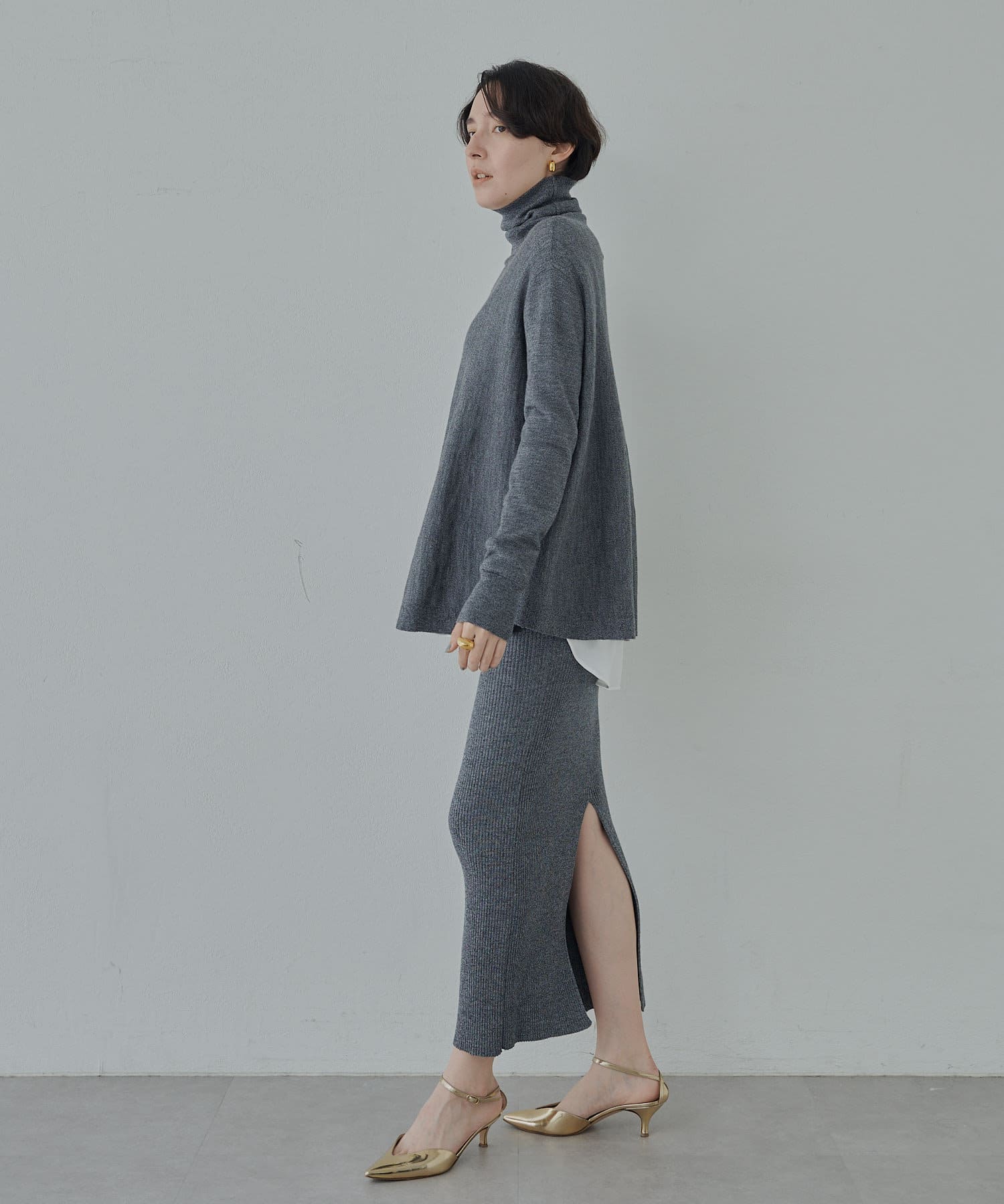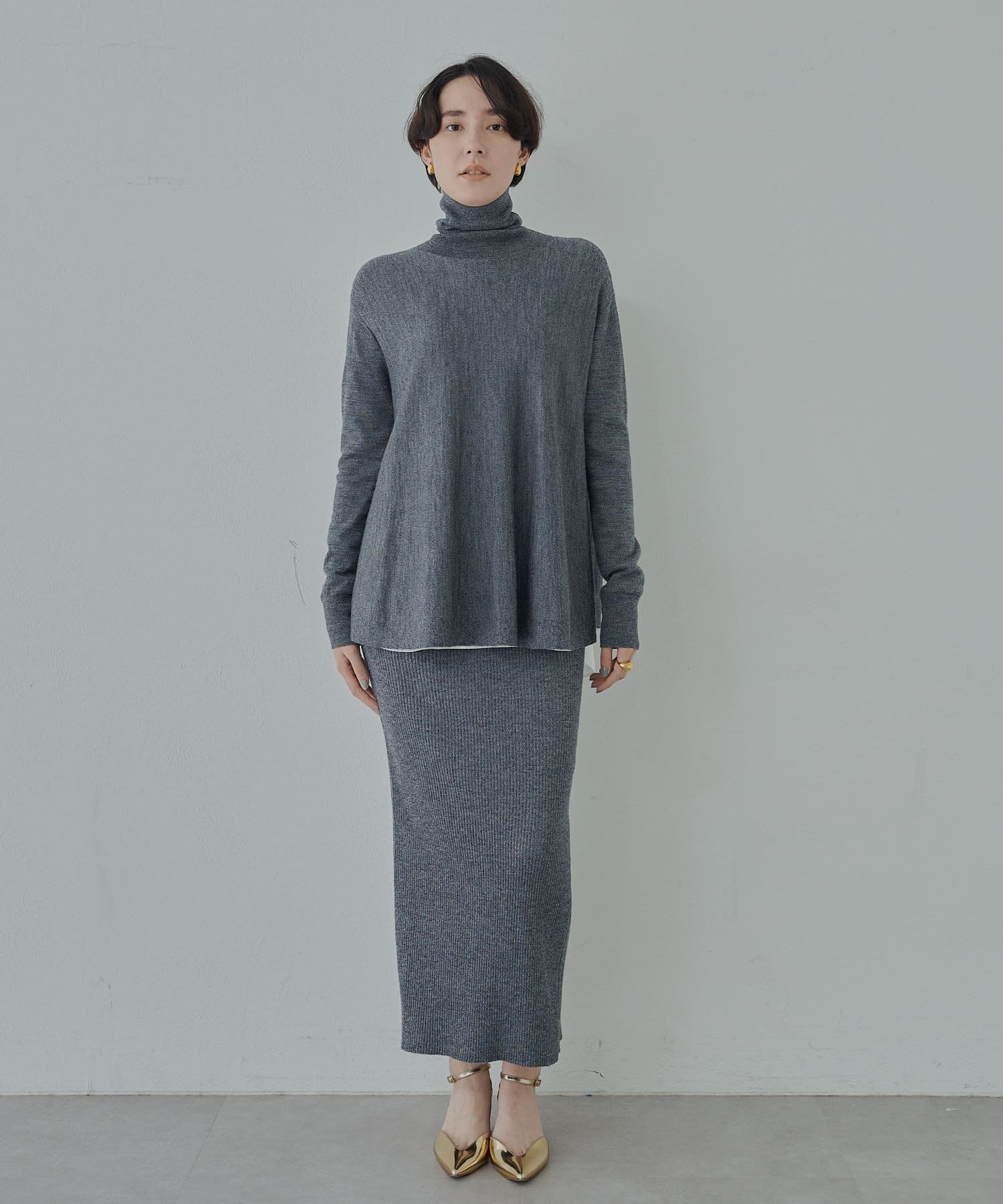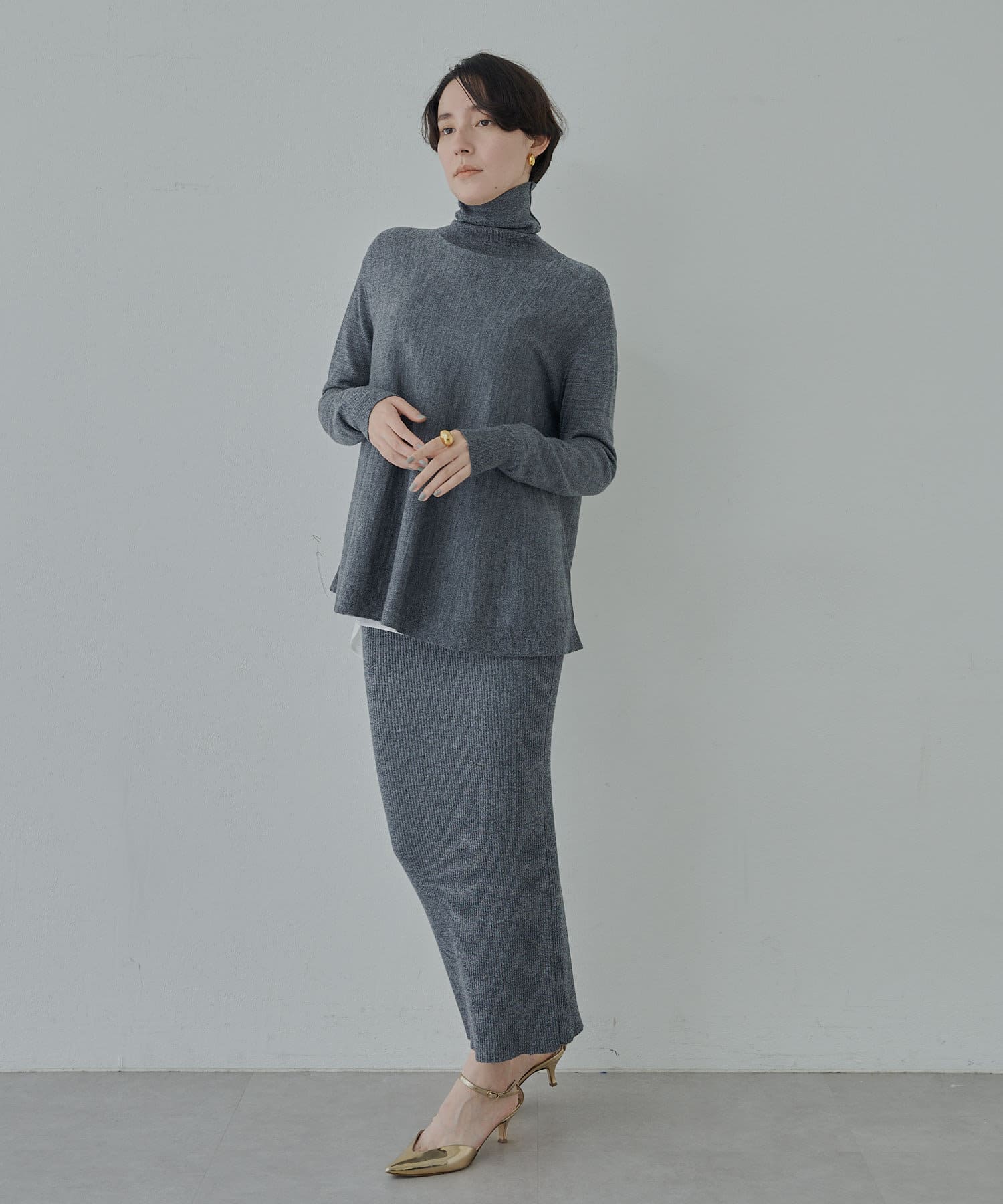 綺麗なタイトシルエットで細見え効果も◎。タートル裾ラウンドニットと同じ素材感なのでセットアップとしての着用もたのしめます。