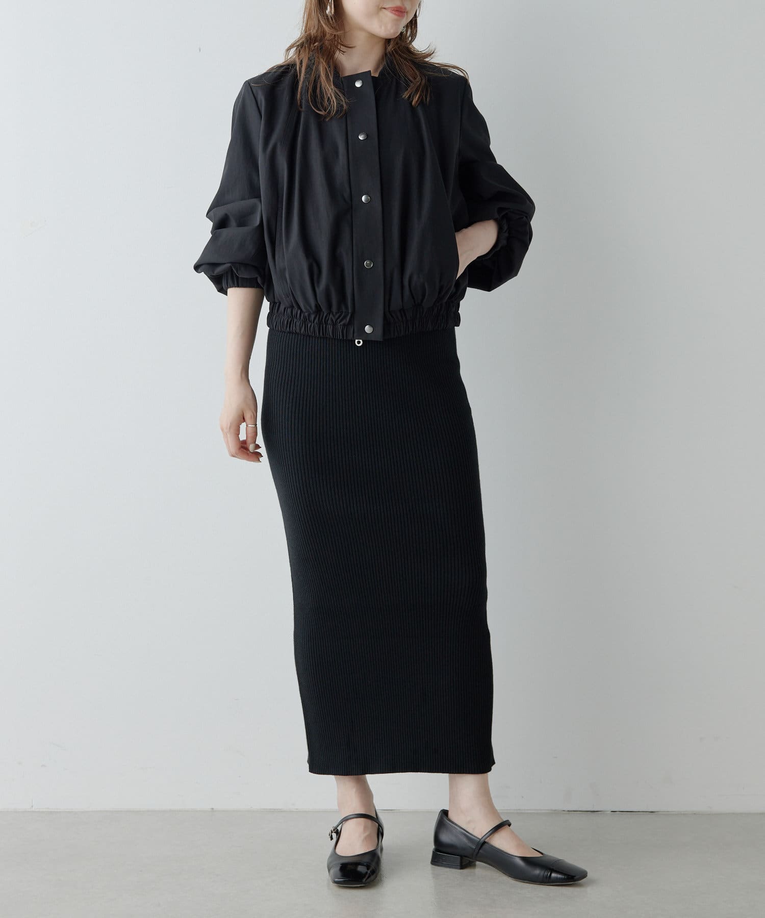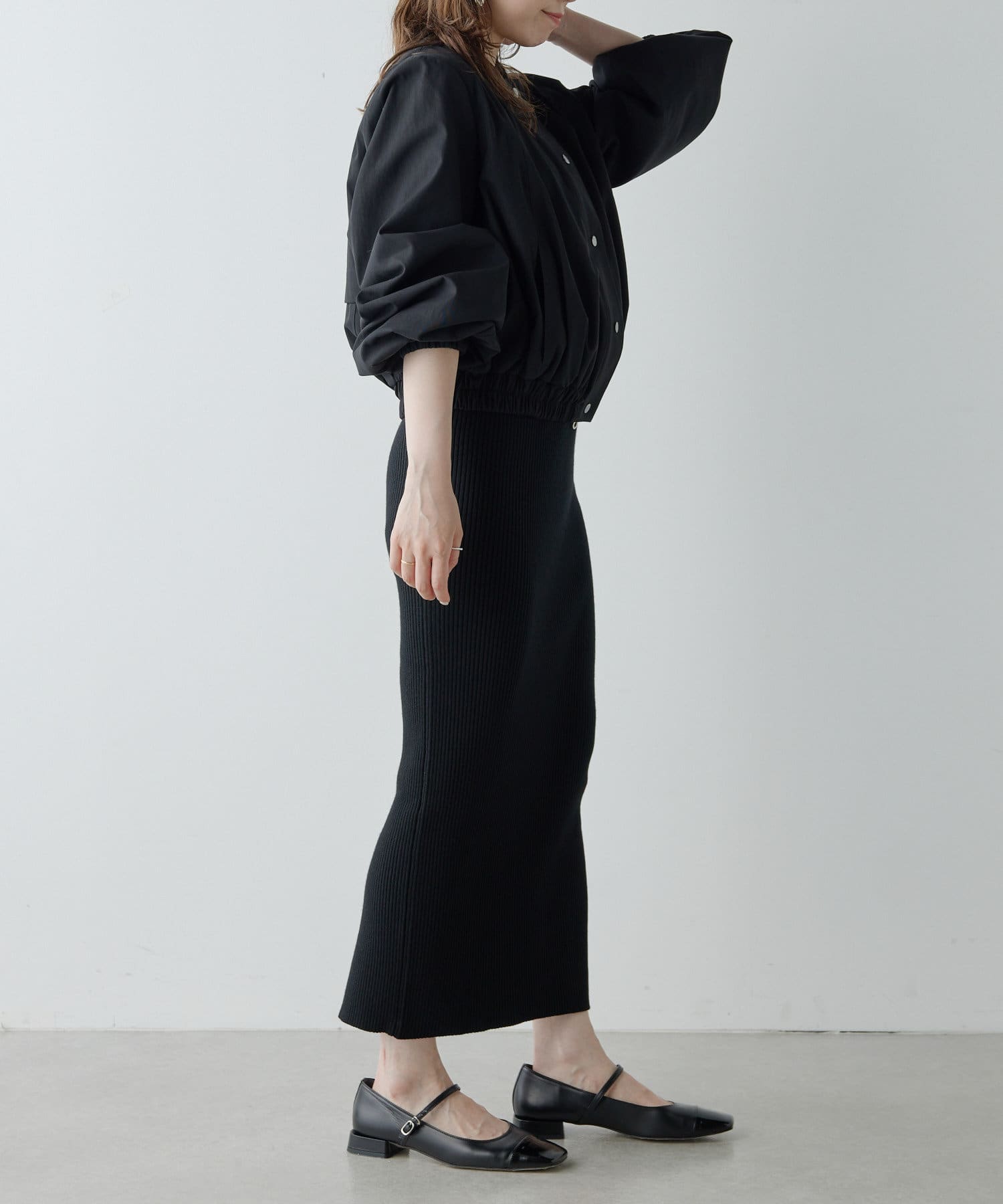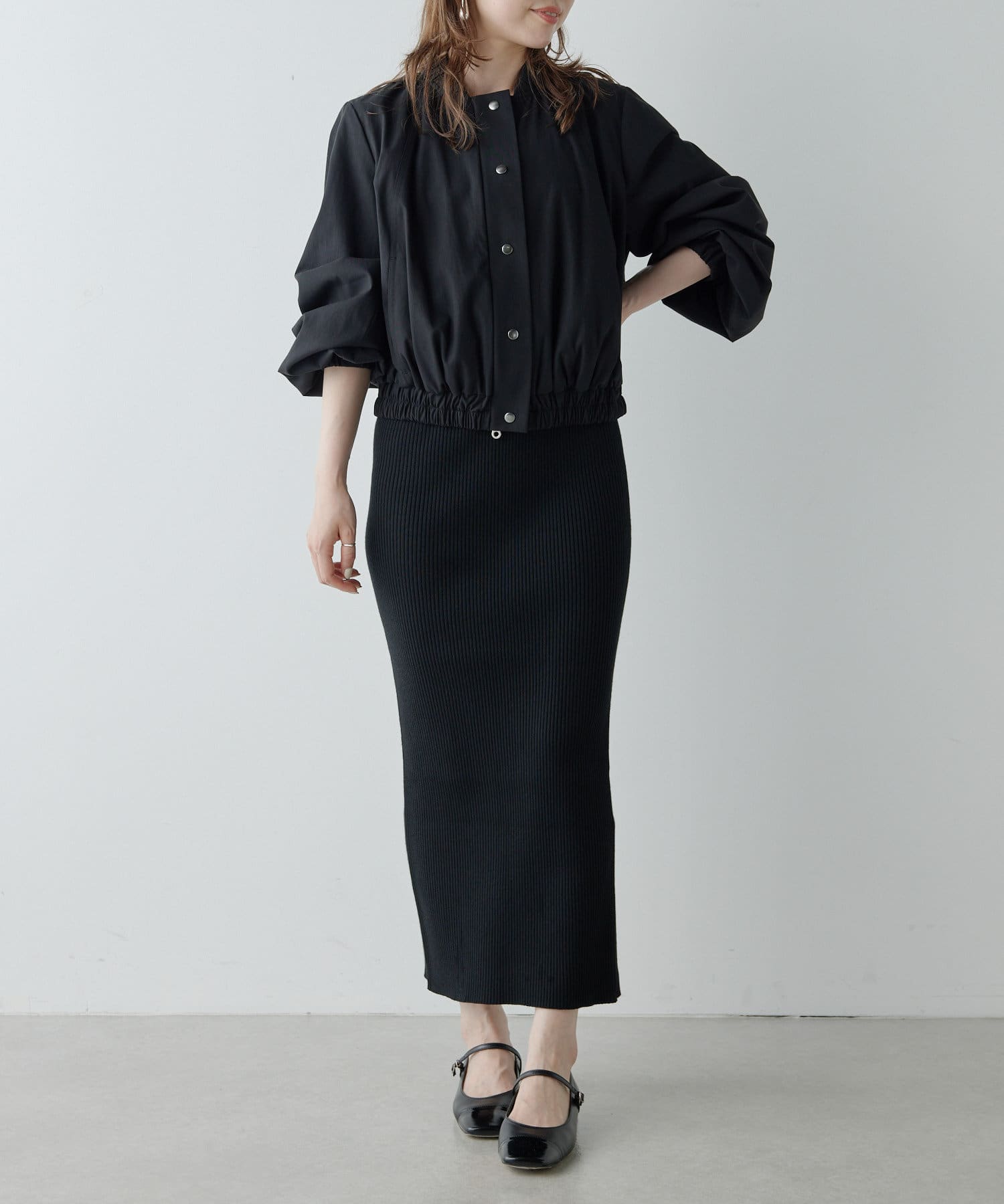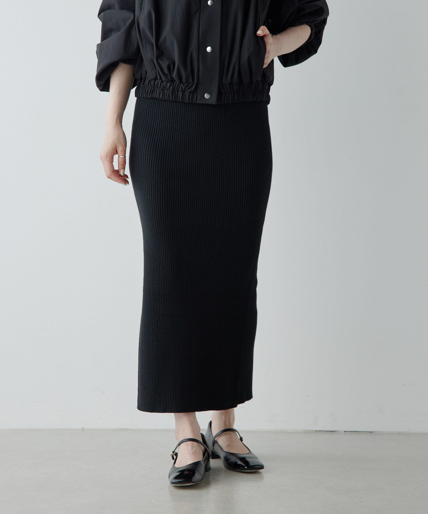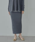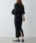 綺麗なタイトシルエットで細見え効果も◎。タートル裾ラウンドニットと同じ素材感なのでセットアップとしての着用もたのしめます。