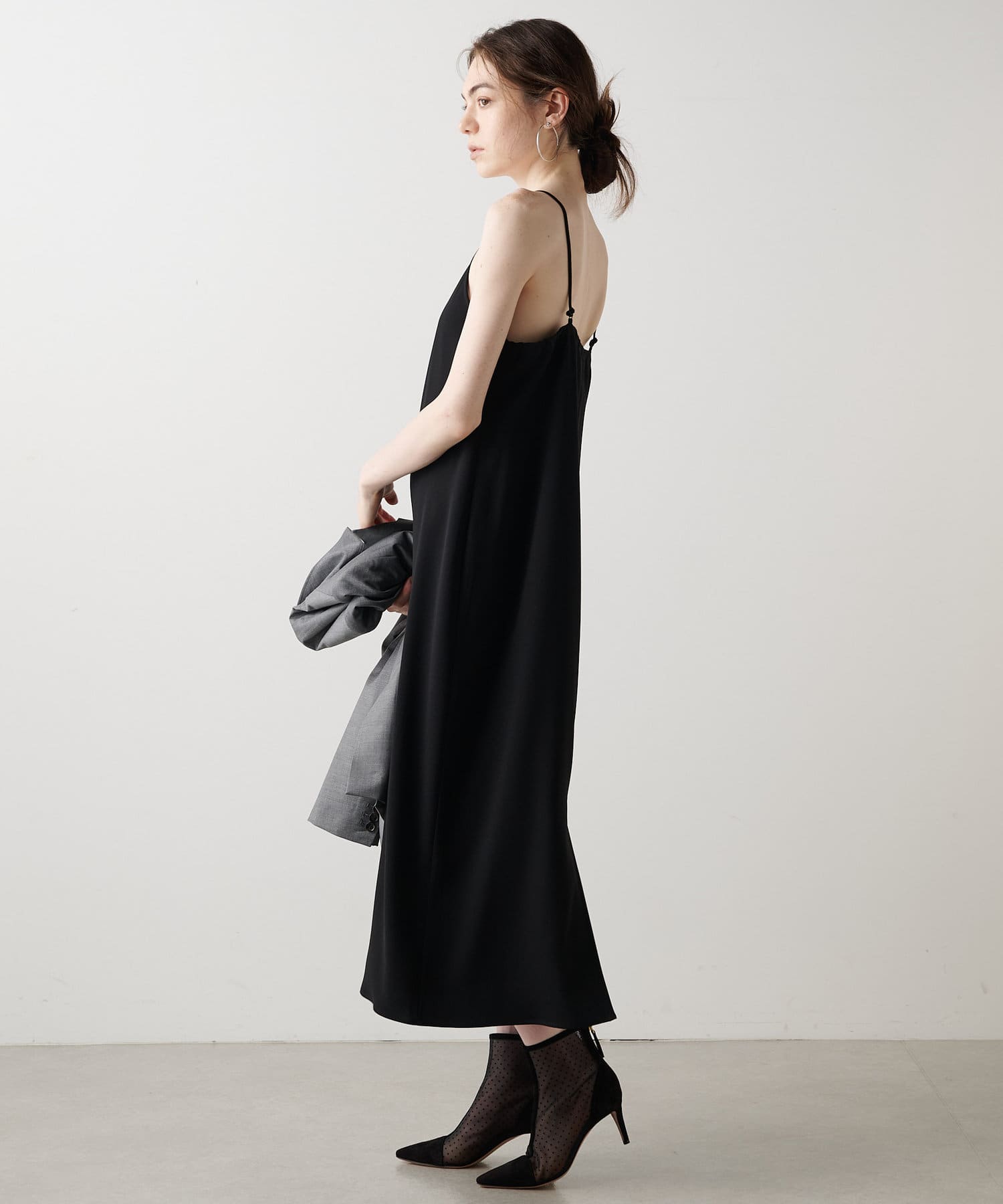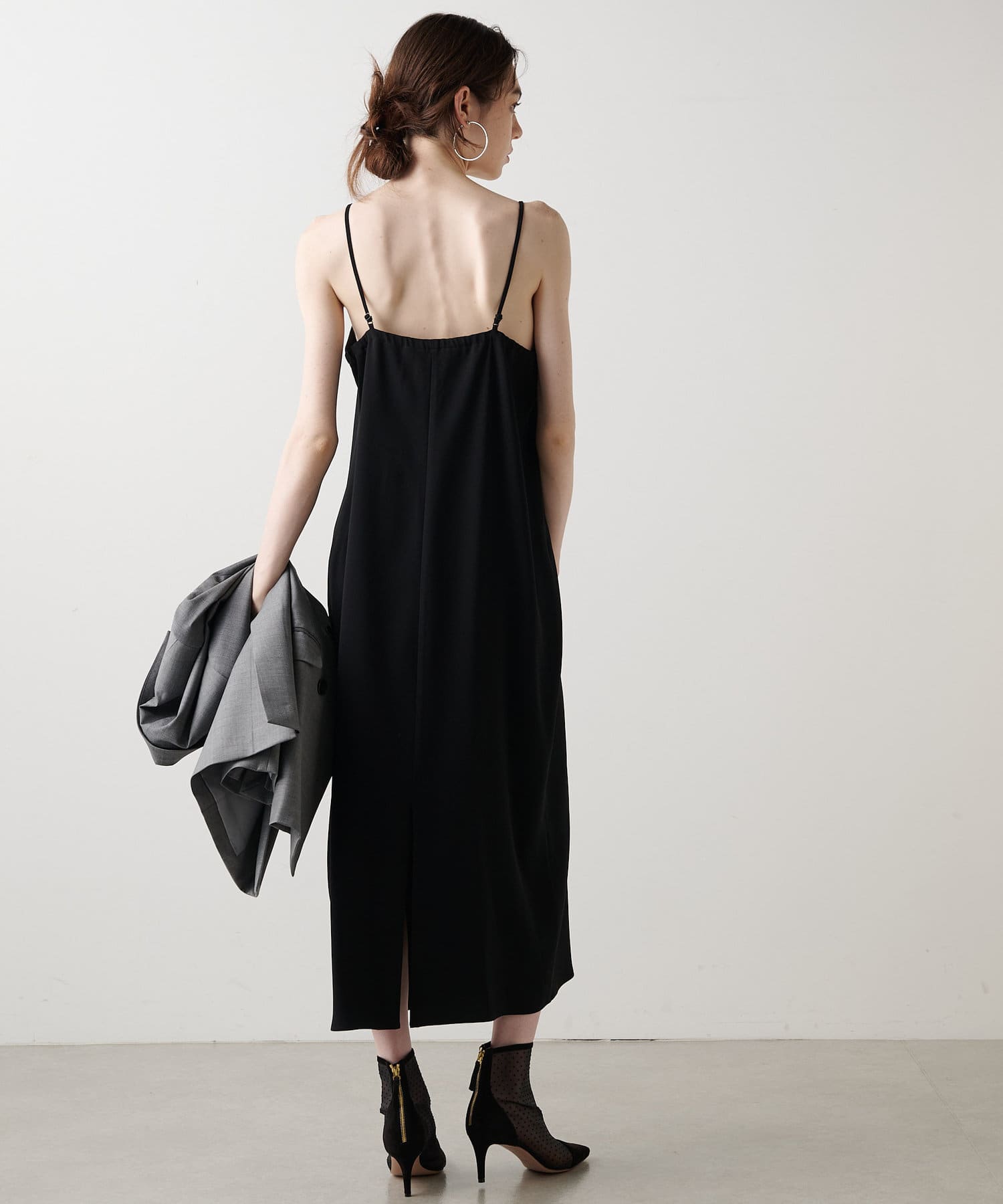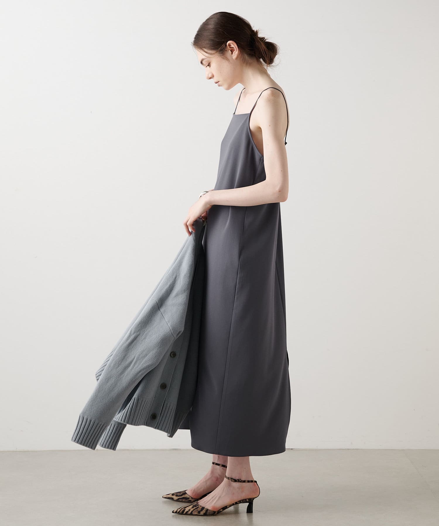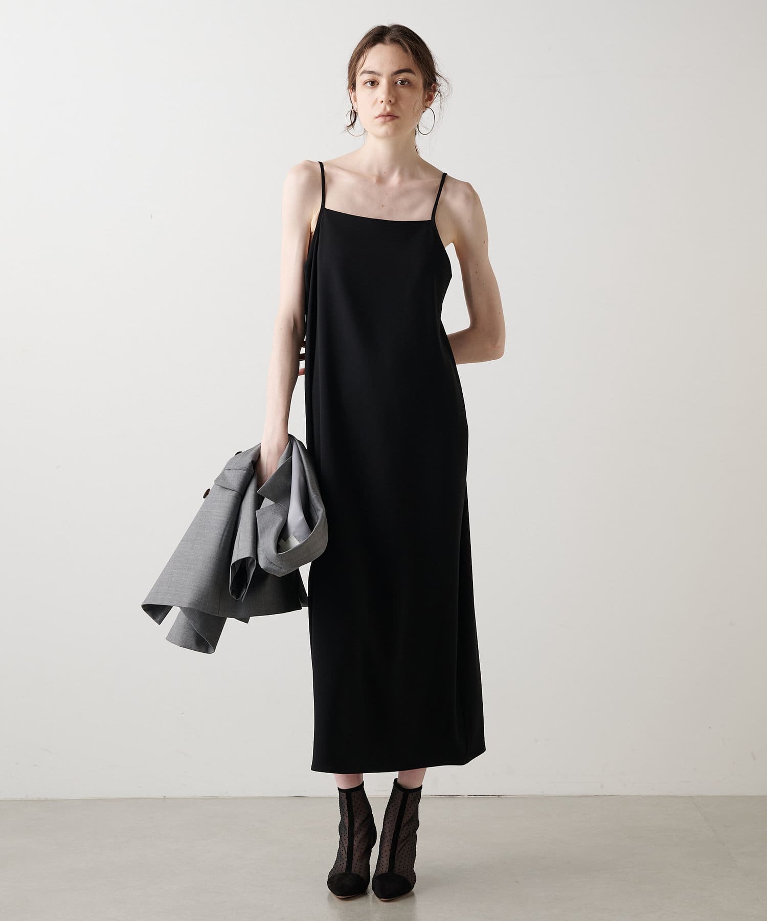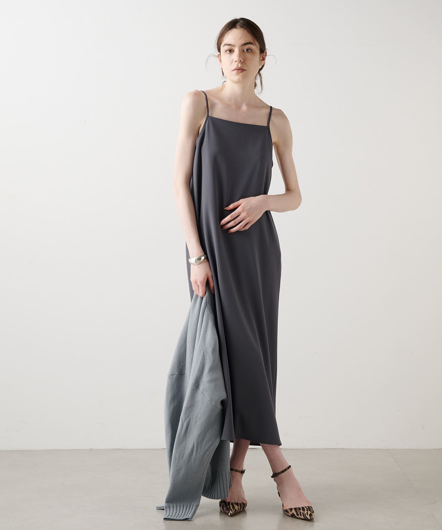 ミニマルで万能に使えるキャミソールワンピース。肩紐の長さが調節出来るので、胸元も開きすぎず様々なインナーやアウターを合わせて着られます。