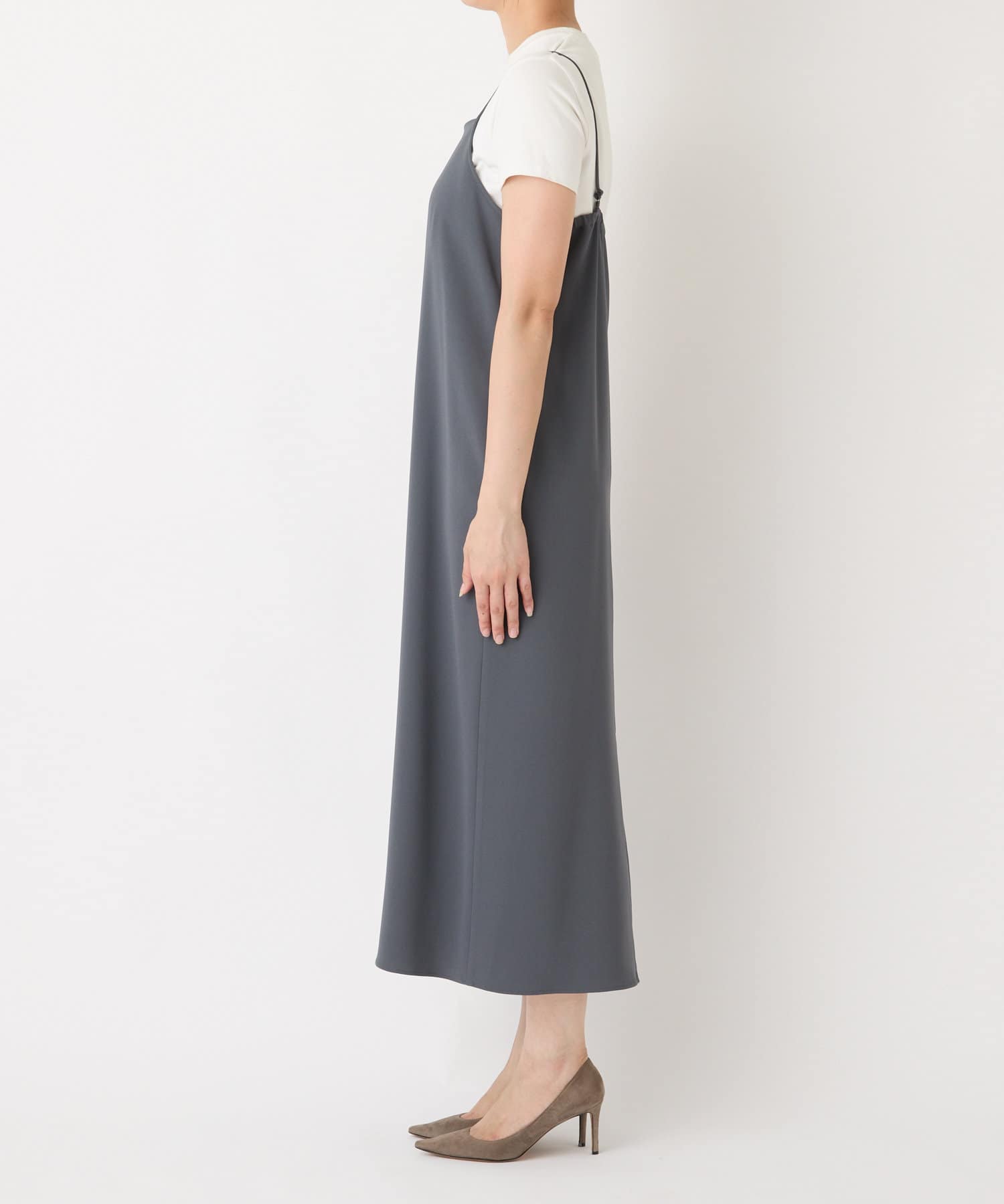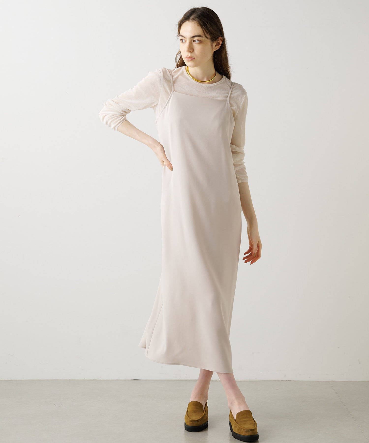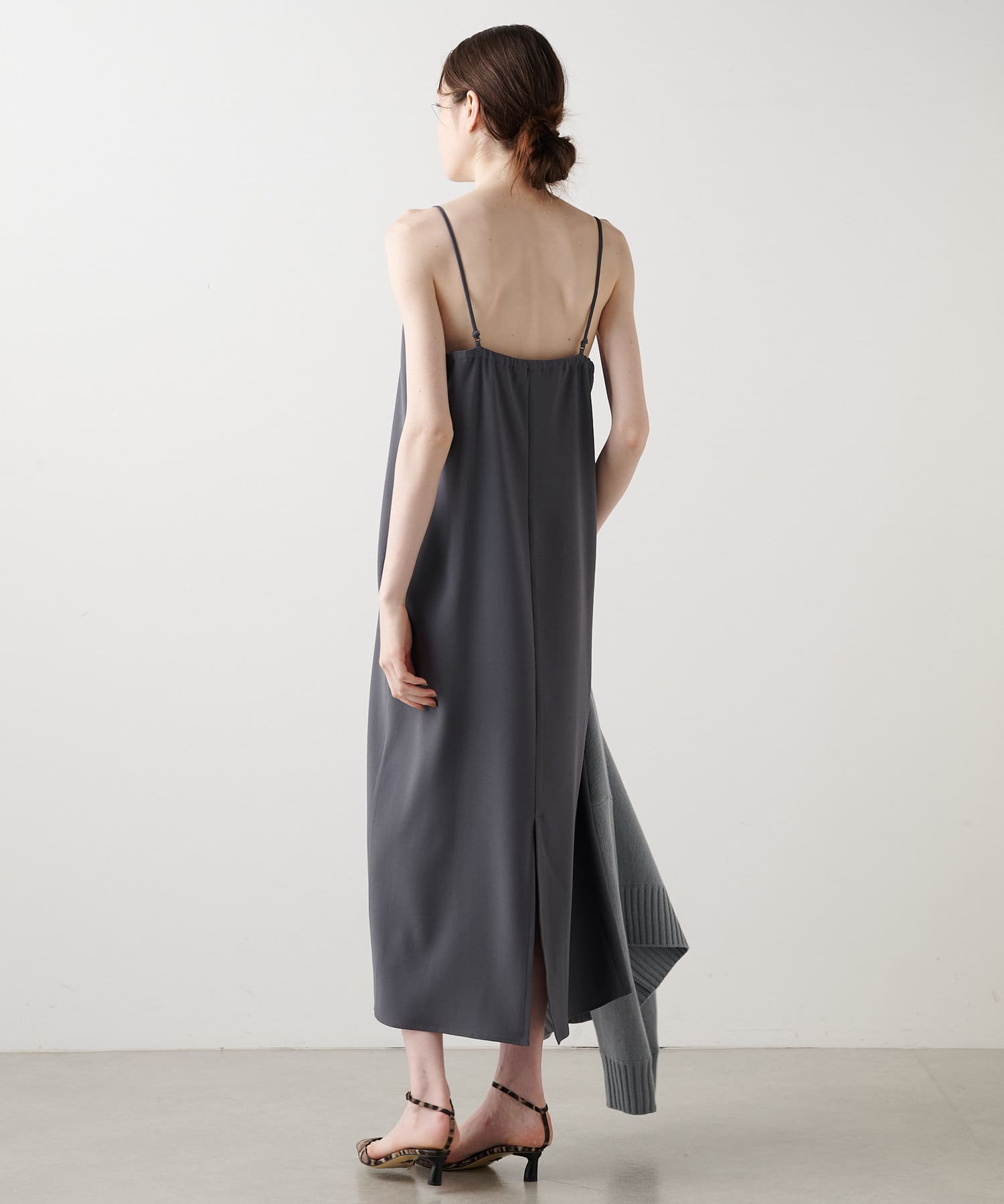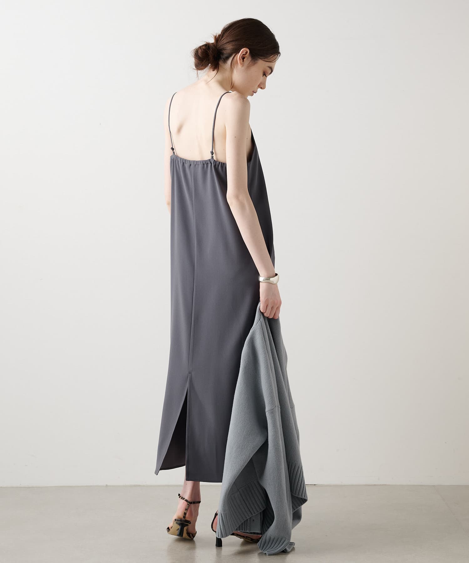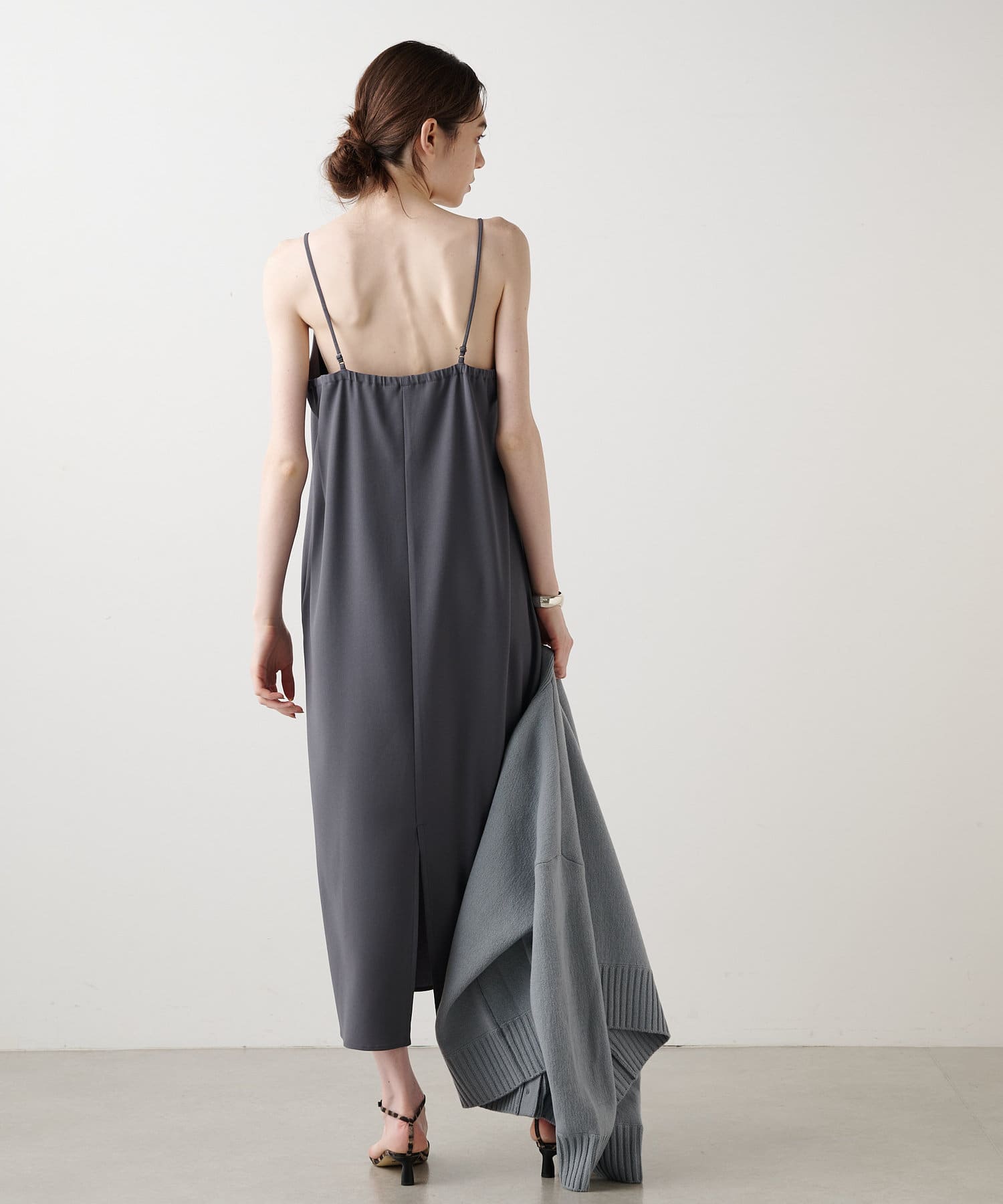 ミニマルで万能に使えるキャミソールワンピース。肩紐の長さが調節出来るので、胸元も開きすぎず様々なインナーやアウターを合わせて着られます。