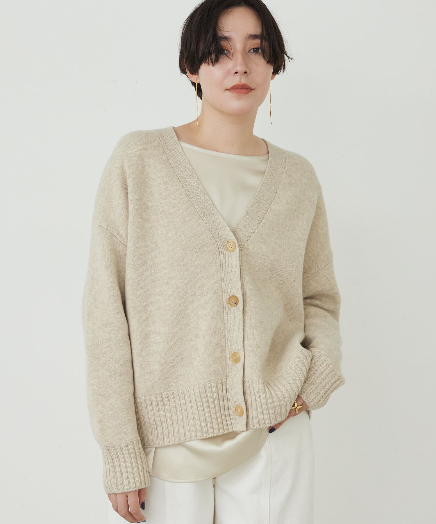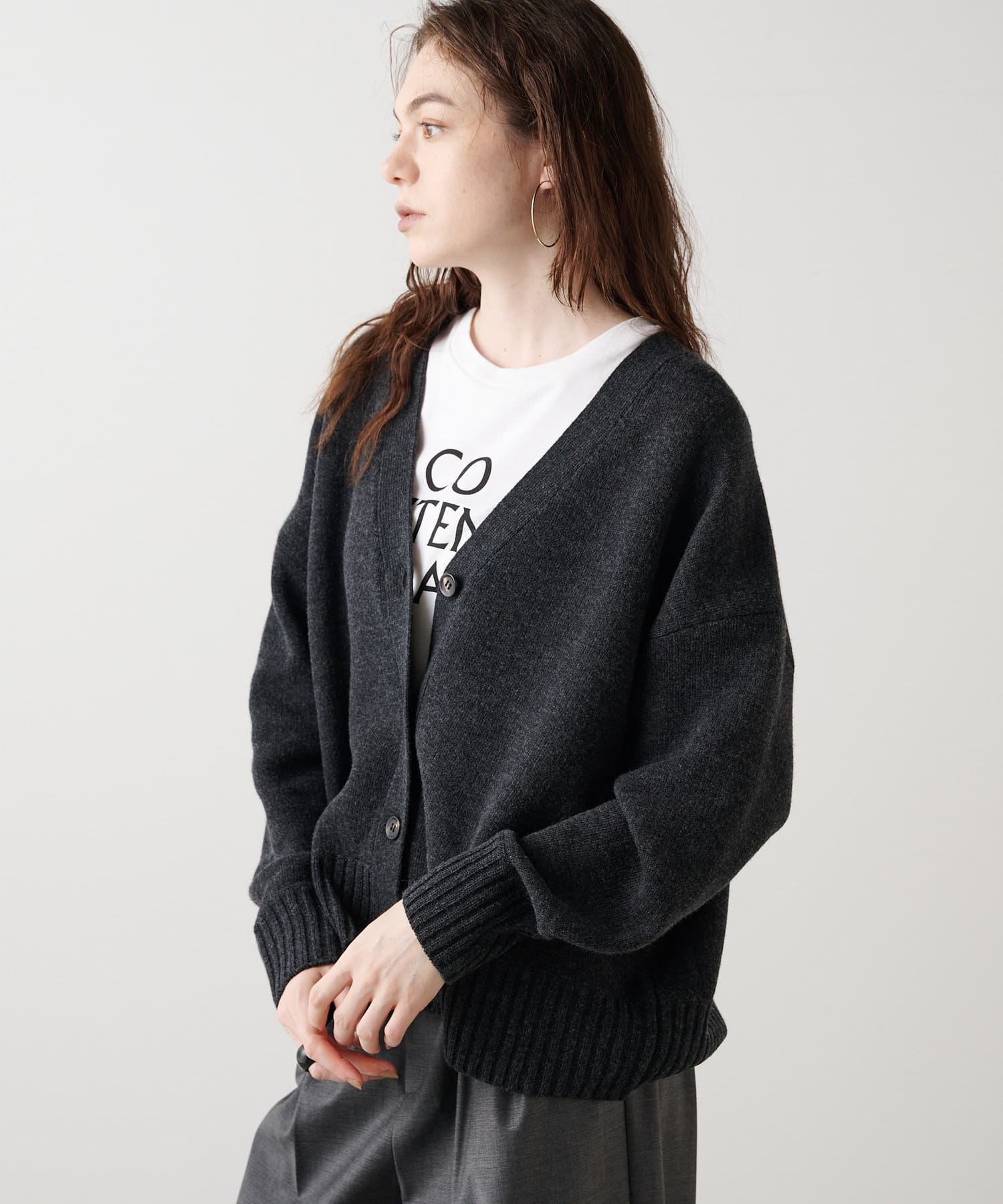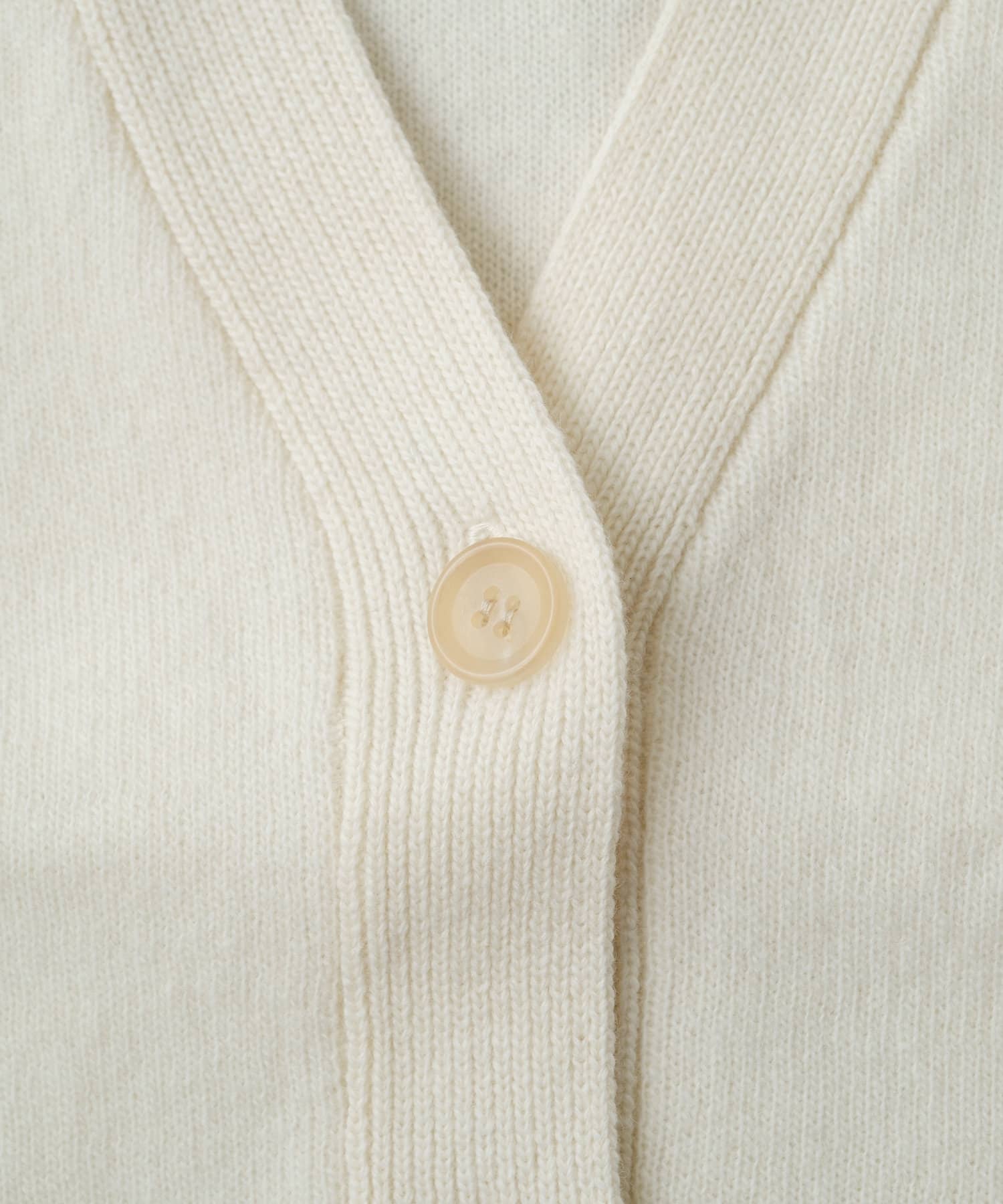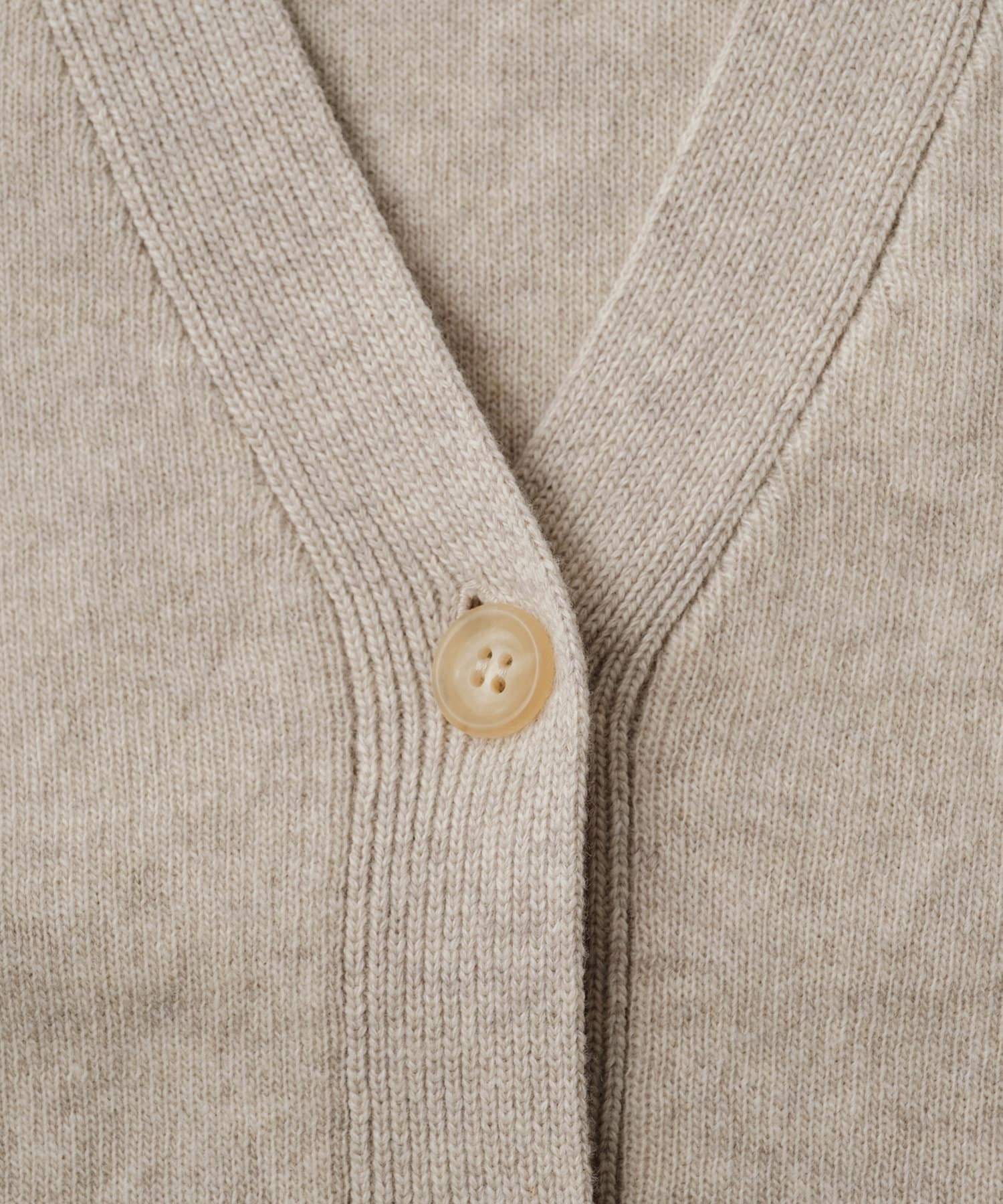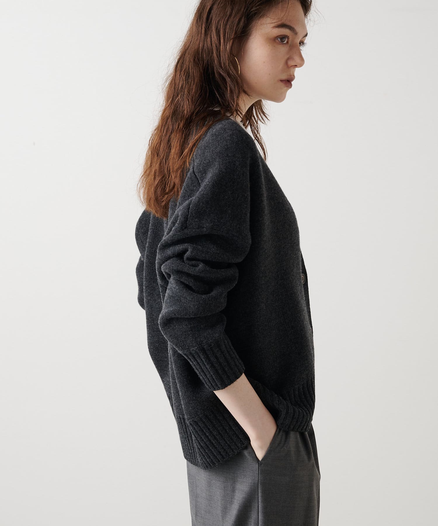 生地に程よく厚みがあり、ふんわり暖かいのが特徴です。ちょうど良い着丈と、肩の落ち感、袖と裾のリブ、同系色のボタンなど、シンプルだけど、こだわりの見られるカーディガンです。