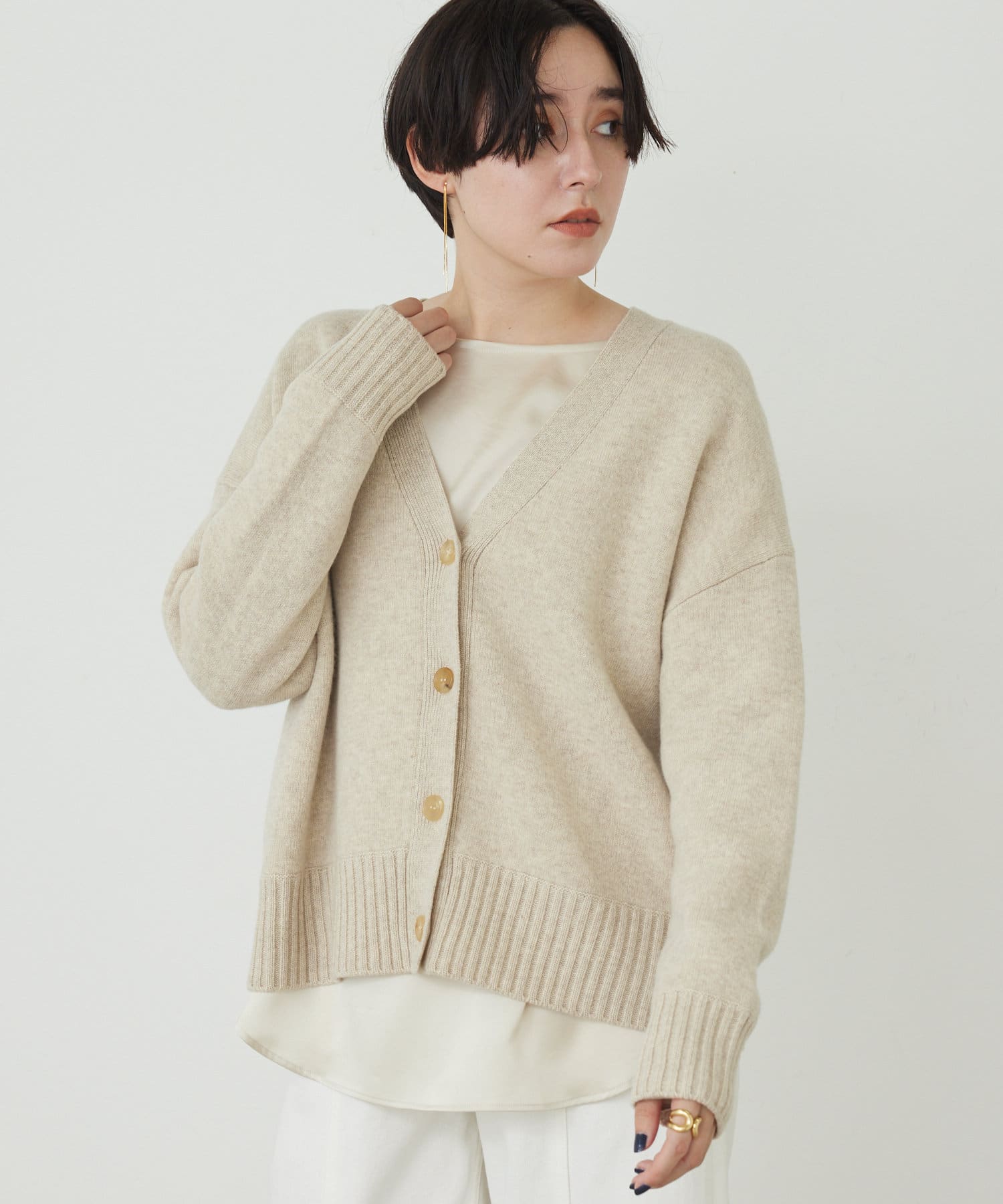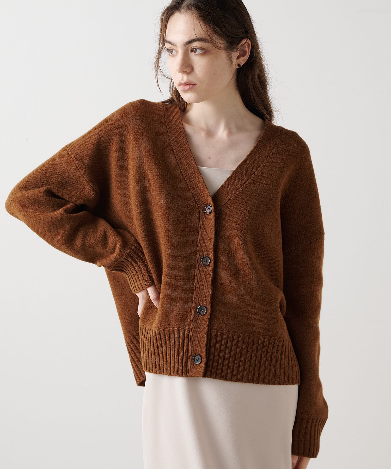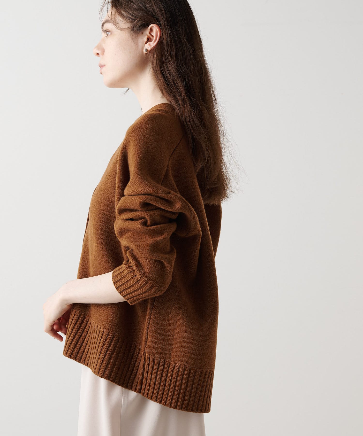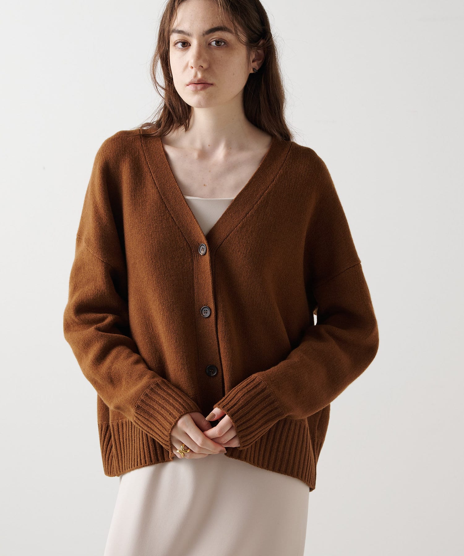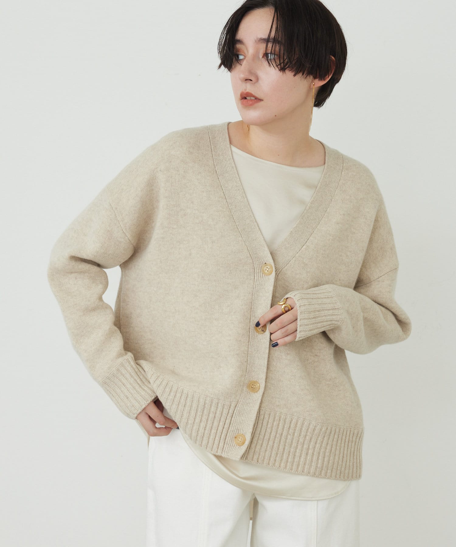 生地に程よく厚みがあり、ふんわり暖かいのが特徴です。ちょうど良い着丈と、肩の落ち感、袖と裾のリブ、同系色のボタンなど、シンプルだけど、こだわりの見られるカーディガンです。