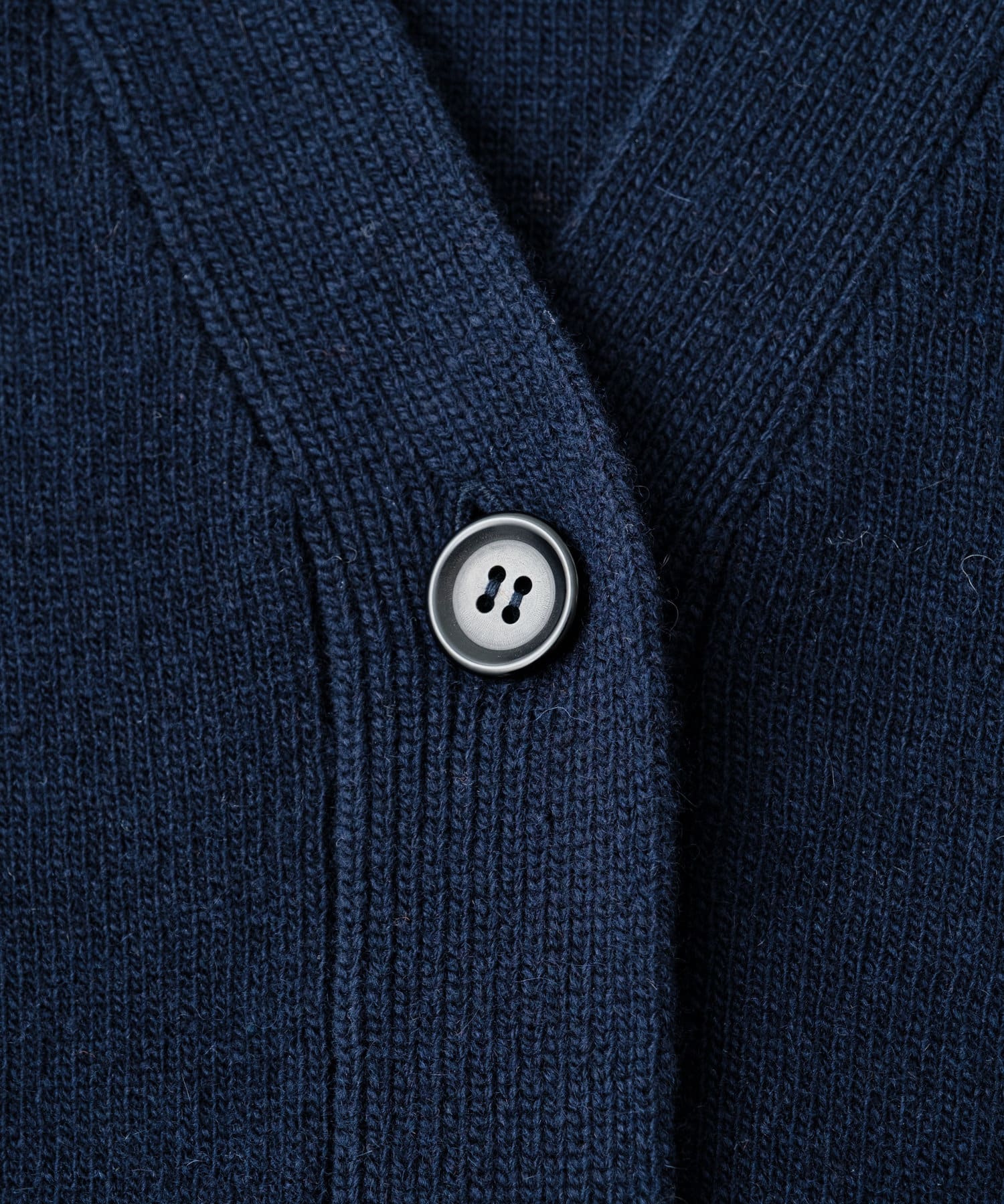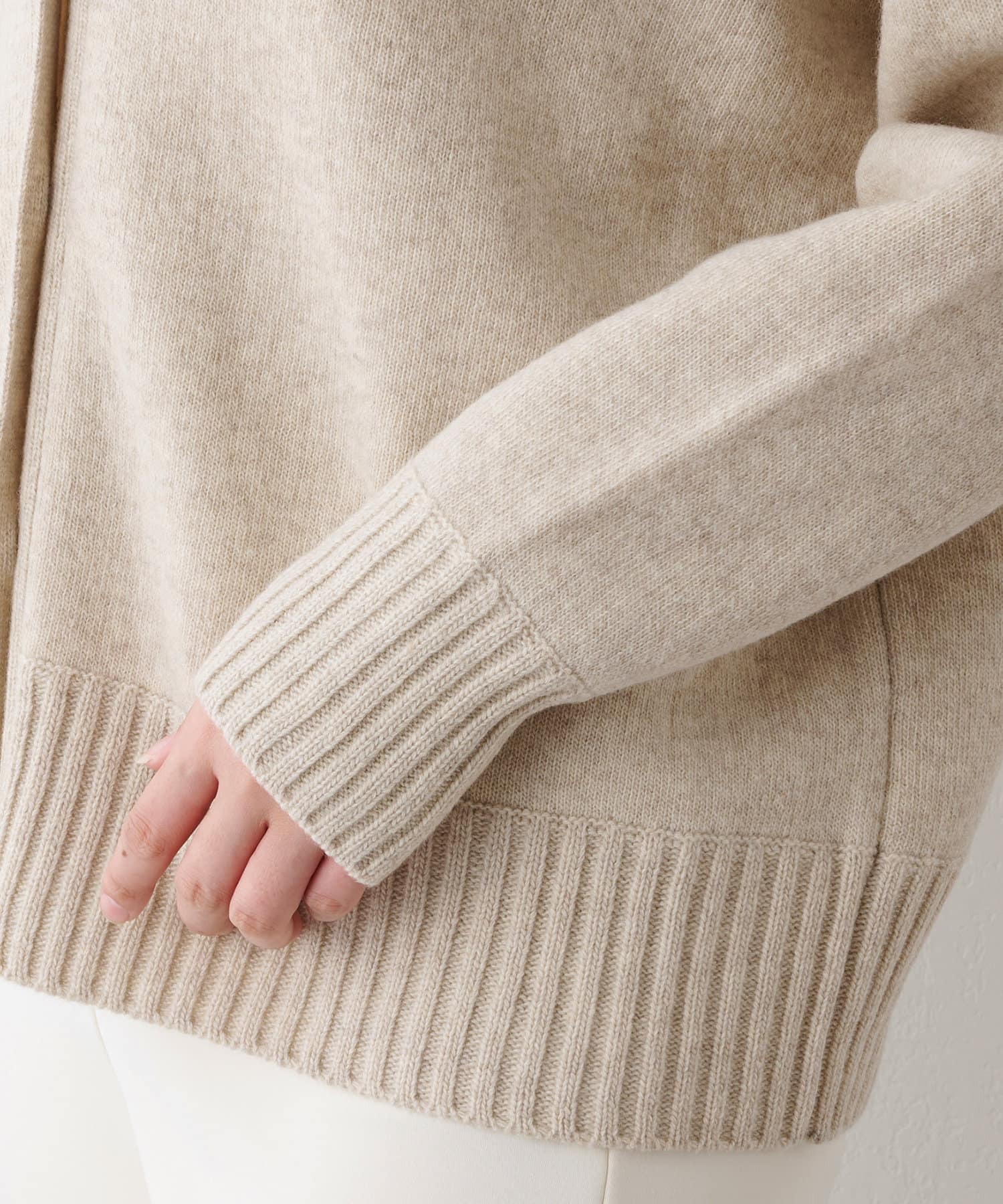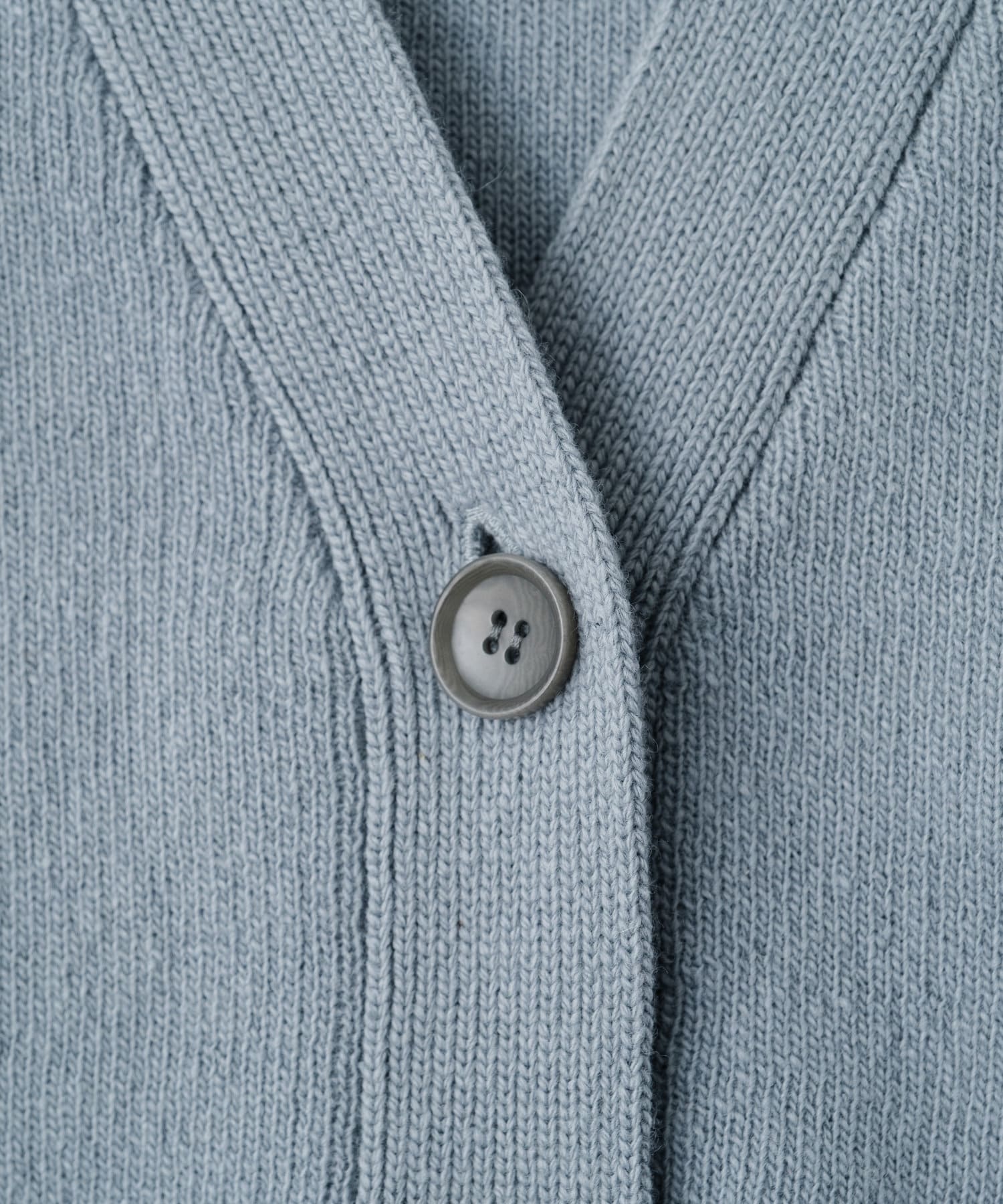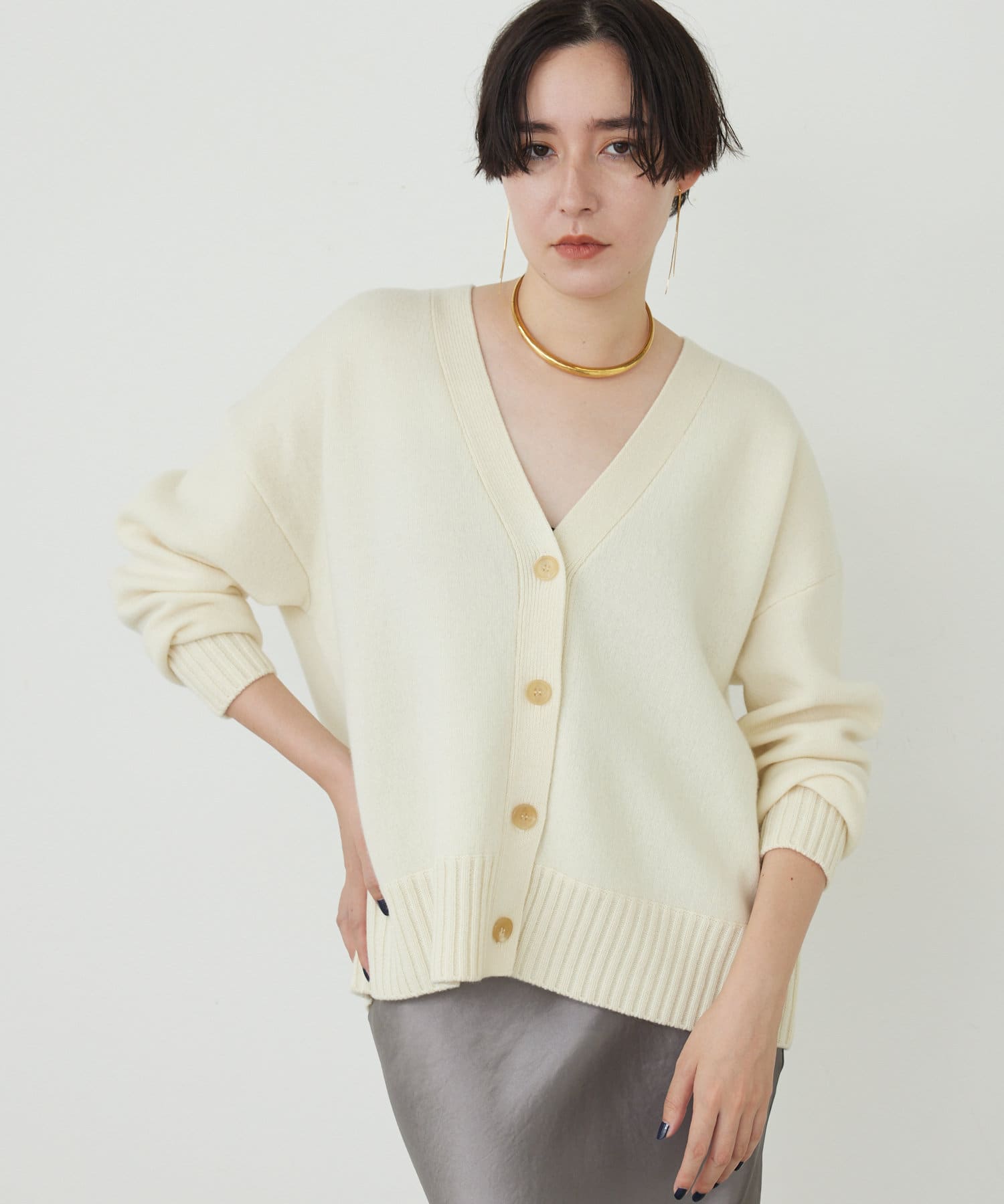 生地に程よく厚みがあり、ふんわり暖かいのが特徴です。ちょうど良い着丈と、肩の落ち感、袖と裾のリブ、同系色のボタンなど、シンプルだけど、こだわりの見られるカーディガンです。