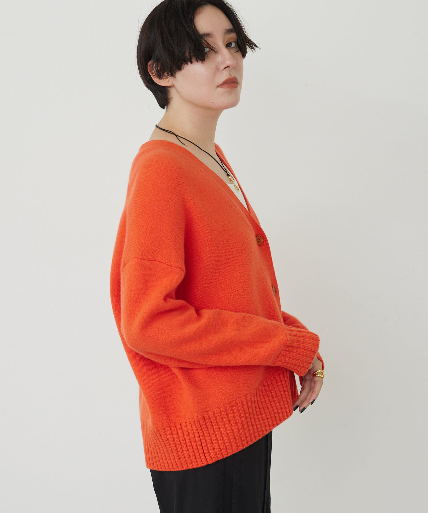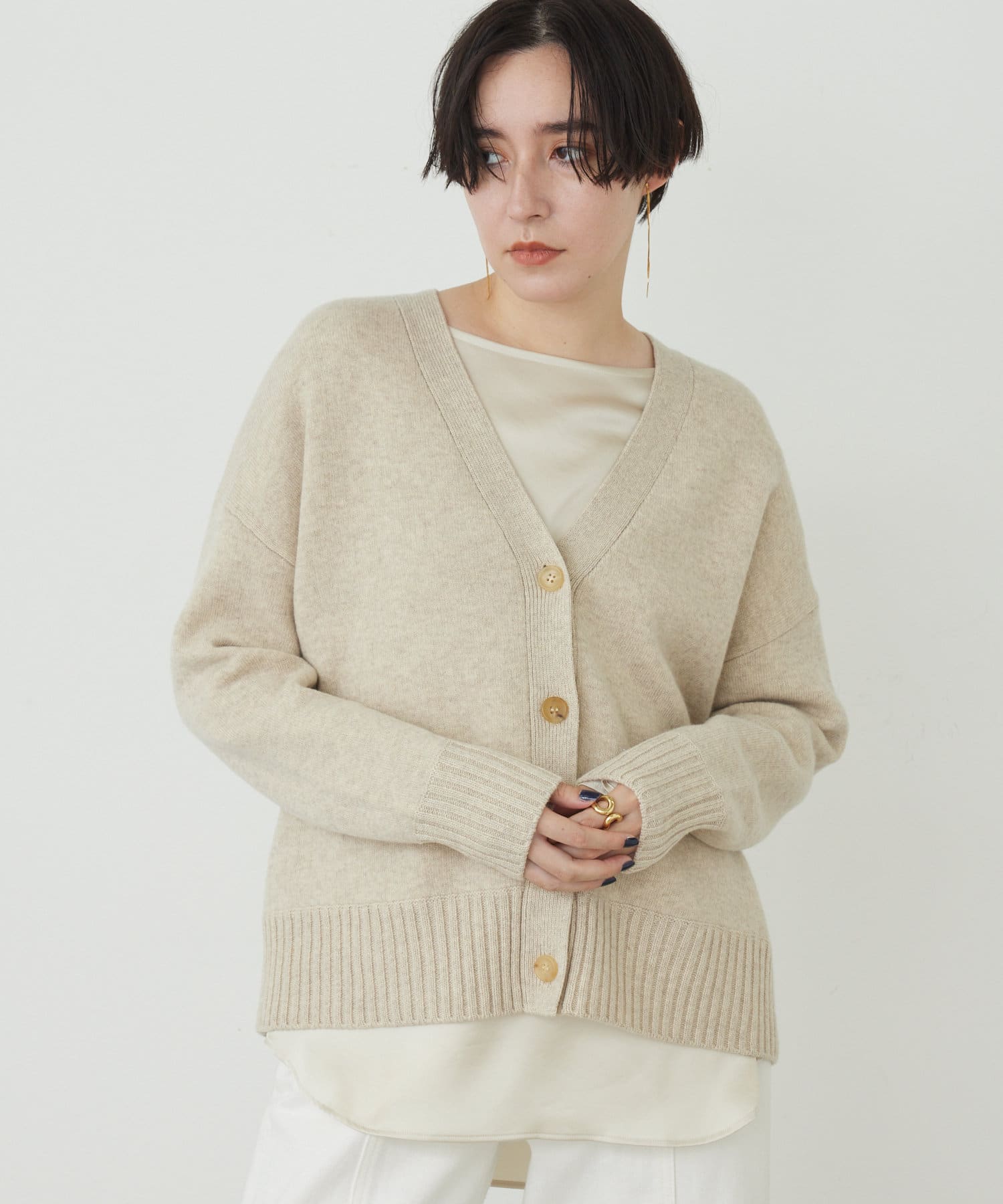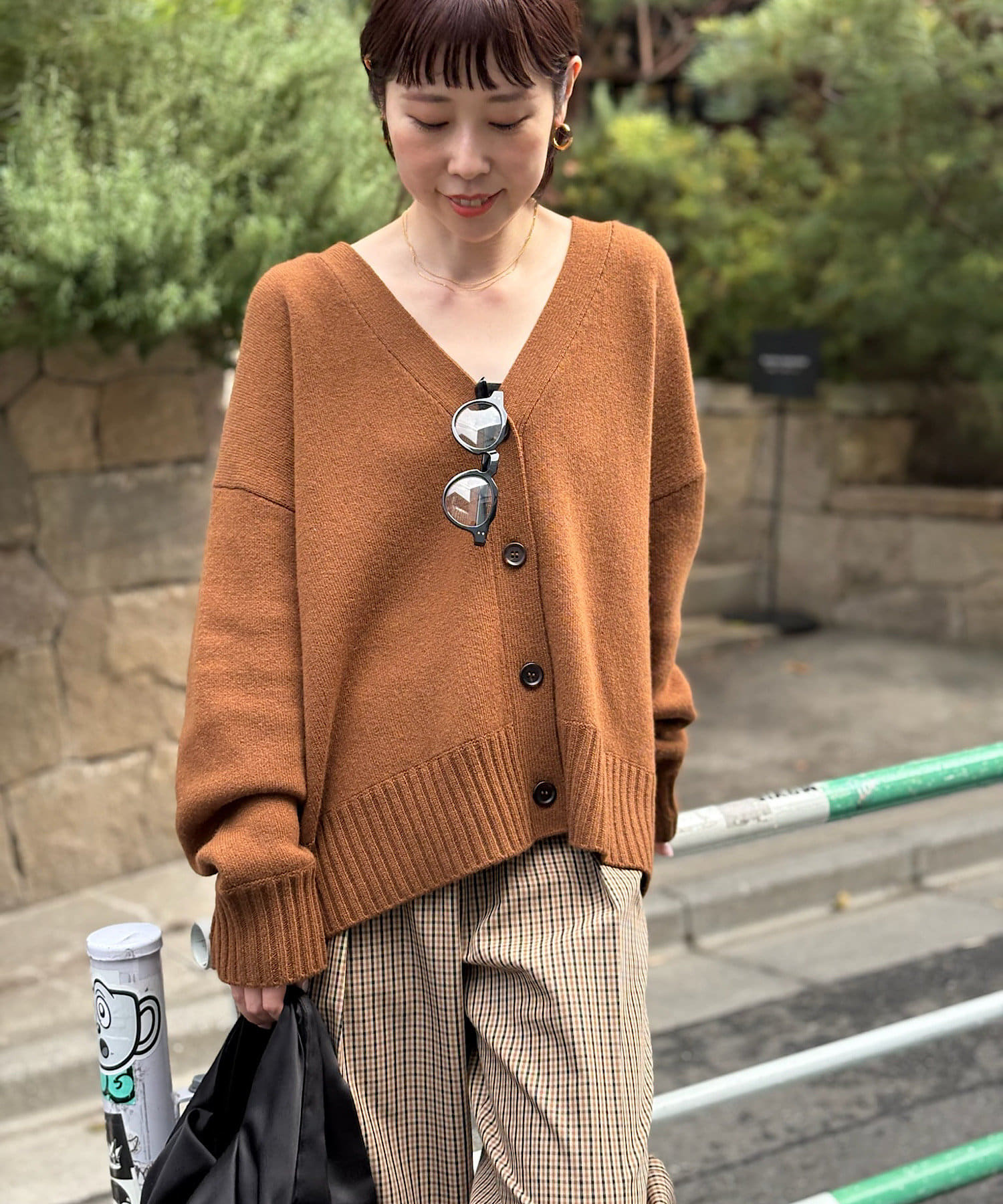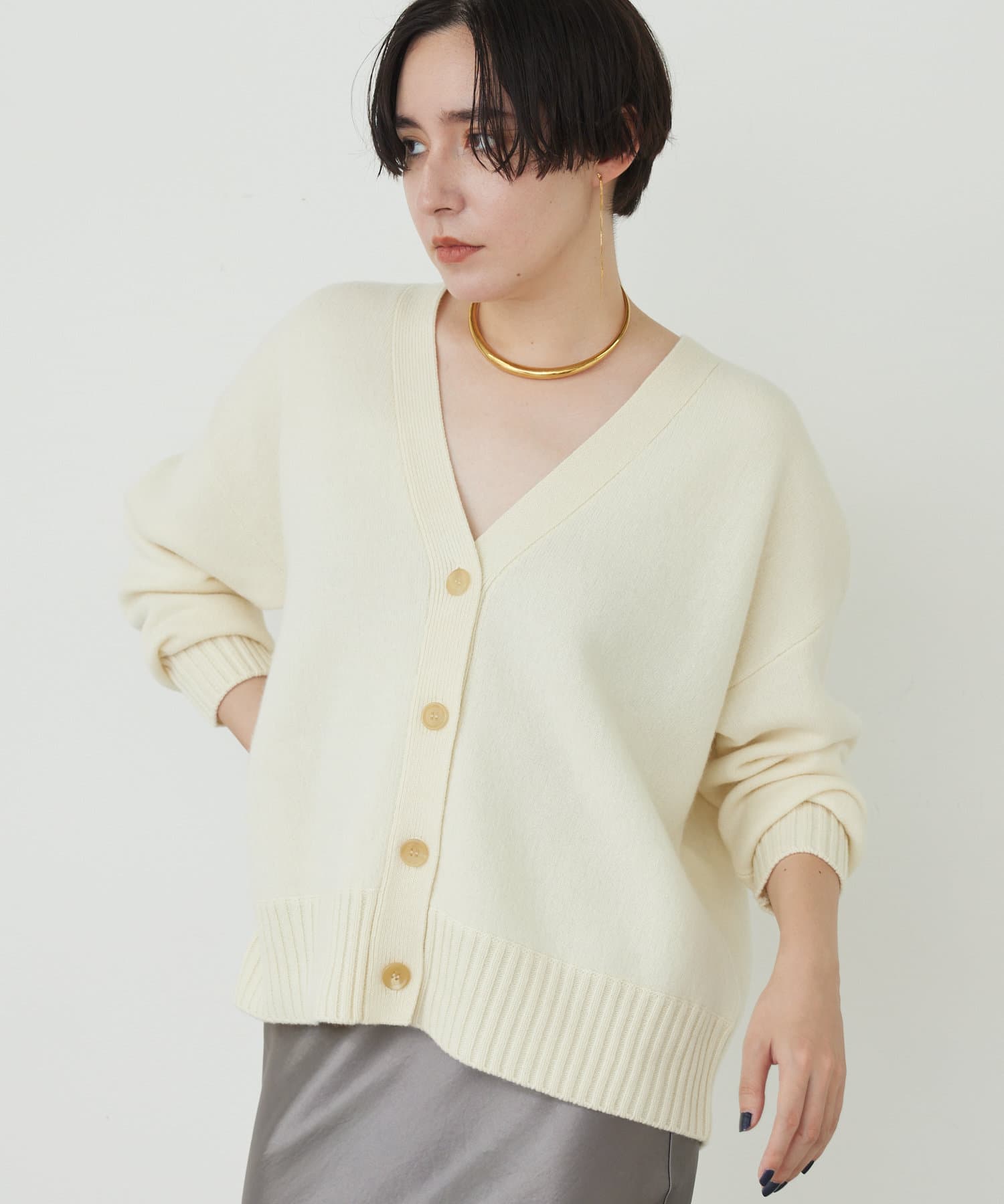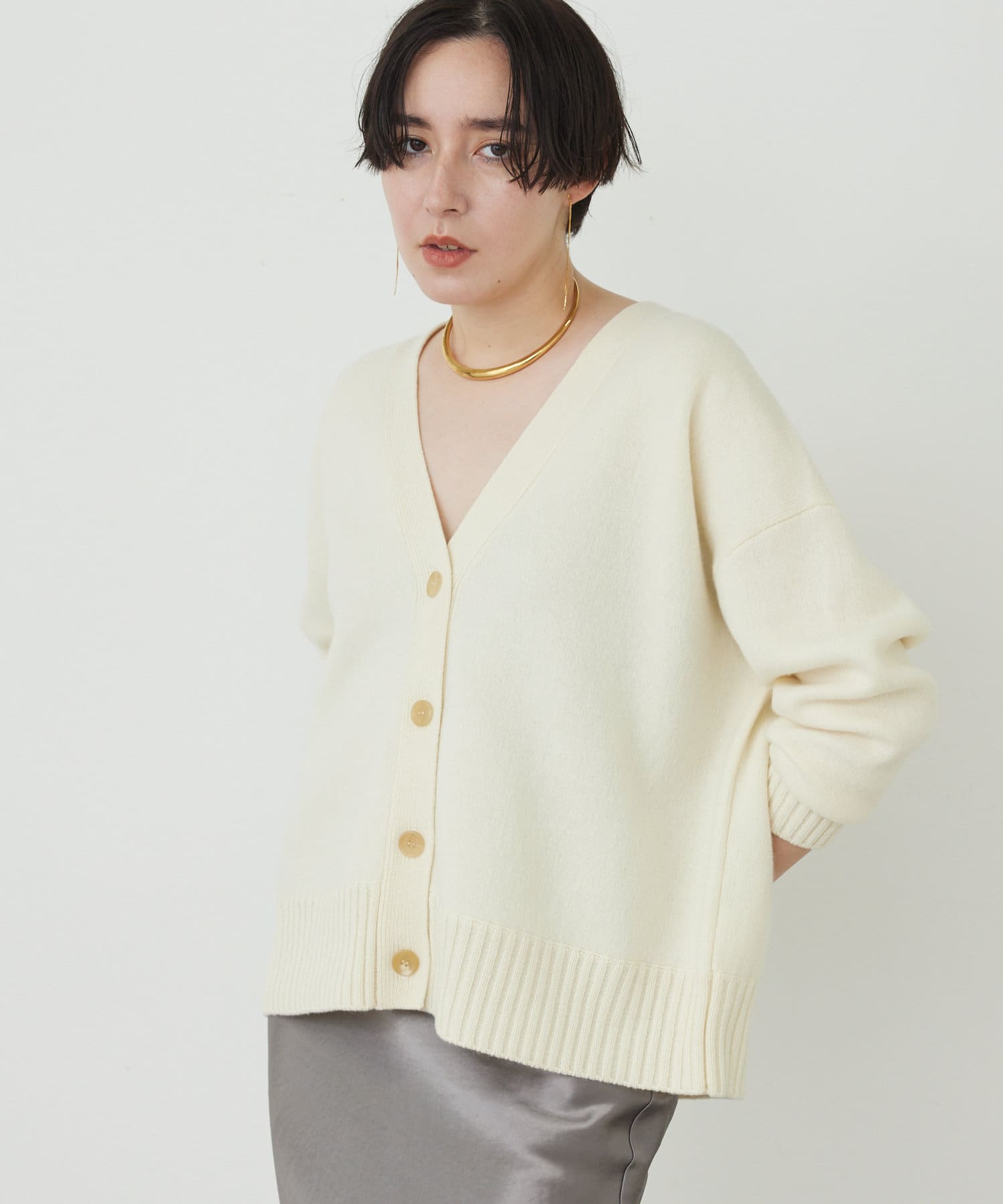 生地に程よく厚みがあり、ふんわり暖かいのが特徴です。ちょうど良い着丈と、肩の落ち感、袖と裾のリブ、同系色のボタンなど、シンプルだけど、こだわりの見られるカーディガンです。