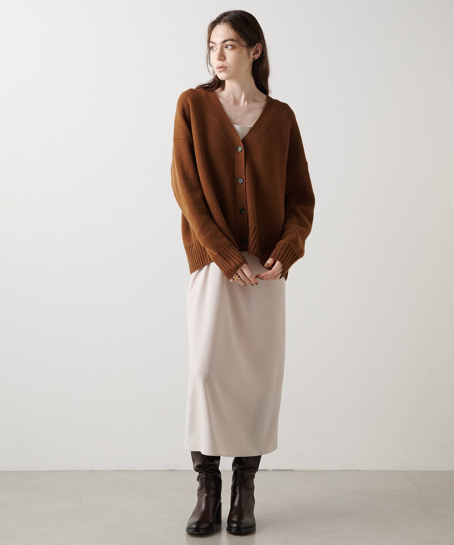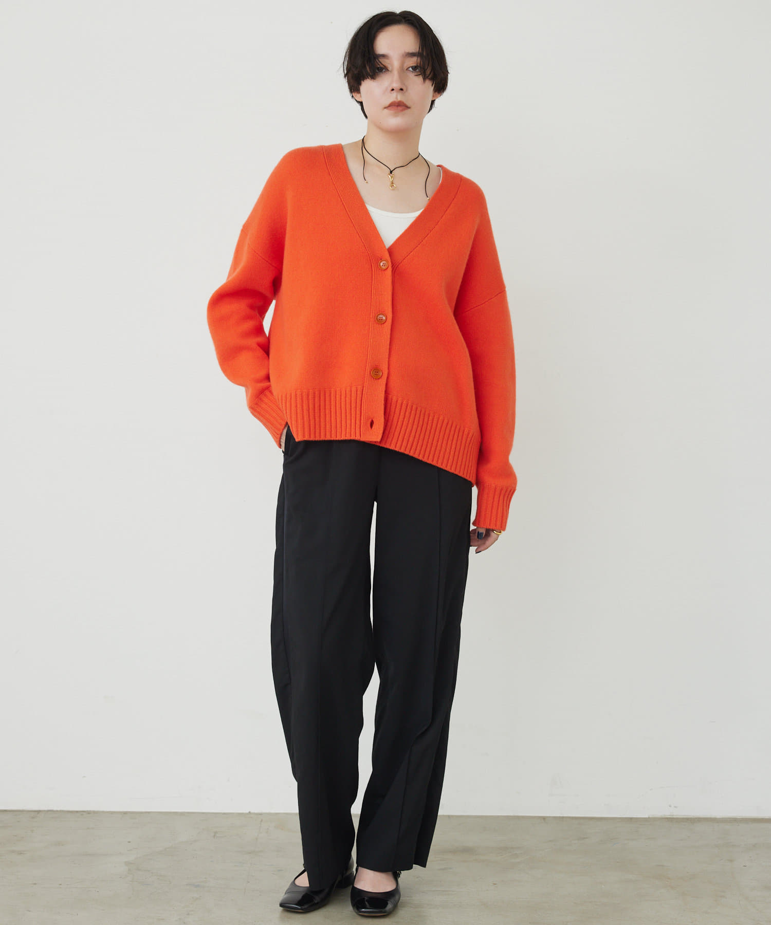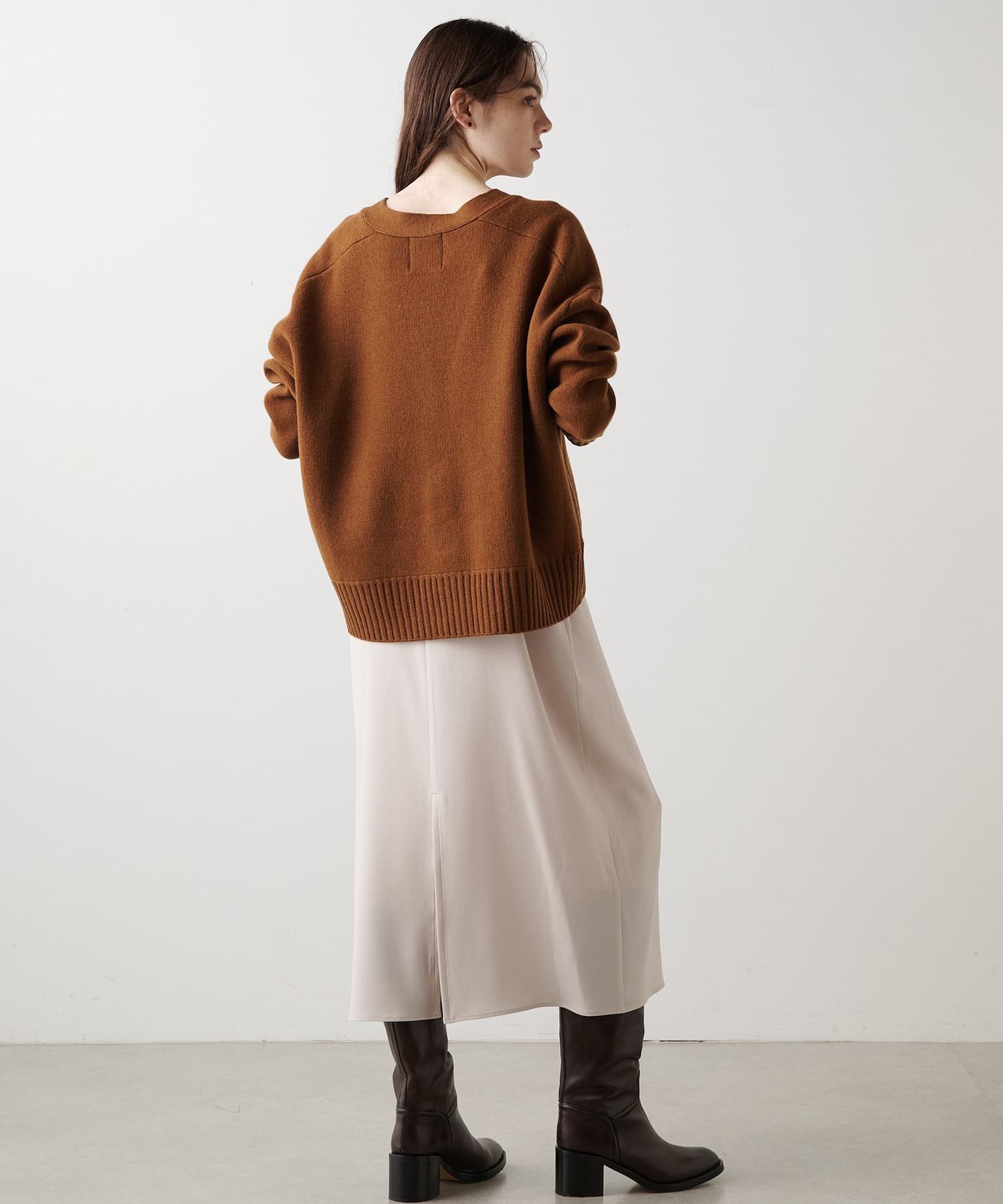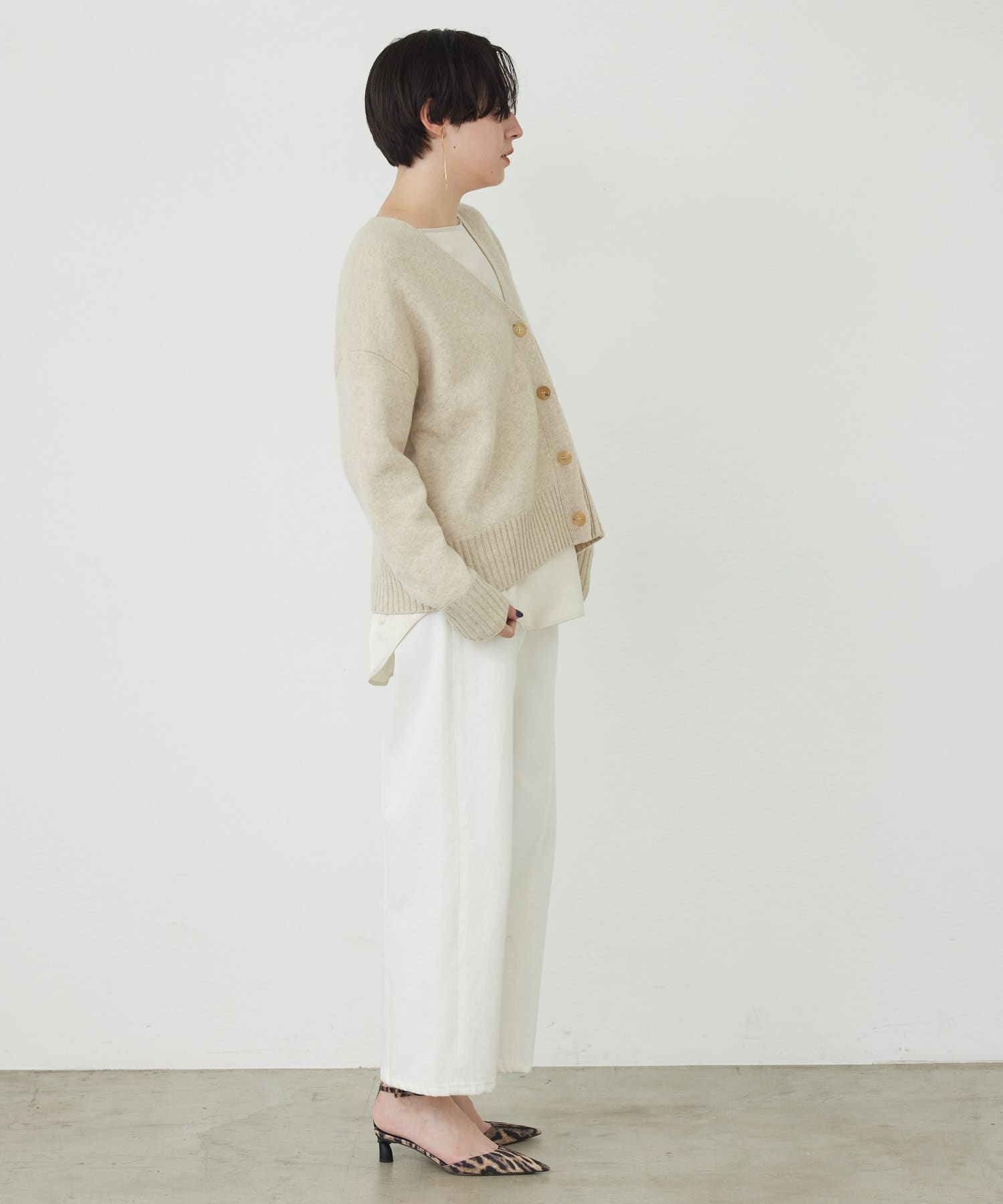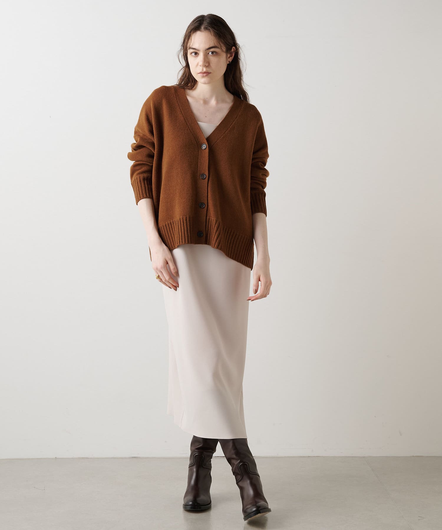 生地に程よく厚みがあり、ふんわり暖かいのが特徴です。ちょうど良い着丈と、肩の落ち感、袖と裾のリブ、同系色のボタンなど、シンプルだけど、こだわりの見られるカーディガンです。